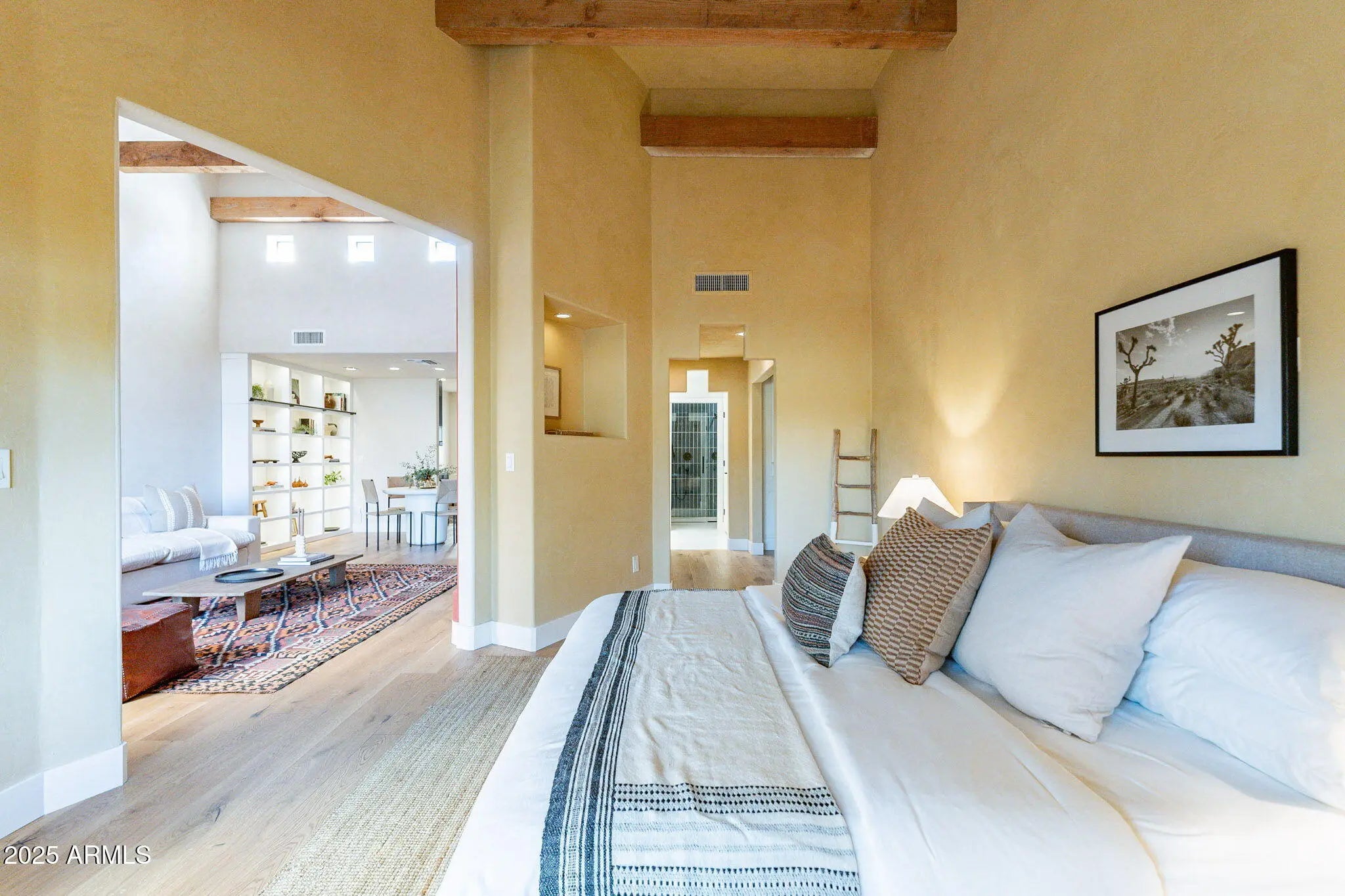 Santa Fe style meets modern craft in The Cottonwoods - an Anozira built gated enclave designed by noted architect Adolf deRoy-Mark. Inside, a full designer remodel pairs real wood flooring, American clay wall finishes with an airy, single-level, open concept that places bedrooms at opposite ends for privacy. The beamed ceilings and clerestory windows bring drama and soft natural light while the kitchen and baths feature cohesive, semi custom, acrylic cabinetry, quartz countertops and high quality finishes. Outside, enjoy lush community grounds with winding streams/ponds, mature trees, pool/spa, tennis, and a reservable tea house - rare resort style amenities in South Tempe. Architecturally distinctive, historically significant and move in ready. This is Cottonwoods living at its best