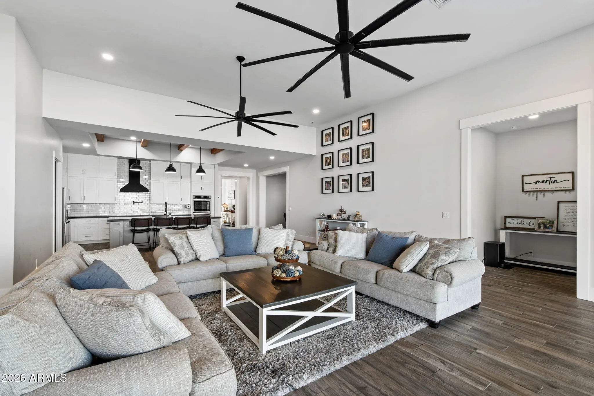 Welcome to an architectural masterpiece in the coveted Santo Vallarta community—designed for energy efficiency, productivity, and an active lifestyle. This 2023-built estate offers 5,093 sq. ft. of thoughtfully planned living space on an expansive 35,799 sq. ft. lot, making it an exceptional opportunity for remote professionals, entrepreneurs, or small business owners. Striking desert-inspired landscaping with turf, a stone walkway, and a rich brick façade with warm wood accents create an inviting first impression. Inside, wood-look ceramic tile, plush bedroom carpeting, upgraded lighting, and custom wooden shutters enhance both comfort and style. At the heart of the home, the gourmet kitchen features stainless steel appliances, two dishwashers, granite countertops, and a massive walk-in pantry with an additional refrigeratorideal for entertaining or business-scale use. Oversized sliding doors open to a spacious backyard with turf and desert landscaping, offering seamless indoor-outdoor living. This home was intentionally designed for work-from-home and small business flexibility, featuring multiple dedicated office spaces, including two full home offices, a private office within the primary suite, a flex salon or studio space, a separate TV/game room, a dedicated exercise room, and a workshop with added garage storageproviding true separation between work, living, and leisure. Energy efficiency is a defining feature, with ICCF exterior block construction delivering an exceptional R-73 insulation value, ensuring lower utility costs, superior climate control, and year-round comfort. The primary suite serves as a private retreat with backyard access, a spa-inspired bathroom with a double shower, soaking tub, dual toilet rooms, and an expansive walk-in closet. RV gates, abundant storage, and close proximity to biking and hiking trails complete this rare offeringperfect for those seeking a high-performance home that supports both professional productivity and an outdoor lifestyle.