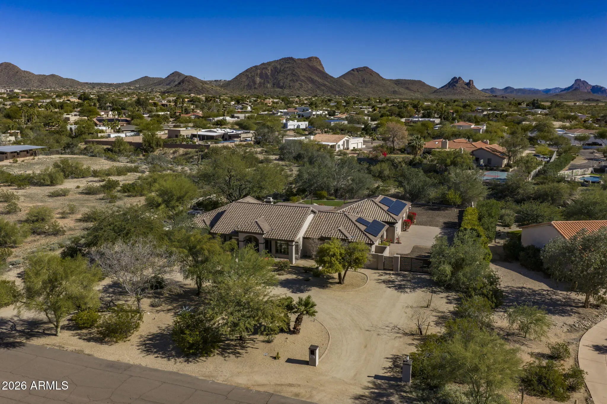 On a serene 1+ acre lot that backs to desert wash, this 4 bed + bonus room, 3 bath estate has a backyard full of features including fabulous mountain views, pool, hot tub, relaxing water feature, lower patio with firepit, and motorized RV gate that leads to a private motor court for those extra toys. And the property is only 0.3 miles away from acres of open desert! Inside this elegant home, you are welcomed with vaulted ceilings, a cozy fireplace, stylish designer light fixtures, and custom ship lap in the dining room & bar area. Other upgrades include wide plank reclaimed wood and 16 x 32'' porcelain tile floors and crown molding throughout. The large & bright kitchen features quartz counters, stainless GE Monogram appliances and a center island perfect for family and guests to gather around. The remodeled bathrooms have many added touches including custom decorative inlays to make each one feel special and dual head shower for the primary bedroom. And don't miss the homework nook and custom built-ins as you tour this home. This lovely home is not only a peaceful retreat but also an entertainer's dream and not to be missed.