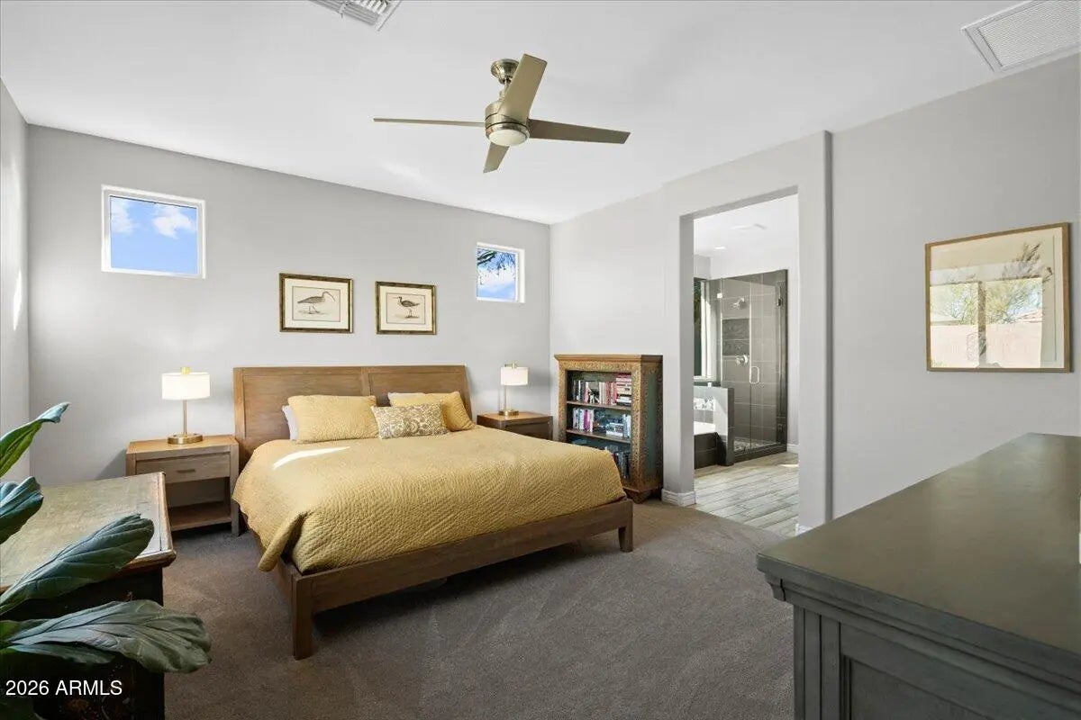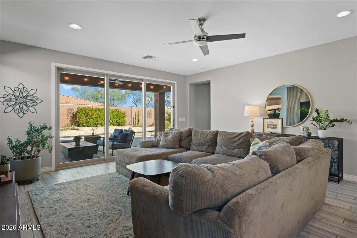 Nearly $50,000 in recent upgrades make this beautifully updated North Phoenix home truly stand out. Recent improvements include sound paneling, a converted enclosed office/optional 4th bedroom, custom laundry cabinetry and countertops, updated kitchen lighting, a brand-new HVAC system, designer landscaped backyard, new kitchen sink, and a reverse osmosis water filtration system. The open-concept kitchen features staggered Smoke recessed maple cabinetry, Tipperary quartz countertops, a custom tile backsplash, and GE stainless steel gas appliances, creating a modern and functional cooking space. Throughout the home you'll find wood-look 6'' x 24'' tile flooring, plush carpet in bedrooms, and Light French Gray two-tone interior paint for a fresh, contemporary feel. The spacious primary suit offers a custom soaking tub, separate walk-in shower, and elegant finishes. A stunning 12-foot sliding glass door opens to the backyard, providing seamless indoor-outdoor livingperfect for entertaining. The private backyard is complete with a sparkling pool, pavers, low-maintenance turf, and upgraded landscaping, delivering the ultimate Arizona lifestyle. Additional features include a 220V outlet in the garage for electric vehicle charging and a highly desirable North Phoenix location, situated less than 3 miles from TSMC with convenient access to major freeways, shopping, dining, and employment corridors. This home offers modern finishes, energy efficiency, and move-in-ready comfort a rare opportunity in one of North Phoenix's most sought-after areas.