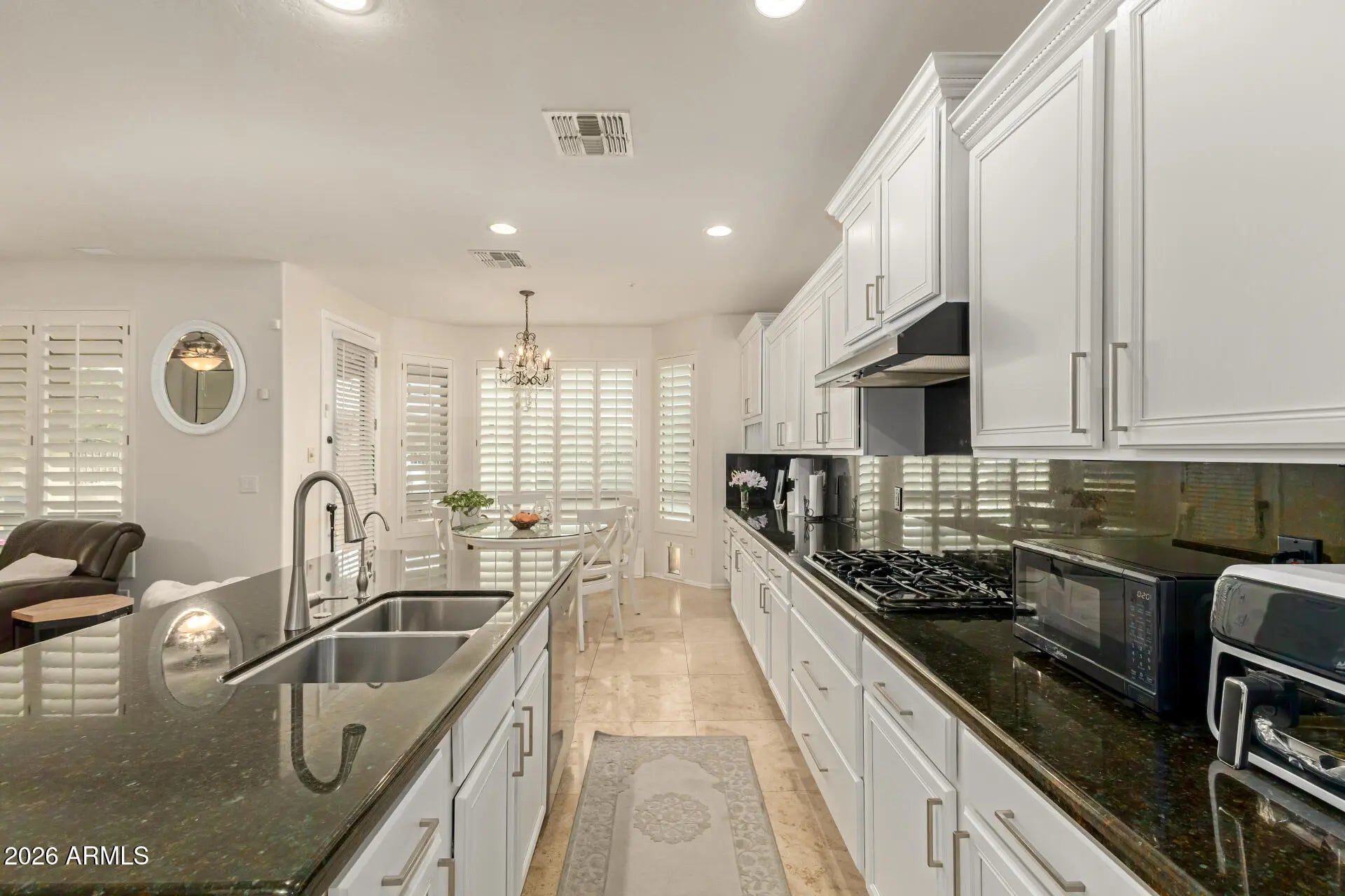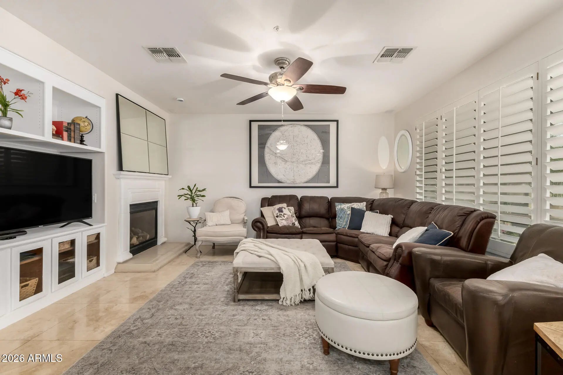 Rare opportunity to own this move-in-ready 3,264 sq ft two-story home with no carpet throughout! Featuring 4 bedrooms, 3 baths, plus flexible spaces that easily adapt for an office, guest room, playroom, or even a 6-bedroom configuration, this property delivers both comfort and versatility. Tucked inside a quiet gated community with peaceful NAOS behind and mountain views, it's the perfect blend of privacy and style. Major upgrades include a brand-new 2025 AC/HVAC system (one of two units), a full home security system, and a custom security front door for added peace of mind. Inside, enjoy bright open spaces with soaring ceilings, plantation shutters, arched details, and a cozy fireplace that creates an inviting atmosphere for everyday living. The gourmet kitchen stands out with . . . staggered cabinets, crown molding, granite countertops, built-in appliances, and a large island ideal for cooking and entertaining. Upstairs, the serene primary suite offers a relaxing bath with a separate tub and shower, plus a walk-in closet with custom organizers. Step outside to the backyard retreat with an extended covered patio and ceiling fan, built-in BBQ, exterior fireplace, grassy area for play, and a balcony overlooking the mountains. Conveniently located near top restaurants and shopping, this home checks every box: upgraded, spacious, and truly move-in ready!