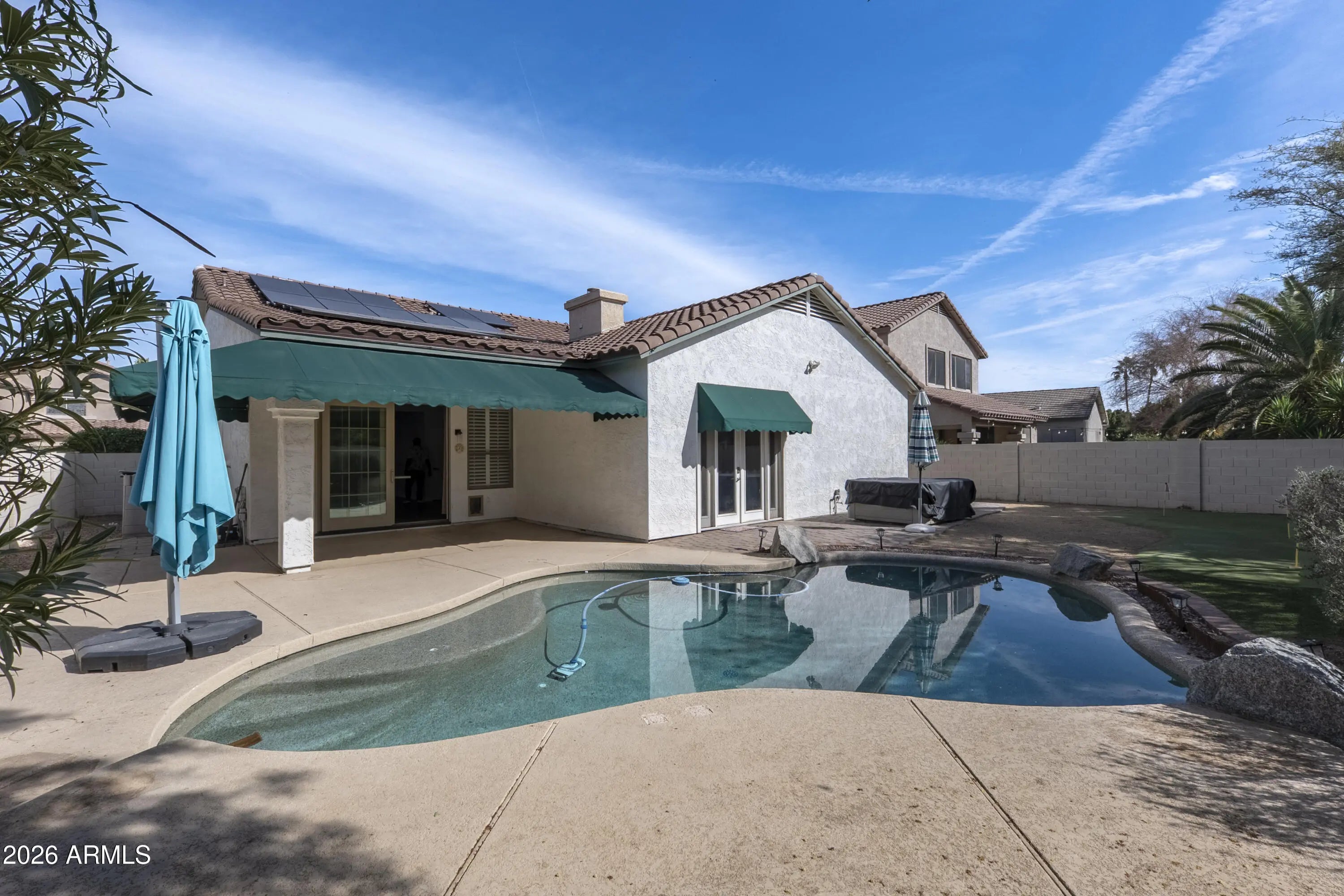 Located in the prestigious Ocotillo community of Chandler, this beautifully upgraded 3-bedroom plus office/den, 2-bathroom single level home offers an exceptional blend of luxury, comfort, and modern design. Over the past five years, the home has been thoughtfully enhanced with tile flooring and new baseboards throughout, full interior and exterior paint with sealed stone accents, updated lighting fixtures, and a redesigned kitchen featuring an extended quartz island and new stainless steel appliances. Additional improvements include a new roof (2019), solar panels, and a reverse osmosis system. The spacious 3 car garage boasts epoxy flooring and built-in cabinetry, while the private backyard is an entertainer's dream with a sparkling pool featuring a new pump, filter, and bottom cleaner, high-end hot tub with pavers and electrical upgrades, low-maintenance landscaping with artificial turf in the front and a putting green and gravel in the backyard. Ideally located near top-rated schools, shopping, dining, and recreation, this exceptional home delivers an elevated lifestyle in one of Chandler's most desirable communities.