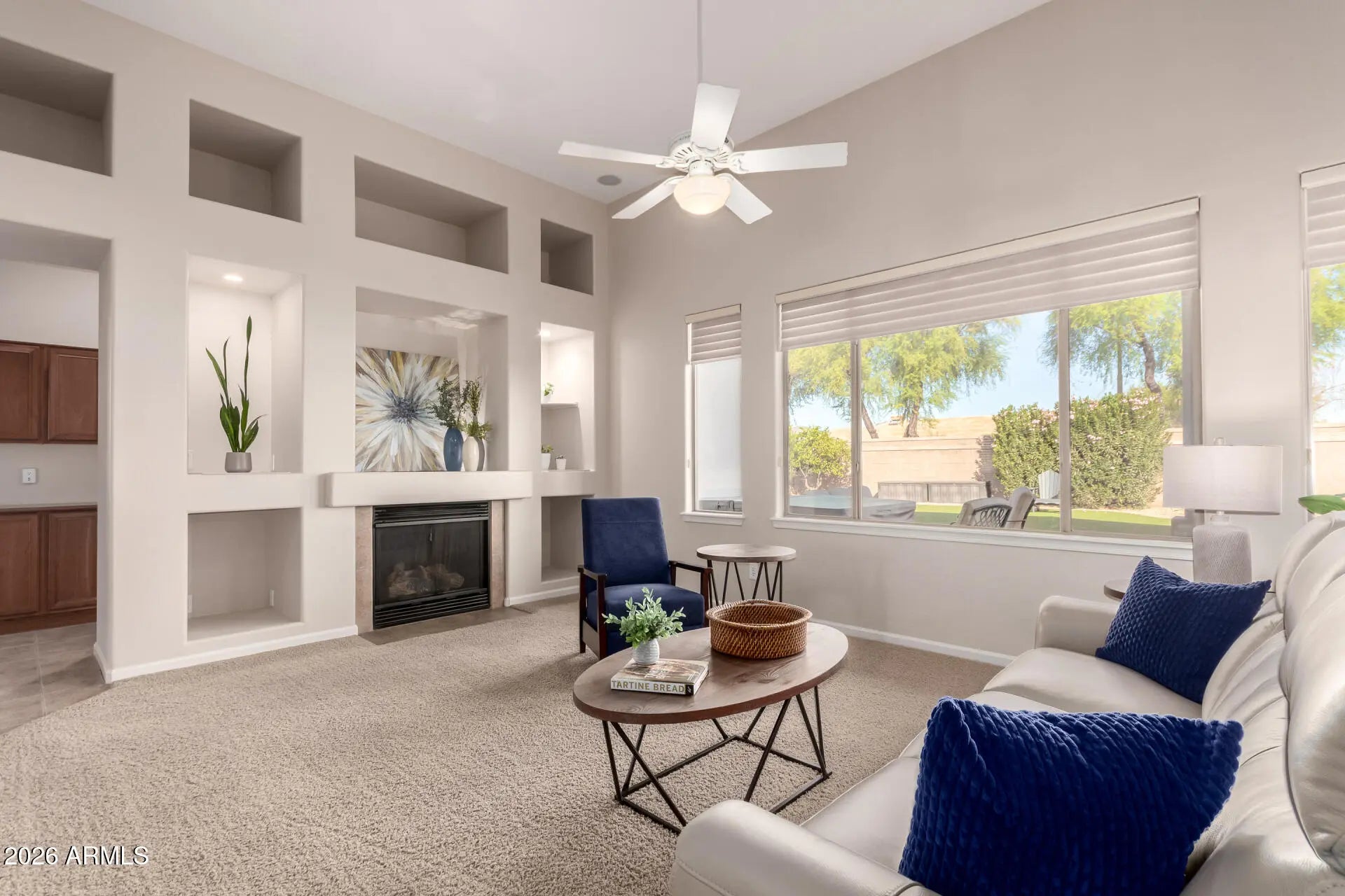 Step inside this lovely home to discover a bright, inviting open-concept layout that seamlessly connects the living, dining, and kitchen areas. Soaring ceilings enhance the sense of space, with 10-foot ceilings throughout and dramatic 12-foot ceilings in the family room and kitchen. The gourmet kitchen showcases a modern backsplash and hardware, high-end stainless steel appliances, a five-burner gas cooktop, double wall ovens, and an oversized 12-foot kitchen island with counter-height seating—perfect for casual dining and entertaining. The spacious primary suite features a private ensuite bathroom with separate tub and shower, a large walk-in closet, and direct access to the patio. Meticulously maintained by the original owners, the home reflects pride of ownership throughout with updated lighting, custom shutters, and upgraded baseboards, creating a move-in-ready yet elegant feel. The backyard offers a private retreat with a pool, travertine decking, and a hot tub beneath the covered patio. Low-maintenance landscaping with artificial turf allows you to spend more time enjoying the Arizona sunshine and less time on upkeep. The 3-car garage provides secure parking along with additional overhead storage. Located in a community of all single-story homes, this convenient neighborhood offers easy access to Paseo Vista Park, the consolidated canal paths, shopping, and restaurants. Enjoy the peace of a quiet cul-de-sac street while remaining just moments from everything you need.