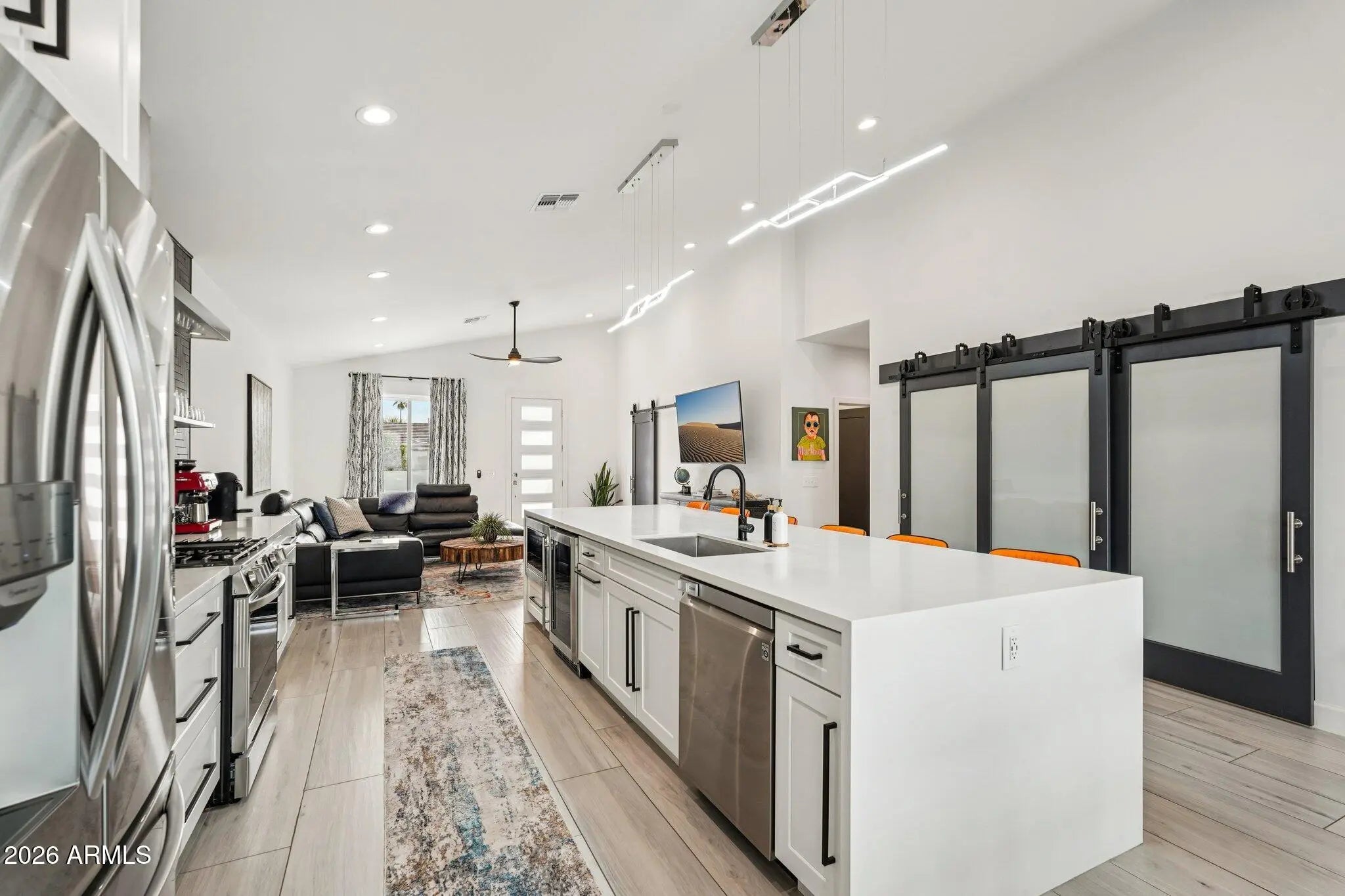 Modern 2022 build offering 3 beds and 2.5 baths with soaring vaulted ceilings, 2x6 construction, and solid wood doors throughout. The designer kitchen features a striking 12-ft quartz waterfall island, gas cooktop, stainless steel hood, wine fridge, and large pantry—perfect for entertaining. Enjoy a cozy front porch and a split primary suite with spa-style bath, including walk-in shower, freestanding tub, private toilet room, and walk-in closet. Two secondary bedrooms share a Jack-and-Jill bath. Extended epoxy-finished garage with gas tankless water heater. Low-maintenance backyard with modern pergola, dog run and room for a pool. Close to shopping and easy access to SR-51. Owner/Agent.