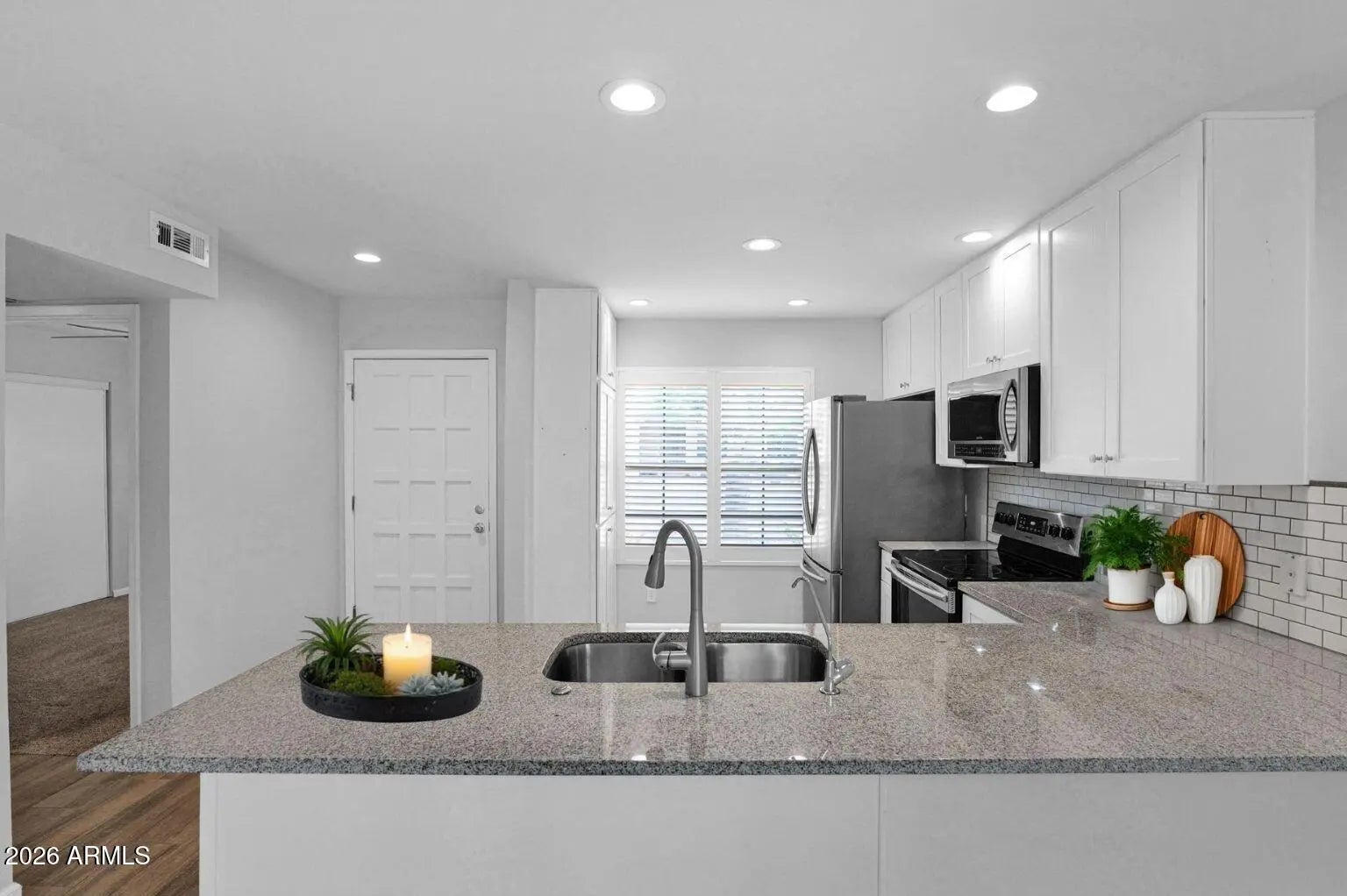 Welcome home to effortless living in Fountain of the Sun, a lively 55+ guard-gated community in East Mesa. This beautifully updated end-unit condo offers an open floorplan complete with 2 bedrooms and 2 baths, designed for comfort and simplicity. Enjoy a pristine kitchen featuring ceiling-height white cabinetry with soft-close doors, granite countertops, a classic subway tile backsplash, and newer Samsung stainless steel appliances. The spacious primary suite features a separate exit onto the patio, a walk-in closet, and remodeled ensuite bathroom with dual sinks. Fresh neutral paint, wood-look tile floors, plush carpet, LED lighting and ceiling fans, and shutters on the windows complete the move-in-ready feel. Step outside to a covered, tiled patio, which is perfect for relaxing mornings or quiet evenings. The washer, dryer, and refrigerator convey, making this home move-in ready! Residents enjoy golf, pickleball, fitness, clubs, and social events, all minutes from shopping and freeways. Unpack and start enjoying the lifestyle you deserve!