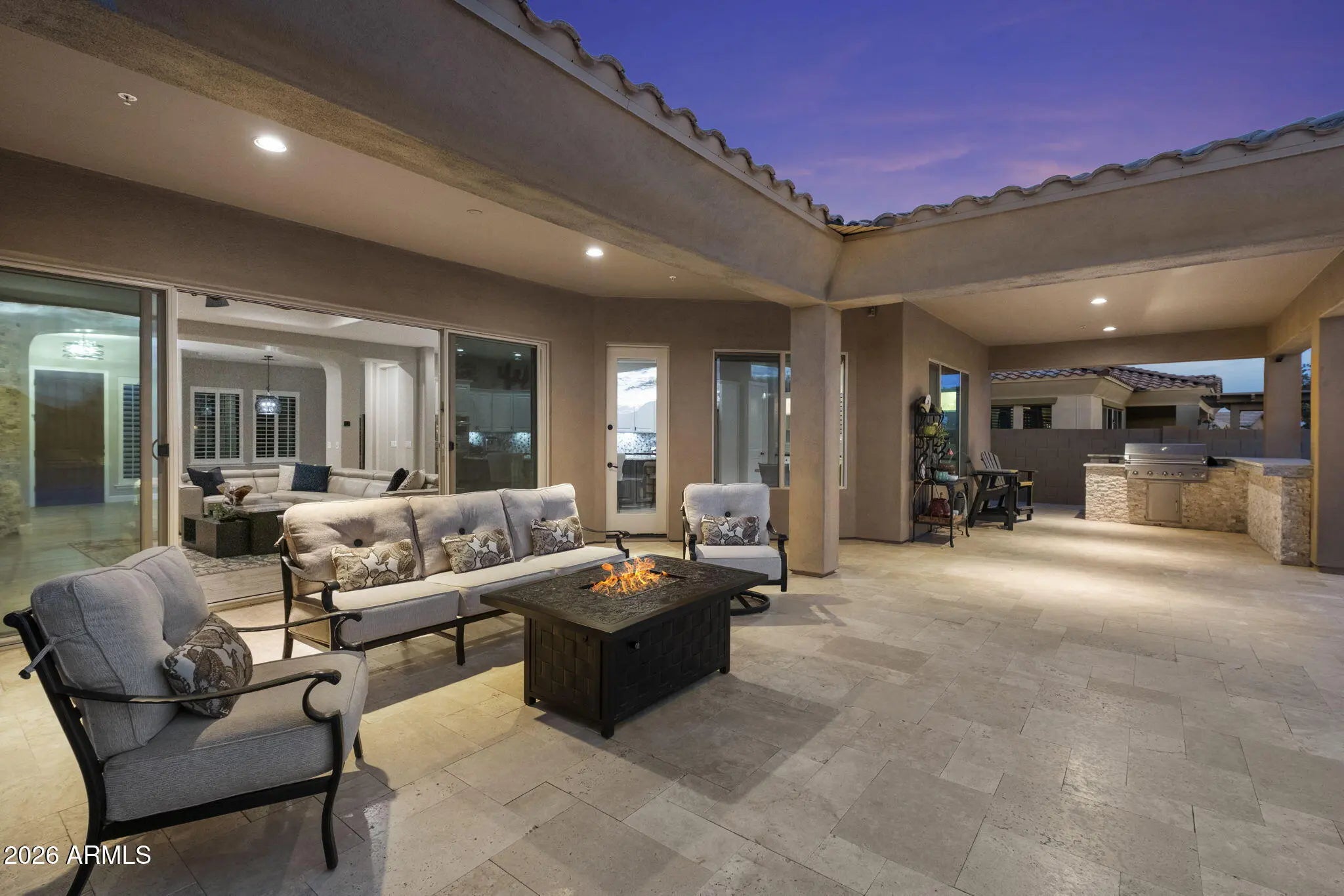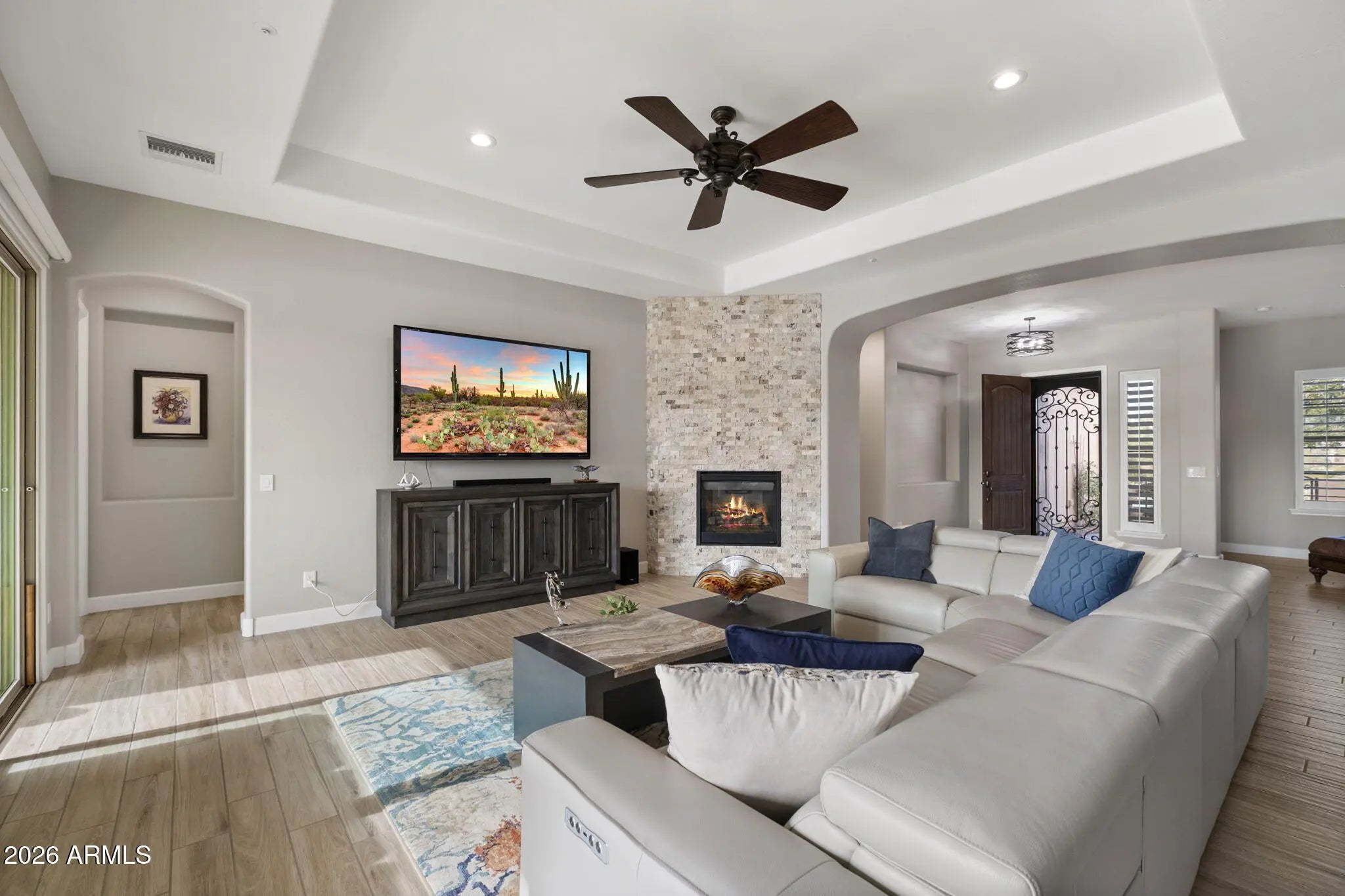 Experience luxury golf community living in the prestigious guard-gated Blackstone at Vistancia, home to the acclaimed Blackstone Country Club and championship golf course. This beautifully updated residence offers exceptional indoor-outdoor living with extensive seller improvements designed for comfort, entertaining, and resort-style enjoyment. The private backyard retreat features a fully automated heated pool and spa with a saltwater system, travertine decking, newer irrigation and landscape lighting, artificial turf, and paver walkways throughout both the front and backyard. An outdoor built-in Gas BBQ Grill and High Top Bar creates the ideal setting for entertaining after a day on the golf course. Inside, this open floor plan home are refined upgrades including Monogram appliances, freshly painted cabinetry throughout Kitchen, Dining and master bathroom vanities/cabinetry, designer light fixtures, and fresh interior paint throughout. The great room is highlighted by a floor to ceiling stack-stone surrounded gas fireplace and a 16ft Bi-parting sliding glass door with stunning views of a backyard oasis. The 2nd & 3rd bedrooms share a Den to allow more guest comfort & privacy. All window coverings are either remote-controlled shades or plantation shutters adding more luxury, privacy, and convenience. This property is truly move-in ready. Located within one of North Peoria's premier luxury golf communities, residents enjoy access to championship golf, private country club amenities, scenic desert views, and an elevated Arizona lifestyle. Conveniently close to hiking trails, dining, shopping, Lake Pleasant and the 303. This home offers the perfect blend of luxury, golf, and resort-style living.