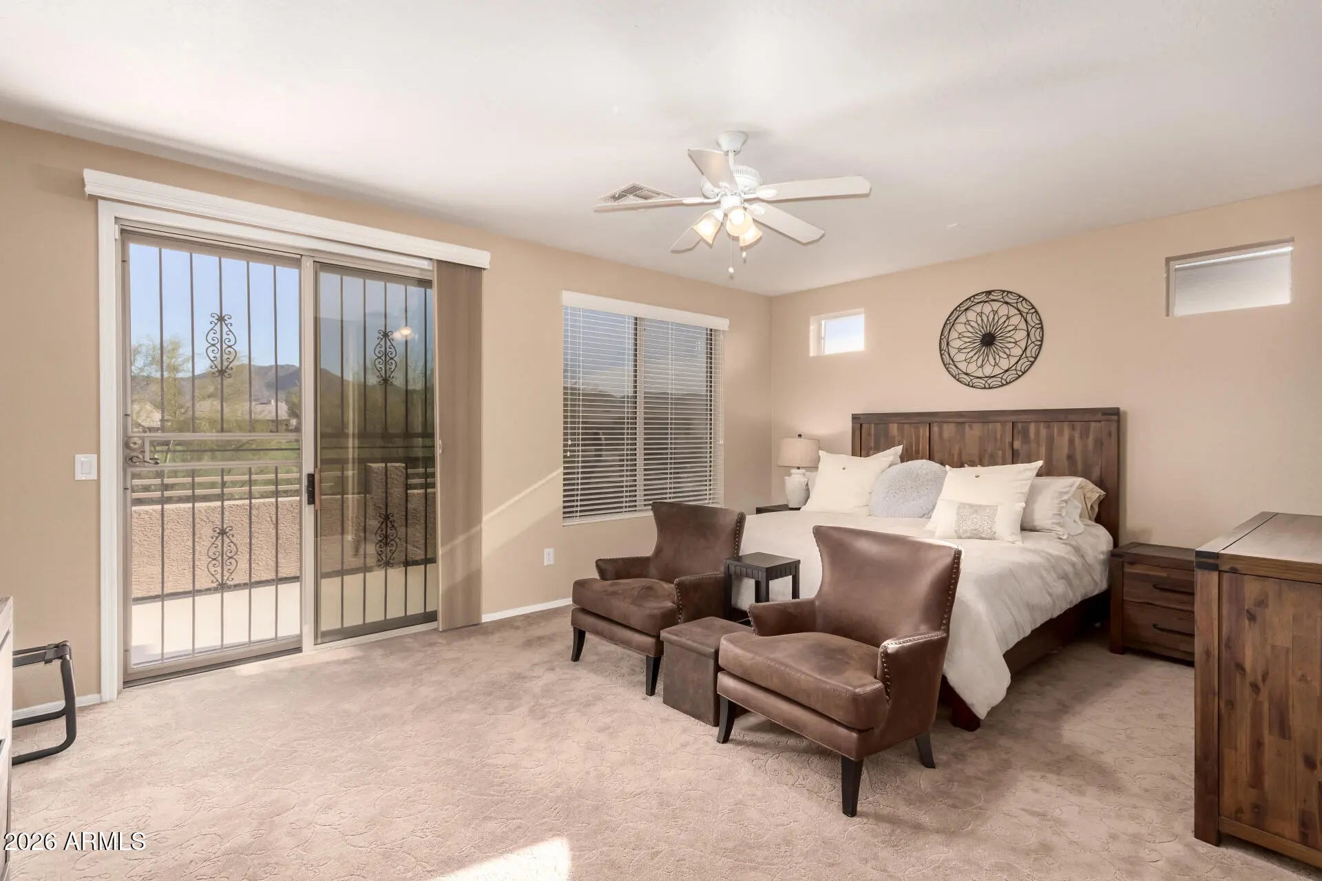 Luxurious 4-Bedroom Residence with Golf Course Views & Elegant Primary En-Suite Welcome to a home that truly defines luxury living. This beautifully upgraded 4-bedroom, 3-bath residence features the distinguished Blanford Palo Verde floor plan and sits along the 4th hole of a premier golf course, offering stunning mountain vistas.Inside, you'll find a refined and elegant atmosphere with plantation shutters throughout the main floor and a dedicated office with custom built-ins. The highlight of the home is the luxurious primary bedroom with an en-suite bathroom, providing a private retreat that's both spacious and elegant.The upper level is fully carpeted for comfort, and the expansive three-car garage boasts epoxy flooring and extensive cabinetry. Recent upgrades include new roof (April 2024), tankless water heater, and a dual water softener and filtration system.Step outside into a professionally landscaped backyard with a heated pool and fountain, gas barbecue and fire pit, and backyard misters, all with luxury outdoor furniture included.With GE appliances and a Titan security system, this home is a perfect blend of elegance and state-of-the-art amenities.