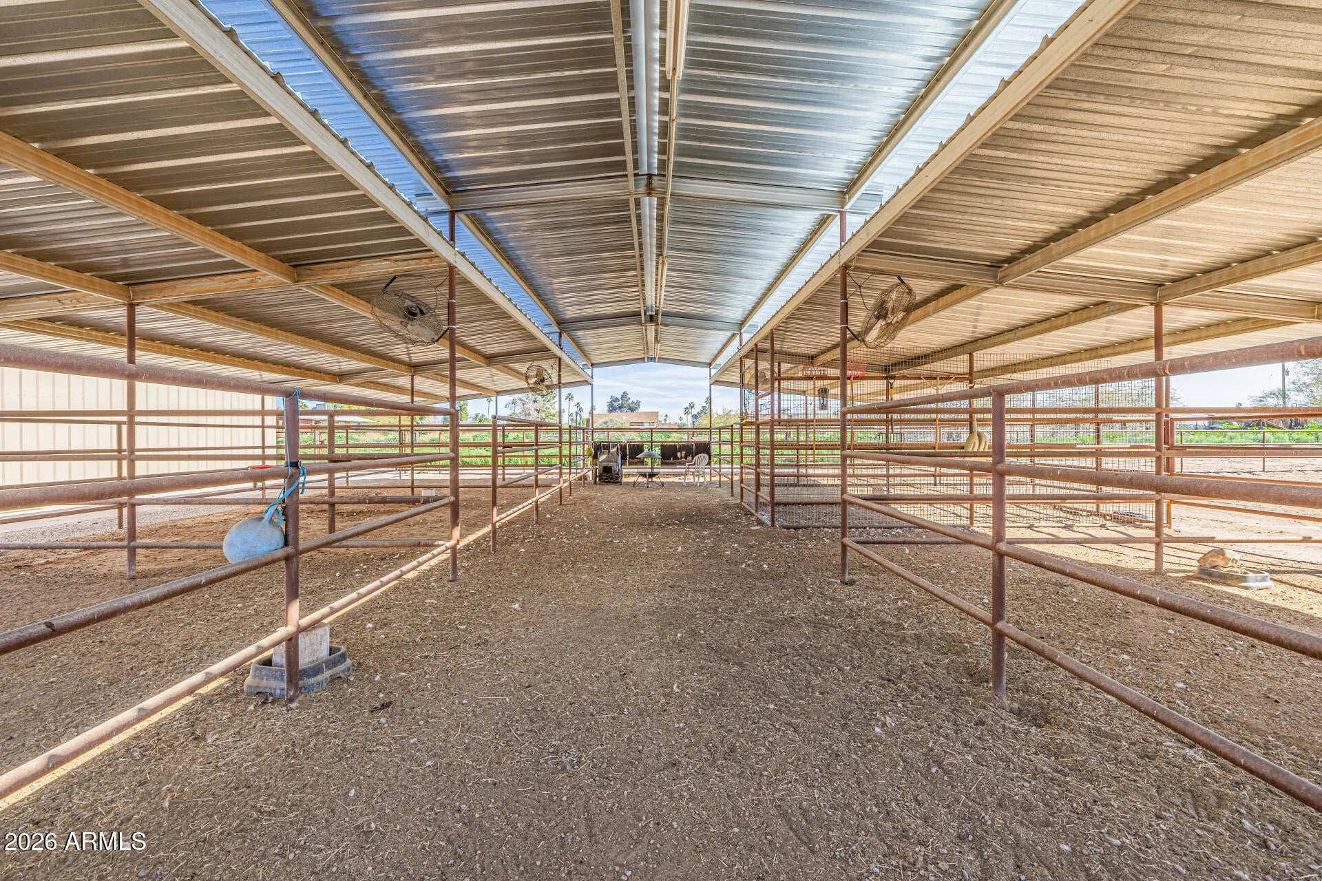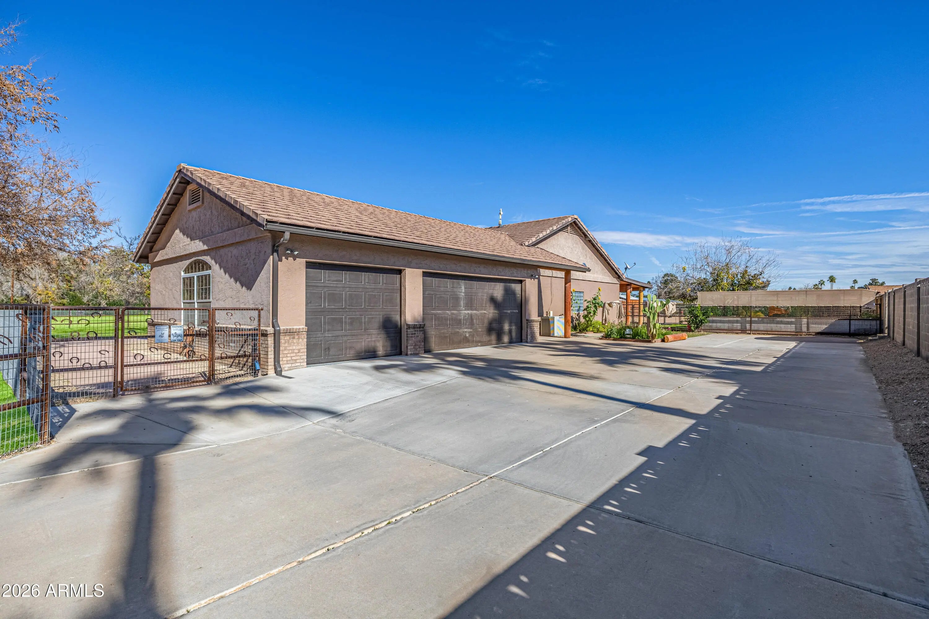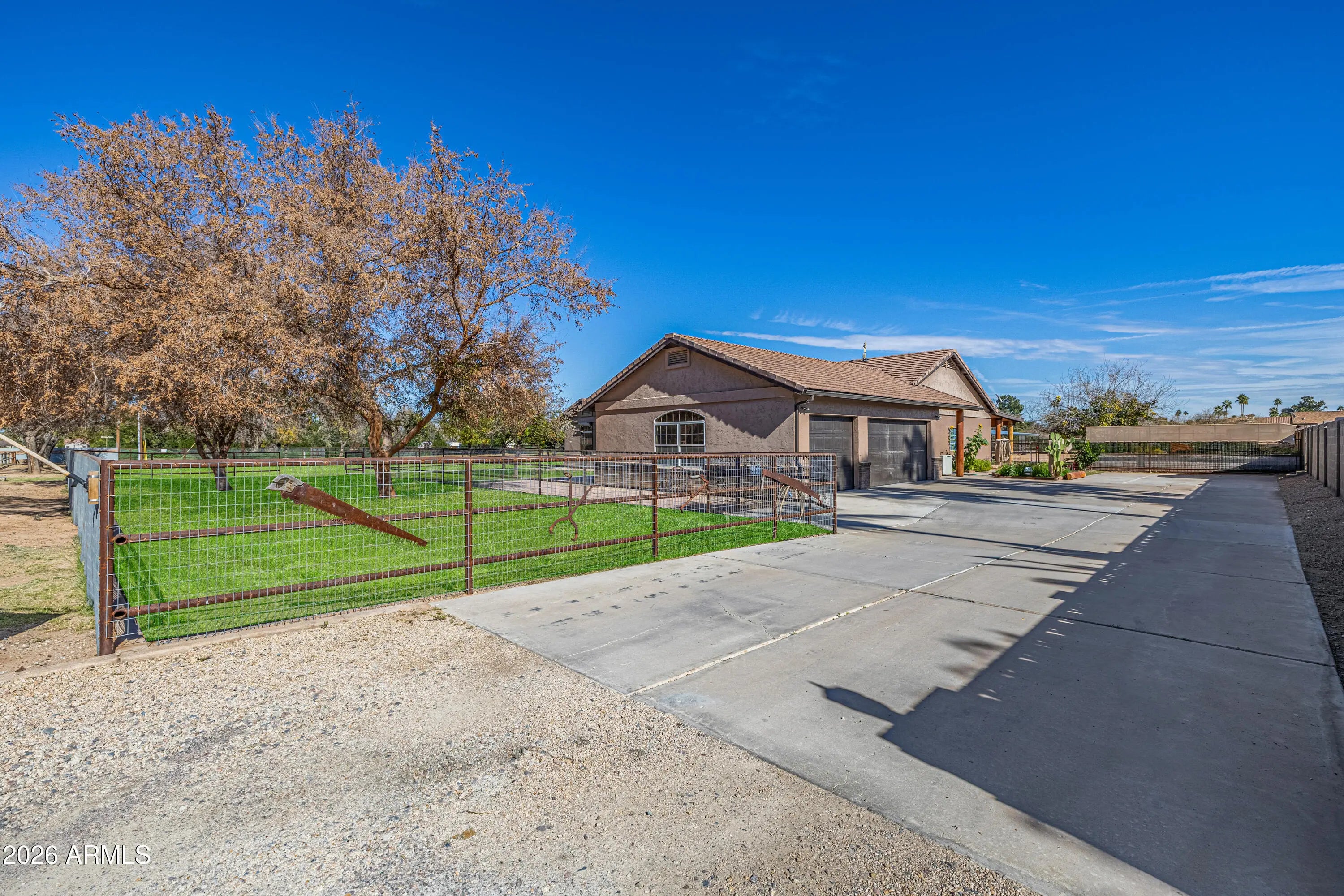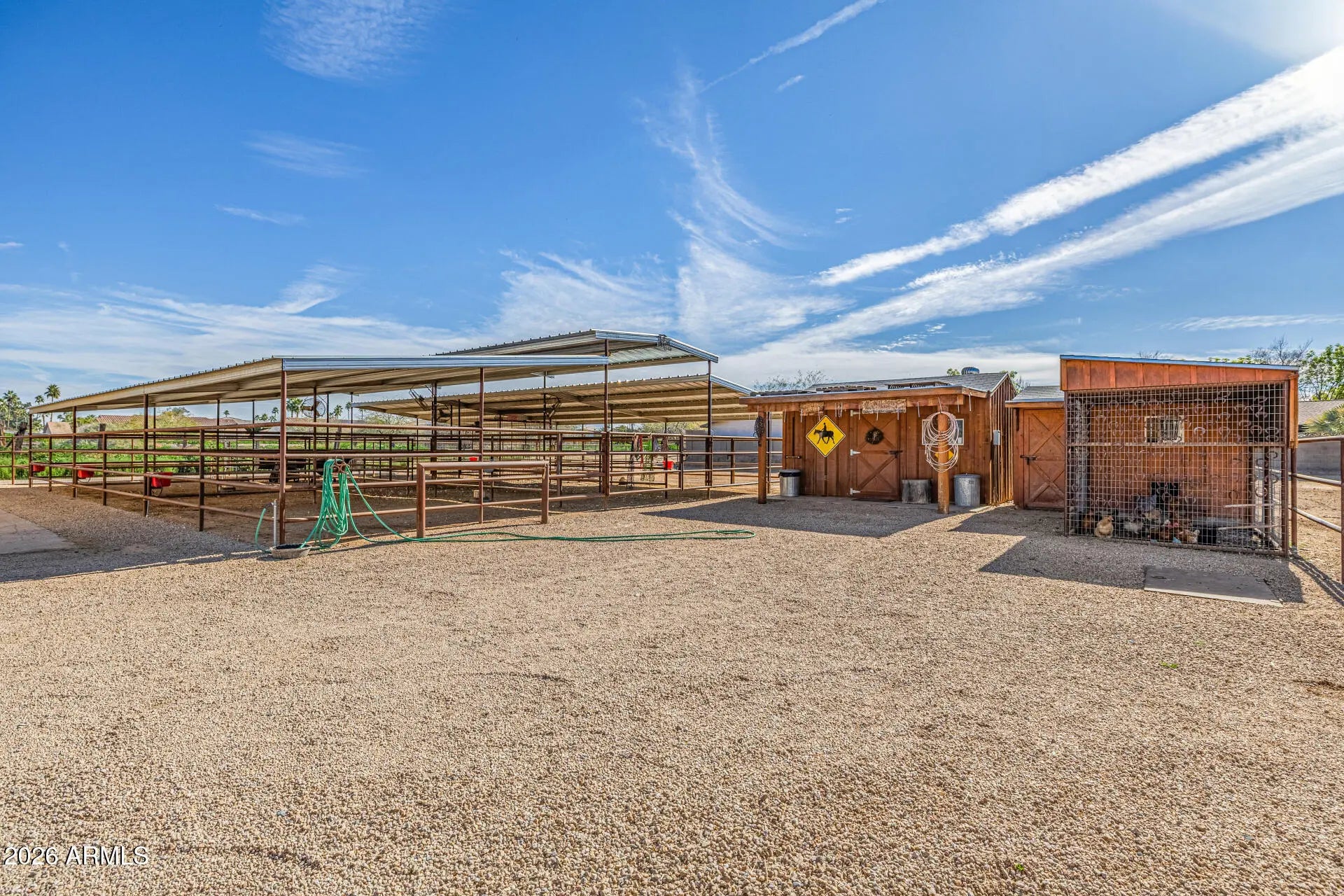 Bring your horses and enjoy wide-open living on this incredible 2.2-acre horse property offering the perfect blend of luxury living and rural charm on 2.2 acres of unincorporated land — no HOA! The property features mature orange trees, an impressive garden and shaded spaces that make the grounds both beautiful and functional. Designed for the serious equestrian, this setup includes 6 covered stalls, a tack room, hay storage, and a chicken coop, along with two separate turnout areas for your livestock to roam, graze, and move freely. There's also a 3300 sqft toy garage with a half bath and mezzanine, perfect for storing ATVs, trailers, or a workshop. The main home features hickory wood floors, an upgraded gourmet kitchen with premium appliances, custom cabinetry, and a large island that opens to a spacious great room ideal for entertaining. The extended 3-car garage on the main house provides even more space for vehicles and gear. Relax after a day in the saddle in the oasis backyard with a sparkling pool, spa, and covered patio, perfect for enjoying Arizona sunsets. Enjoy the best of country living and all the amenities you need. This exceptional property combines comfort, function, and freedom all just minutes from city conveniences.