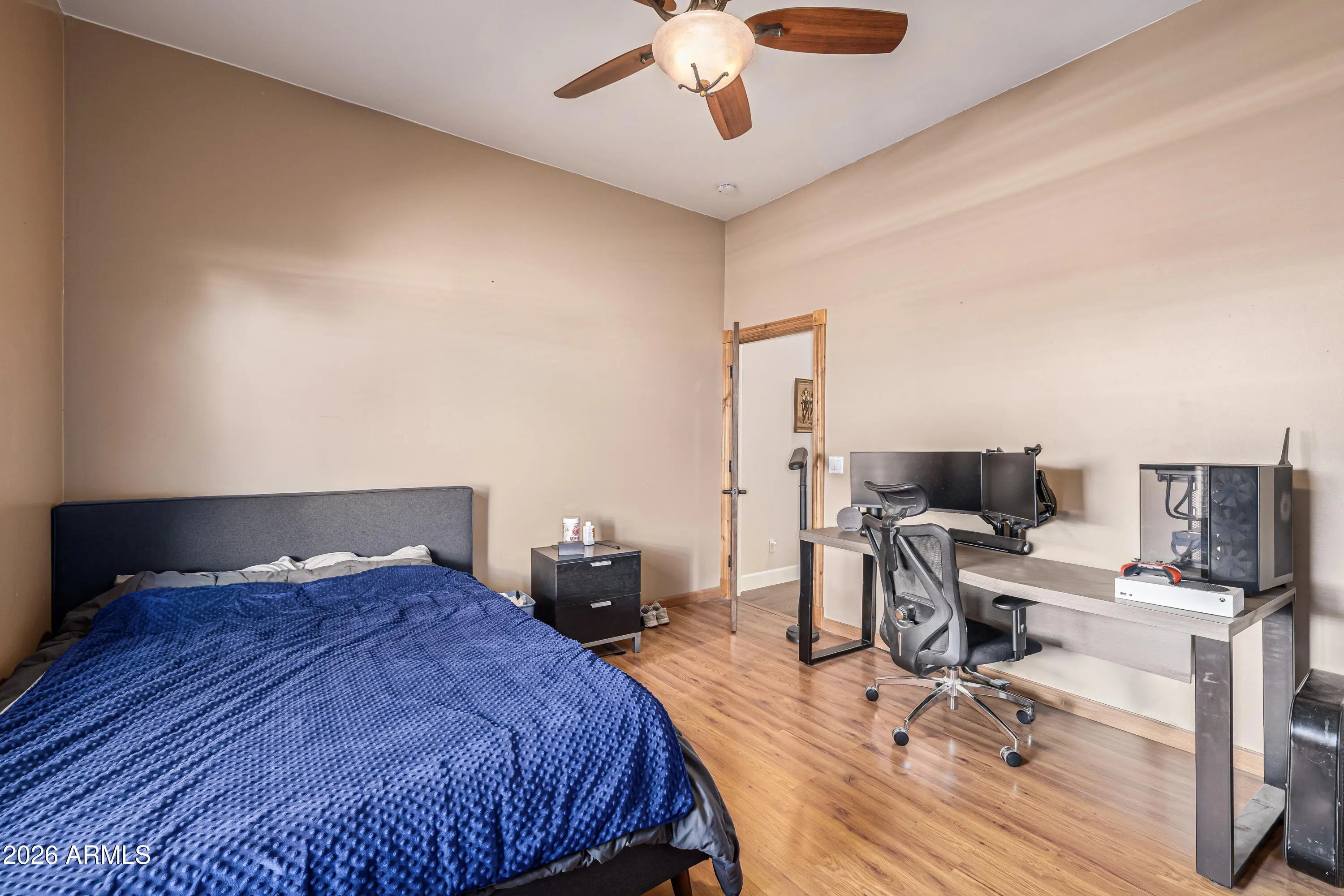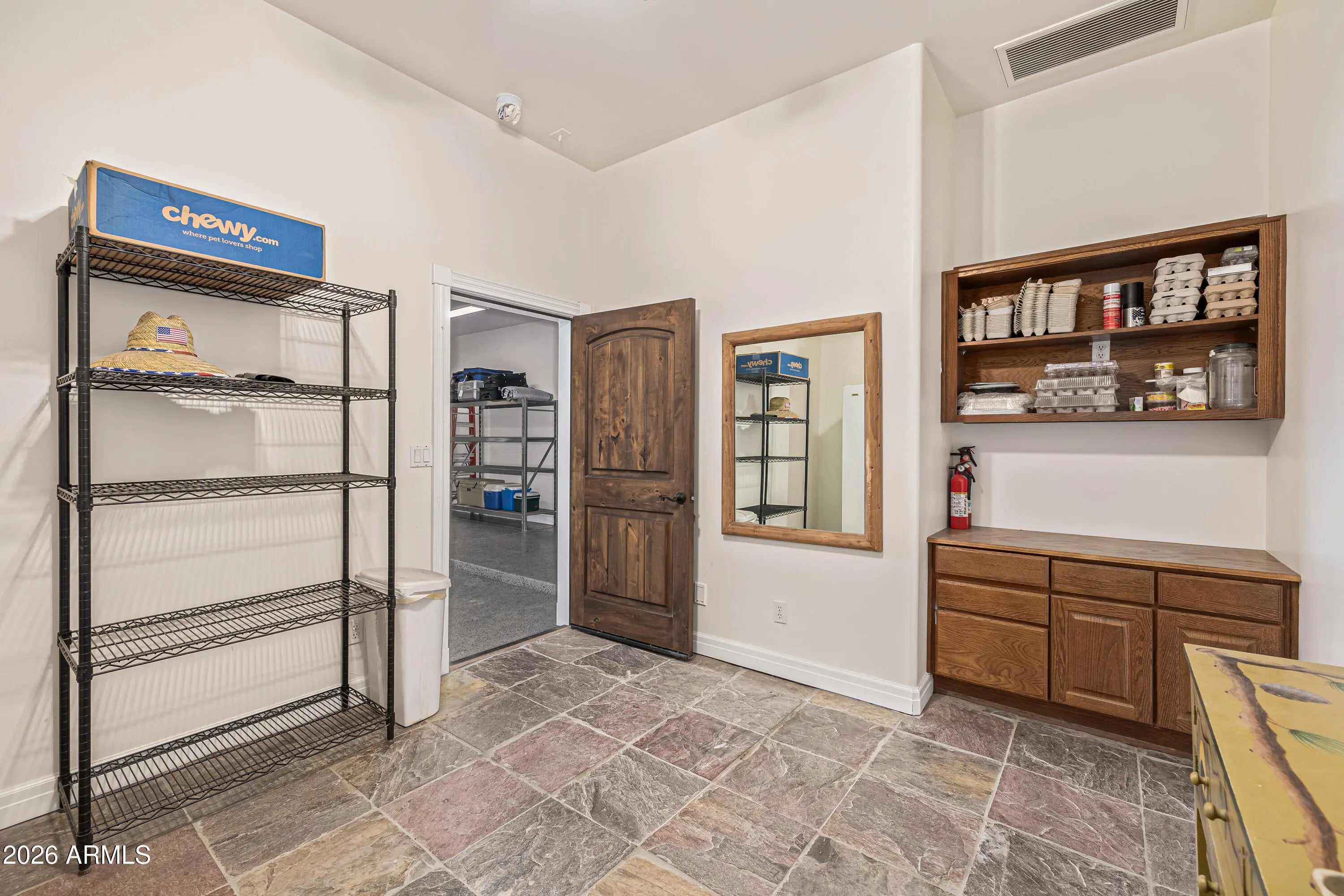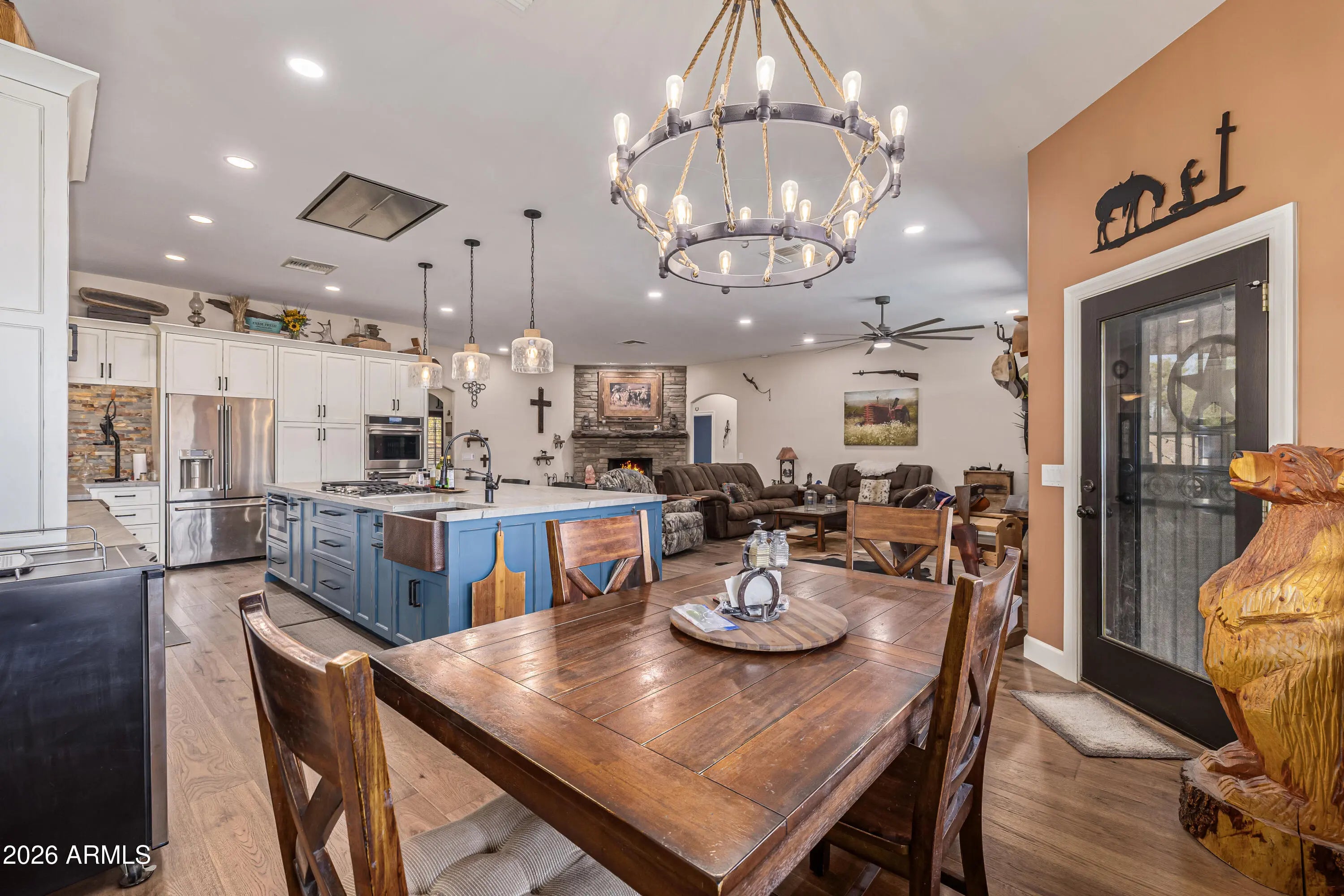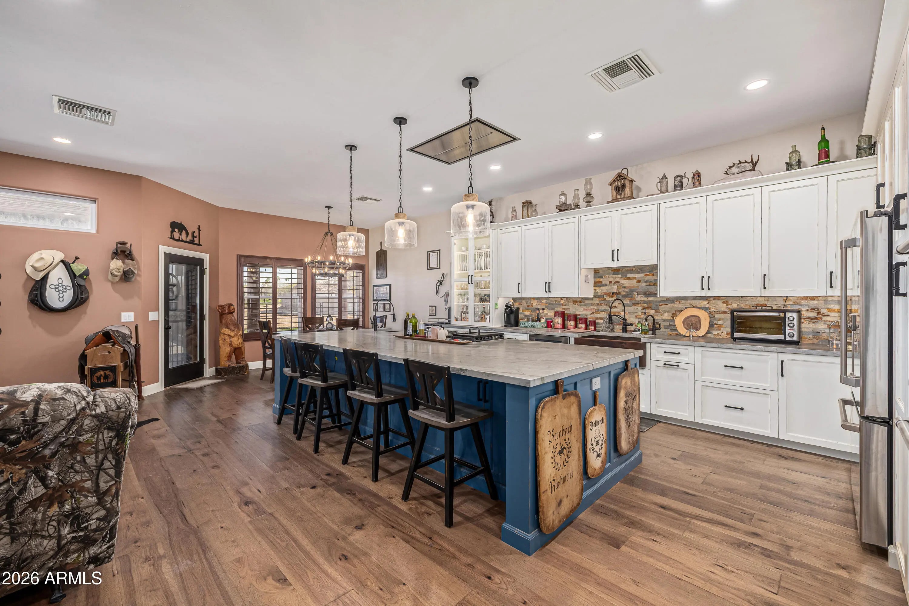 Bring your horses and enjoy wide-open living on this incredible 2.2-acre horse property offering the perfect blend of luxury living and rural charm on 2.2 acres of unincorporated land — no HOA! The property features mature orange trees, an impressive garden and shaded spaces that make the grounds both beautiful and functional. Designed for the serious equestrian, this setup includes 6 covered stalls, a tack room, hay storage, and a chicken coop, along with two separate turnout areas for your livestock to roam, graze, and move freely. There's also a 3300 sqft toy garage with a half bath and mezzanine, perfect for storing ATVs, trailers, or a workshop. The main home features hickory wood floors, an upgraded gourmet kitchen with premium appliances, custom cabinetry, and a large island that opens to a spacious great room ideal for entertaining. The extended 3-car garage on the main house provides even more space for vehicles and gear. Relax after a day in the saddle in the oasis backyard with a sparkling pool, spa, and covered patio, perfect for enjoying Arizona sunsets. Enjoy the best of country living and all the amenities you need. This exceptional property combines comfort, function, and freedom all just minutes from city conveniences.