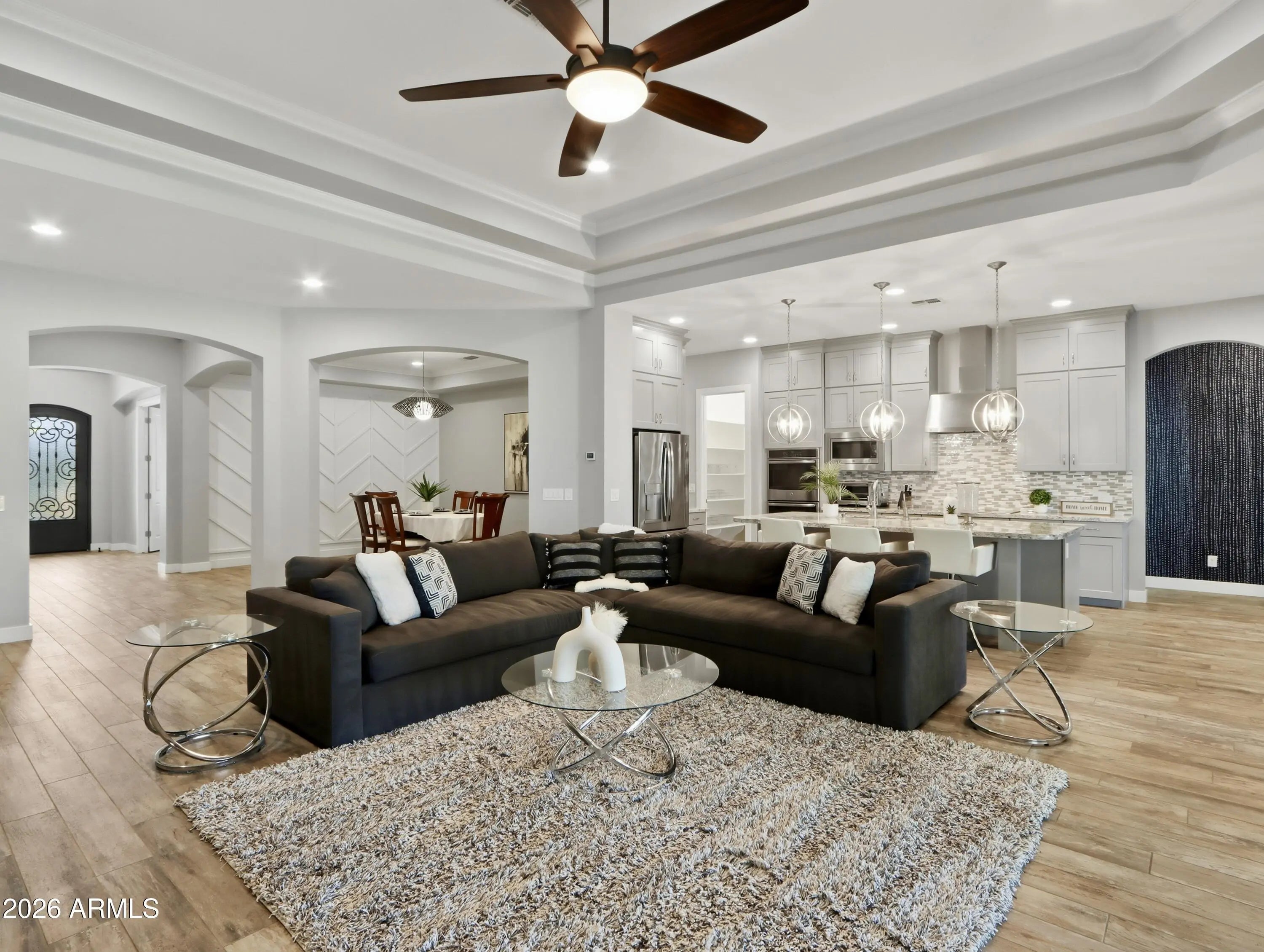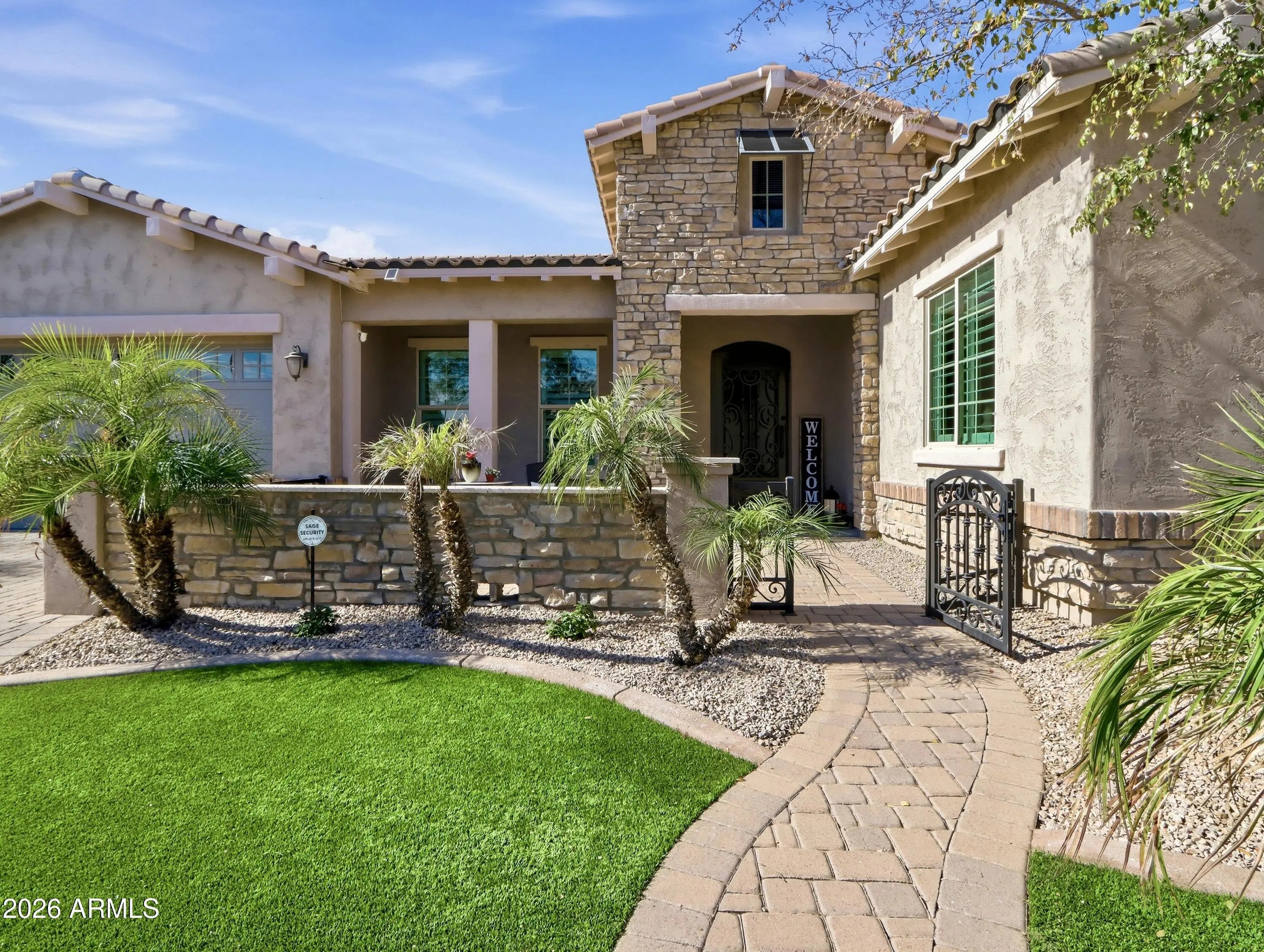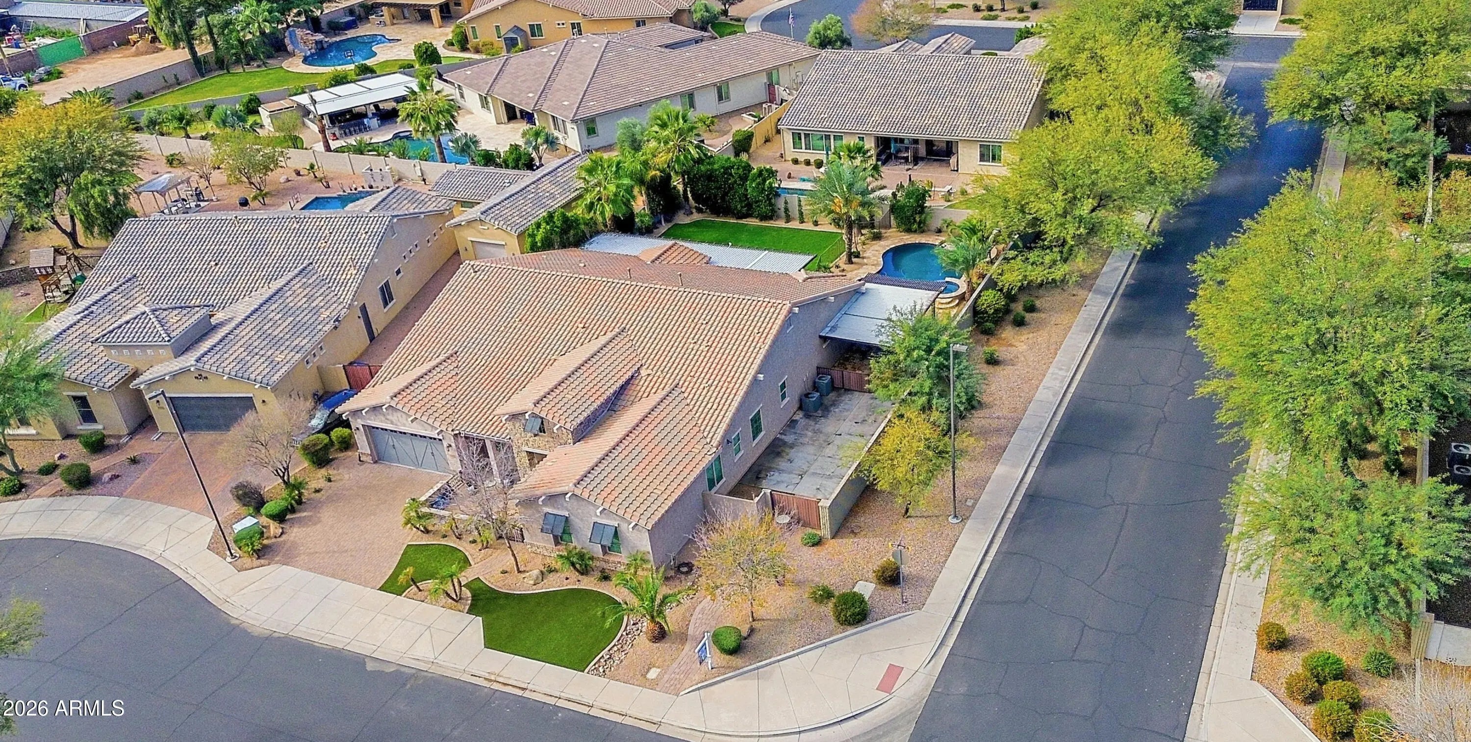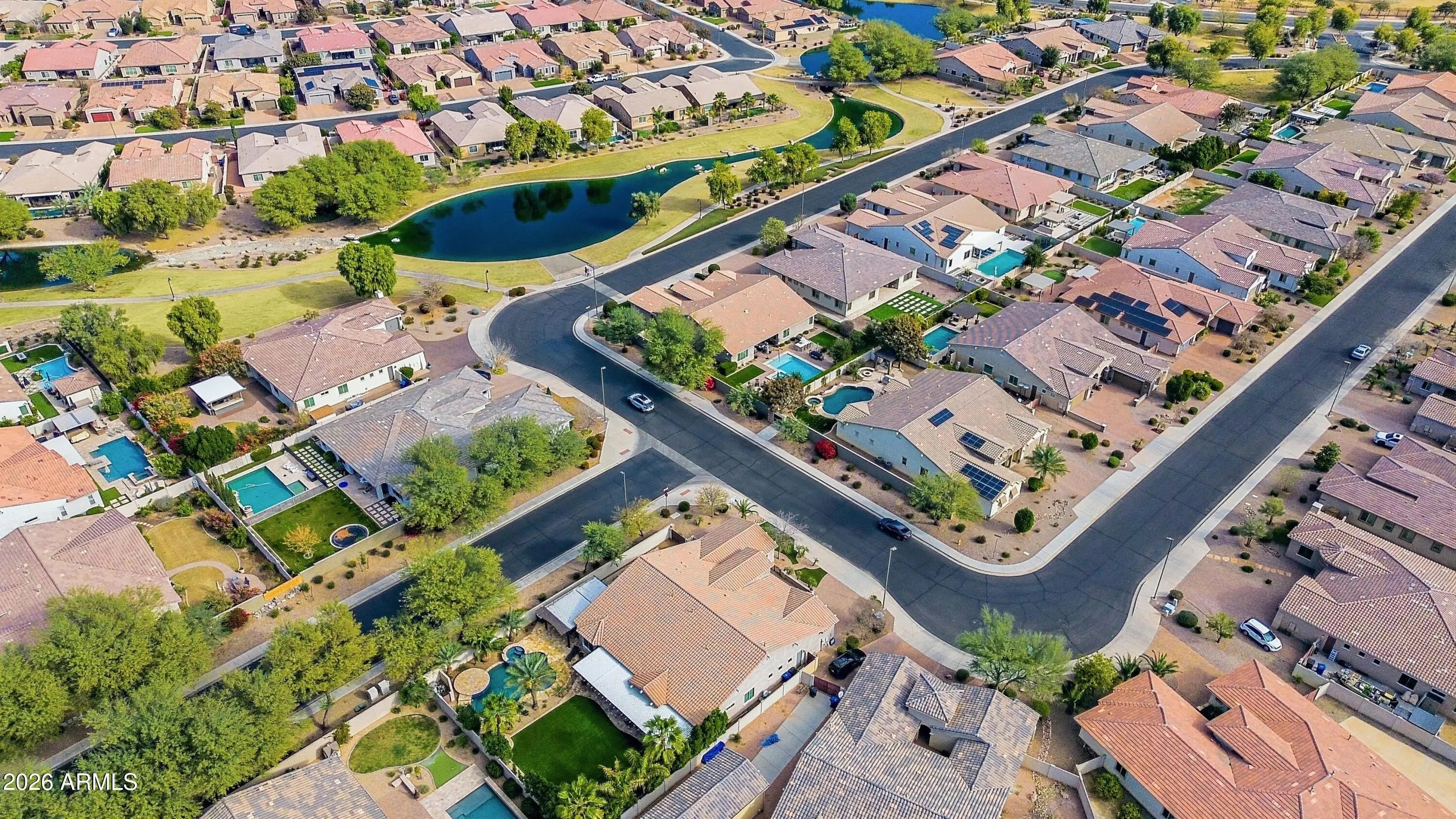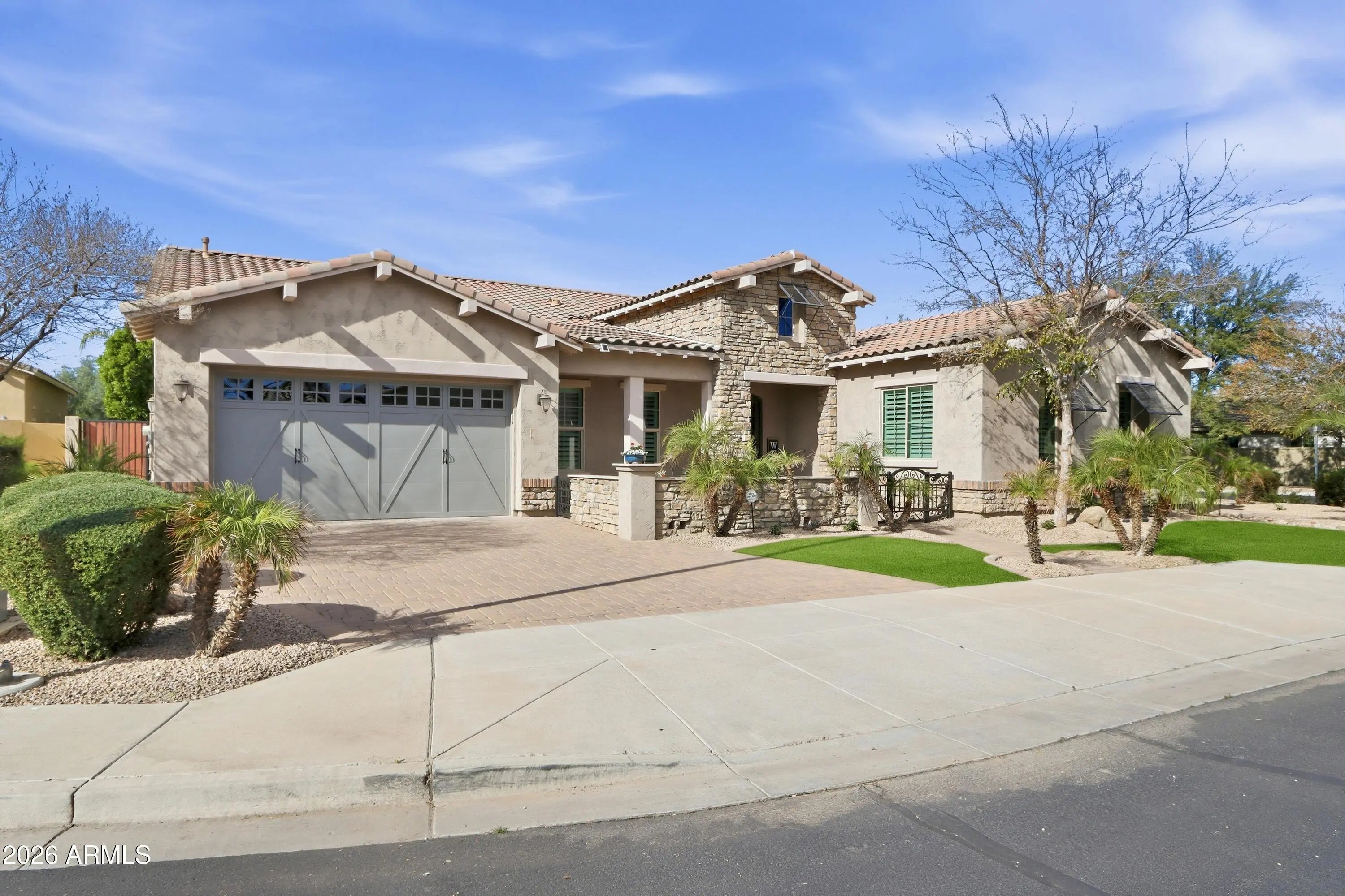 Luxurious Executive Home in the Gated Layton Lakes community of S Chandler. This extraordinary property feels like home from the welcoming front patio to the private backyard oasis. Designed for entertaining, it offers large open-concept indoor living & multiple outdoor spaces for pool parties, relaxing on the sun deck, BBQs with friends, or quiet dinners under the covered patio. Inside, the stunning chef's kitchen & great room with a dramatic 12-foot coffered ceiling create a seamless space for everyday living. Over $400,000 combined in designer upgrades elevate the home beyond model finishes, including decorator lighting, crown molding, custom woodworking & feature walls throughout. The private primary suite is thoughtfully separated from the rest of the home, offering a serene retreat with a separate keyed entry/exit. A spectacular chandelier leads into the spa-inspired ensuite bath featuring a floor-to-ceiling tiled walk-in shower with bench seating, soaking tub, dual vanities, and two spacious walk-in closets. The suite also offers direct access to the adjacent laundry room for added convenience. The oversized bedroom includes a sitting area & charming window seat- the perfect place to enjoy morning sunshine. A junior suite at the front of the home offers ideal guest accommodations or a secondary primary option, positioned next to a large bonus/flex room. On the opposite wing, two additional bedrooms are tucked away near the kitchen with a shared adjoining bath. The Living Space also include a a double-door den off the entry, powder bath and wonderful drop zone at garage entry. This Home has so many extras including 3 car tandem with EV Charging, Soft Water System, Hanging Storage, Built-in Storage Cabinetry PLUS a Separate Outdoor Pad for RV/UTV Parking. Located minutes from the Loop 202 near Downtown Chandler & Gilbert dining and entertainment. Layton Lakes Features Lakes, Streams, waterfalls, equestrian trails, basketball & softball fields, tot lots, BBQ areas, splash park, basketball and lighted tennis courts. A rare, move-in ready opportunity in one of Chandler's most desirable gated communities.