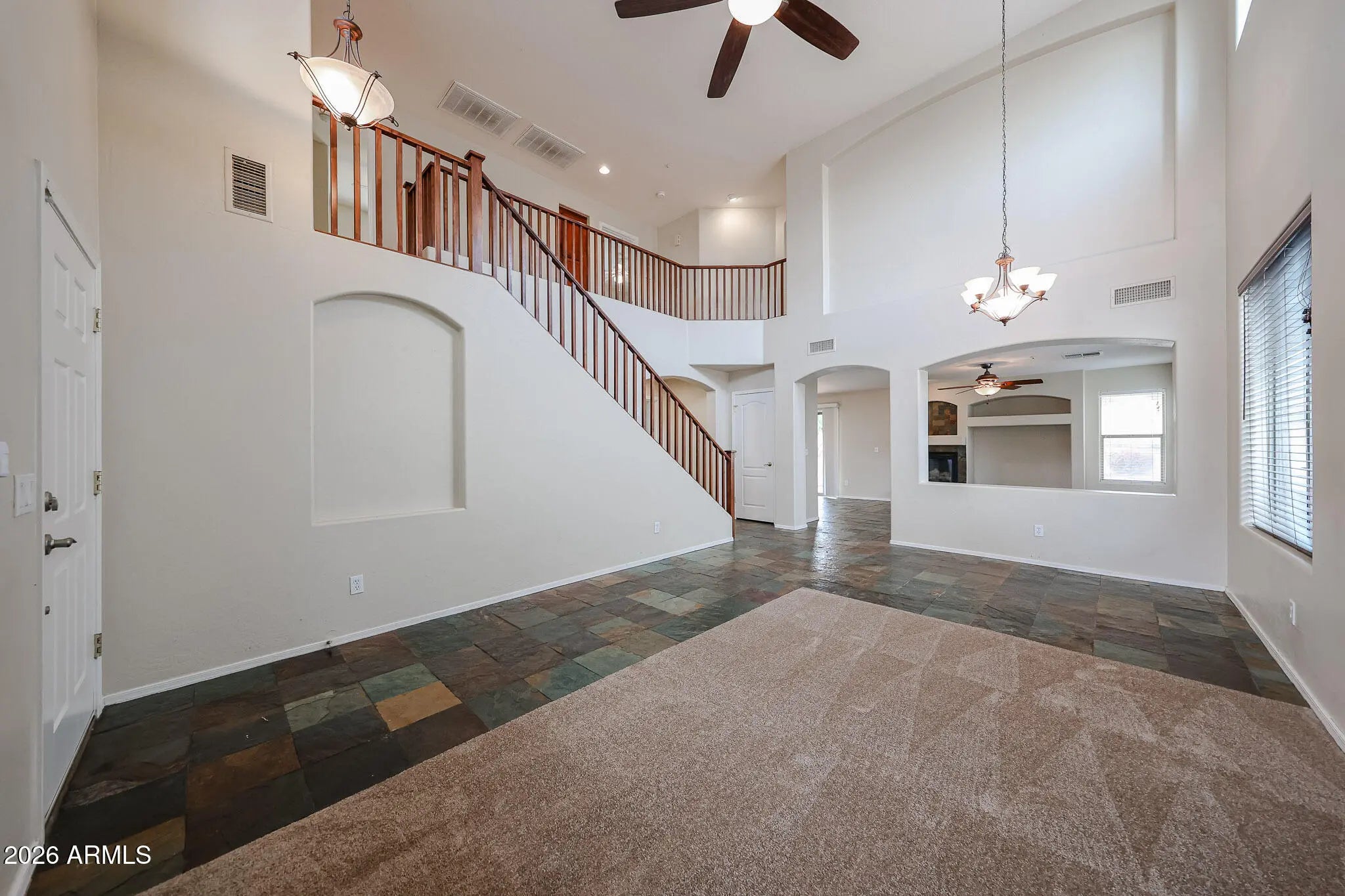 Welcome to this gorgeous home located in the highly coveted Vistancia Village. This property has neutral paint and brand new carpet thru out. Situated in a prime location, this home boasts the award-winning elementary school that Vistancia is known for. Step inside and be captivated by the popular Maracay homes floor plan, featuring a convenient main floor bedroom and full bath. The upstairs master suite offers a tranquil deck, as well as a spacious walk-in closet. The interior of the home showcases a beautiful combination of slate, wood, and carpet flooring, creating a warm and inviting atmosphere. The upgraded cabinetry, stainless steel appliances including brand new fridge, huge island in the kitchen. Large Backyard. Vistancia Village provides an abundance of amenities, including multiple pools (some heated), pickleball courts, an indoor basketball court, a clubhouse, and numerous walking trails.