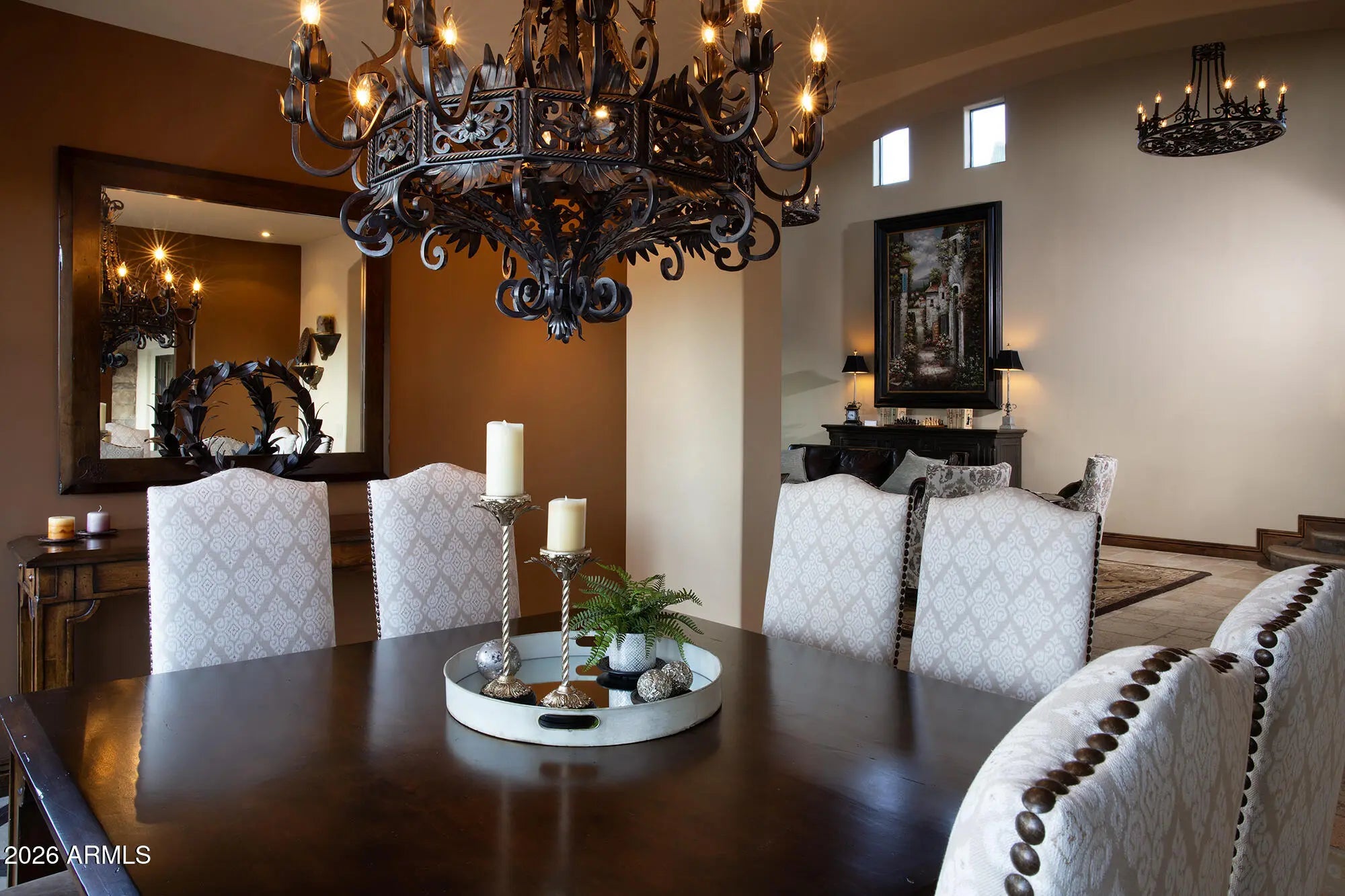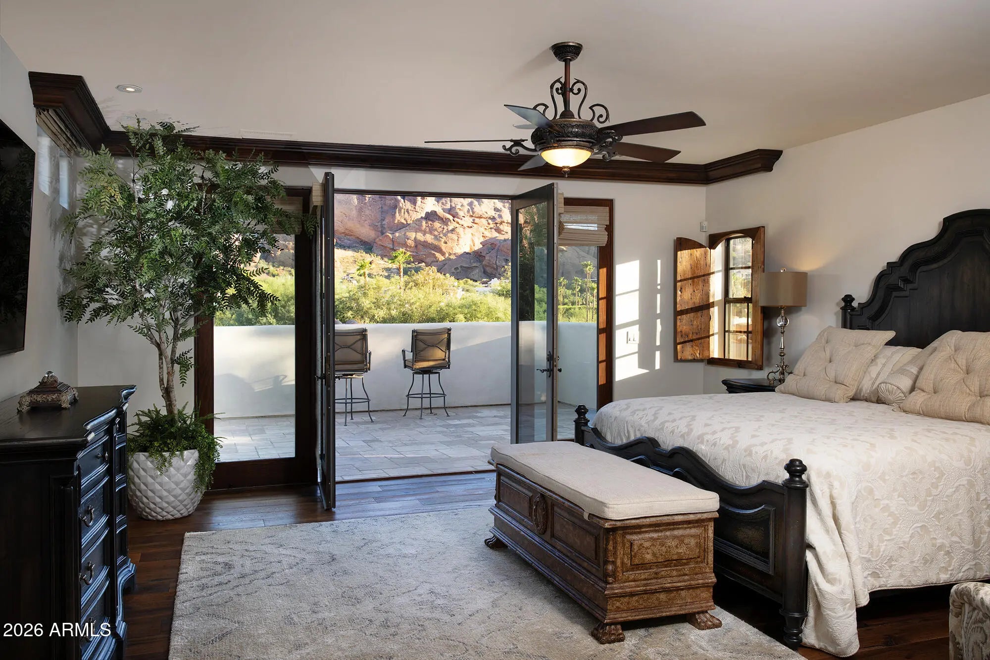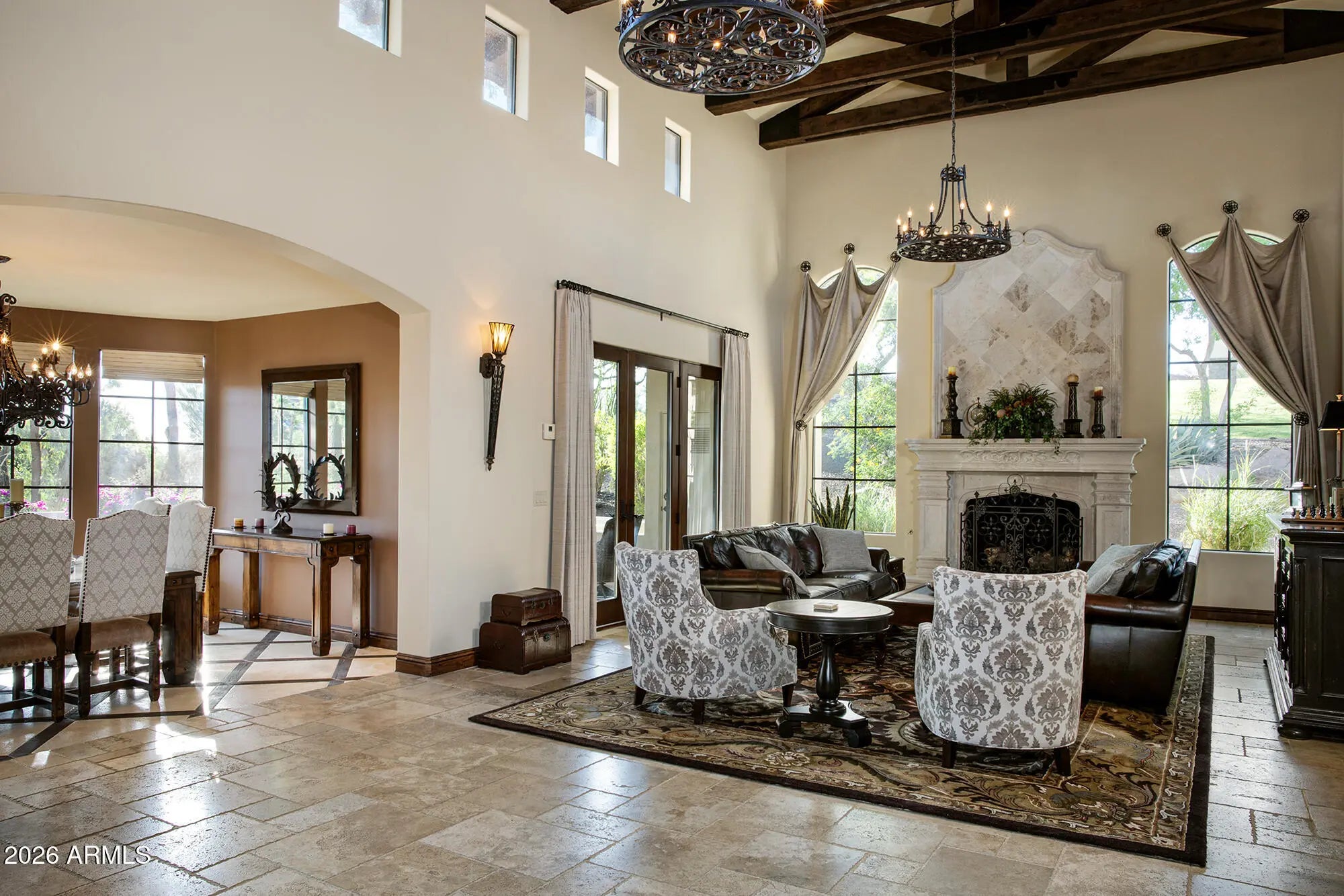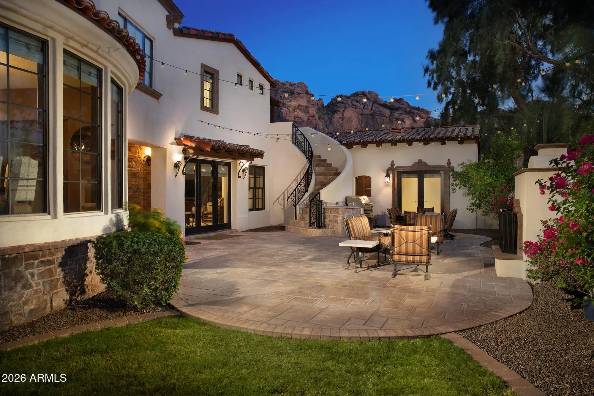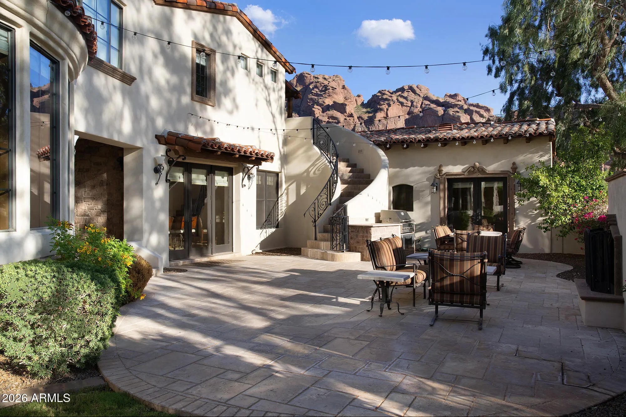 Breathtaking views of Camelback Mountains's Echo Canyon showcases this Mediterranean masterpiece. The home features exquisite features and finishes including separate living and family rooms, a formal dining room leading to private entertainment courtyard w/fireplace, tumbled honed marble/wood floors, hand hewn trusses, stacked stone/Canterra accents, baronial LR fireplace. The huge gourmet kitchen adjoins FR/ music/media area w/ Viking stainless appliances & oversize island. The romantic Primary suite offers privacy, master bath w/ classic tub, his/hers closets & view deck. The backyard is ideal for entertaining with negative edge pool, spa & BBQ overlooking spectacular Camelback Montain views. The 4 car garage sports a fabulous fitness room.
