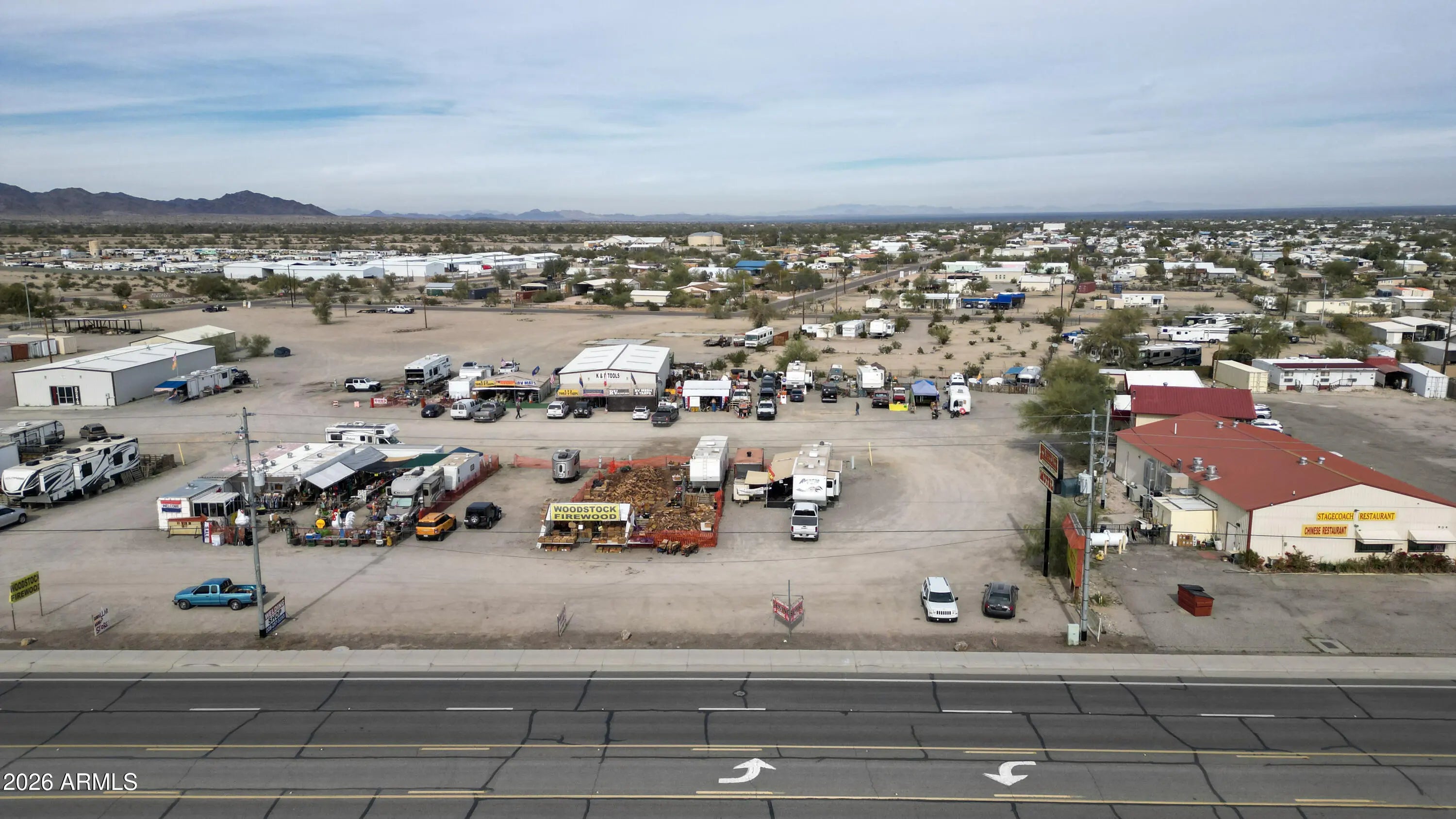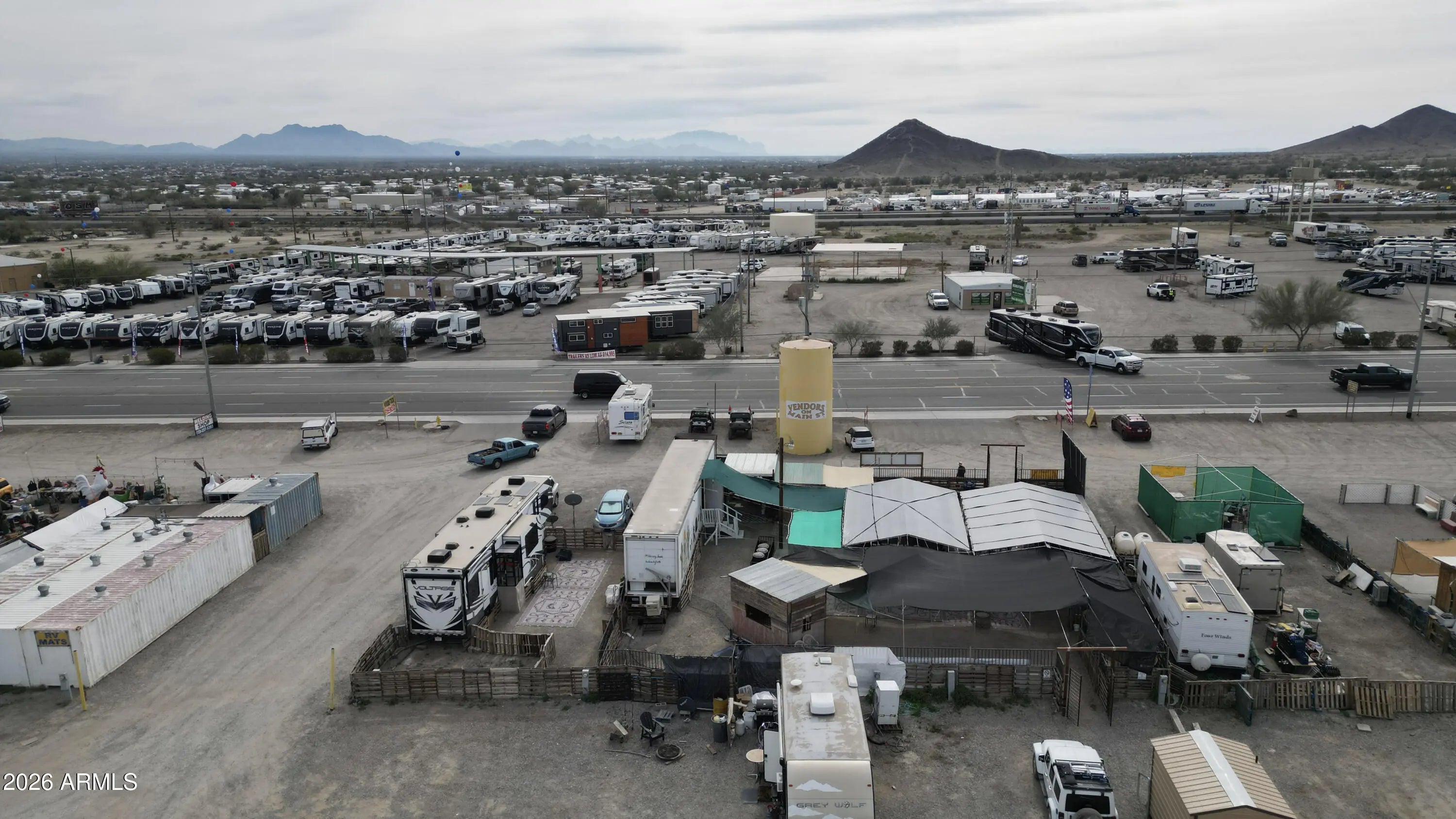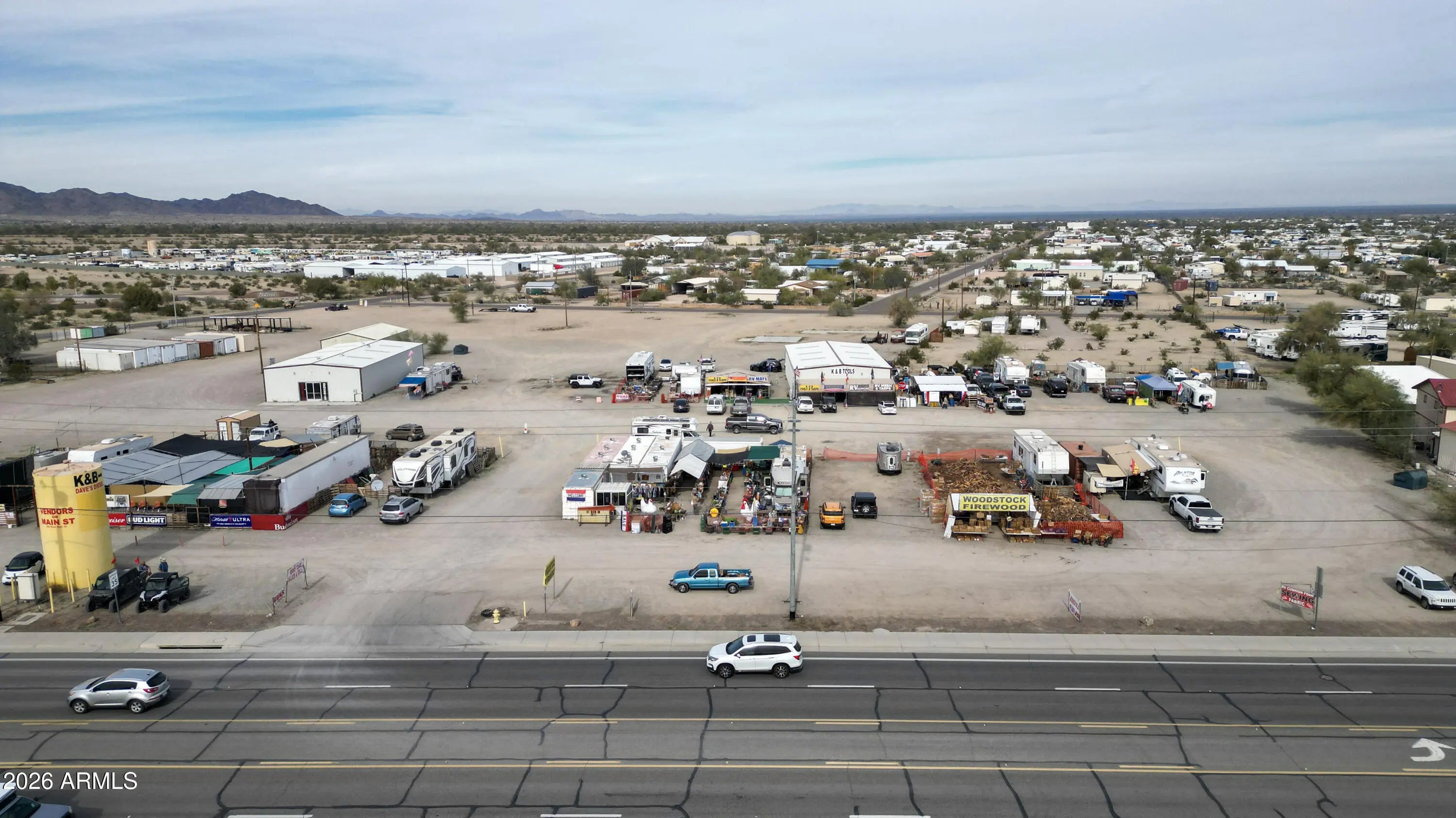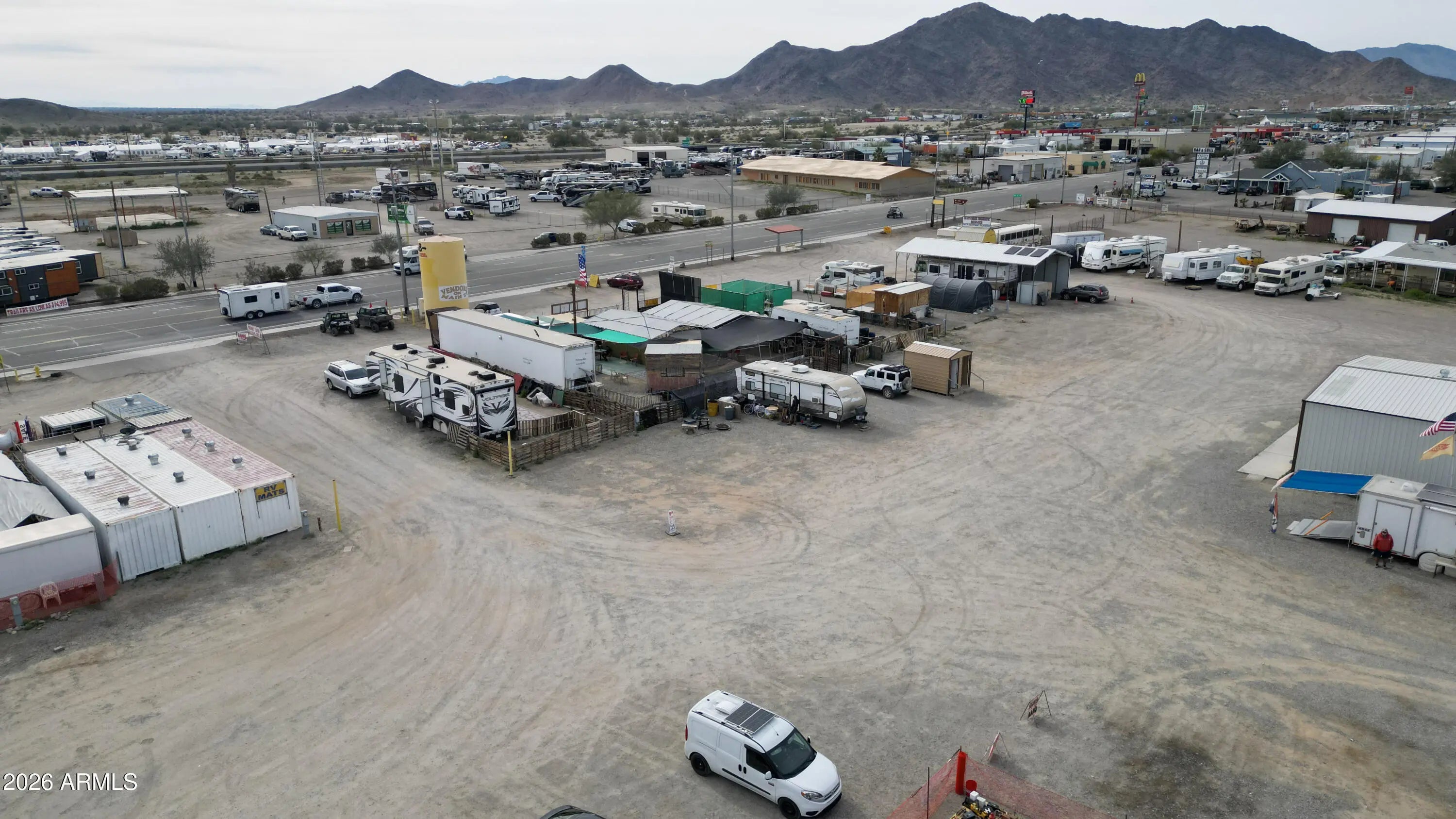 Rare investment opportunity to own the 'Vendors on Main' swap meet site, a staple in Quartzsite sitting on 8.57 acres of prime General Commercial (B-C2) zoned land. This turn-key operation features 33 vendor lots equipped with full hookups (water, sewer, electric), currently commanding $1,800 per 6-month seasonal lease plus utilities. In addition to the seasonal income, the property includes three year-round leaseable buildings. The site is supported by 4 working bathrooms and enjoys high visibility with frontage near I-10 and Kofa Ave. With a mix of repeat full-time and seasonal vendors already in place, there is significant upside potential. The expansive acreage allows for the addition of more permanent buildings, expanded RV spaces, or increased vendor density. Sale includes multi Multiple addresses & Parcels: 245 Kofa Ave, 980 W Main St, 1010 W Main St, 1019 W Elsie Ln, 985 W Elsie, 965 W Elsie Ln, 926 W Elsie Ln. See exhibit 1 for legals and all parcel #'s. *Note on Financials: This is a legacy asset being sold by a long-term owner-operator. While the property boasts a consistent history of seasonal and year-round occupancy, formal profit and loss statements are not available. This offering is positioned as a strategic value-add opportunity, where the value is anchored in the extensive 8.57-acre land footprint, prime zoning, and the turn-key utility infrastructure already in place.