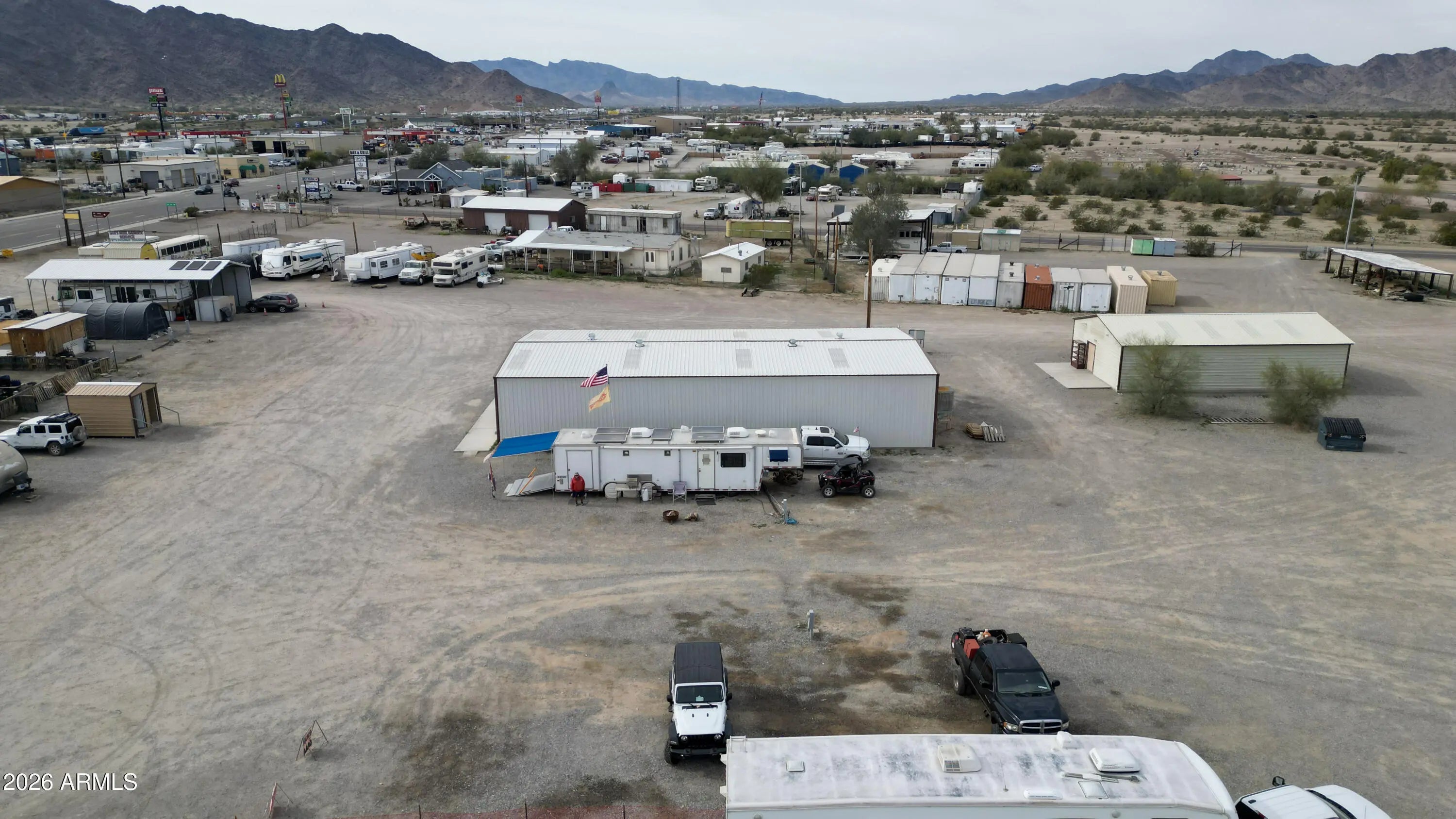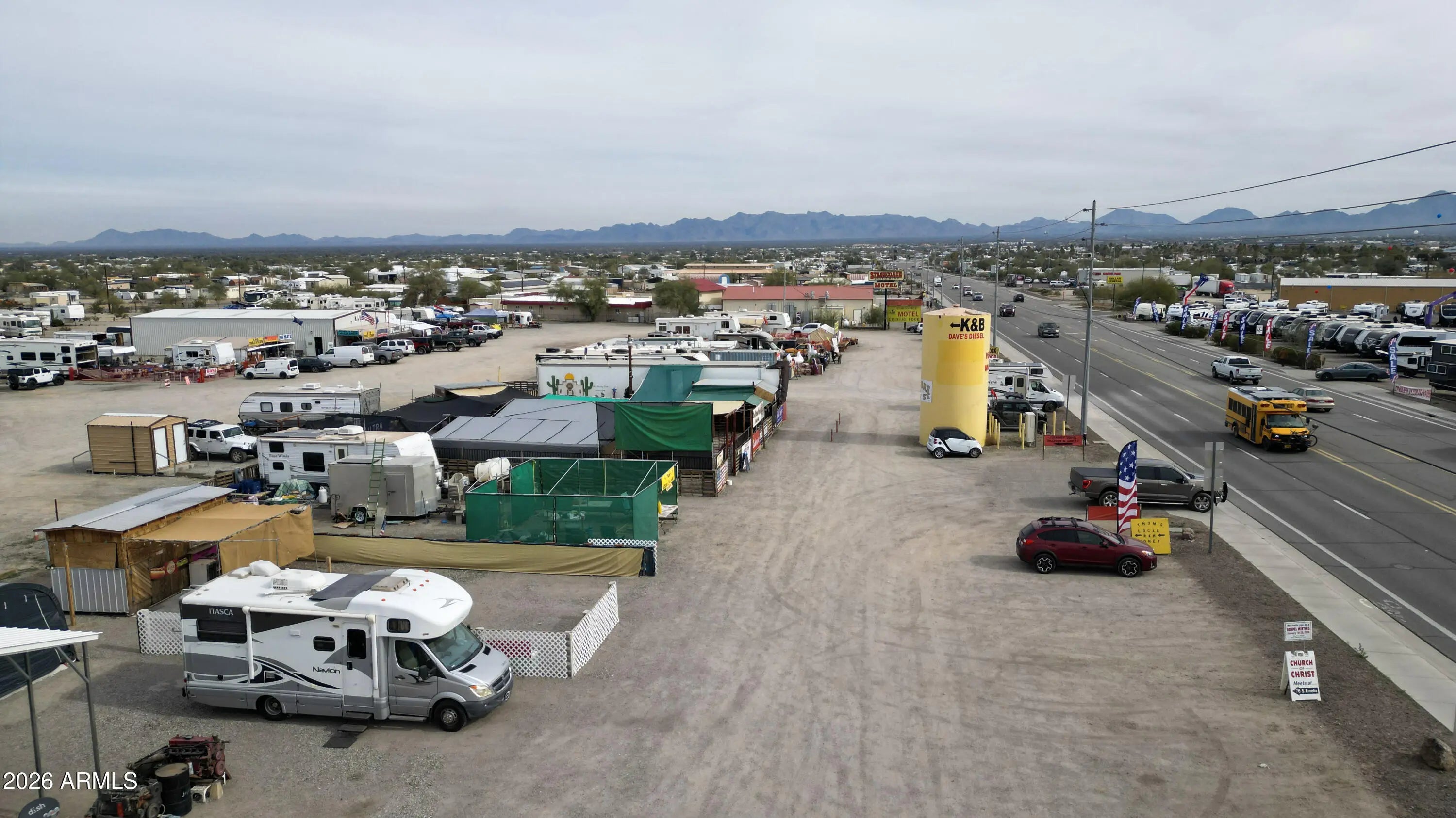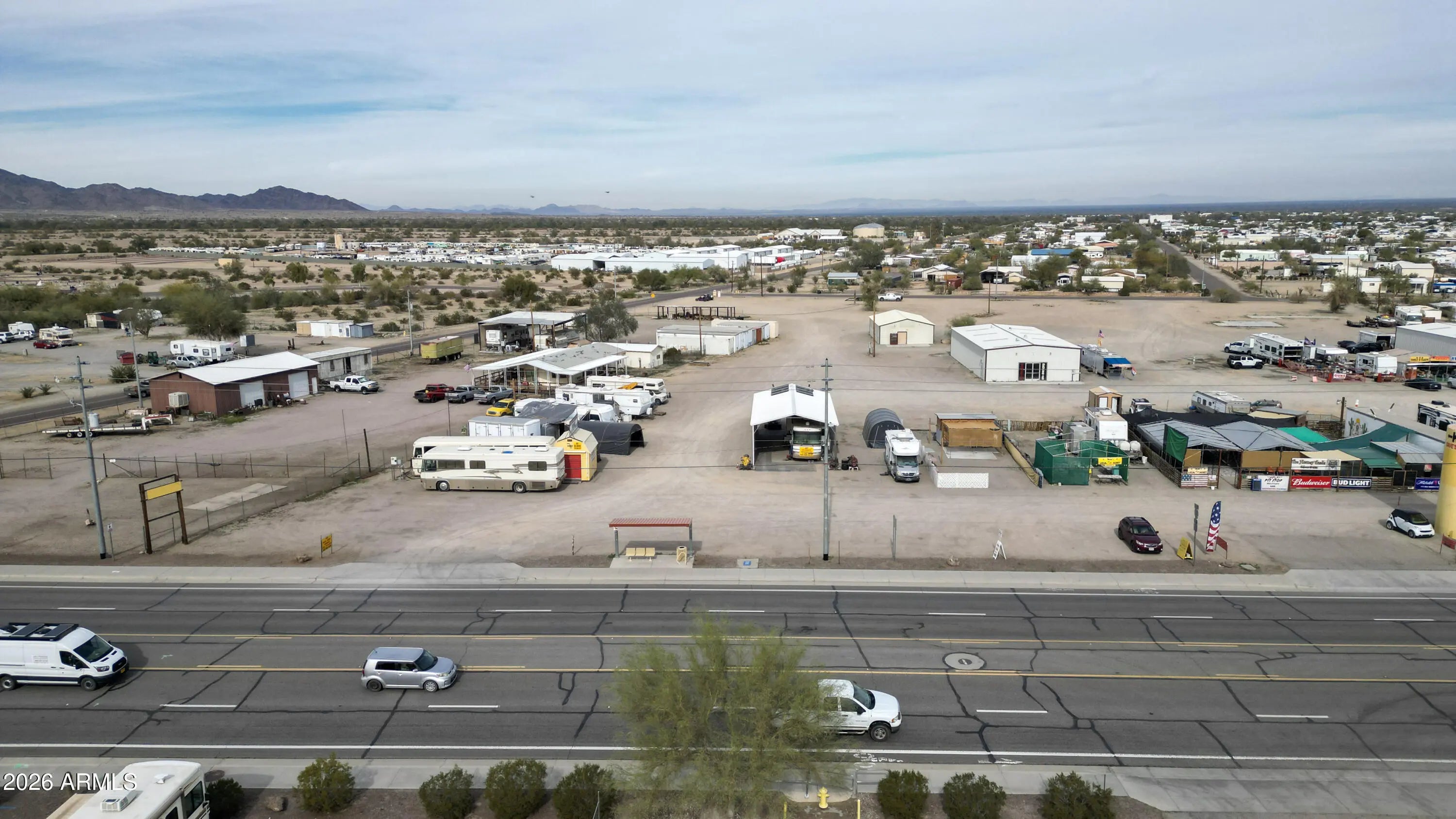 Rare investment opportunity to own the 'Vendors on Main' swap meet site, a staple in Quartzsite sitting on 8.57 acres of prime General Commercial (B-C2) zoned land. This turn-key operation features 33 vendor lots equipped with full hookups (water, sewer, electric), currently commanding $1,800 per 6-month seasonal lease plus utilities. In addition to the seasonal income, the property includes three year-round leaseable buildings. The site is supported by 4 working bathrooms and enjoys high visibility with frontage near I-10 and Kofa Ave. With a mix of repeat full-time and seasonal vendors already in place, there is significant upside potential. The expansive acreage allows for the addition of more permanent buildings, expanded RV spaces, or increased vendor density. Sale includes multi Multiple addresses & Parcels: 245 Kofa Ave, 980 W Main St, 1010 W Main St, 1019 W Elsie Ln, 985 W Elsie, 965 W Elsie Ln, 926 W Elsie Ln. See exhibit 1 for legals and all parcel #'s. *Note on Financials: This is a legacy asset being sold by a long-term owner-operator. While the property boasts a consistent history of seasonal and year-round occupancy, formal profit and loss statements are not available. This offering is positioned as a strategic value-add opportunity, where the value is anchored in the extensive 8.57-acre land footprint, prime zoning, and the turn-key utility infrastructure already in place.