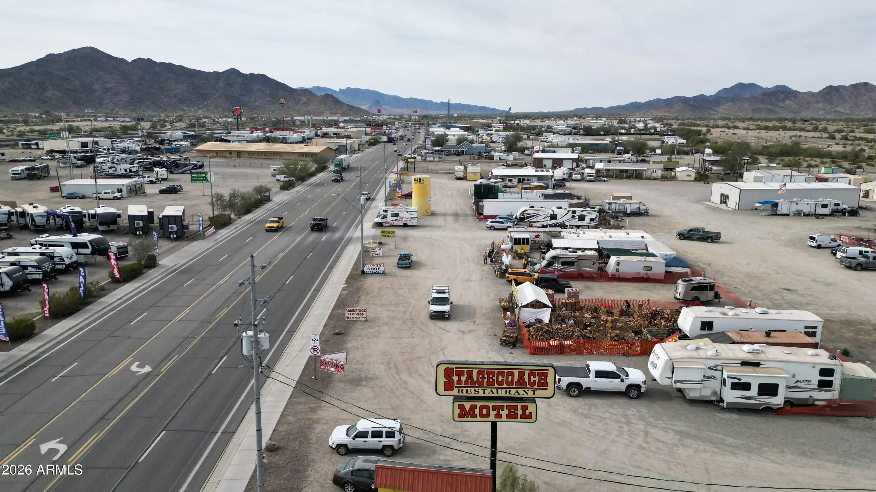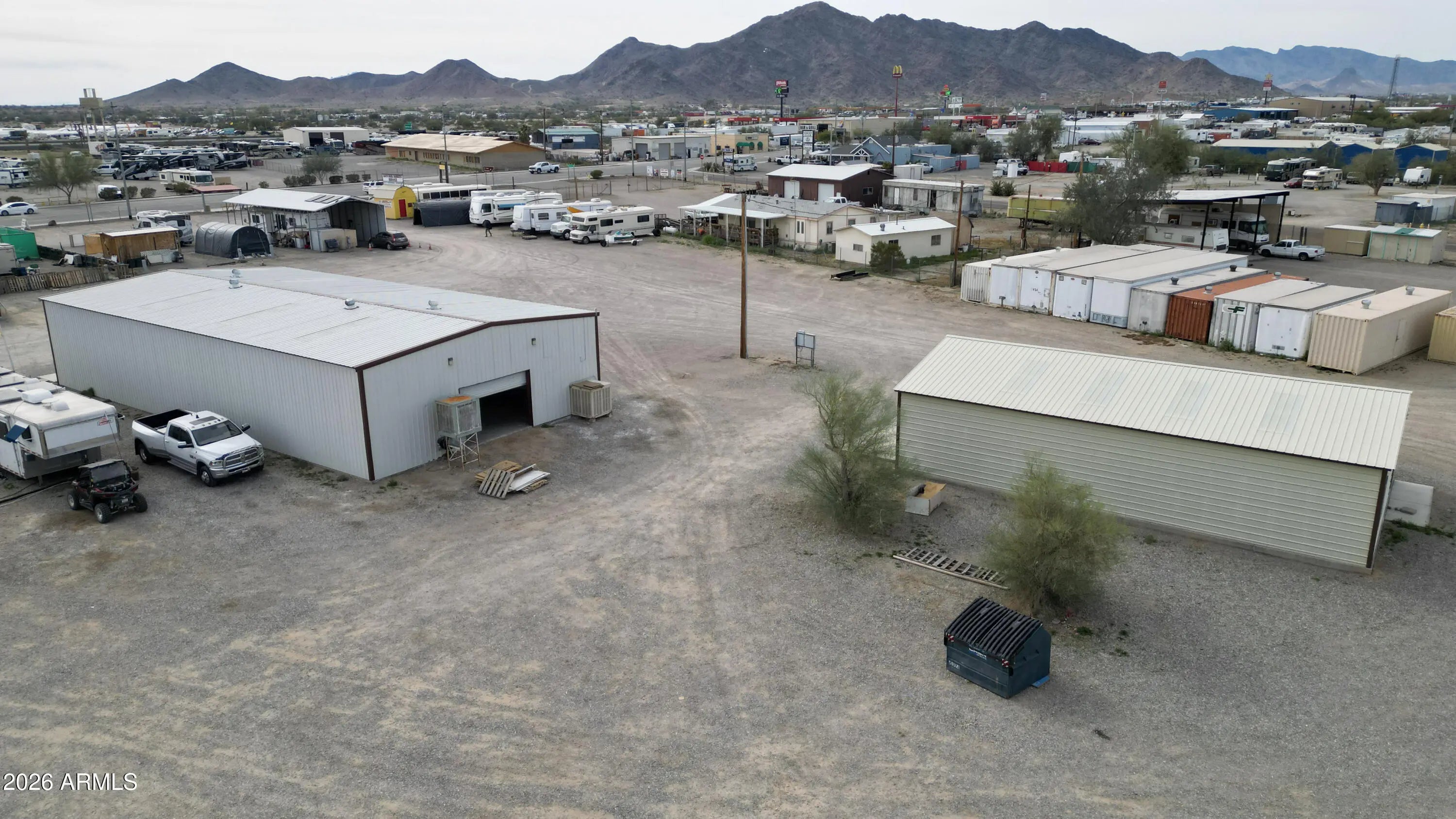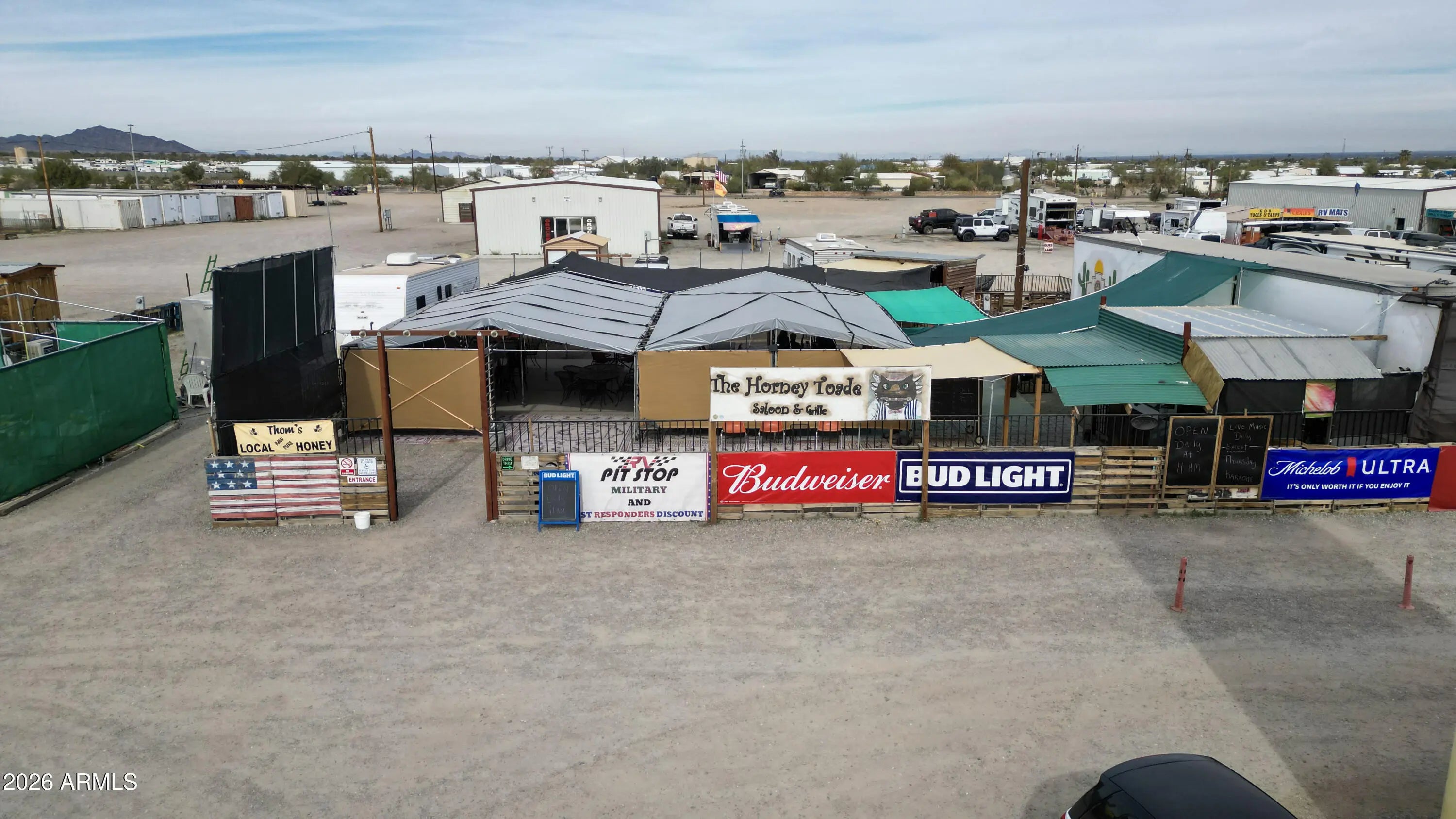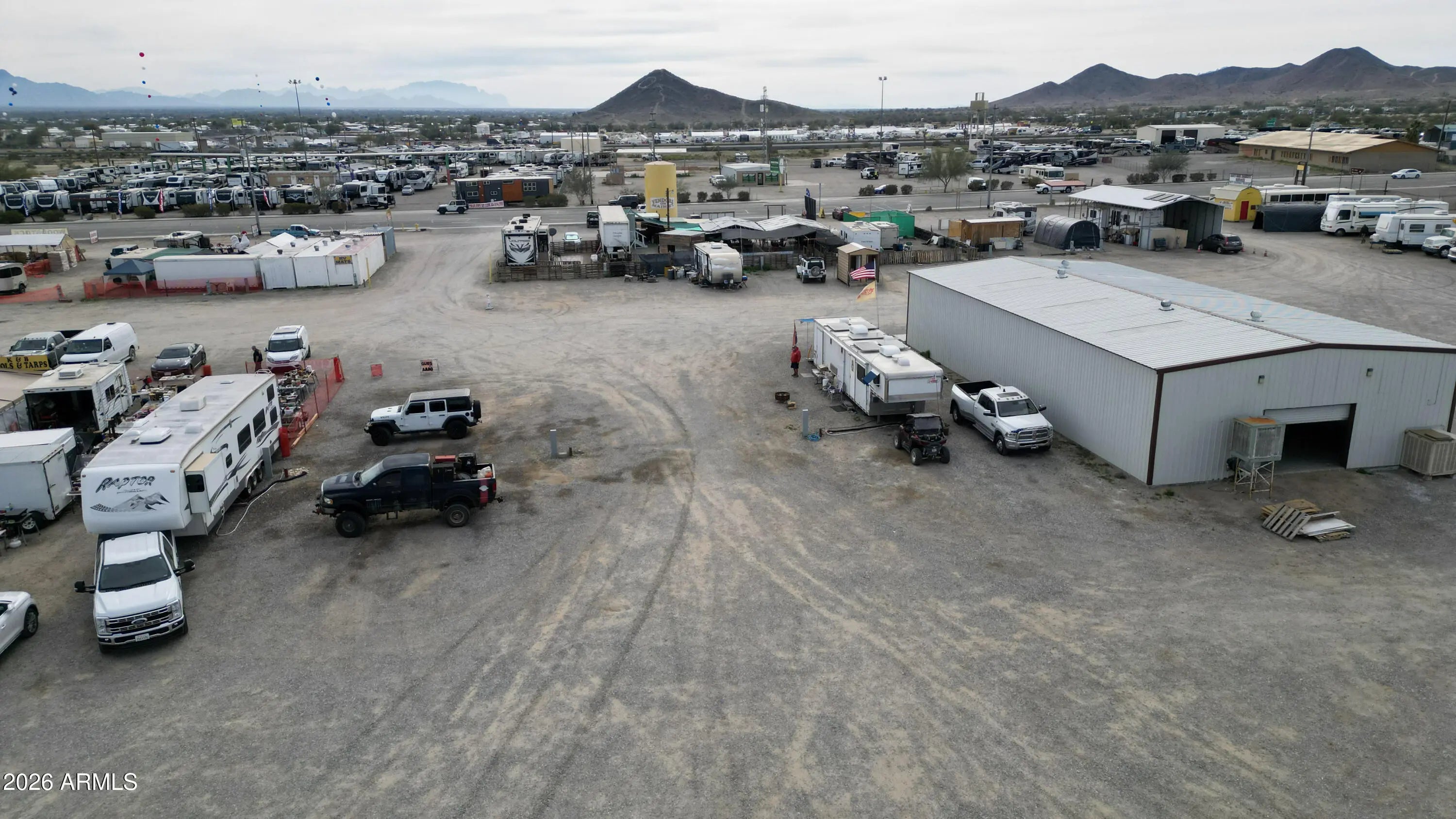 Rare investment opportunity to own the 'Vendors on Main' swap meet site, a staple in Quartzsite sitting on 8.57 acres of prime General Commercial (B-C2) zoned land. This turn-key operation features 33 vendor lots equipped with full hookups (water, sewer, electric), currently commanding $1,800 per 6-month seasonal lease plus utilities. In addition to the seasonal income, the property includes three year-round leaseable buildings. The site is supported by 4 working bathrooms and enjoys high visibility with frontage near I-10 and Kofa Ave. With a mix of repeat full-time and seasonal vendors already in place, there is significant upside potential. The expansive acreage allows for the addition of more permanent buildings, expanded RV spaces, or increased vendor density. Sale includes multi Multiple addresses & Parcels: 245 Kofa Ave, 980 W Main St, 1010 W Main St, 1019 W Elsie Ln, 985 W Elsie, 965 W Elsie Ln, 926 W Elsie Ln. See exhibit 1 for legals and all parcel #'s. *Note on Financials: This is a legacy asset being sold by a long-term owner-operator. While the property boasts a consistent history of seasonal and year-round occupancy, formal profit and loss statements are not available. This offering is positioned as a strategic value-add opportunity, where the value is anchored in the extensive 8.57-acre land footprint, prime zoning, and the turn-key utility infrastructure already in place.