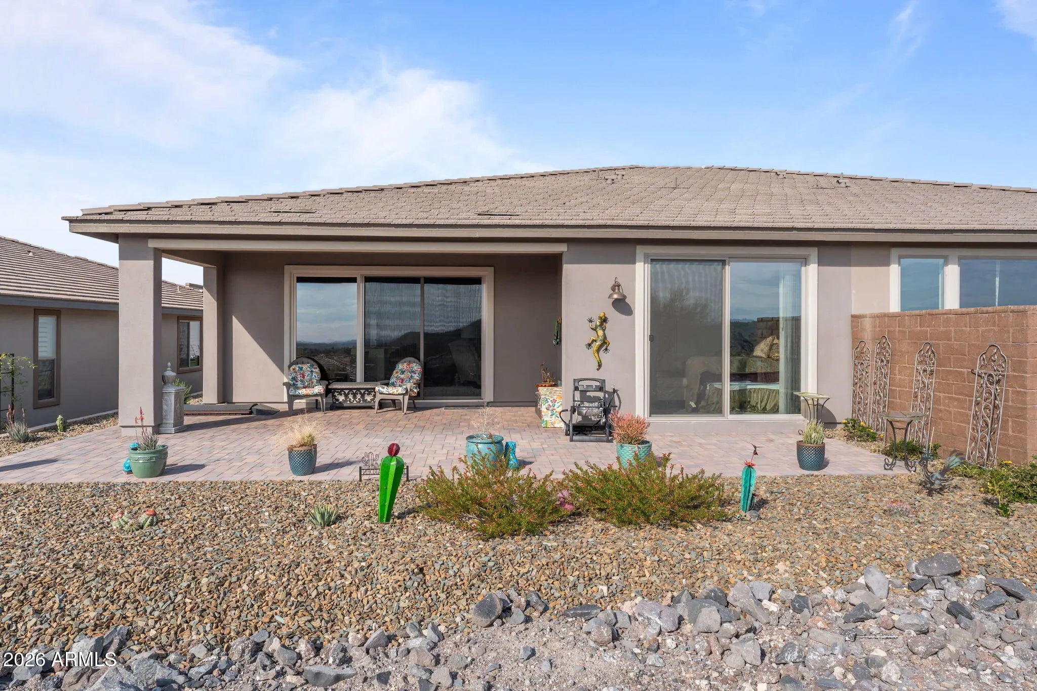 Discover this stunning duet home featuring 2 bedrooms and 2.5 bathrooms, located in the highly desirable Wickenburg Ranch community. Designed for modern living, this open floor plan showcases elegant wood-look tile throughout the entire home. The upgraded kitchen serves as the heart of the home, complete with a large island for dining and entertaining, sleek modern appliances. A dramatic wall of sliding glass doors frames sweeping views of the desert mountains, creating a picturesque backdrop for everyday living. Step outside to an expansive patio designed for year-round enjoyment. The covered patio offers shade and comfort, and also provides the perfect spot to dine al fresco or unwind while taking in the breathtaking scenery. The duet property, offers a low-maintenance lifestyle without sacrificing privacy. With stunning mountain vistas and access to the incredible resort-style amenities Wickenburg Ranch is known for, this home captures the very best of desert living.