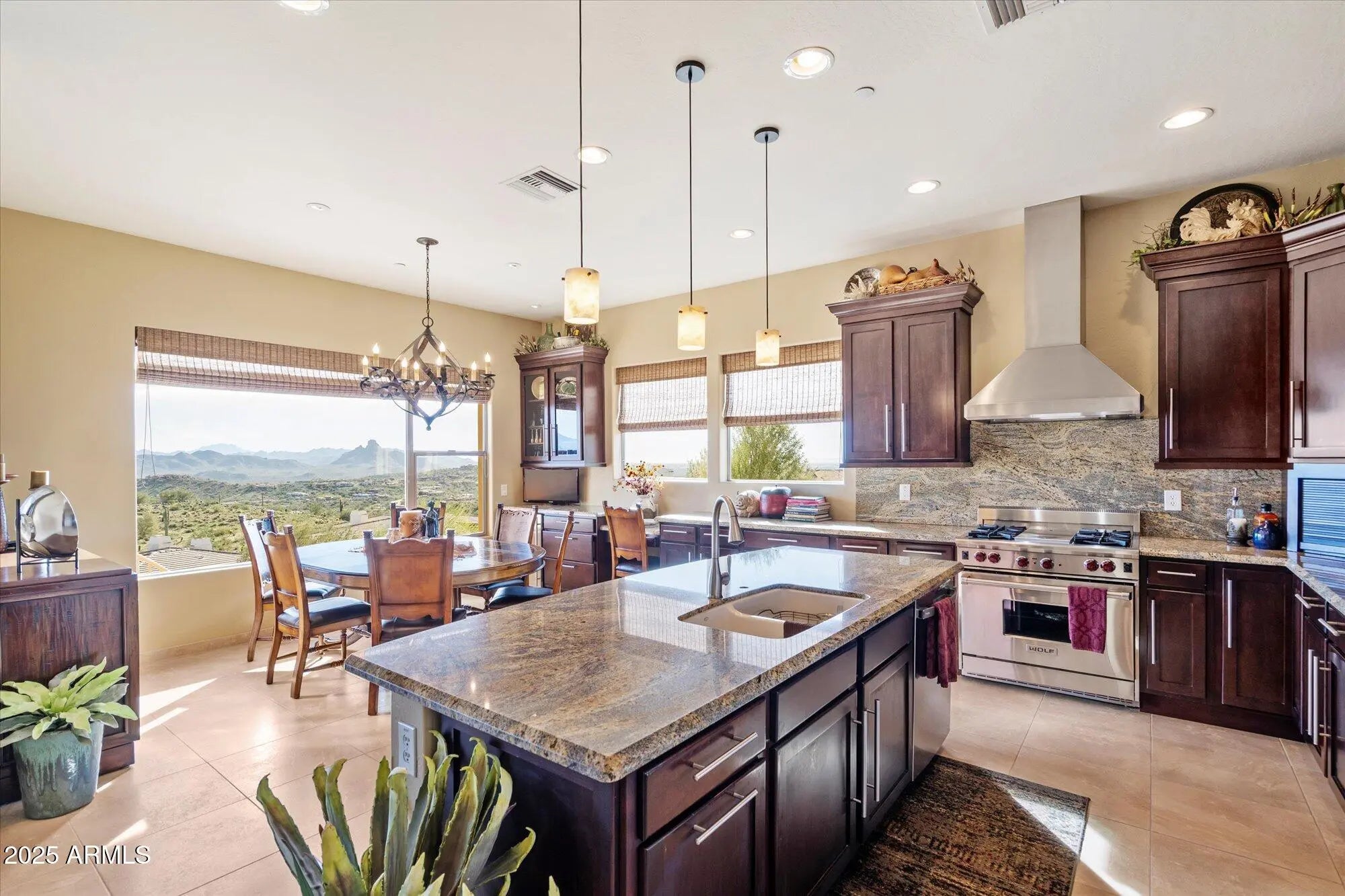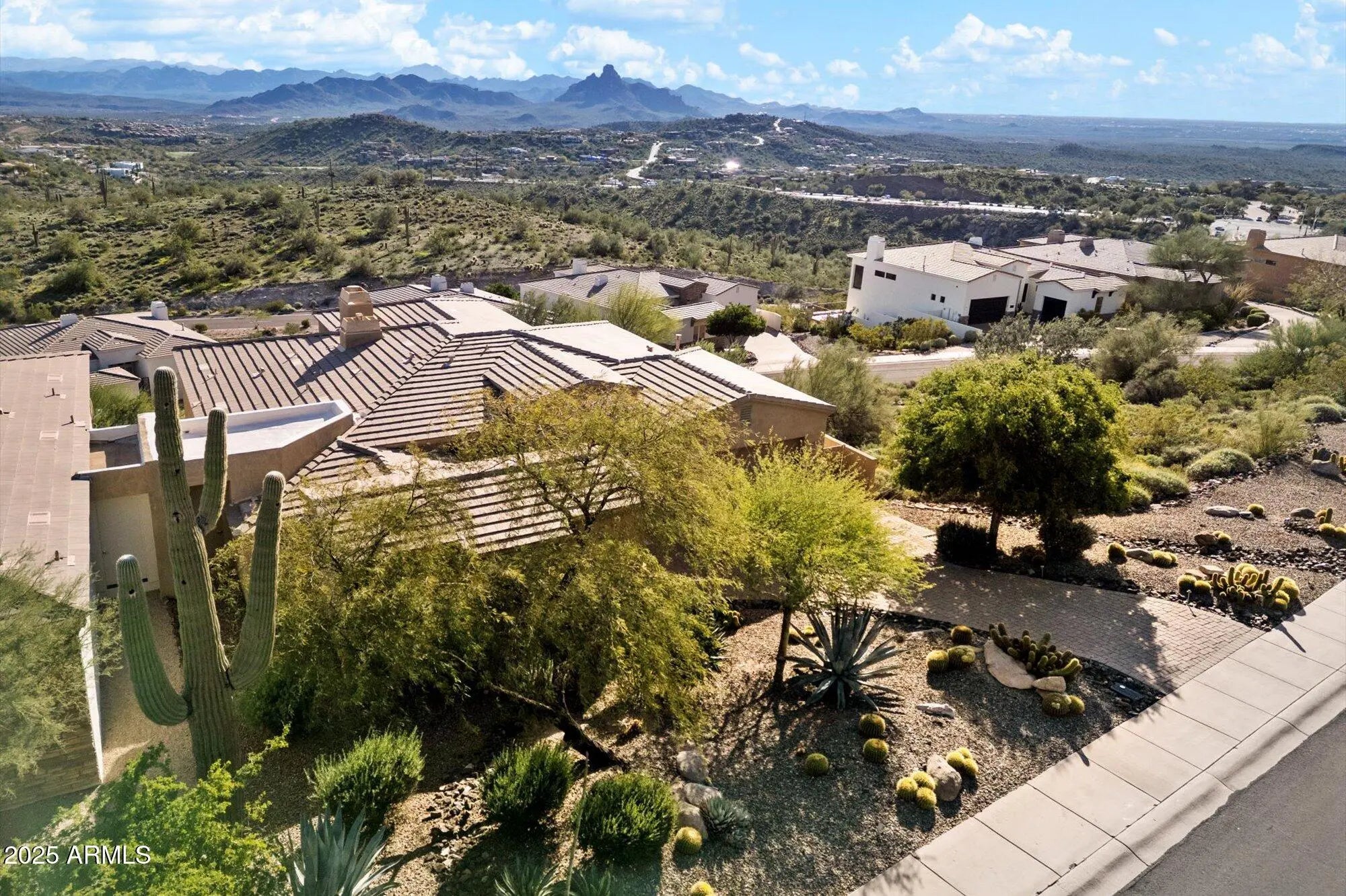 Breathtaking mountain & fountain views await in this stunning home located in The Summit at Crestview. Designed for indoor-outdoor living, the floor plan features an upper-level living room with a cozy fireplace and expansive picture windows that flood the space with natural light. The chef's kitchen is equipped with a large kitchen island, wolf stove, breakfast bar, and walk-in pantry. The luxurious primary suite offers a true retreat with a garden tub, separate shower, dual sinks, and a walk-in closet. The exterior spiral staircase connects the upper balcony to the lower patio. The backyard is a private desert oasis featuring a relaxing spa with a rock waterfall and a built-in fire pit. This home combines luxury with the ultimate Arizona lifestyle