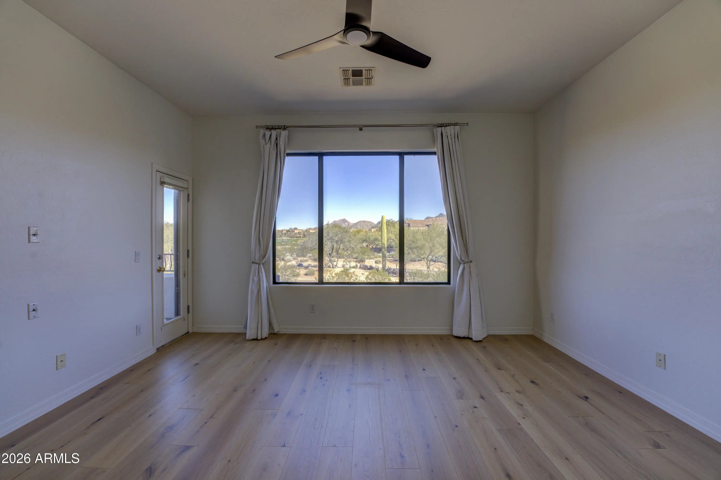 Beautifully maintained 2 bedroom, den/office with 2/1/2 baths and east facing first floor patio. First floor is bamboo wood throughout. Updates include 2nd floor white oak engineered hardwood flooring and all new master shower. New A/C in 2025 and new gas range in 2024. Stairway, under stairway closet and master closet have new, high end Mohawk carpet in a neutral shade. New 50 gallon hot water heater, January 2026 New custom patio deck door with a March 2026 expected delivery. Master bedroom and balcony offer a lovely, unobstructed view to the McDowell Mountains. 2 car garage has direct access to the kitchen. Pima Road is easily accessed by the Grayhawk South Gate at Hualapai Road.