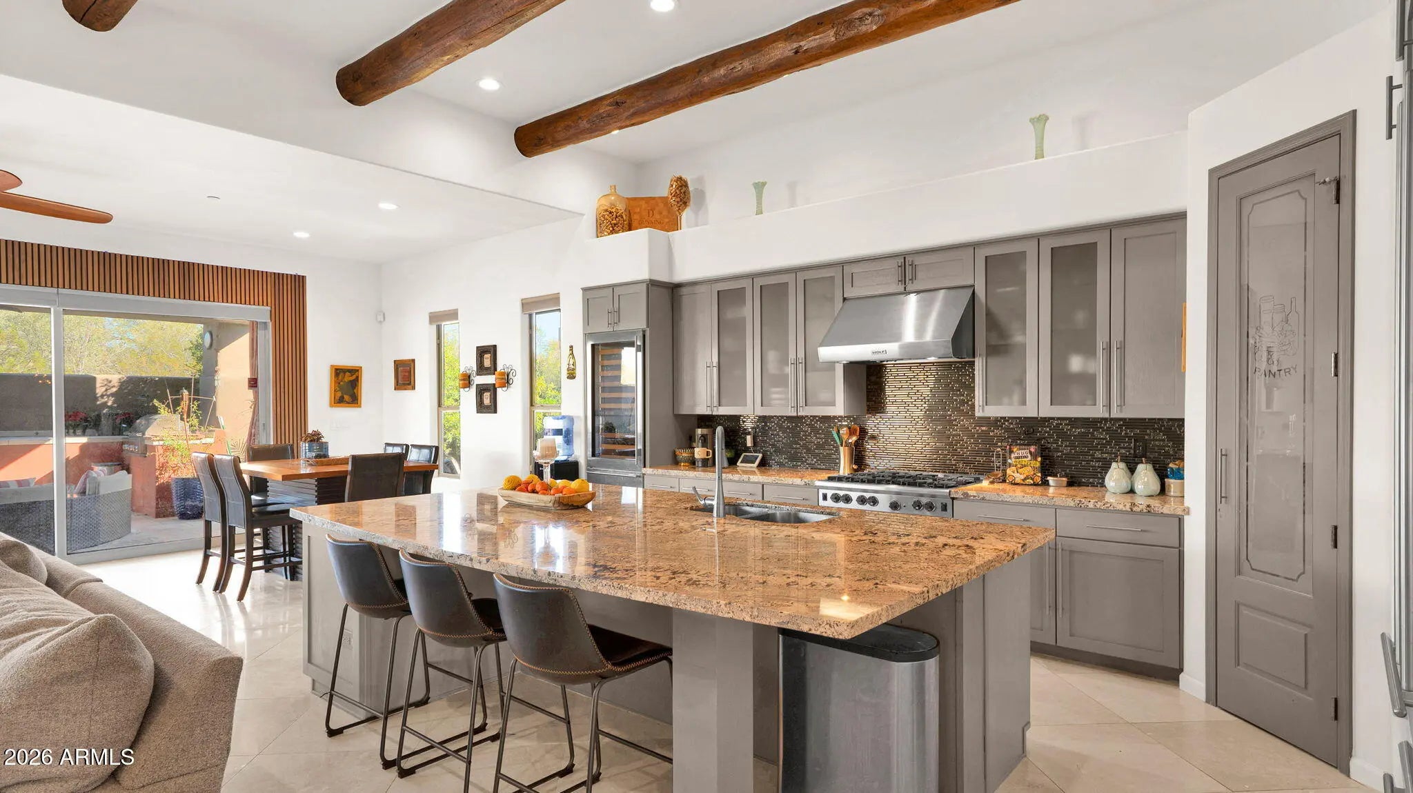 Located in the gated Desert Diamond community of Troon North, this beautifully upgraded home sits on a half-acre lot and is designed for seamless indoor-outdoor living. The open floor plan offers 3 bedrooms, a den, and a 248 sq ft addition connecting the family room to the covered patio. The chef's kitchen features Wolf & Sub-Zero appliances, granite countertops, custom cabinetry, walk-in pantry, and large island. The primary suite includes a private patio and spa-like bath. Enjoy a private backyard retreat with covered patio, built-in BBQ, gas fireplace, saltwater pool with waterfall, travertine pavers, and desert landscaping. Minutes from Troon North Golf Club, hiking, dining, and shopping.