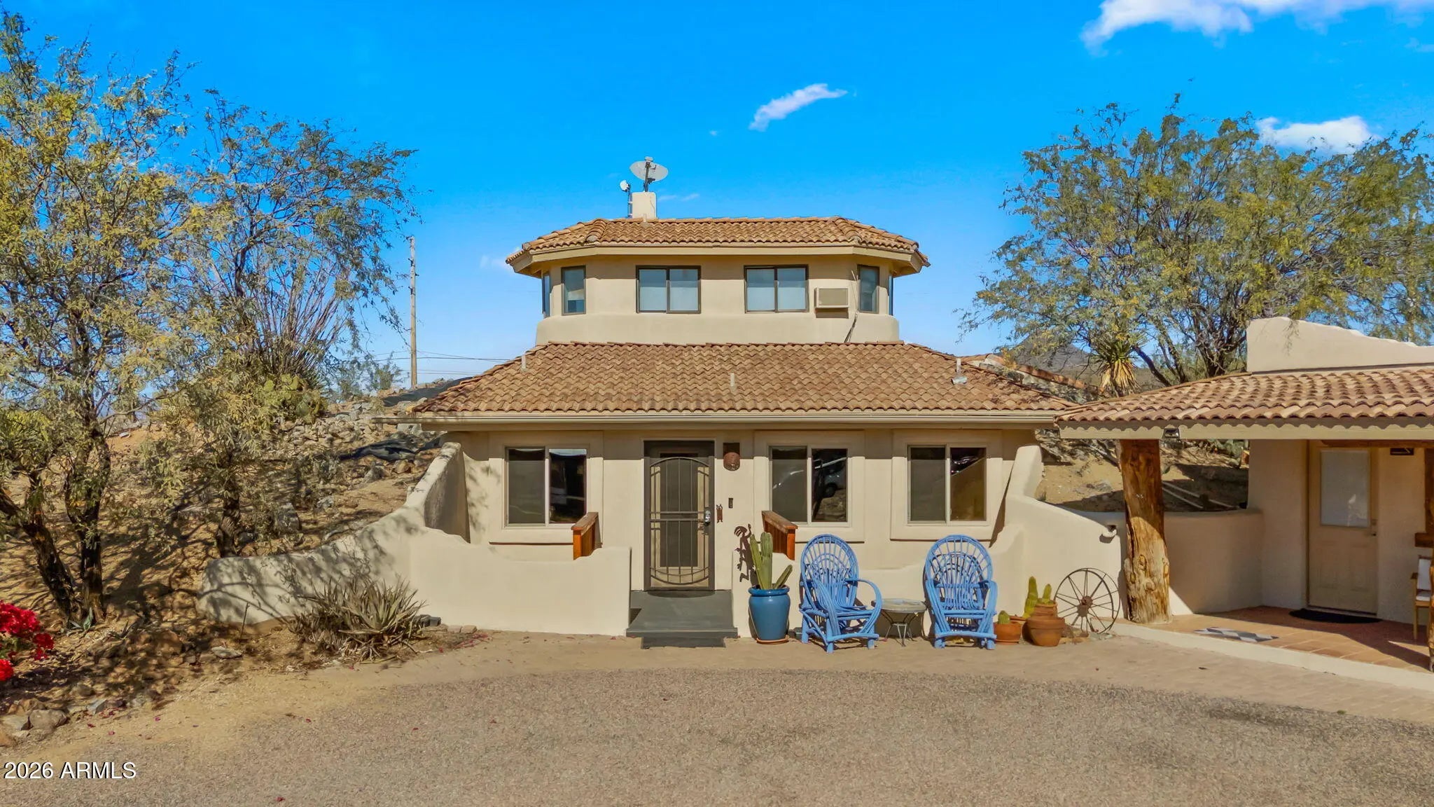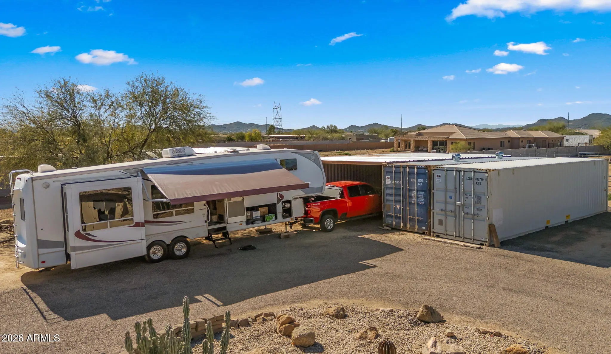 THREE-UNIT INCOME PROPERTY CONSISTING OF MAIN HOME, CASITA & METAL BARN - HORSE PROPERTY - NO HOA High-income, multi-structure property in a prime horse-country setting with direct access to open riding areas and no HOA restrictions. Configured with three separate units, it is well suited for investors, owner-occupants seeking supplemental rental income, or multi-generational living. The standout feature is a massive 5,095 sq. ft. detached metal barn / workshop with office and bathroom — a rare, commercial-scale structure ideal for toys, vehicles and equipment storage, contractor operations, hobby or collector use, and other income-producing applications. The eco-conscious 3,375 sq. ft. 4-bed / 2.5-bath main residence features a private, north-facing courtyard with pool & cabana. enhancing both rental appeal and outdoor living. A fully independent 839 sq. ft. casita/guest suite offers private entrances and a porch, along with separate access to the courtyard. The expansive acreage provides abundant additional parking, dedicated supply and equipment storage, and shaded parking, including existing container structures.