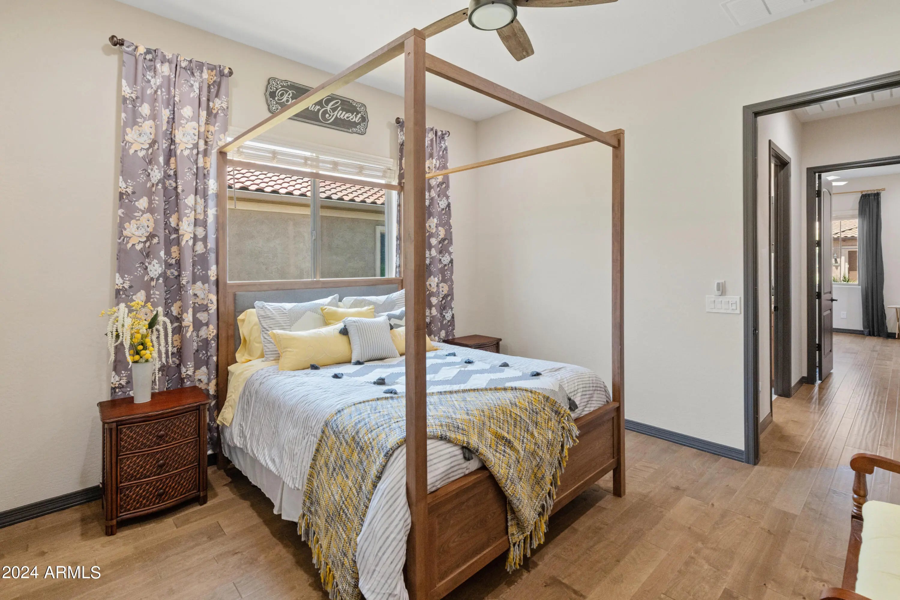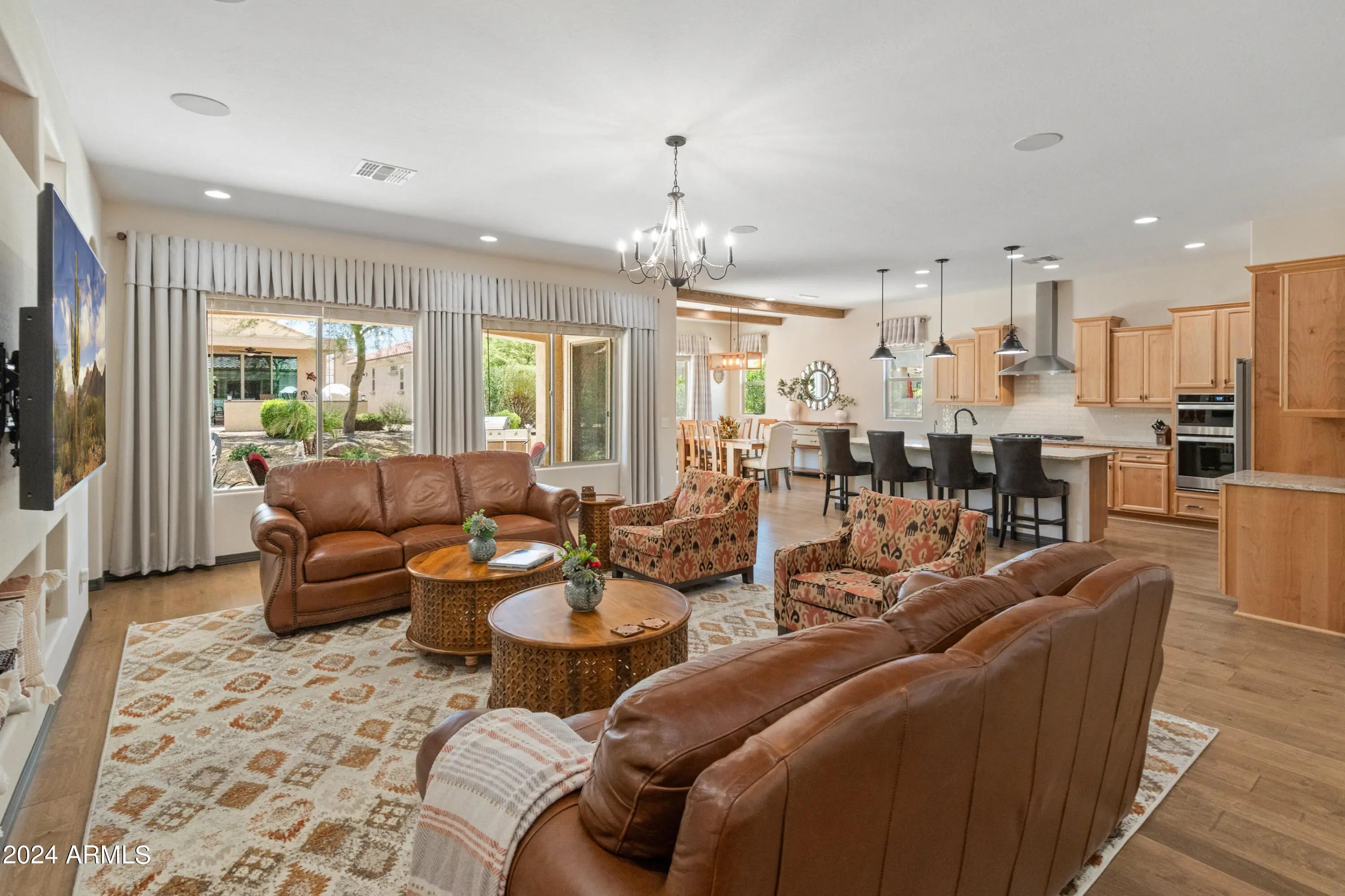 Step into refined living w/ this beautifully appointed extended Voyage floor plan, offering 3 bedrooms & 2.5 baths w/ a thoughtful balance of comfort, craftsmanship & style. Rich engineered wood flooring flows throughout, accented by elegant faux wood beams & a light-filled open layout that feels both inviting & polished. Epoxy-finished garage is exceptionally functional, featuring custom built-in cabinetry & a dedicated golf-cart bay for organized everyday convenience. A private front courtyard w/ a tranquil fountain provides a peaceful space for morning coffee or evening unwinding. The back extended patio w/ a built-in firepit creates an ideal setting for entertaining or relaxing beneath the stars. Carefully upgraded throughout this home delivers timeless design & true resort living!