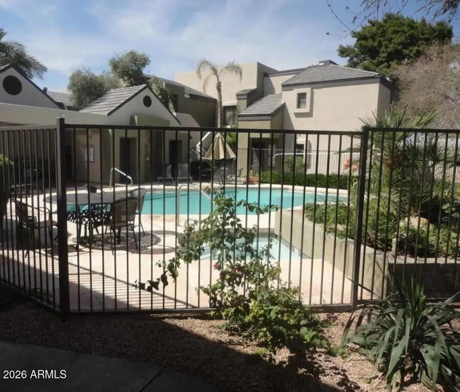 Beautiful end unit, single-level 2-bedroom, 2-bathroom condo featuring a cozy fireplace and attached direct access 1-car garage. The home offers tile flooring throughout, spacious living areas, and both front and side patios perfect for relaxing or entertaining. The kitchen includes all appliances--oven, dishwasher, and refrigerator--plus a convenient stacked washer and dryer. Enjoy ample storage and a highly desirable location within the community with additional guest parking nearby. The community pool is just steps away and visible from the unit, adding to the convenience and lifestyle appeal. Ideally located close to premier shopping and dining including Trader Joe's, Whole Foods, PetSmart, and the Biltmore area.