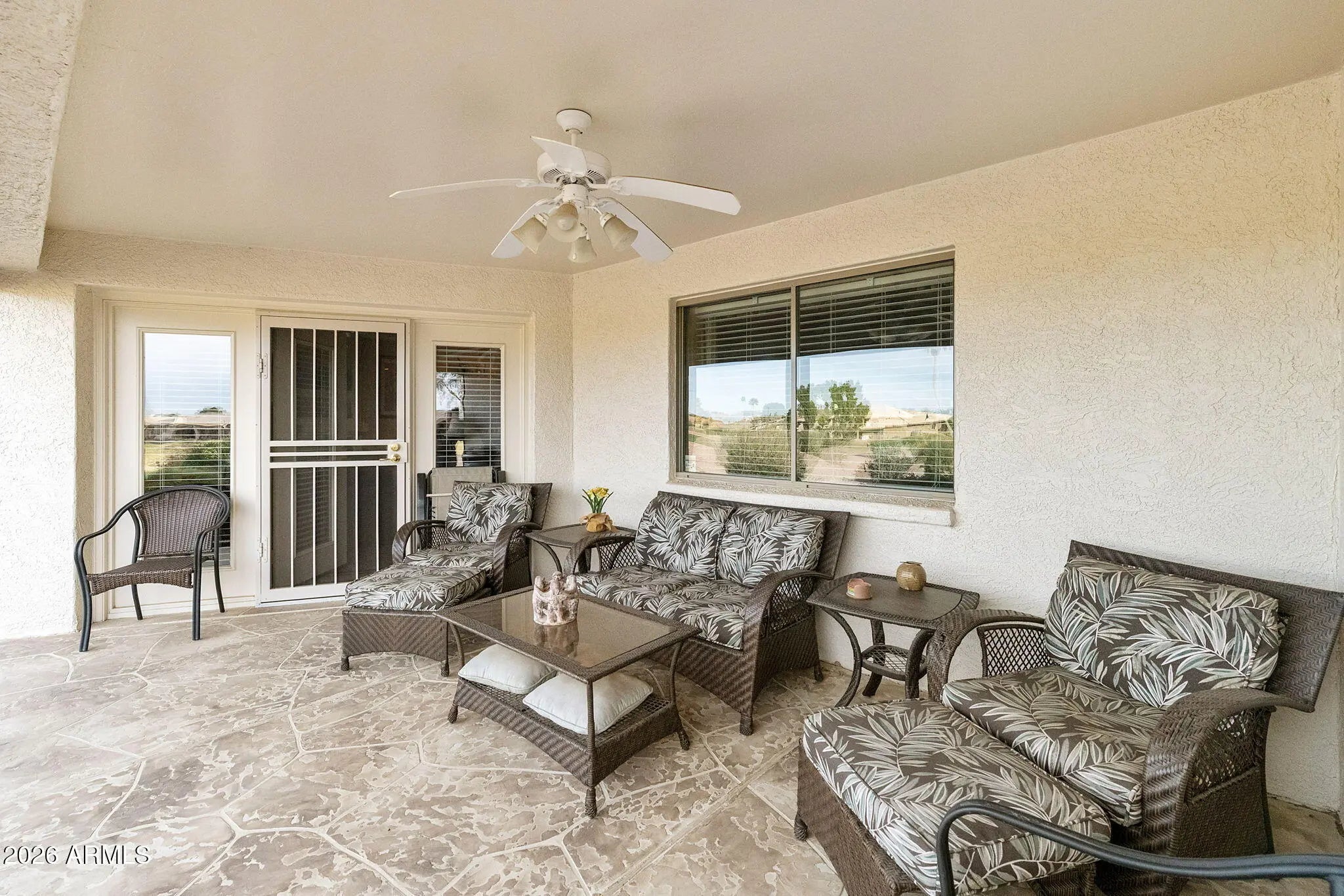 Beautifully maintained and furnished, this 2 bedroom, 2 bathroom townhome offers effortless living in the highly desirable Sunland Springs Village 55+ community. Situated on a premium golf course lot between Holes 7 and 8, the home delivers peaceful fairway views and a true lock‑and‑leave lifestyle. The bright open floor plan features a spacious great room, dining area, and a well‑designed kitchen that keeps everything within easy reach. Both bedrooms are generously sized, and the primary suite includes its own private bath for added comfort. Thoughtful upgrades include roller shields, water softener, and reverse osmosis system, providing convenience, security, and improved water quality. A private covered patio extends your living space outdoors, perfect for m