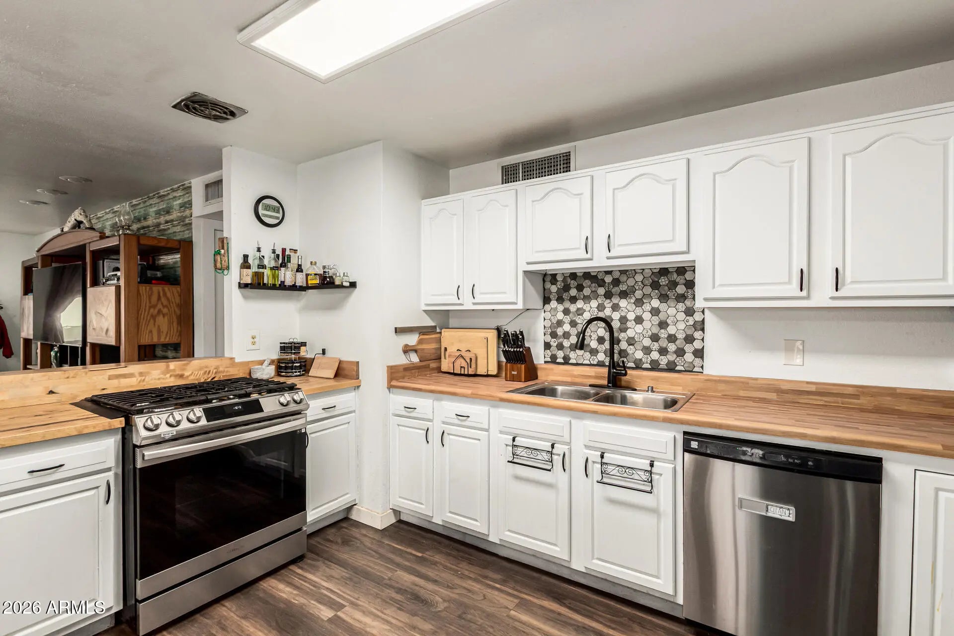 Charming 3-bedroom, 2 bathroom home in a great location! Features an inviting great room with wood flooring and a neutral palette. Eat-in kitchen with white cabinetry, butcher block countertops, and stainless-steel appliances. Primary bedroom includes a private bath. Spacious 3-car garage approx. 600 sq ft with 12-ft ceilings, skylights, and A/C—ideal for a workshop, hobby space, or car enthusiast. Enjoy the open patio and sparkling pool. NO HOA. Conveniently located near schools, restaurants, and shopping. A great opportunity you don't want to miss!