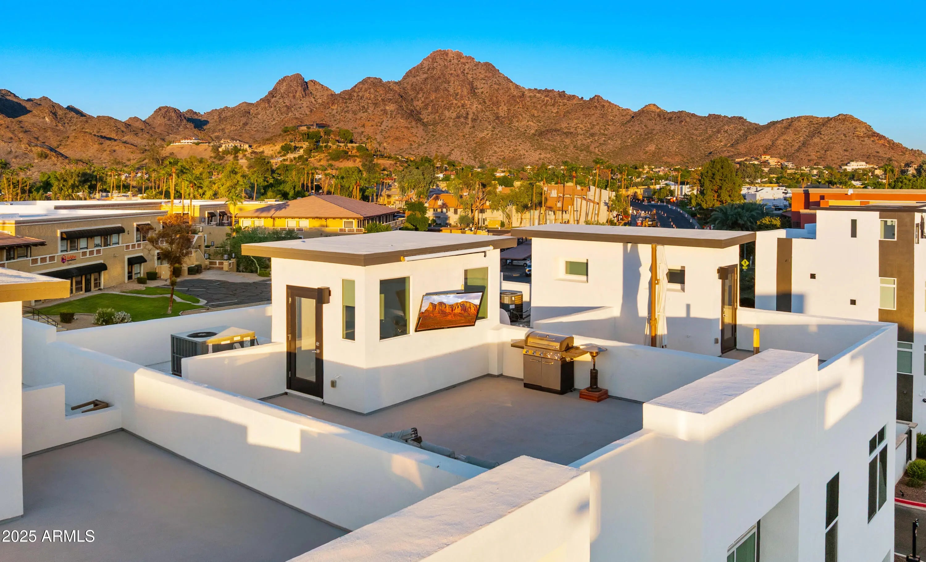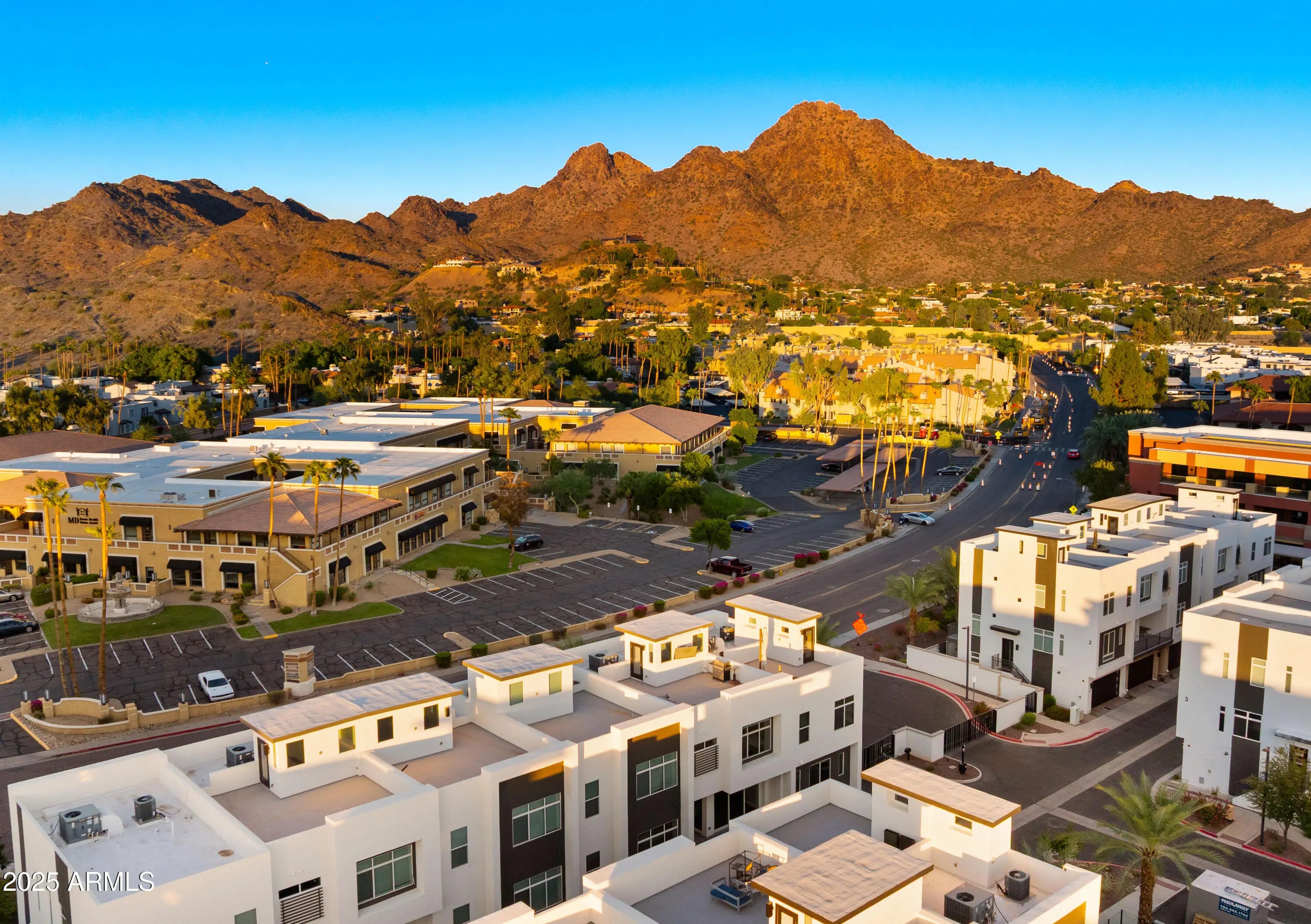 Terrific mountain and city views from the furnished roof deck and fast access to freeway, grocery, dining and hiking. Walk next door to iconic Best of Phoenix restaurant ''Aunt Chilada's'' or across the street to Hilton Resort At The Peak. 2019 construction with upgraded contemporary fixtures and designer finishes. This well designed, multi-level floorpan overlooks the pool and provides direct views Piestewa Peak and city lights. Ground floor den/office/playroom has a full bathroom and private patio. Kitchen has GE Monogram appliances, Ring camera/doorbell at front door and motorized window blinds throughout.