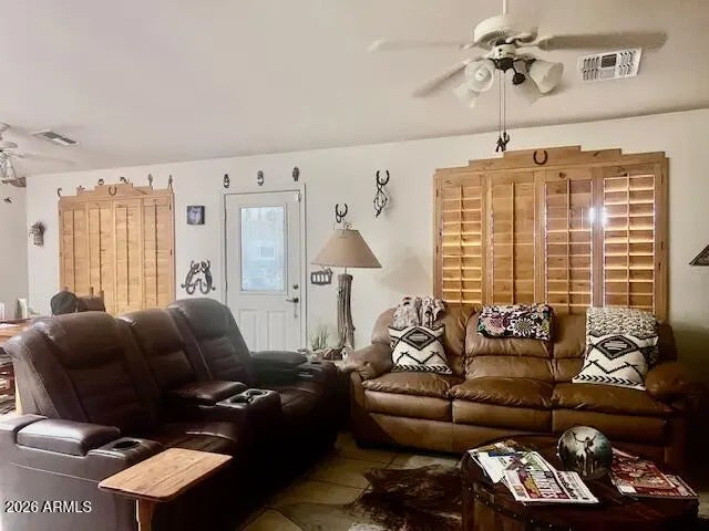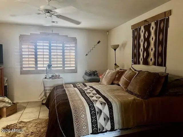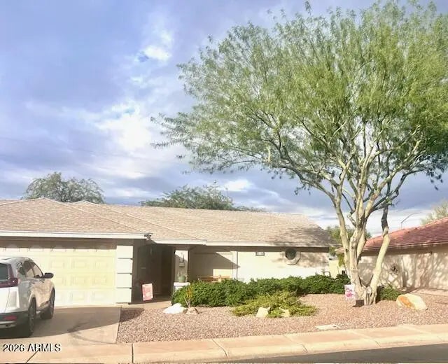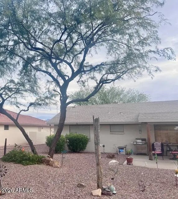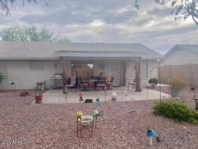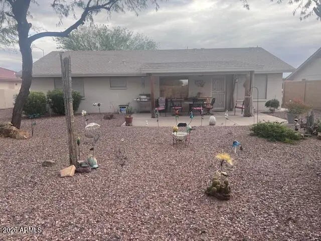 Seize the chance to own this charming home. It's the Southwest flair with custom plantation shutters & Santa Fe skip trowel walls that make this home unique. The open concept has tile flooring throughout with a vaulted ceiling in the great room, ceiling fans & canned llighting. Your bright kitchen is complete with plenty of cabinets, corian counters & upgraded white appliances. In the spacious primary bedroom is a king lift & store bed & 2 walk-in closets. There's double sinks in the bathroom. This beautiful residence boasts a low maintenance yard with a full irrigation system, gorgeous flora & an orange tree in the 8729 sq ft lot. Exit through the custom secutity door to find a full length patio with a roll down sunscreen to match. The extended garage has many cabinets & an epoxy floor.