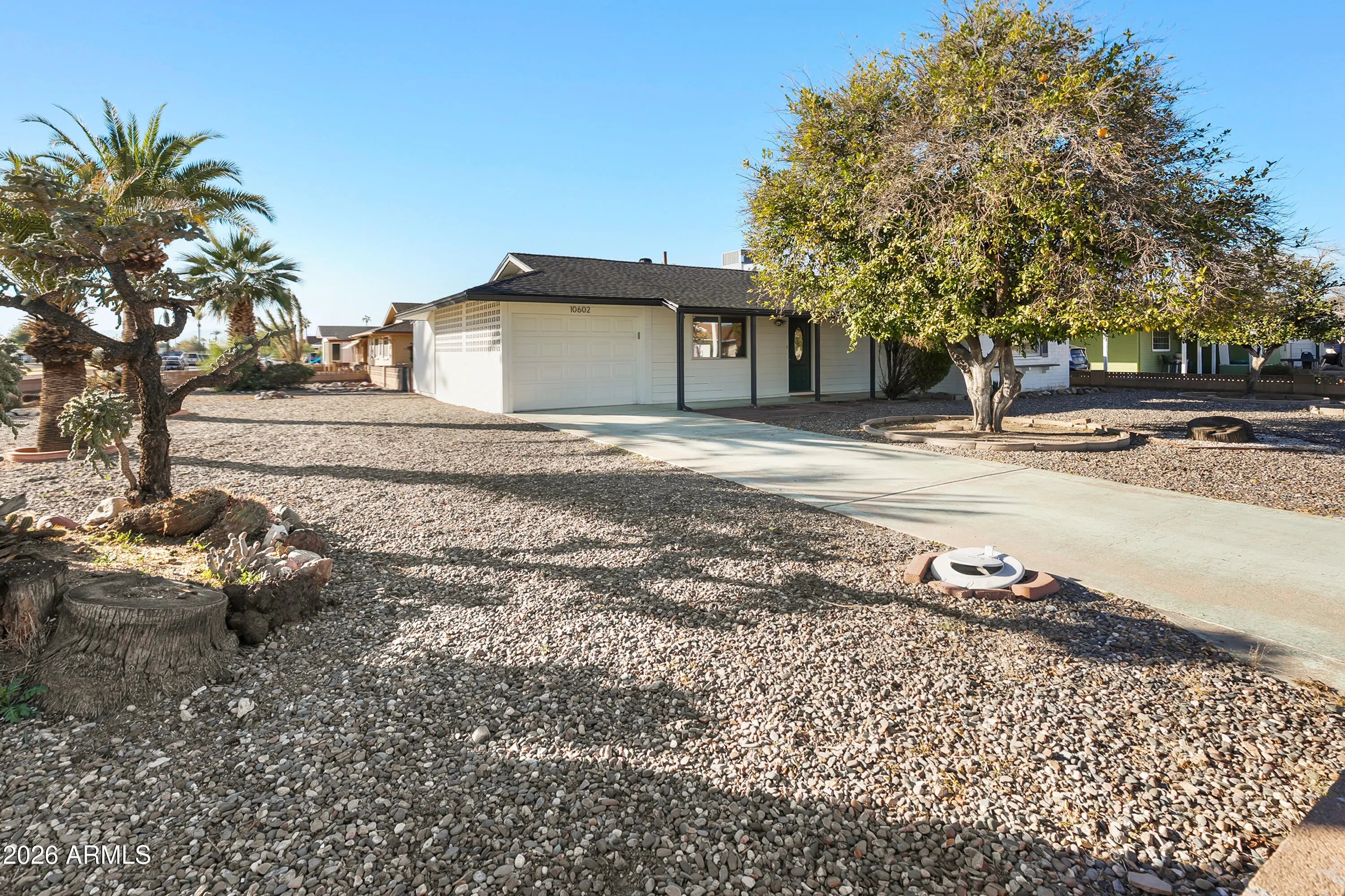 Looking for a HUGE lot? Welcome to this upgraded 2-bedroom, 2-bath home with a brand-new roof (2025) in the peaceful Sun City 55 +community. Light-filled living spaces showcase tile flooring and a modern kitchen featuring upgraded appliances, interior laundry area, ample storage/ workshop area, and a generous dining area. Both bedrooms offer brand new plush carpet, ceiling fans, and spacious closets, while the primary bath features a walk-in shower. Set on an OVERSIZED corner lot, the backyard w/ covered patio offers endless potential for entertaining, relaxation, or future additions. Just moments from golf, with easy access to shopping, dining, recreation centers, pools, community activities & entertainment.