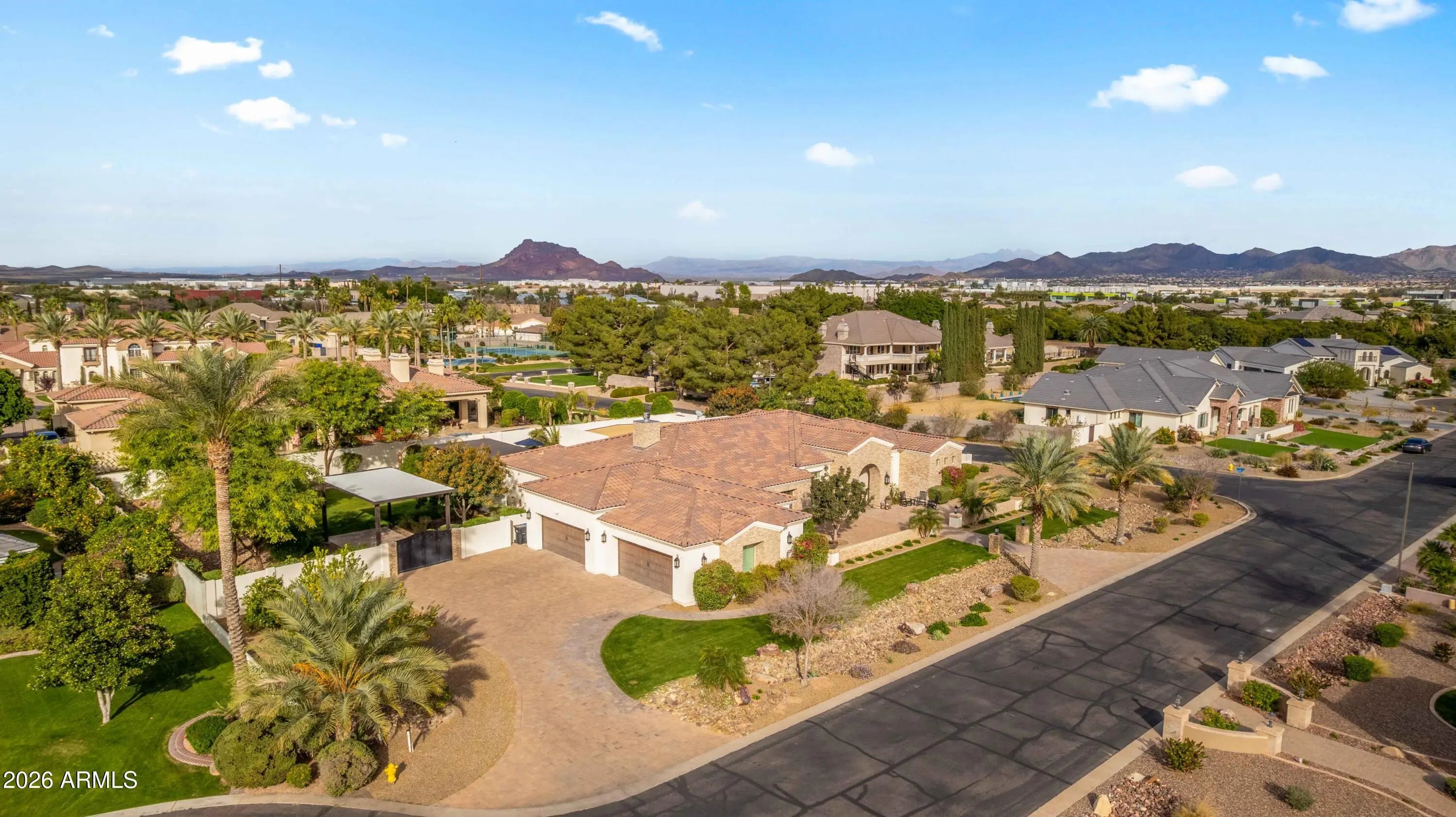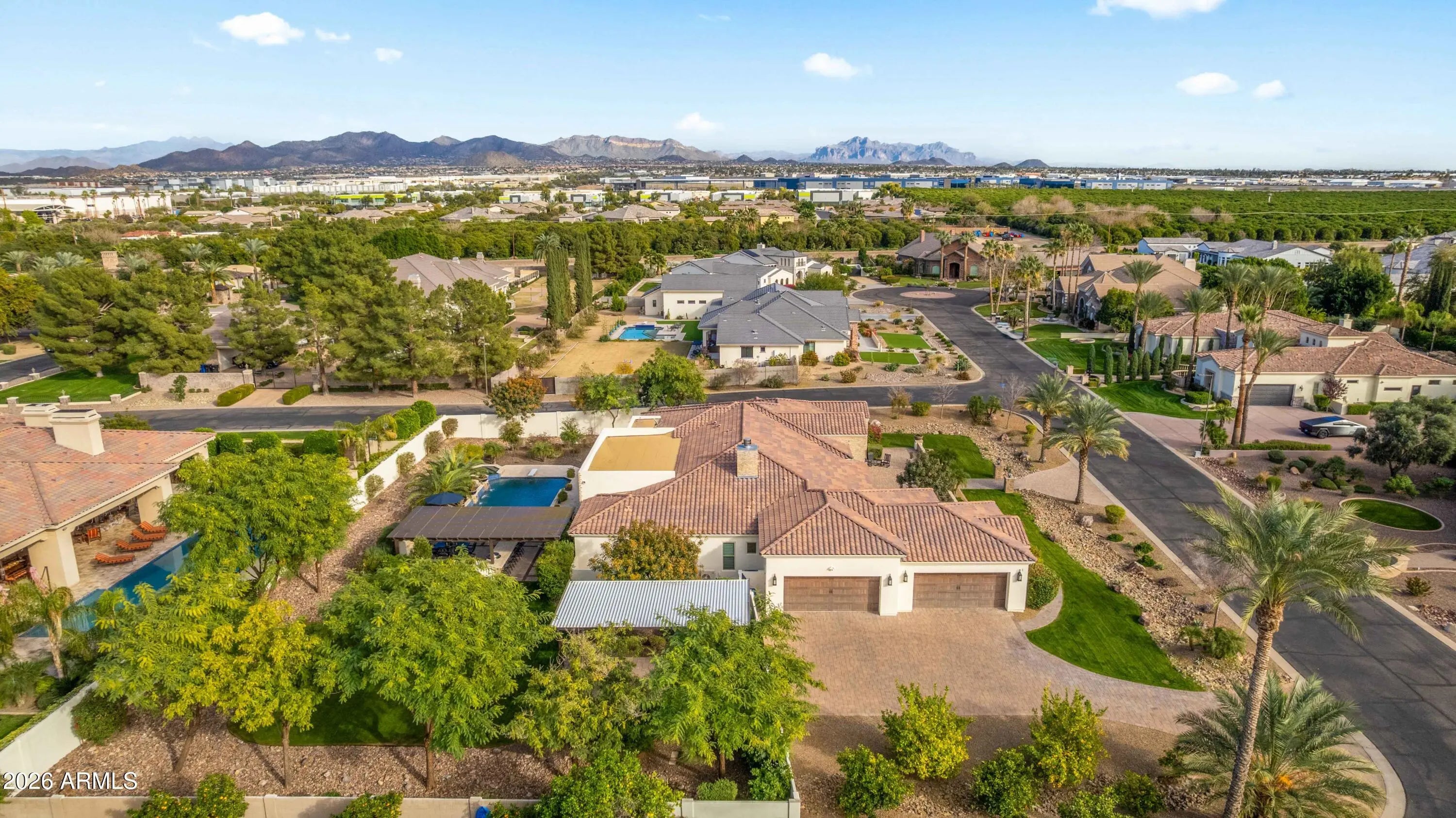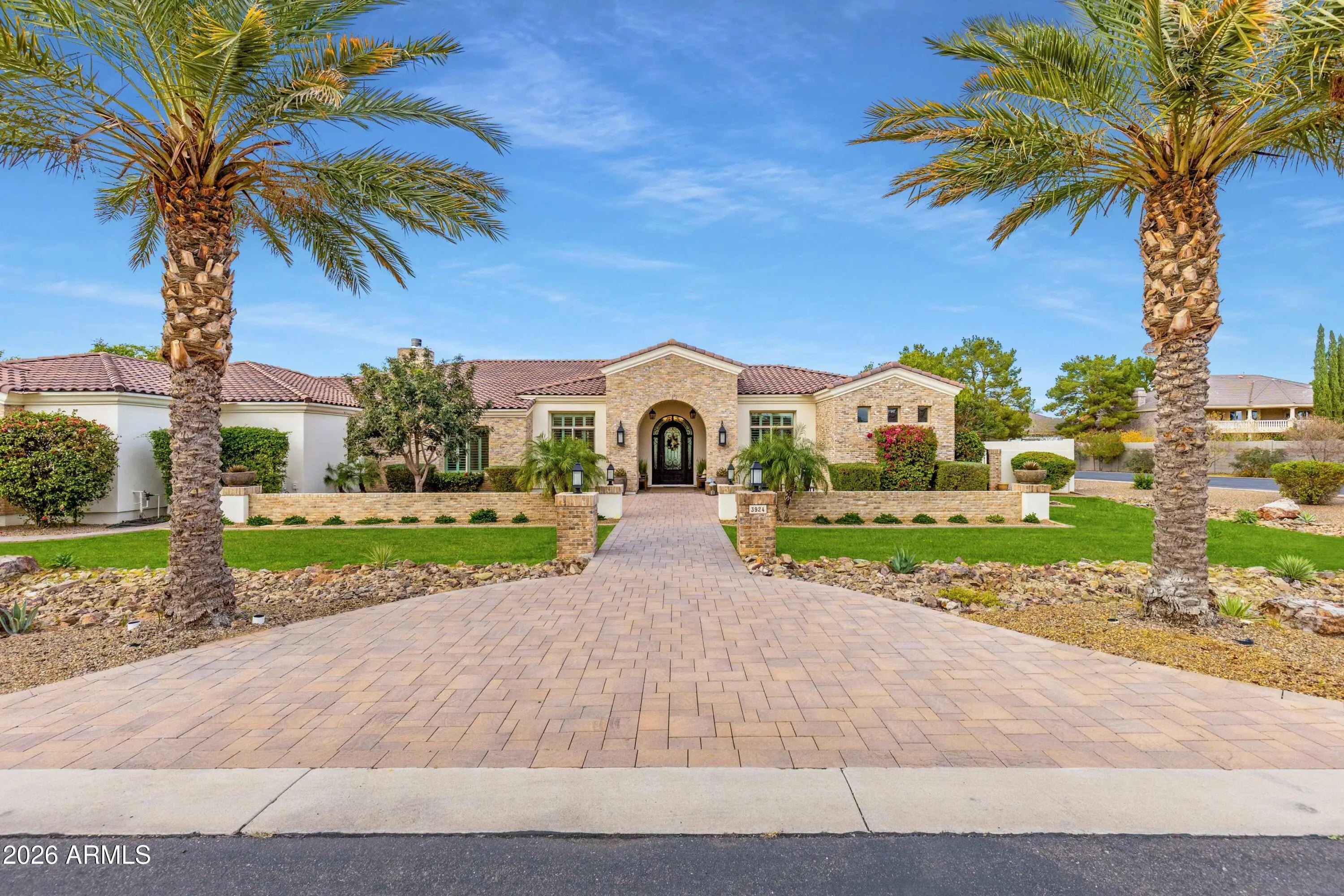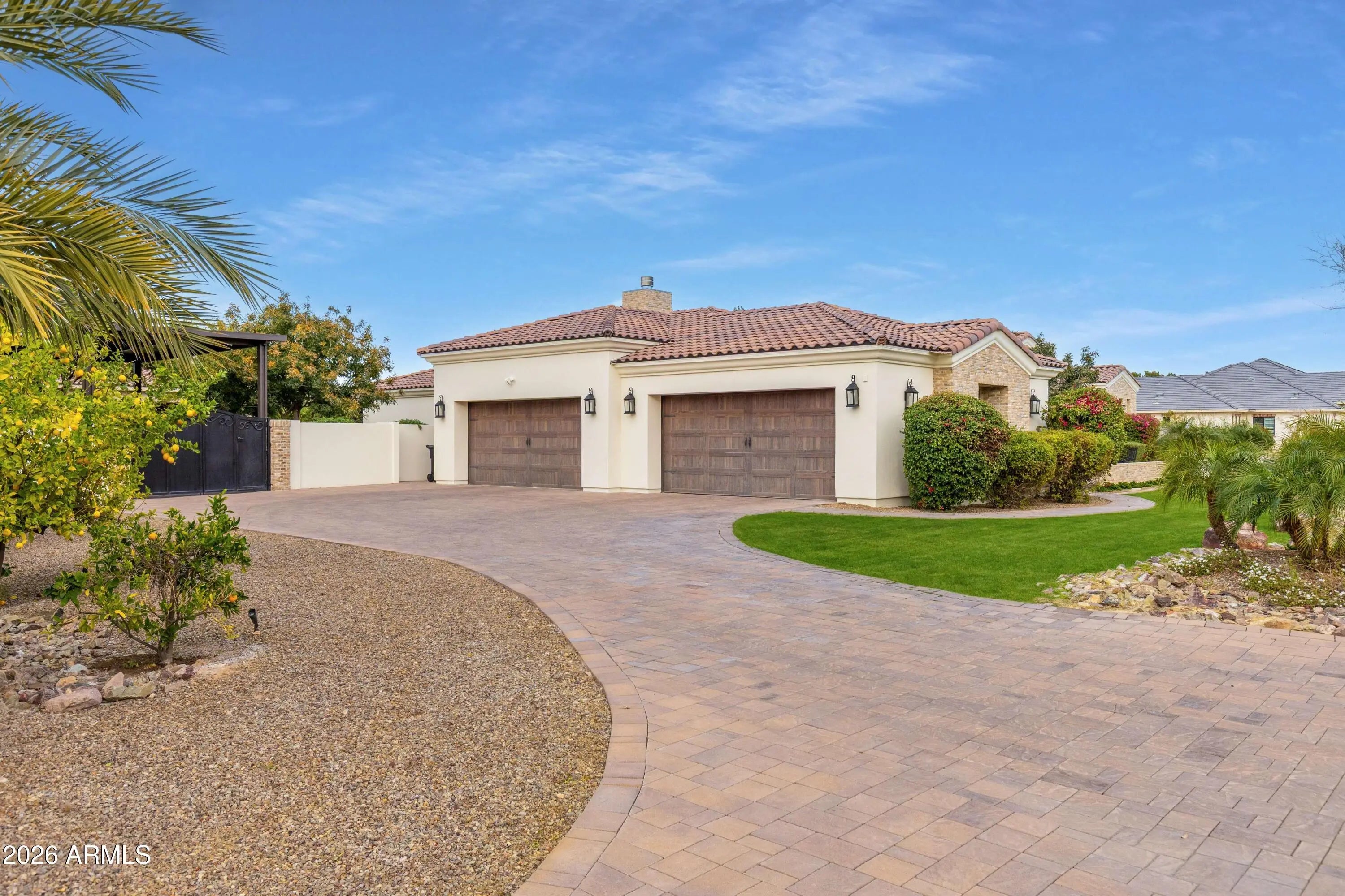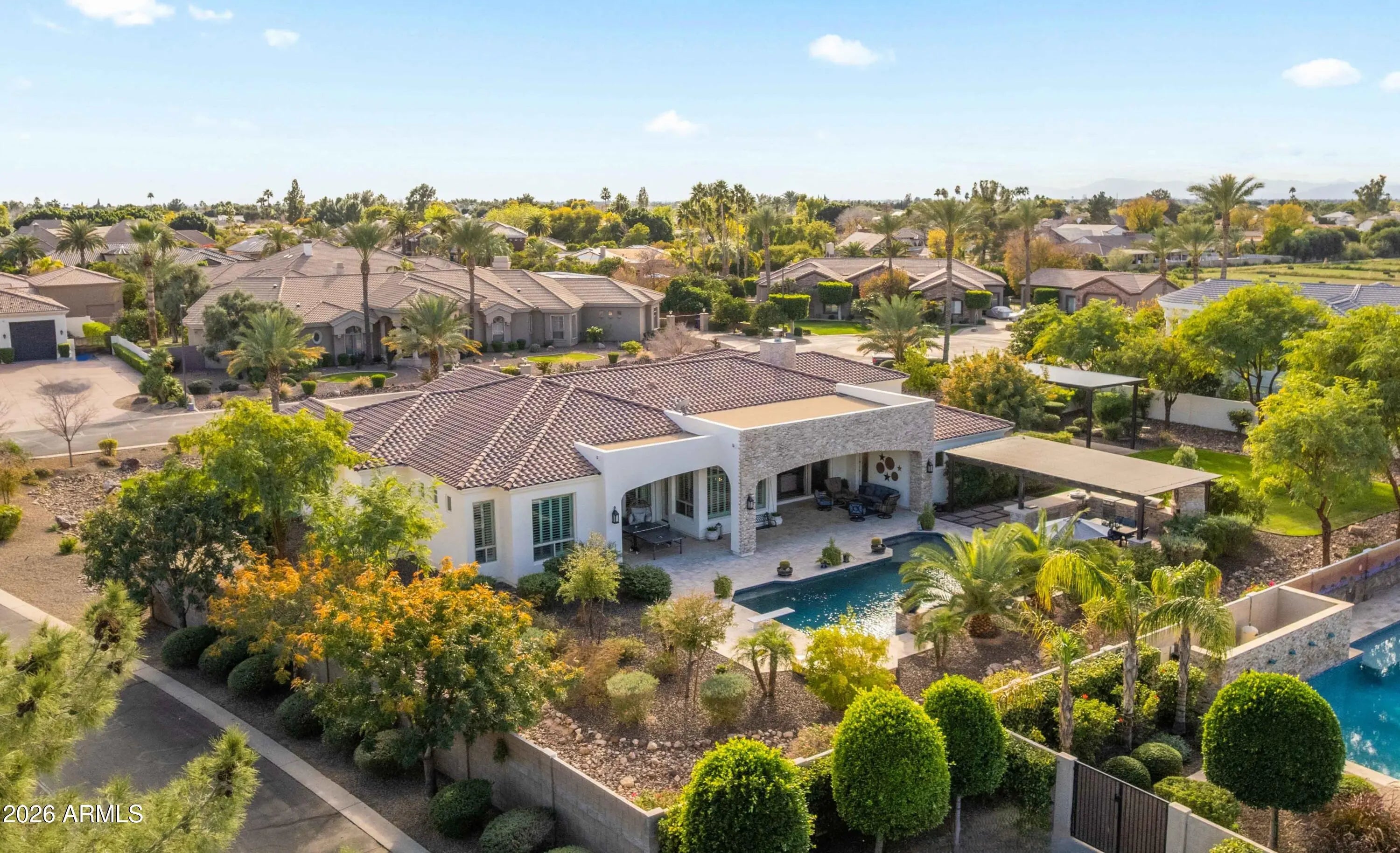Nestled within a gated enclave of elevated custom homes, this modern farmhouse-inspired residence is enriched with subtle European character and timeless architectural detail. Completed in 2018, the home welcomes with a whitewashed brick exterior and gracious courtyard entry, accented by bold architectural lighting, thoughtfully layered landscaping, and ideal north/south exposure. An arched iron-and-glass front door anchors the façade, blending timeless European character with refined modern appeal. Inside, herringbone-patterned wood-look tile floors, soaring ceilings, and graceful brick-lined arches establish a sense of warmth and distinction, setting the tone for thoughtfully curated interiors throughout. Featuring carefully curated walls adorned with custom wainscoting, walls, every inch of the home has been masterfully detailed. Tall windows with plantation shutters and designer window treatments frame the living room, while tasteful wall coverings, brushed wood beams, brick-lined accent walls and modern farmhouse chandeliers create an inviting environment for refined entertaining and everyday comfort. The great room features a charming breakfast nook and a welcoming family room with custom built-ins, wood-beamed ceilings, and a striking fireplace that anchors the space. Open to the gourmet kitchen, the layout offers a seamless connection between gathering spaces and enhances the home's natural flow. Set on an impressive 36,000-square-foot irrigated corner lot, the property offers exceptional outdoor space and flexibility rarely found in this setting. A large paved driveway and custom RV gates provide access to covered backyard parking, with ample room to add a guest home, RV garage, or additional amenities. Green space is abundant with lush lawn space, mature citrus, and productive lemon trees that enhance the grounds with both beauty and function. The backyard is designed for resort-style living and entertaining, featuring a dramatic and newly built 9.5-foot-deep diving pool with heated spa, LED lighting, and water features. Travertine pavers extend the living and entertaining space, while an extraordinary outdoor kitchen and seating area designed for true culinary entertaining is anchored beneath a long-lasting aluminum ramada with café lighting, misting system, and automatic shade screens. A generous sit-up bar accommodates outdoor dining and gatherings, complemented by a Wolf built-in barbecue, ice chest, Mongolian grill, wok or oversized gas burner, and a show-stopping gas fireplace that creates a warm and inviting atmosphere year-round. The farmhouse-inspired kitchen blends soft white cabinetry with rich, deeper wood tones, creating a warm yet refined aesthetic. Honed quartzite countertops in a richly colored palette provide striking contrast, while the substantial mitered-edge island anchors the space and makes a bold design statement. A black Blanco sink, brushed black hardware, and coordinating light fixtures add a modern edge. Gourmet appliances include a Thermador gas range with griddle and burners, a professional chimney-style range hood framed by a brick façade, a GE Monogram French-door wall oven, and a built-in microwave. An ideal mix of open shelving and well-planned storage completes this highly functional and beautifully appointed kitchen. A private front office features a custom iron-and-glass door that allows diffused light while maintaining privacy. With a walk-in closet, the space offers flexibility as a home office, guest suite, or optional fifth bedroom. The owner's suite is a serene retreat, highlighted by refined horizontal wall paneling, a tray ceiling with rope lighting, and a dedicated sitting area. The en-suite bath is styled in elegant finishes and features quartz countertops, dual vanities, a soaking tub, stylish lighting, and a walk-in shower, and a private water closet with bidet. A spacious walk-in closet is smartly designed with added pull-down clothing racks for enhanced functionality. Completing the home is a charming powder bath featuring timeless wall coverings, a freestanding vanity with a stone vessel sink, and a bidet. Three additional guest bedrooms two in one wing and one in another each offer generous walk-in closets and private en-suite baths, providing comfort and privacy for family and guests alike. An oversized laundry room is purposedly designed with abundant cabinetry, a dedicated workspace, and a utility sink, while a mudroom off the garage adds everyday convenience with additional storage, a built-in bench, and wall hooks. The impressive 4.5-car garage is climate controlled with dual mini-split systems and features over-height garage doors, ample room for vehicles and recreational toys, and a separate storage area ideal for organized, year-round use. An expansive paved driveway provides additional parking, and custom powder-coated RV gates open to covered rear parking for a boat or recreational vehicles, complete with a 200-amp outlet for charging. Rosewood Estates is a prestigious gated community in the heart of Mesa's Citrus Corridor, featuring 23 custom homes on spacious lots with coveted private pickleball, tennis, and basketball courts. Conveniently located approximately 20 minutes from Sky Harbor Airport and Scottsdale, the community is also minutes from premier hiking, golf, mountain biking, water recreation, dining, shopping, and A-rated schools.