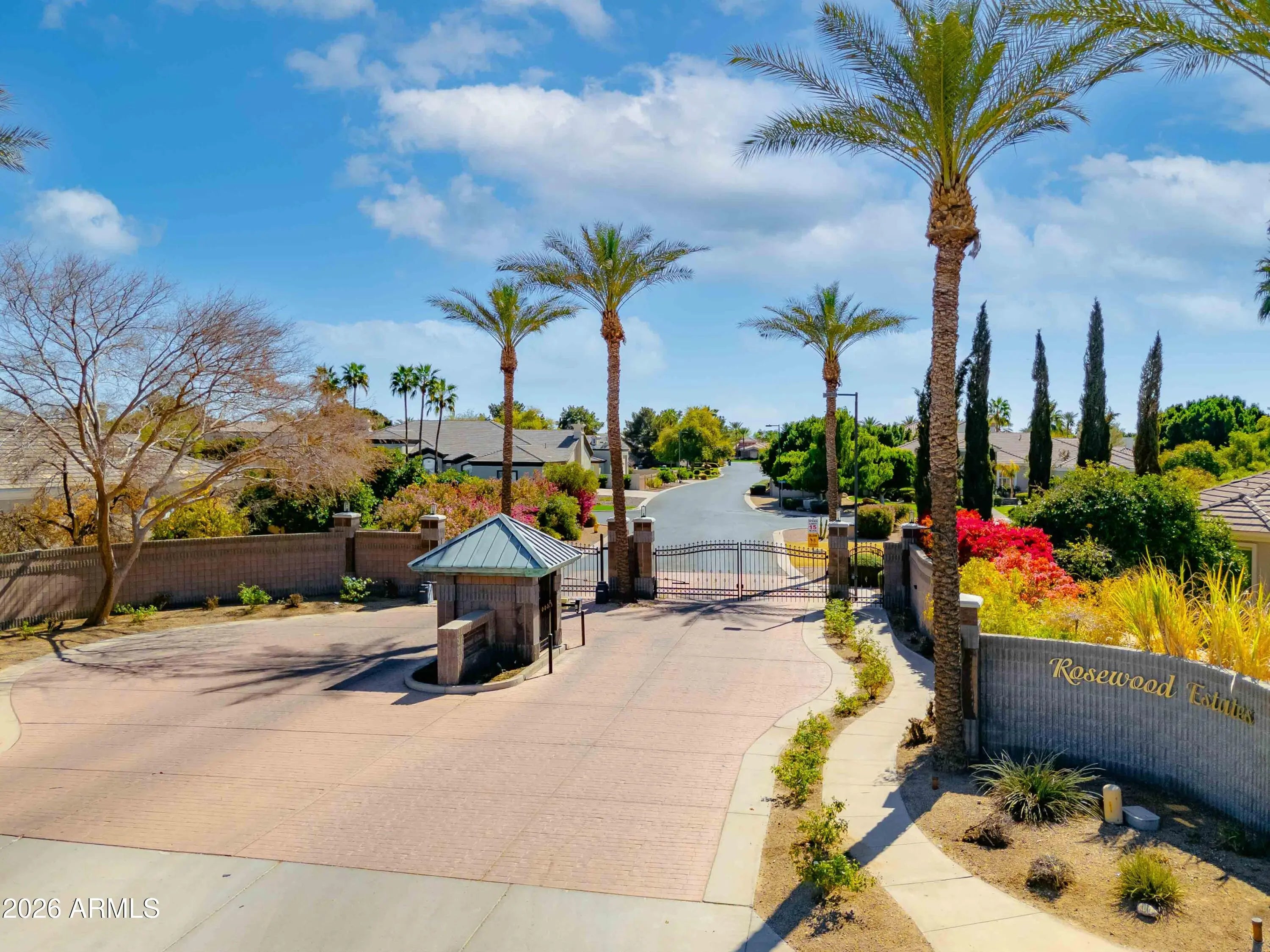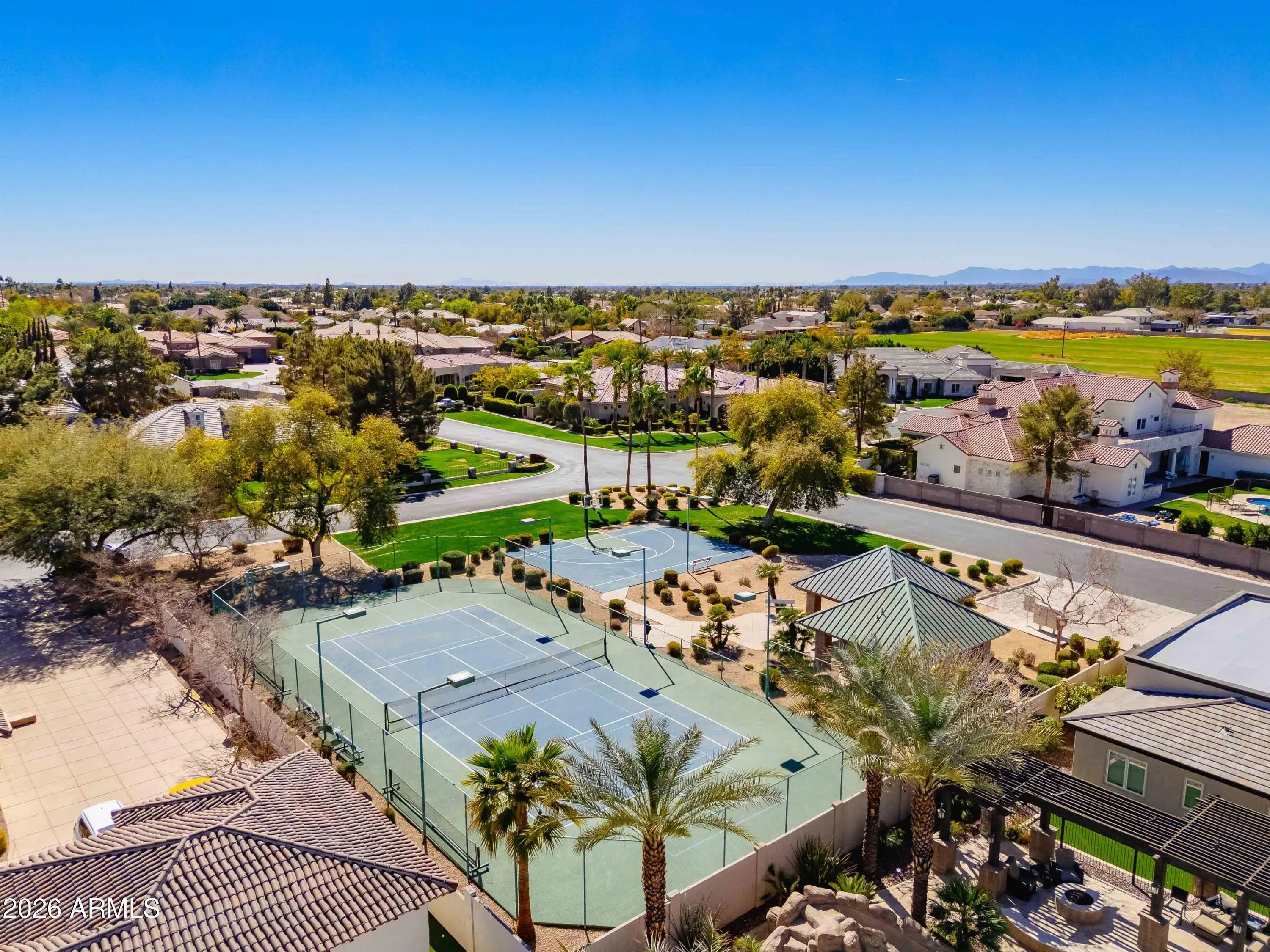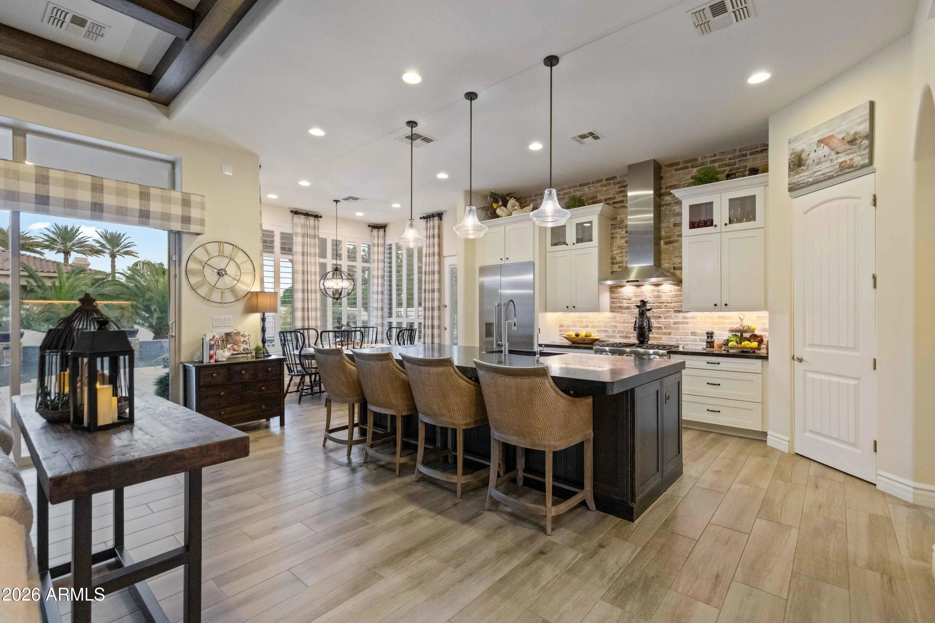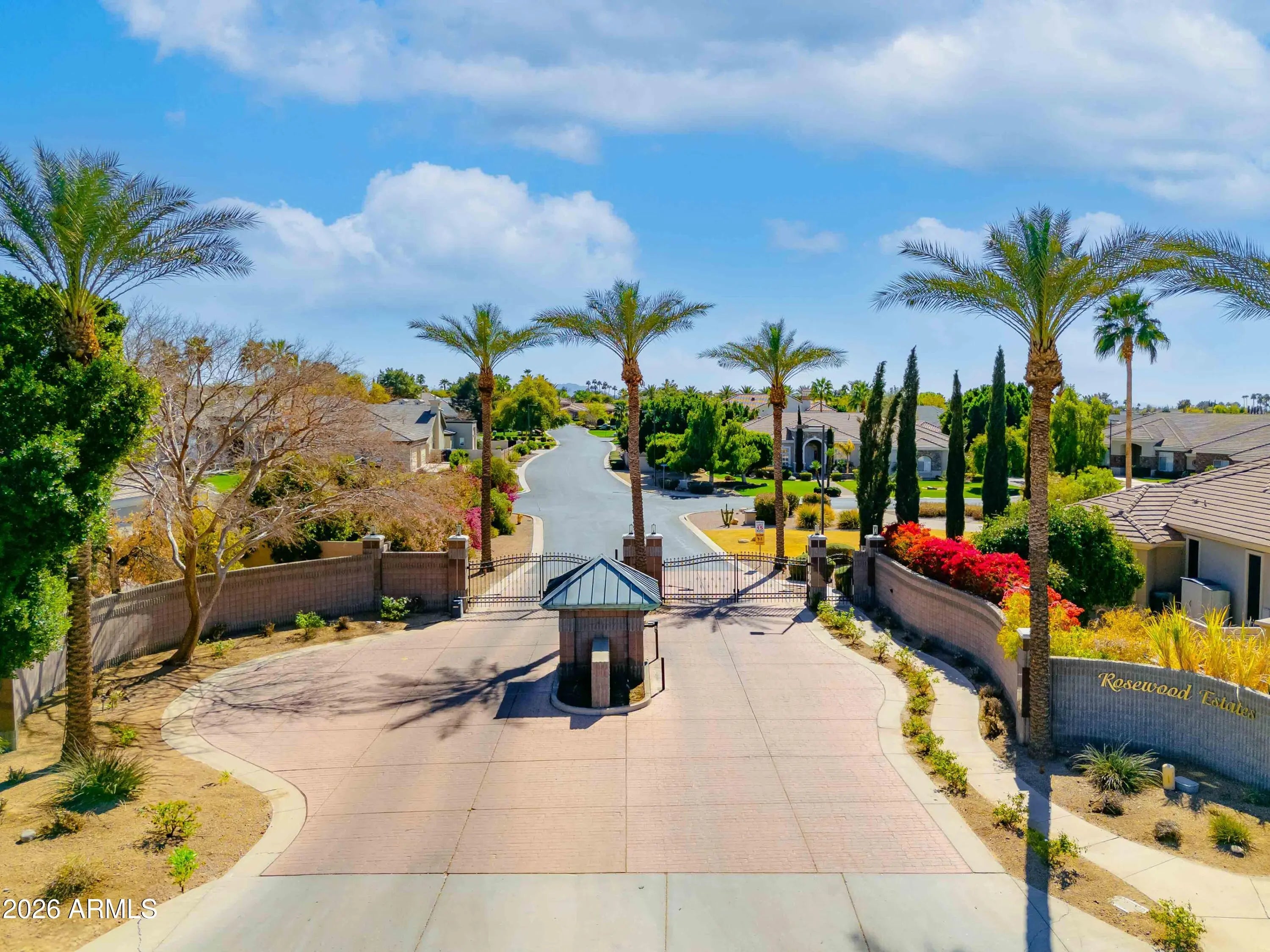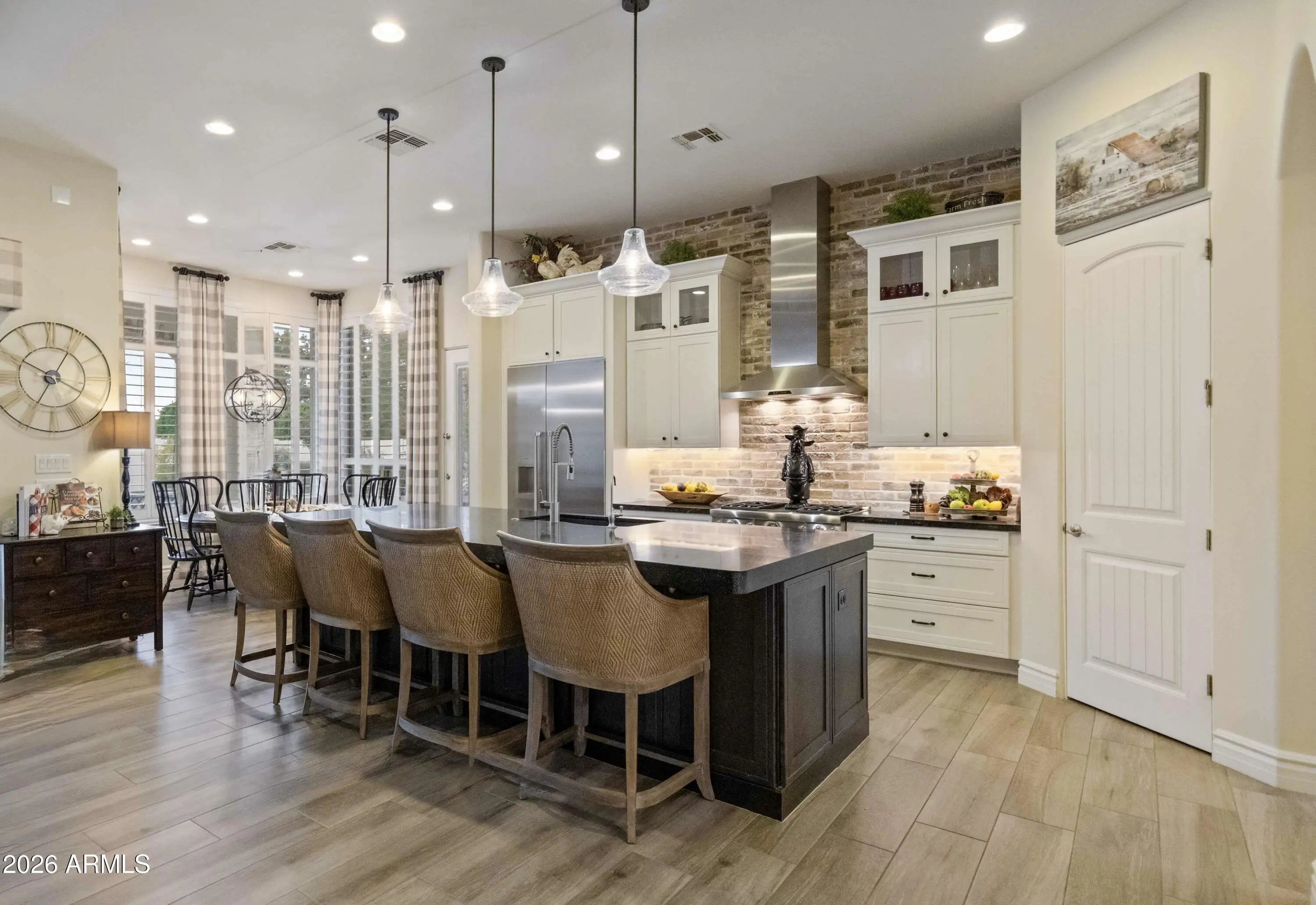 Nestled within a gated enclave of elevated custom homes, this modern farmhouse-inspired residence is enriched with subtle European character and timeless architectural detail. Completed in 2018, the home welcomes with a whitewashed brick exterior and gracious courtyard entry, accented by bold architectural lighting, thoughtfully layered landscaping, and ideal north/south exposure. An arched iron-and-glass front door anchors the façade, blending timeless European character with refined modern appeal. Inside, herringbone-patterned wood-look tile floors, soaring ceilings, and graceful brick-lined arches establish a sense of warmth and distinction, setting the tone for thoughtfully curated interiors throughout. Featuring carefully curated walls adorned with custom wainscoting, walls, every inch of the home has been masterfully detailed. Tall windows with plantation shutters and designer window treatments frame the living room, while tasteful wall coverings, brushed wood beams, brick-lined accent walls and modern farmhouse chandeliers create an inviting environment for refined entertaining and everyday comfort. The great room features a charming breakfast nook and a welcoming family room with custom built-ins, wood-beamed ceilings, and a striking fireplace that anchors the space. Open to the gourmet kitchen, the layout offers a seamless connection between gathering spaces and enhances the home's natural flow. Set on an impressive 36,000-square-foot irrigated corner lot, the property offers exceptional outdoor space and flexibility rarely found in this setting. A large paved driveway and custom RV gates provide access to covered backyard parking, with ample room to add a guest home, RV garage, or additional amenities. Green space is abundant with lush lawn space, mature citrus, and productive lemon trees that enhance the grounds with both beauty and function. The backyard is designed for resort-style living and entertaining, featuring a dramatic and newly built 9.5-foot-deep diving pool with heated spa, LED lighting, and water features. Travertine pavers extend the living and entertaining space, while an extraordinary outdoor kitchen and seating area designed for true culinary entertaining is anchored beneath a long-lasting aluminum ramada with café lighting, misting system, and automatic shade screens. A generous sit-up bar accommodates outdoor dining and gatherings, complemented by a Wolf built-in barbecue, ice chest, Mongolian grill, wok or oversized gas burner, and a show-stopping gas fireplace that creates a warm and inviting atmosphere year-round. The farmhouse-inspired kitchen blends soft white cabinetry with rich, deeper wood tones, creating a warm yet refined aesthetic. Honed quartzite countertops in a richly colored palette provide striking contrast, while the substantial mitered-edge island anchors the space and makes a bold design statement. A black Blanco sink, brushed black hardware, and coordinating light fixtures add a modern edge. Gourmet appliances include a Thermador gas range with griddle and burners, a professional chimney-style range hood framed by a brick façade, a GE Monogram French-door wall oven, and a built-in microwave. An ideal mix of open shelving and well-planned storage completes this highly functional and beautifully appointed kitchen. A private front office features a custom iron-and-glass door that allows diffused light while maintaining privacy. With a walk-in closet, the space offers flexibility as a home office, guest suite, or optional fifth bedroom. The owner's suite is a serene retreat, highlighted by refined horizontal wall paneling, a tray ceiling with rope lighting, and a dedicated sitting area. The en-suite bath is styled in elegant finishes and features quartz countertops, dual vanities, a soaking tub, stylish lighting, and a walk-in shower, and a private water closet with bidet. A spacious walk-in closet is smartly designed with added pull-down clothing racks for enhanced functionality. Completing the home is a charming powder bath featuring timeless wall coverings, a freestanding vanity with a stone vessel sink, and a bidet. Three additional guest bedrooms two in one wing and one in another each offer generous walk-in closets and private en-suite baths, providing comfort and privacy for family and guests alike. An oversized laundry room is purposedly designed with abundant cabinetry, a dedicated workspace, and a utility sink, while a mudroom off the garage adds everyday convenience with additional storage, a built-in bench, and wall hooks. The impressive 4.5-car garage is climate controlled with dual mini-split systems and features over-height garage doors, ample room for vehicles and recreational toys, and a separate storage area ideal for organized, year-round use. An expansive paved driveway provides additional parking, and custom powder-coated RV gates open to covered rear parking for a boat or recreational vehicles, complete with a 200-amp outlet for charging. Rosewood Estates is a prestigious gated community in the heart of Mesa's Citrus Corridor, featuring 23 custom homes on spacious lots with coveted private pickleball, tennis, and basketball courts. Conveniently located approximately 20 minutes from Sky Harbor Airport and Scottsdale, the community is also minutes from premier hiking, golf, mountain biking, water recreation, dining, shopping, and A-rated schools.