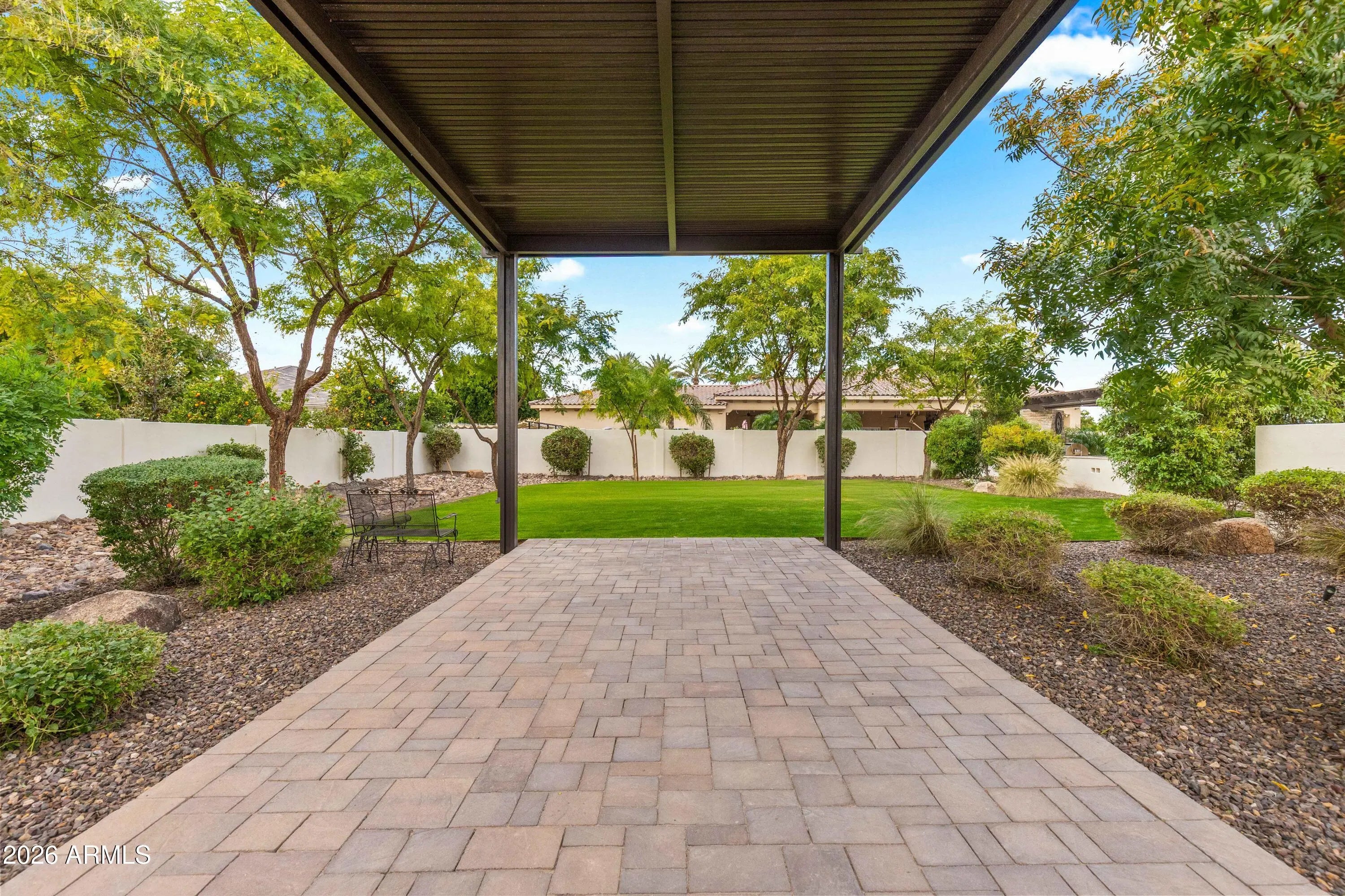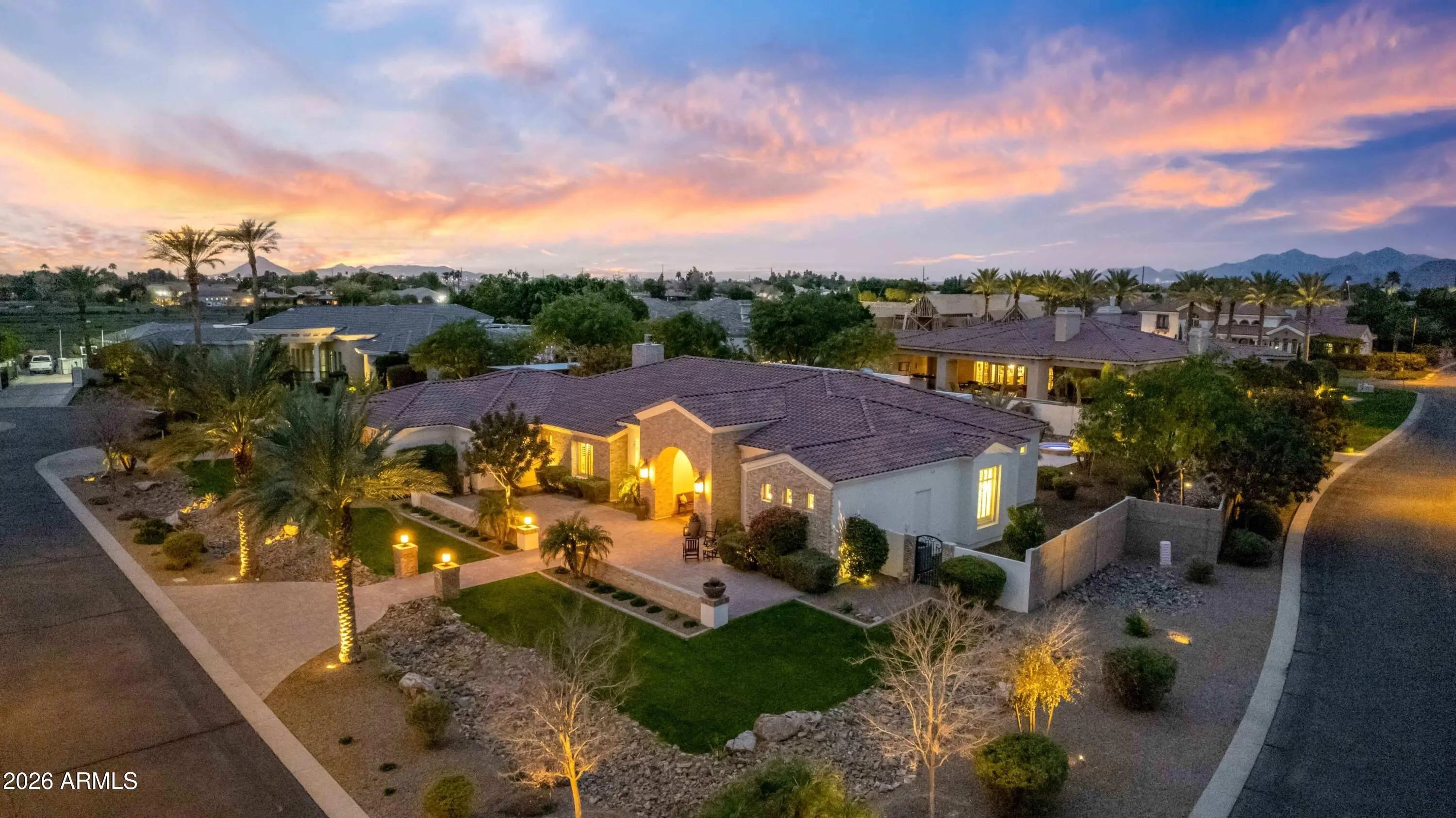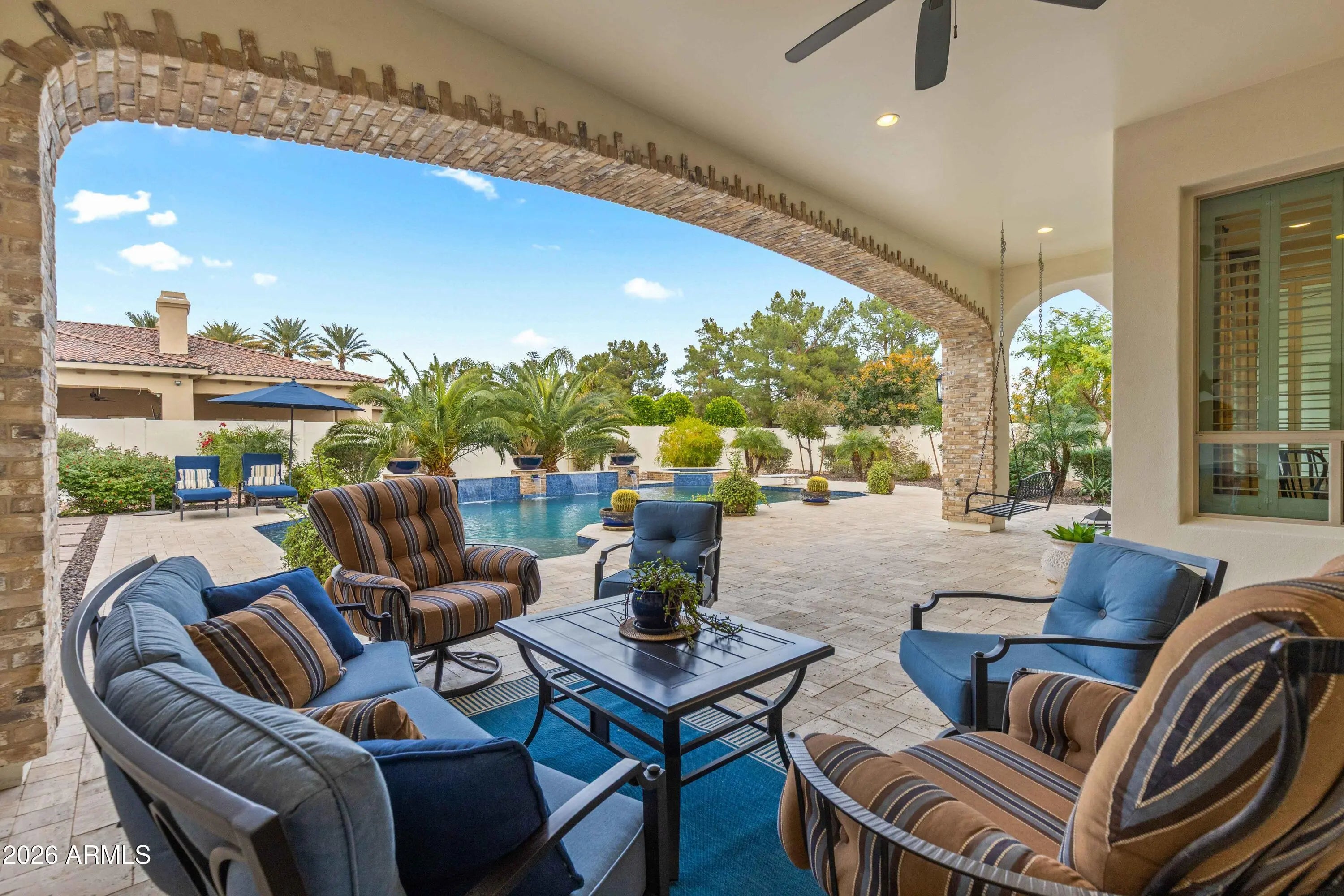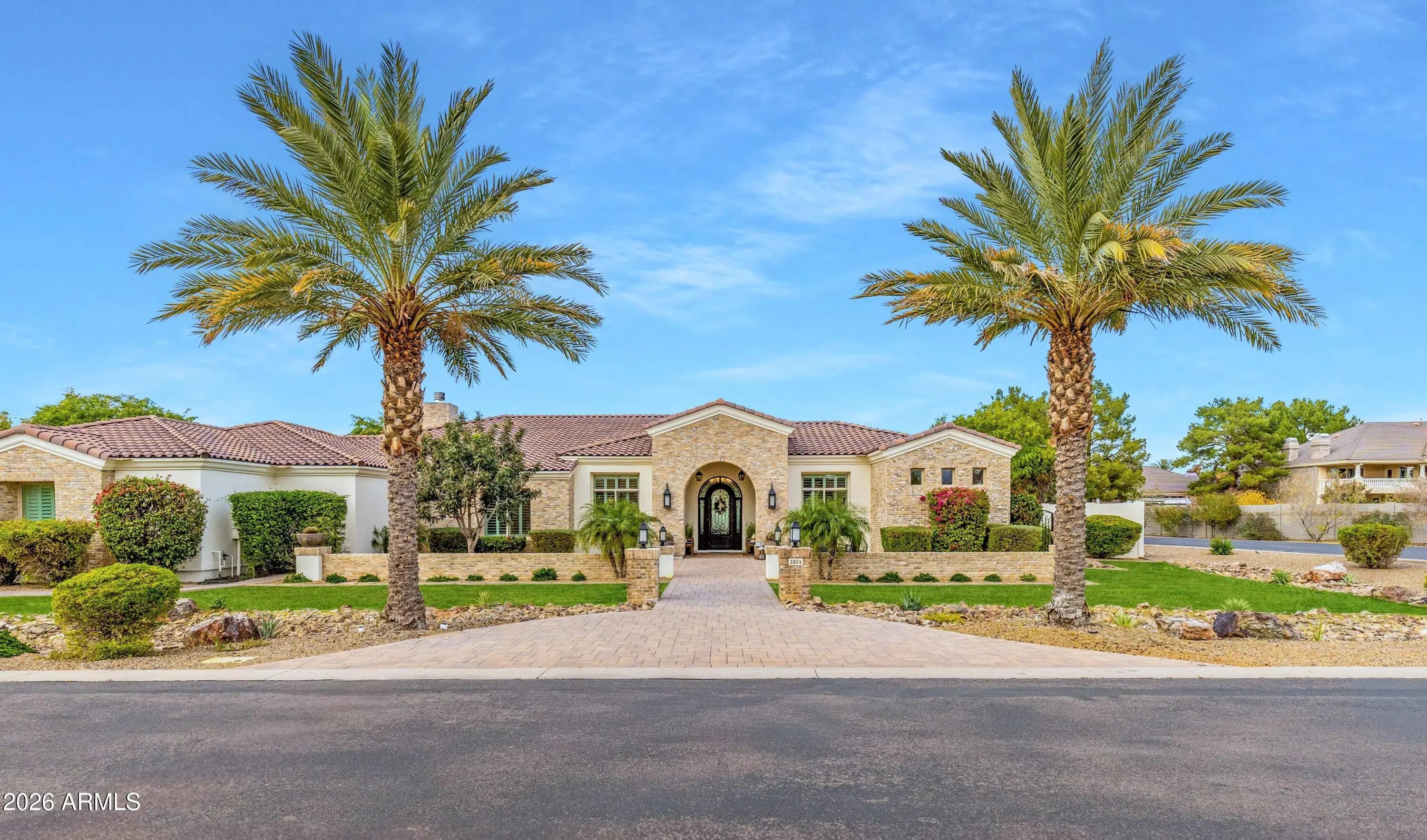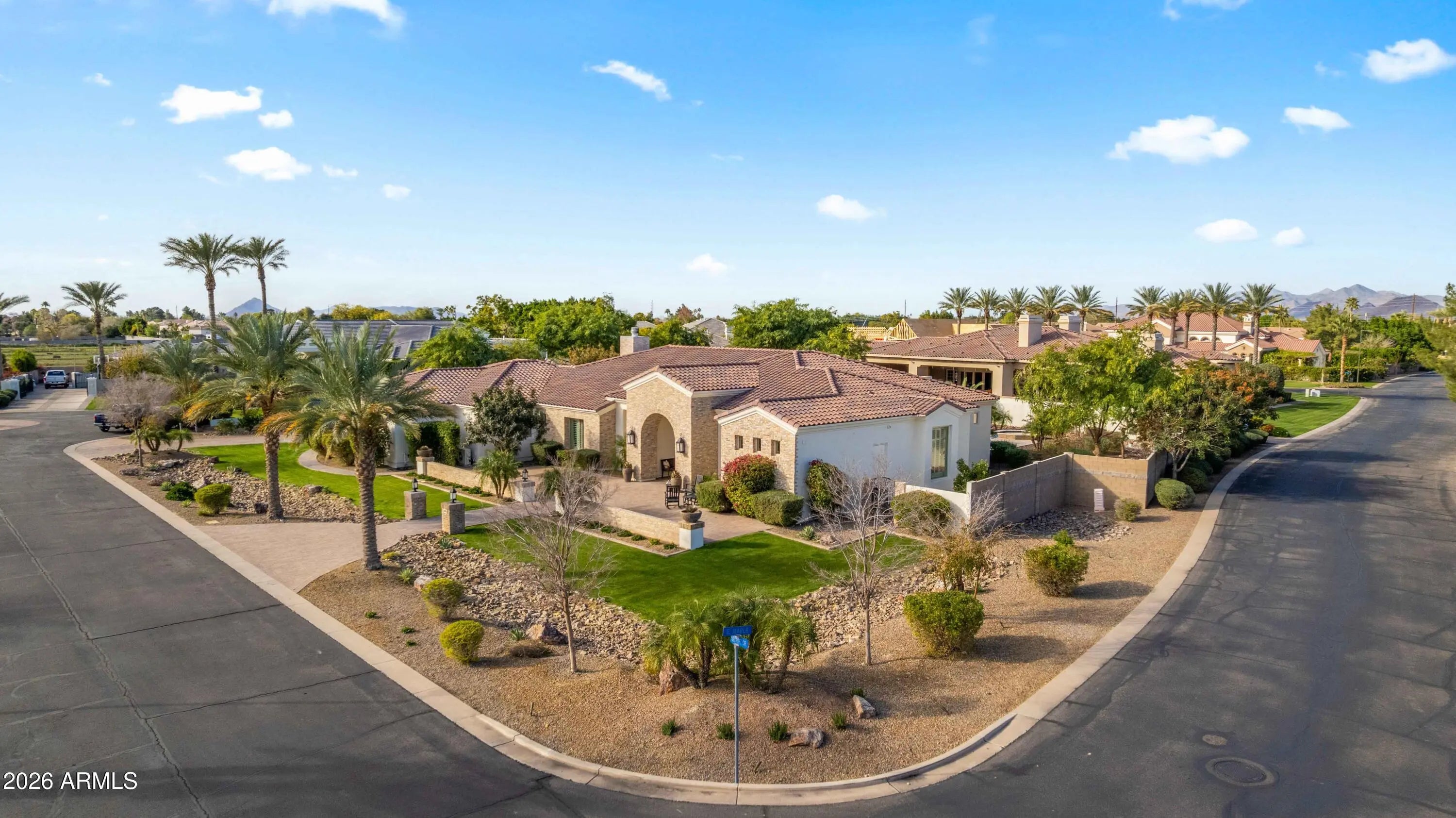 Nestled within a gated enclave of elevated custom homes, this modern farmhouse-inspired residence is enriched with subtle European character and timeless architectural detail. Completed in 2018, the home welcomes with a whitewashed brick exterior and gracious courtyard entry, accented by bold architectural lighting, thoughtfully layered landscaping, and ideal north/south exposure. An arched iron-and-glass front door anchors the façade, blending timeless European character with refined modern appeal. Inside, herringbone-patterned wood-look tile floors, soaring ceilings, and graceful brick-lined arches establish a sense of warmth and distinction, setting the tone for thoughtfully curated interiors throughout. Featuring carefully curated walls adorned with custom wainscoting, walls, every inch of the home has been masterfully detailed. Tall windows with plantation shutters and designer window treatments frame the living room, while tasteful wall coverings, brushed wood beams, brick-lined accent walls and modern farmhouse chandeliers create an inviting environment for refined entertaining and everyday comfort. The great room features a charming breakfast nook and a welcoming family room with custom built-ins, wood-beamed ceilings, and a striking fireplace that anchors the space. Open to the gourmet kitchen, the layout offers a seamless connection between gathering spaces and enhances the home's natural flow. Set on an impressive 36,000-square-foot irrigated corner lot, the property offers exceptional outdoor space and flexibility rarely found in this setting. A large paved driveway and custom RV gates provide access to covered backyard parking, with ample room to add a guest home, RV garage, or additional amenities. Green space is abundant with lush lawn space, mature citrus, and productive lemon trees that enhance the grounds with both beauty and function. The backyard is designed for resort-style living and entertaining, featuring a dramatic and newly built 9.5-foot-deep diving pool with heated spa, LED lighting, and water features. Travertine pavers extend the living and entertaining space, while an extraordinary outdoor kitchen and seating area designed for true culinary entertaining is anchored beneath a long-lasting aluminum ramada with café lighting, misting system, and automatic shade screens. A generous sit-up bar accommodates outdoor dining and gatherings, complemented by a Wolf built-in barbecue, ice chest, Mongolian grill, wok or oversized gas burner, and a show-stopping gas fireplace that creates a warm and inviting atmosphere year-round. The farmhouse-inspired kitchen blends soft white cabinetry with rich, deeper wood tones, creating a warm yet refined aesthetic. Honed quartzite countertops in a richly colored palette provide striking contrast, while the substantial mitered-edge island anchors the space and makes a bold design statement. A black Blanco sink, brushed black hardware, and coordinating light fixtures add a modern edge. Gourmet appliances include a Thermador gas range with griddle and burners, a professional chimney-style range hood framed by a brick façade, a GE Monogram French-door wall oven, and a built-in microwave. An ideal mix of open shelving and well-planned storage completes this highly functional and beautifully appointed kitchen. A private front office features a custom iron-and-glass door that allows diffused light while maintaining privacy. With a walk-in closet, the space offers flexibility as a home office, guest suite, or optional fifth bedroom. The owner's suite is a serene retreat, highlighted by refined horizontal wall paneling, a tray ceiling with rope lighting, and a dedicated sitting area. The en-suite bath is styled in elegant finishes and features quartz countertops, dual vanities, a soaking tub, stylish lighting, and a walk-in shower, and a private water closet with bidet. A spacious walk-in closet is smartly designed with added pull-down clothing racks for enhanced functionality. Completing the home is a charming powder bath featuring timeless wall coverings, a freestanding vanity with a stone vessel sink, and a bidet. Three additional guest bedrooms two in one wing and one in another each offer generous walk-in closets and private en-suite baths, providing comfort and privacy for family and guests alike. An oversized laundry room is purposedly designed with abundant cabinetry, a dedicated workspace, and a utility sink, while a mudroom off the garage adds everyday convenience with additional storage, a built-in bench, and wall hooks. The impressive 4.5-car garage is climate controlled with dual mini-split systems and features over-height garage doors, ample room for vehicles and recreational toys, and a separate storage area ideal for organized, year-round use. An expansive paved driveway provides additional parking, and custom powder-coated RV gates open to covered rear parking for a boat or recreational vehicles, complete with a 200-amp outlet for charging. Rosewood Estates is a prestigious gated community in the heart of Mesa's Citrus Corridor, featuring 23 custom homes on spacious lots with coveted private pickleball, tennis, and basketball courts. Conveniently located approximately 20 minutes from Sky Harbor Airport and Scottsdale, the community is also minutes from premier hiking, golf, mountain biking, water recreation, dining, shopping, and A-rated schools.