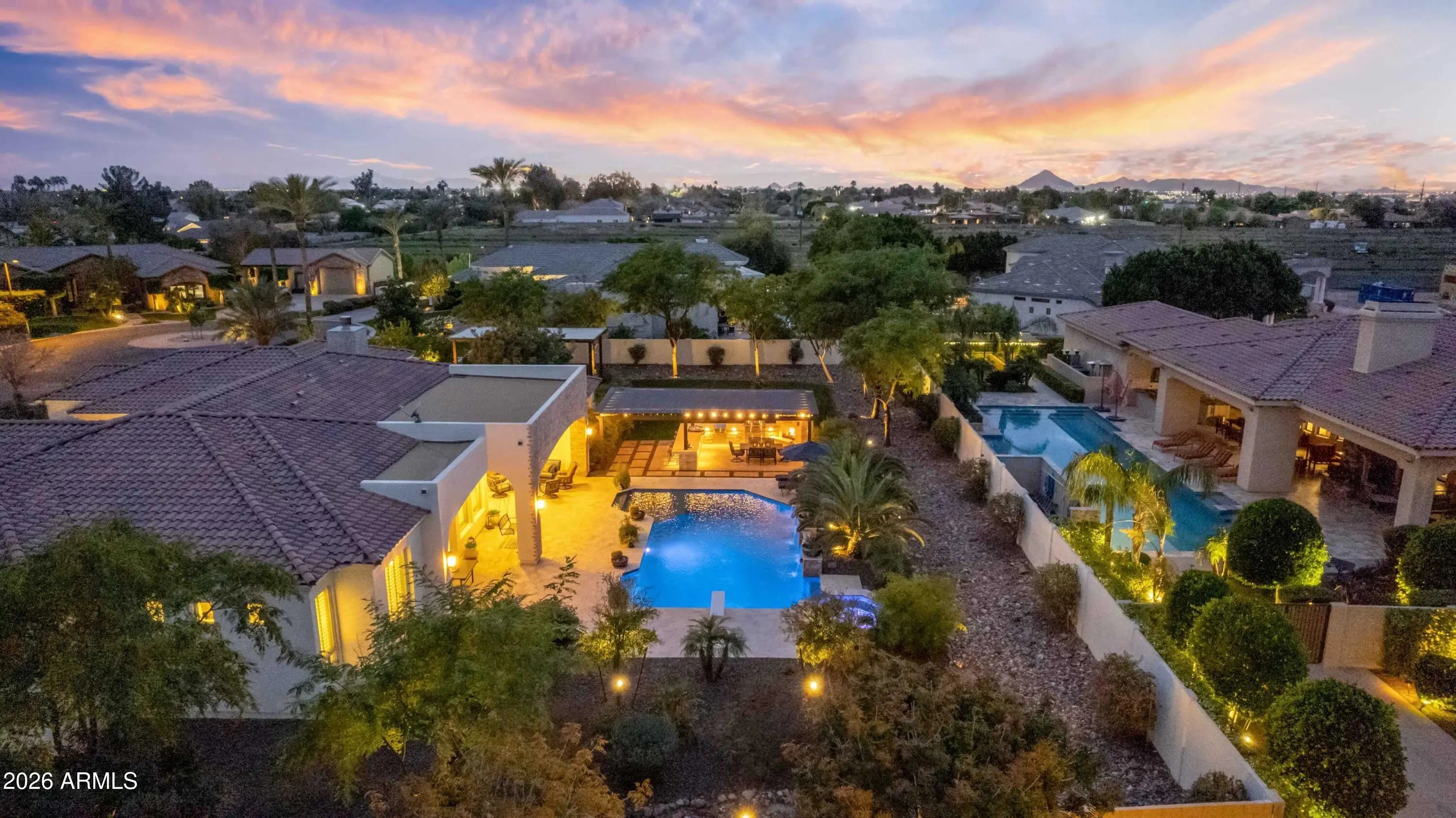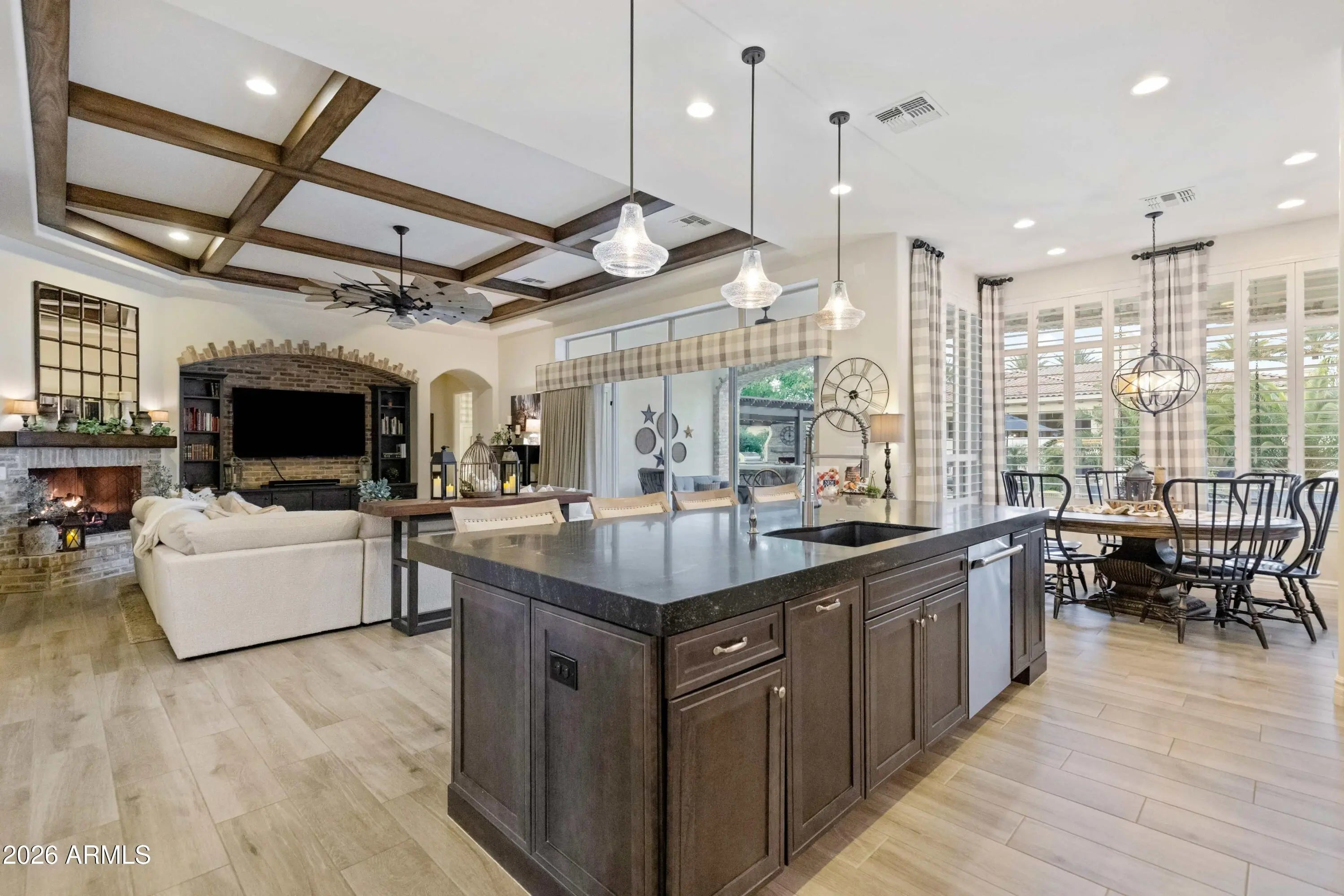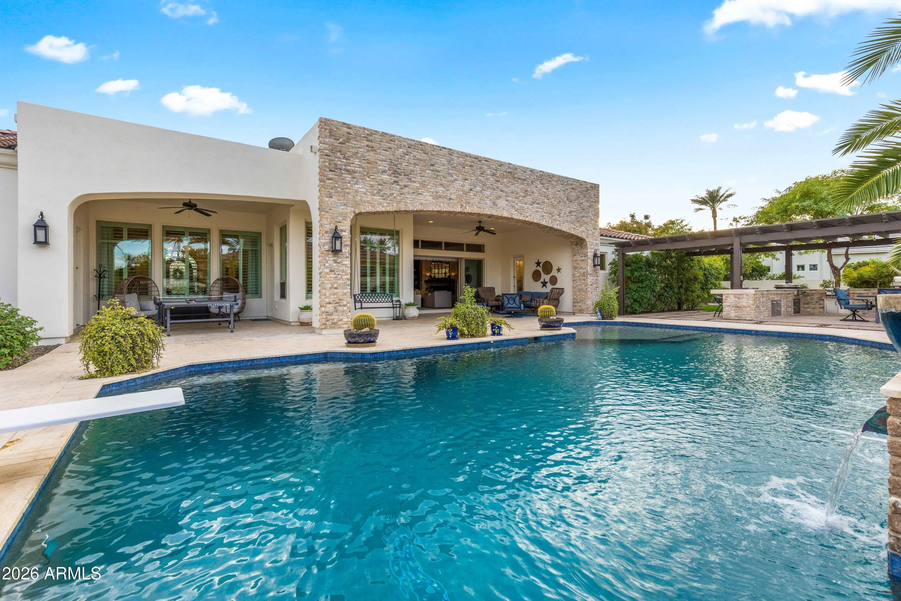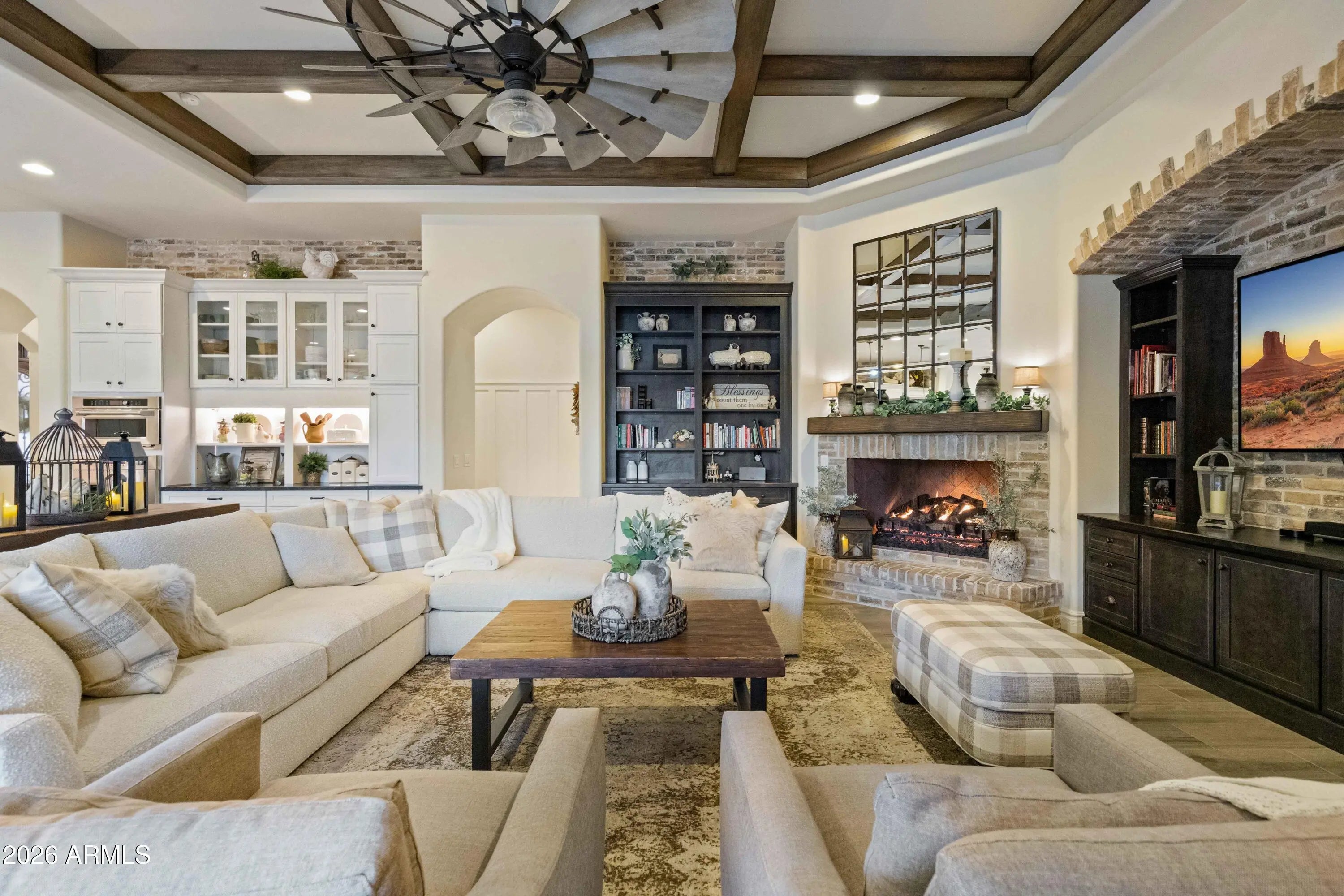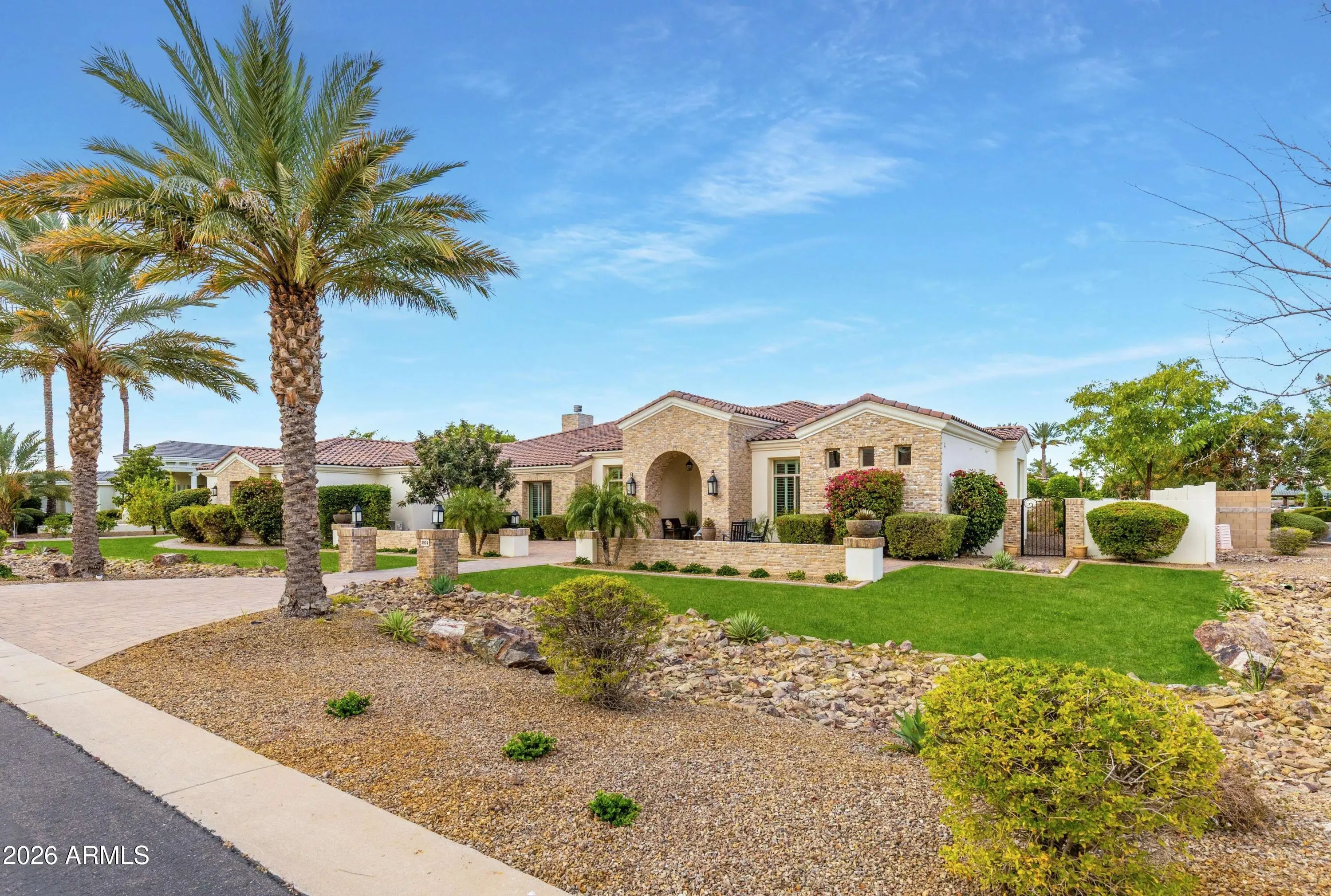 Nestled within a gated enclave of elevated custom homes, this modern farmhouse-inspired residence is enriched with subtle European character and timeless architectural detail. Completed in 2018, the home welcomes with a whitewashed brick exterior and gracious courtyard entry, accented by bold architectural lighting, thoughtfully layered landscaping, and ideal north/south exposure. An arched iron-and-glass front door anchors the façade, blending timeless European character with refined modern appeal. Inside, herringbone-patterned wood-look tile floors, soaring ceilings, and graceful brick-lined arches establish a sense of warmth and distinction, setting the tone for thoughtfully curated interiors throughout. Featuring carefully curated walls adorned with custom wainscoting, walls, every inch of the home has been masterfully detailed. Tall windows with plantation shutters and designer window treatments frame the living room, while tasteful wall coverings, brushed wood beams, brick-lined accent walls and modern farmhouse chandeliers create an inviting environment for refined entertaining and everyday comfort. The great room features a charming breakfast nook and a welcoming family room with custom built-ins, wood-beamed ceilings, and a striking fireplace that anchors the space. Open to the gourmet kitchen, the layout offers a seamless connection between gathering spaces and enhances the home's natural flow. Set on an impressive 36,000-square-foot irrigated corner lot, the property offers exceptional outdoor space and flexibility rarely found in this setting. A large paved driveway and custom RV gates provide access to covered backyard parking, with ample room to add a guest home, RV garage, or additional amenities. Green space is abundant with lush lawn space, mature citrus, and productive lemon trees that enhance the grounds with both beauty and function. The backyard is designed for resort-style living and entertaining, featuring a dramatic and newly built 9.5-foot-deep diving pool with heated spa, LED lighting, and water features. Travertine pavers extend the living and entertaining space, while an extraordinary outdoor kitchen and seating area designed for true culinary entertaining is anchored beneath a long-lasting aluminum ramada with café lighting, misting system, and automatic shade screens. A generous sit-up bar accommodates outdoor dining and gatherings, complemented by a Wolf built-in barbecue, ice chest, Mongolian grill, wok or oversized gas burner, and a show-stopping gas fireplace that creates a warm and inviting atmosphere year-round. The farmhouse-inspired kitchen blends soft white cabinetry with rich, deeper wood tones, creating a warm yet refined aesthetic. Honed quartzite countertops in a richly colored palette provide striking contrast, while the substantial mitered-edge island anchors the space and makes a bold design statement. A black Blanco sink, brushed black hardware, and coordinating light fixtures add a modern edge. Gourmet appliances include a Thermador gas range with griddle and burners, a professional chimney-style range hood framed by a brick façade, a GE Monogram French-door wall oven, and a built-in microwave. An ideal mix of open shelving and well-planned storage completes this highly functional and beautifully appointed kitchen. A private front office features a custom iron-and-glass door that allows diffused light while maintaining privacy. With a walk-in closet, the space offers flexibility as a home office, guest suite, or optional fifth bedroom. The owner's suite is a serene retreat, highlighted by refined horizontal wall paneling, a tray ceiling with rope lighting, and a dedicated sitting area. The en-suite bath is styled in elegant finishes and features quartz countertops, dual vanities, a soaking tub, stylish lighting, and a walk-in shower, and a private water closet with bidet. A spacious walk-in closet is smartly designed with added pull-down clothing racks for enhanced functionality. Completing the home is a charming powder bath featuring timeless wall coverings, a freestanding vanity with a stone vessel sink, and a bidet. Three additional guest bedrooms two in one wing and one in another each offer generous walk-in closets and private en-suite baths, providing comfort and privacy for family and guests alike. An oversized laundry room is purposedly designed with abundant cabinetry, a dedicated workspace, and a utility sink, while a mudroom off the garage adds everyday convenience with additional storage, a built-in bench, and wall hooks. The impressive 4.5-car garage is climate controlled with dual mini-split systems and features over-height garage doors, ample room for vehicles and recreational toys, and a separate storage area ideal for organized, year-round use. An expansive paved driveway provides additional parking, and custom powder-coated RV gates open to covered rear parking for a boat or recreational vehicles, complete with a 200-amp outlet for charging. Rosewood Estates is a prestigious gated community in the heart of Mesa's Citrus Corridor, featuring 23 custom homes on spacious lots with coveted private pickleball, tennis, and basketball courts. Conveniently located approximately 20 minutes from Sky Harbor Airport and Scottsdale, the community is also minutes from premier hiking, golf, mountain biking, water recreation, dining, shopping, and A-rated schools.