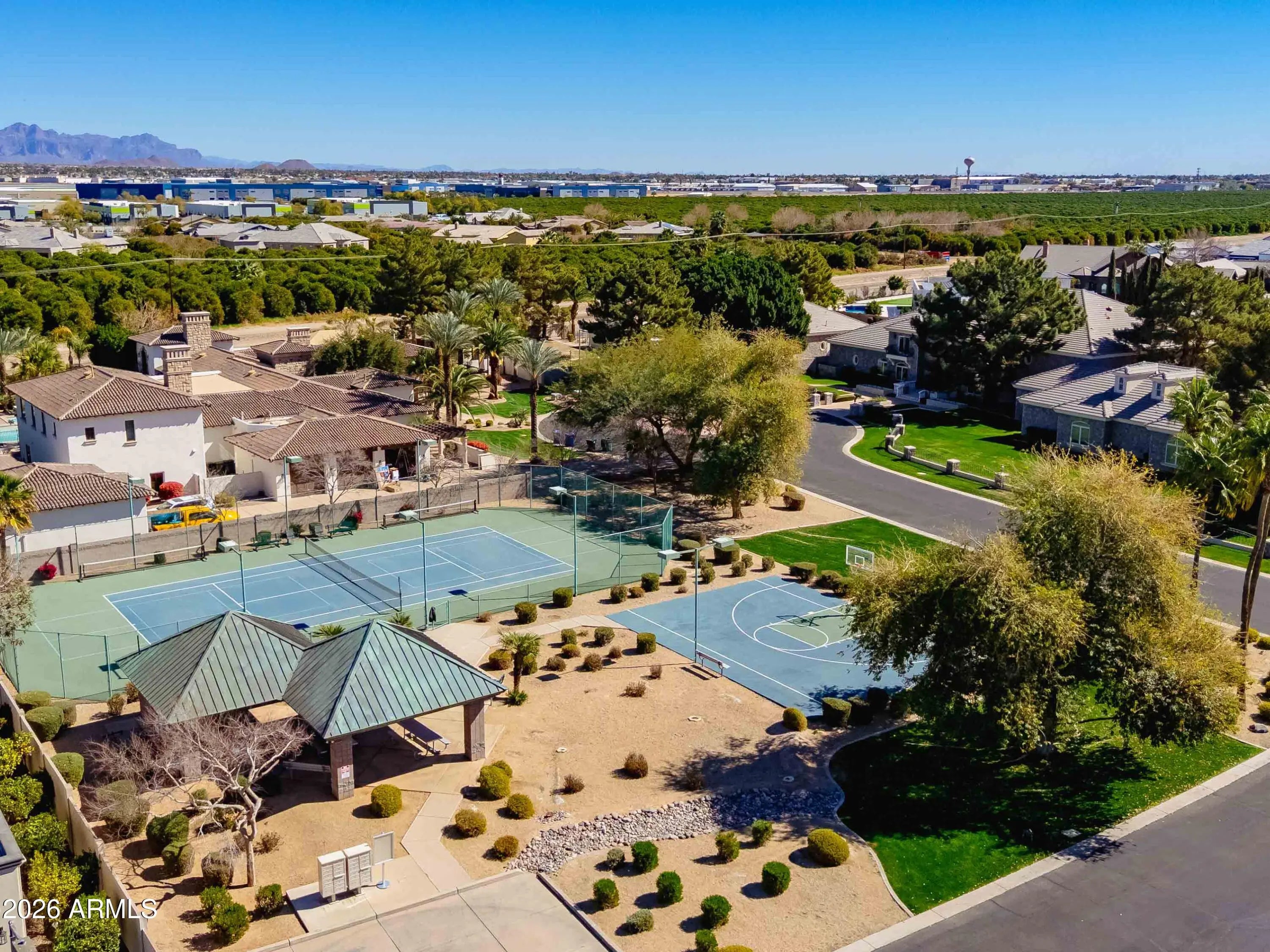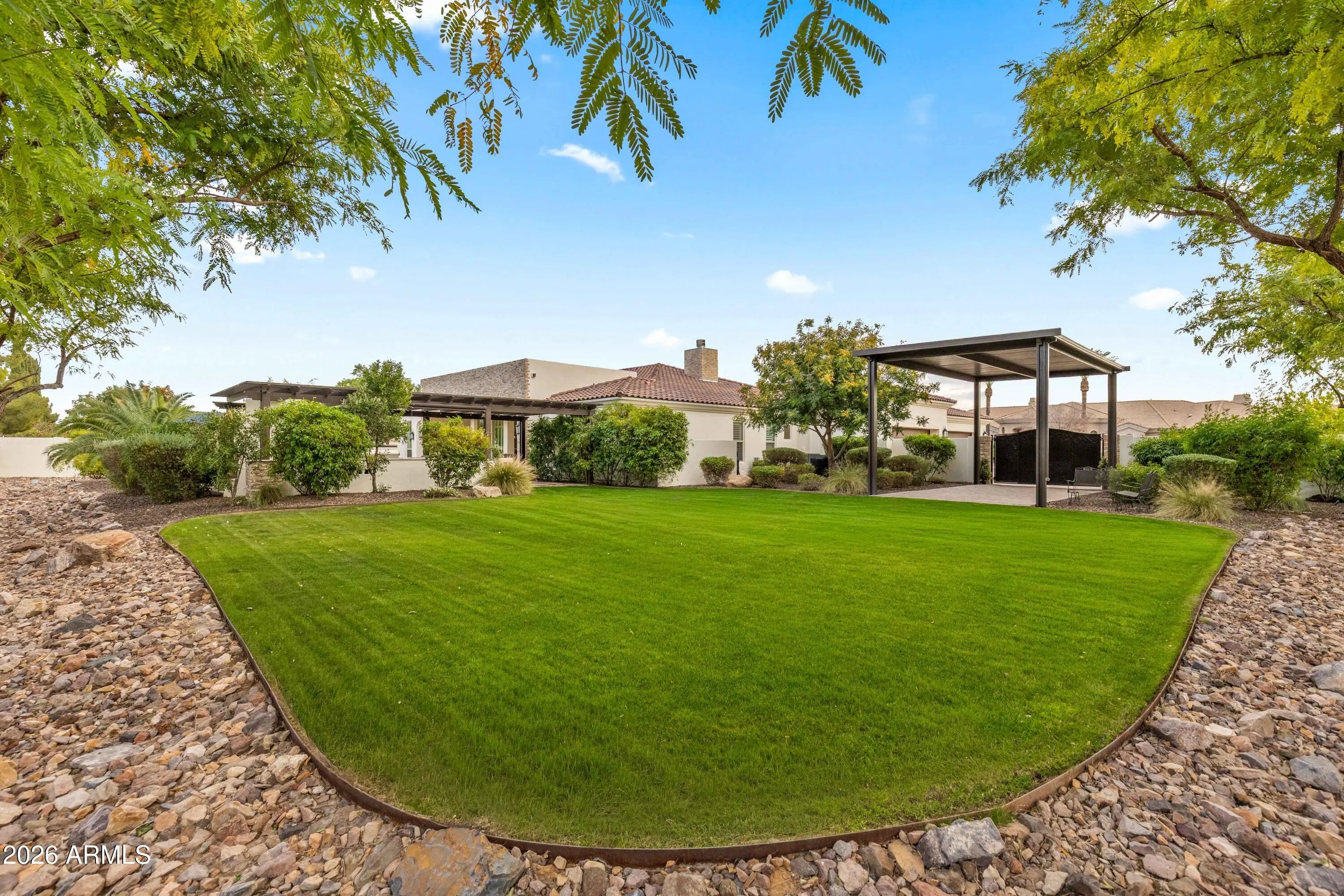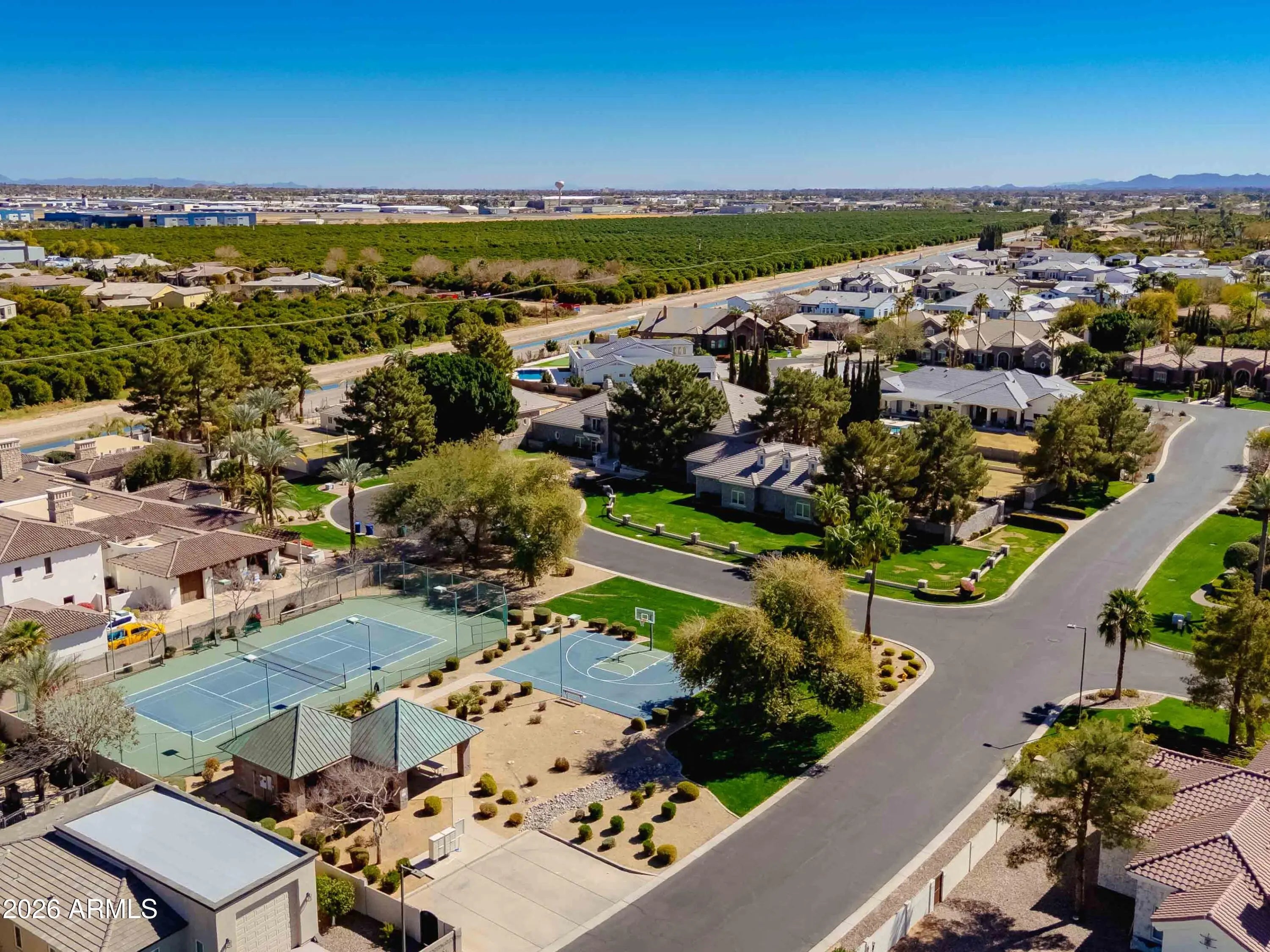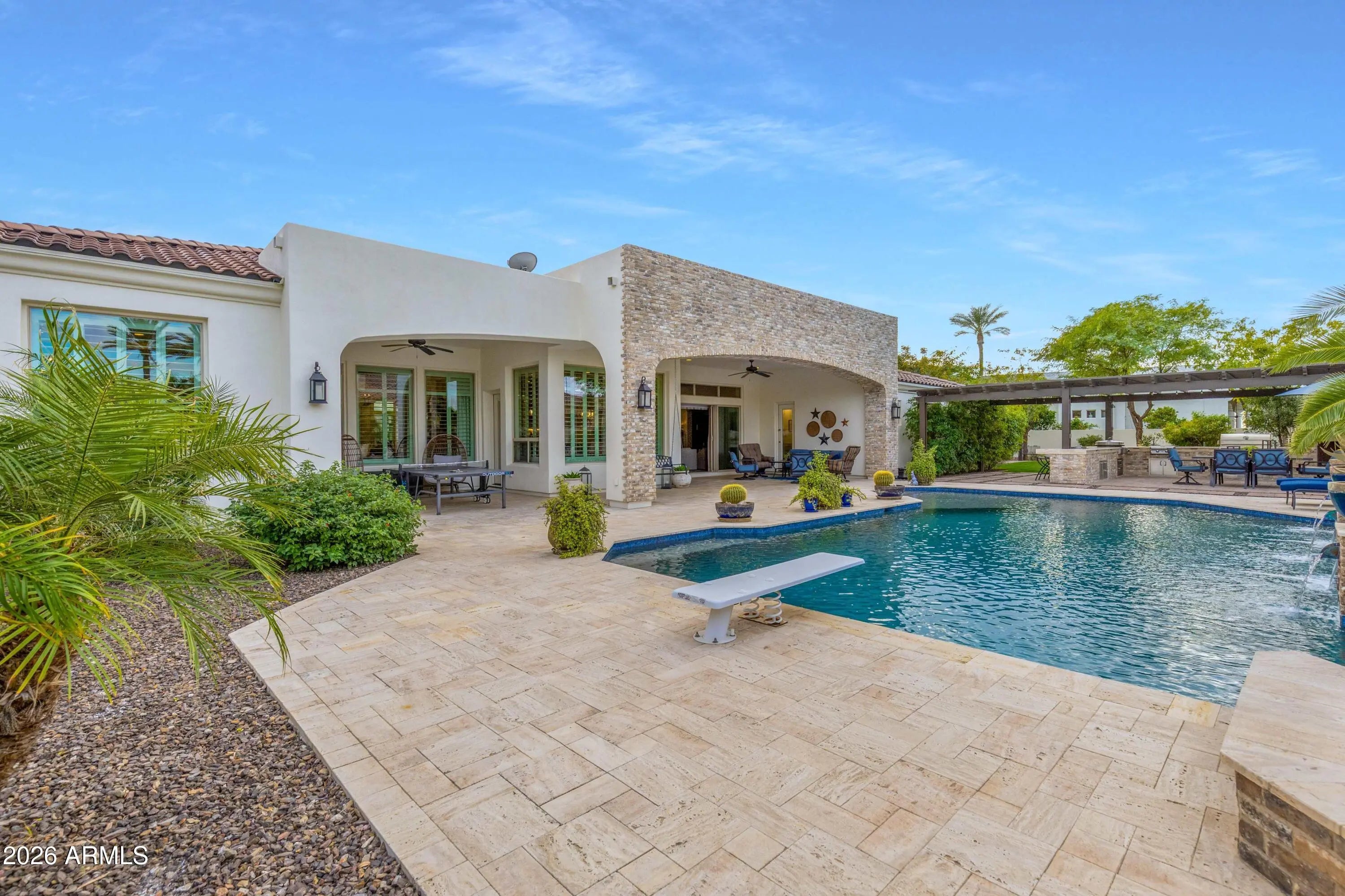 Nestled within a gated enclave of elevated custom homes, this modern farmhouse-inspired residence is enriched with subtle European character and timeless architectural detail. Completed in 2018, the home welcomes with a whitewashed brick exterior and gracious courtyard entry, accented by bold architectural lighting, thoughtfully layered landscaping, and ideal north/south exposure. An arched iron-and-glass front door anchors the façade, blending timeless European character with refined modern appeal. Inside, herringbone-patterned wood-look tile floors, soaring ceilings, and graceful brick-lined arches establish a sense of warmth and distinction, setting the tone for thoughtfully curated interiors throughout. Featuring carefully curated walls adorned with custom wainscoting, walls, every inch of the home has been masterfully detailed. Tall windows with plantation shutters and designer window treatments frame the living room, while tasteful wall coverings, brushed wood beams, brick-lined accent walls and modern farmhouse chandeliers create an inviting environment for refined entertaining and everyday comfort. The great room features a charming breakfast nook and a welcoming family room with custom built-ins, wood-beamed ceilings, and a striking fireplace that anchors the space. Open to the gourmet kitchen, the layout offers a seamless connection between gathering spaces and enhances the home's natural flow. Set on an impressive 36,000-square-foot irrigated corner lot, the property offers exceptional outdoor space and flexibility rarely found in this setting. A large paved driveway and custom RV gates provide access to covered backyard parking, with ample room to add a guest home, RV garage, or additional amenities. Green space is abundant with lush lawn space, mature citrus, and productive lemon trees that enhance the grounds with both beauty and function. The backyard is designed for resort-style living and entertaining, featuring a dramatic and newly built 9.5-foot-deep diving pool with heated spa, LED lighting, and water features. Travertine pavers extend the living and entertaining space, while an extraordinary outdoor kitchen and seating area designed for true culinary entertaining is anchored beneath a long-lasting aluminum ramada with café lighting, misting system, and automatic shade screens. A generous sit-up bar accommodates outdoor dining and gatherings, complemented by a Wolf built-in barbecue, ice chest, Mongolian grill, wok or oversized gas burner, and a show-stopping gas fireplace that creates a warm and inviting atmosphere year-round. The farmhouse-inspired kitchen blends soft white cabinetry with rich, deeper wood tones, creating a warm yet refined aesthetic. Honed quartzite countertops in a richly colored palette provide striking contrast, while the substantial mitered-edge island anchors the space and makes a bold design statement. A black Blanco sink, brushed black hardware, and coordinating light fixtures add a modern edge. Gourmet appliances include a Thermador gas range with griddle and burners, a professional chimney-style range hood framed by a brick façade, a GE Monogram French-door wall oven, and a built-in microwave. An ideal mix of open shelving and well-planned storage completes this highly functional and beautifully appointed kitchen. A private front office features a custom iron-and-glass door that allows diffused light while maintaining privacy. With a walk-in closet, the space offers flexibility as a home office, guest suite, or optional fifth bedroom. The owner's suite is a serene retreat, highlighted by refined horizontal wall paneling, a tray ceiling with rope lighting, and a dedicated sitting area. The en-suite bath is styled in elegant finishes and features quartz countertops, dual vanities, a soaking tub, stylish lighting, and a walk-in shower, and a private water closet with bidet. A spacious walk-in closet is smartly designed with added pull-down clothing racks for enhanced functionality. Completing the home is a charming powder bath featuring timeless wall coverings, a freestanding vanity with a stone vessel sink, and a bidet. Three additional guest bedrooms two in one wing and one in another each offer generous walk-in closets and private en-suite baths, providing comfort and privacy for family and guests alike. An oversized laundry room is purposedly designed with abundant cabinetry, a dedicated workspace, and a utility sink, while a mudroom off the garage adds everyday convenience with additional storage, a built-in bench, and wall hooks. The impressive 4.5-car garage is climate controlled with dual mini-split systems and features over-height garage doors, ample room for vehicles and recreational toys, and a separate storage area ideal for organized, year-round use. An expansive paved driveway provides additional parking, and custom powder-coated RV gates open to covered rear parking for a boat or recreational vehicles, complete with a 200-amp outlet for charging. Rosewood Estates is a prestigious gated community in the heart of Mesa's Citrus Corridor, featuring 23 custom homes on spacious lots with coveted private pickleball, tennis, and basketball courts. Conveniently located approximately 20 minutes from Sky Harbor Airport and Scottsdale, the community is also minutes from premier hiking, golf, mountain biking, water recreation, dining, shopping, and A-rated schools.