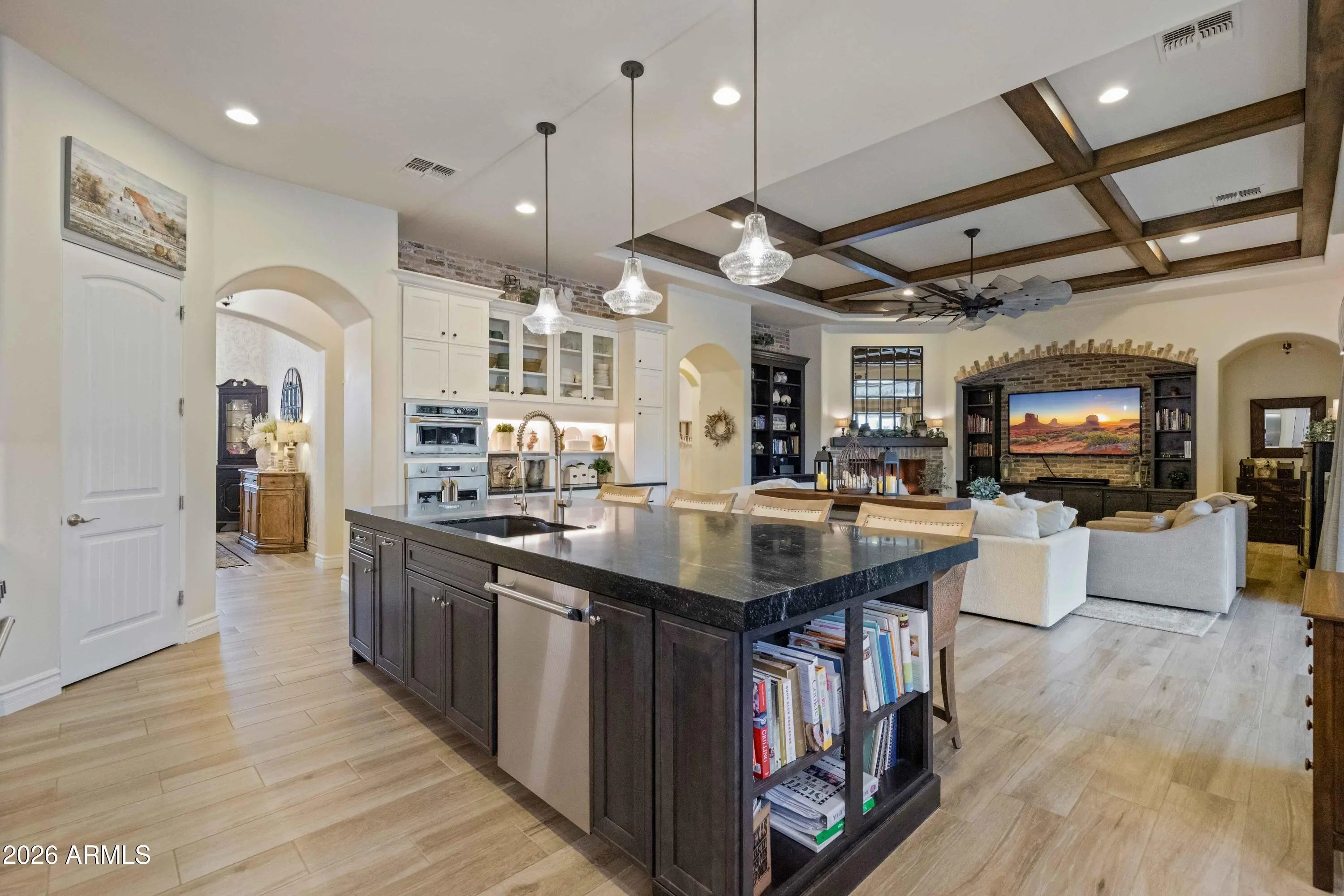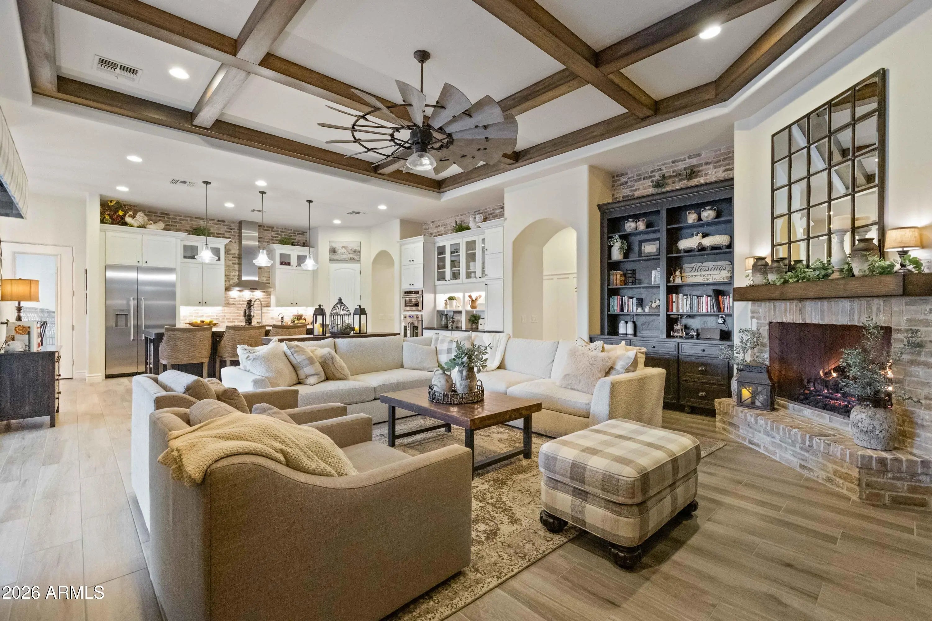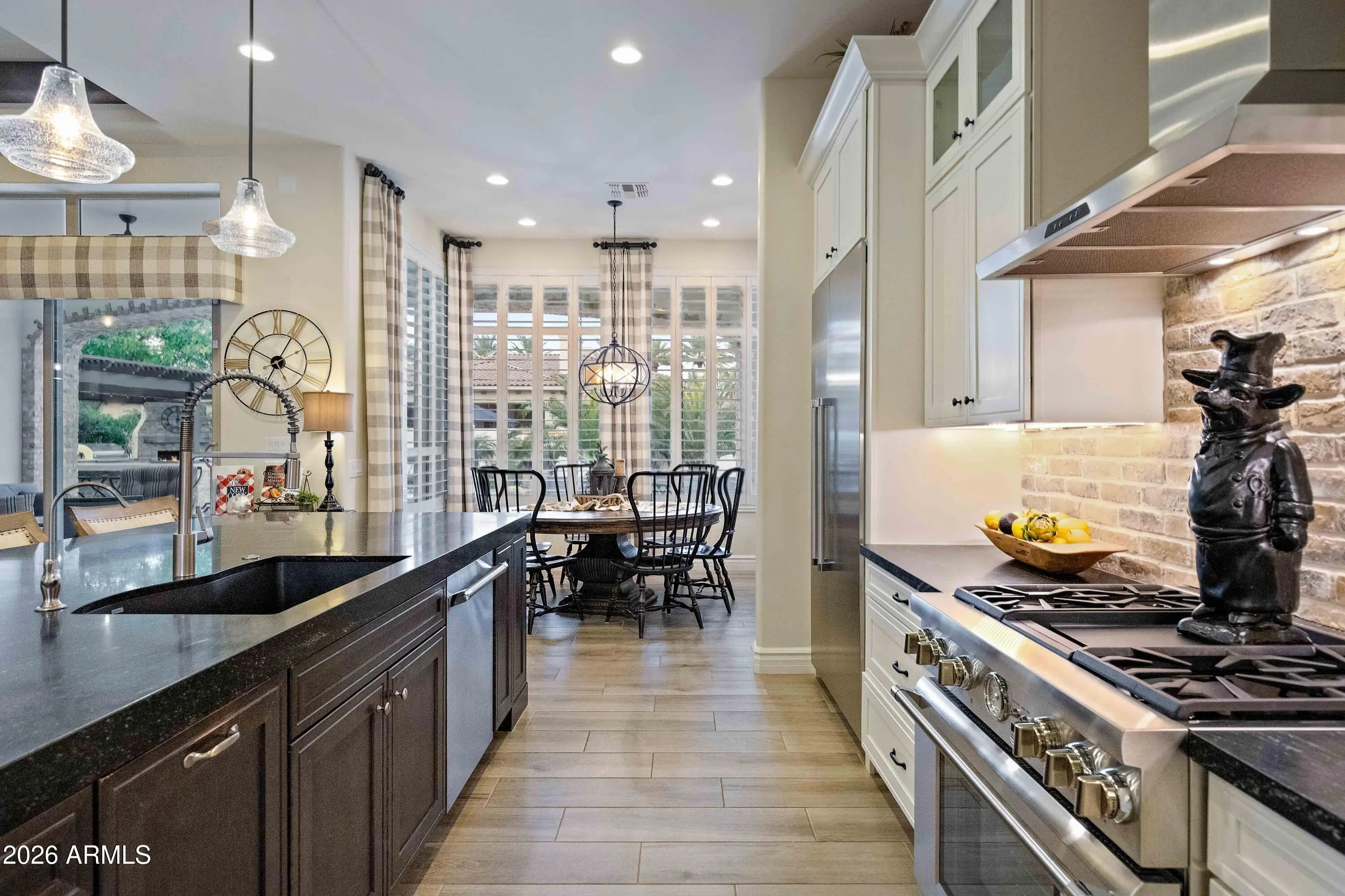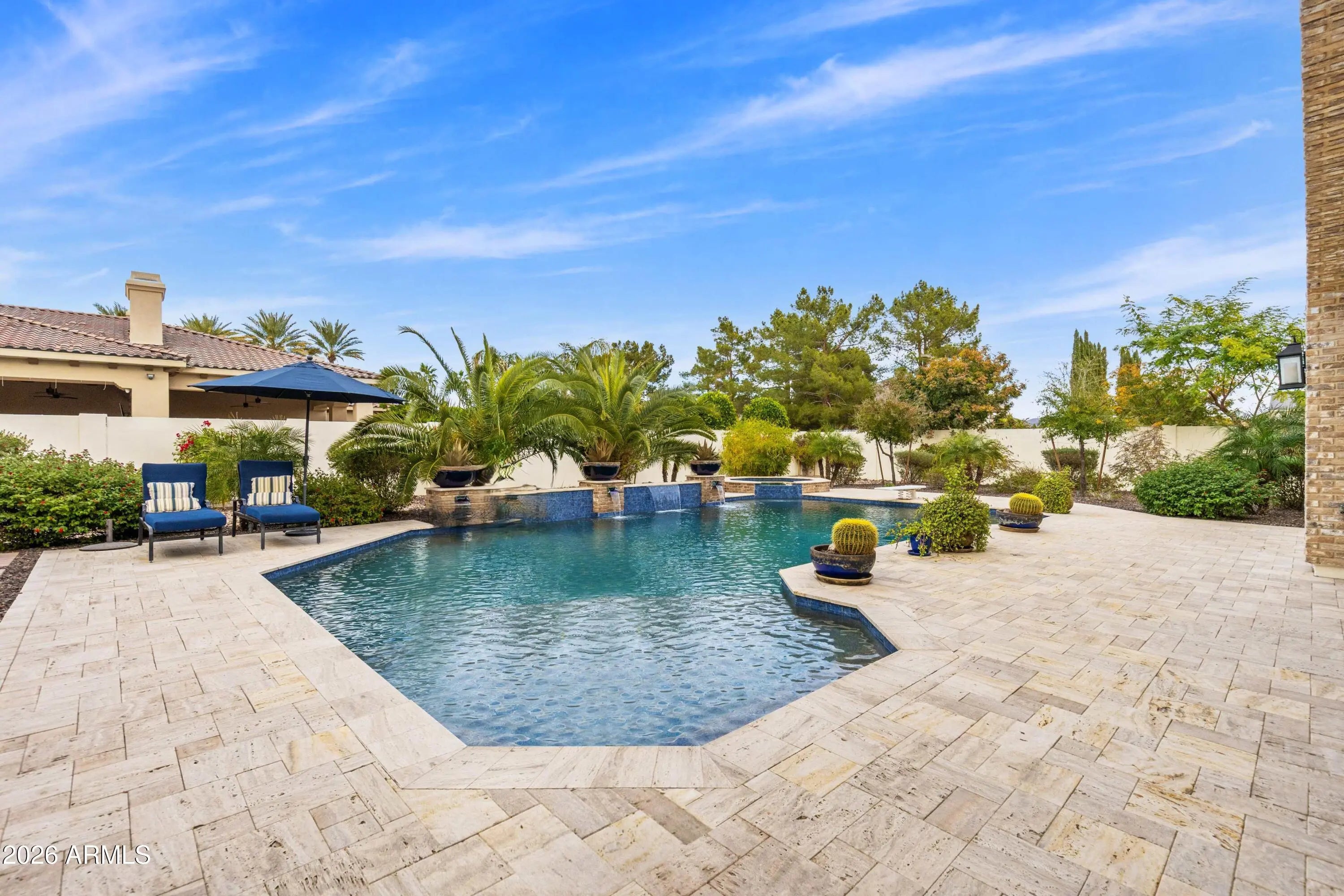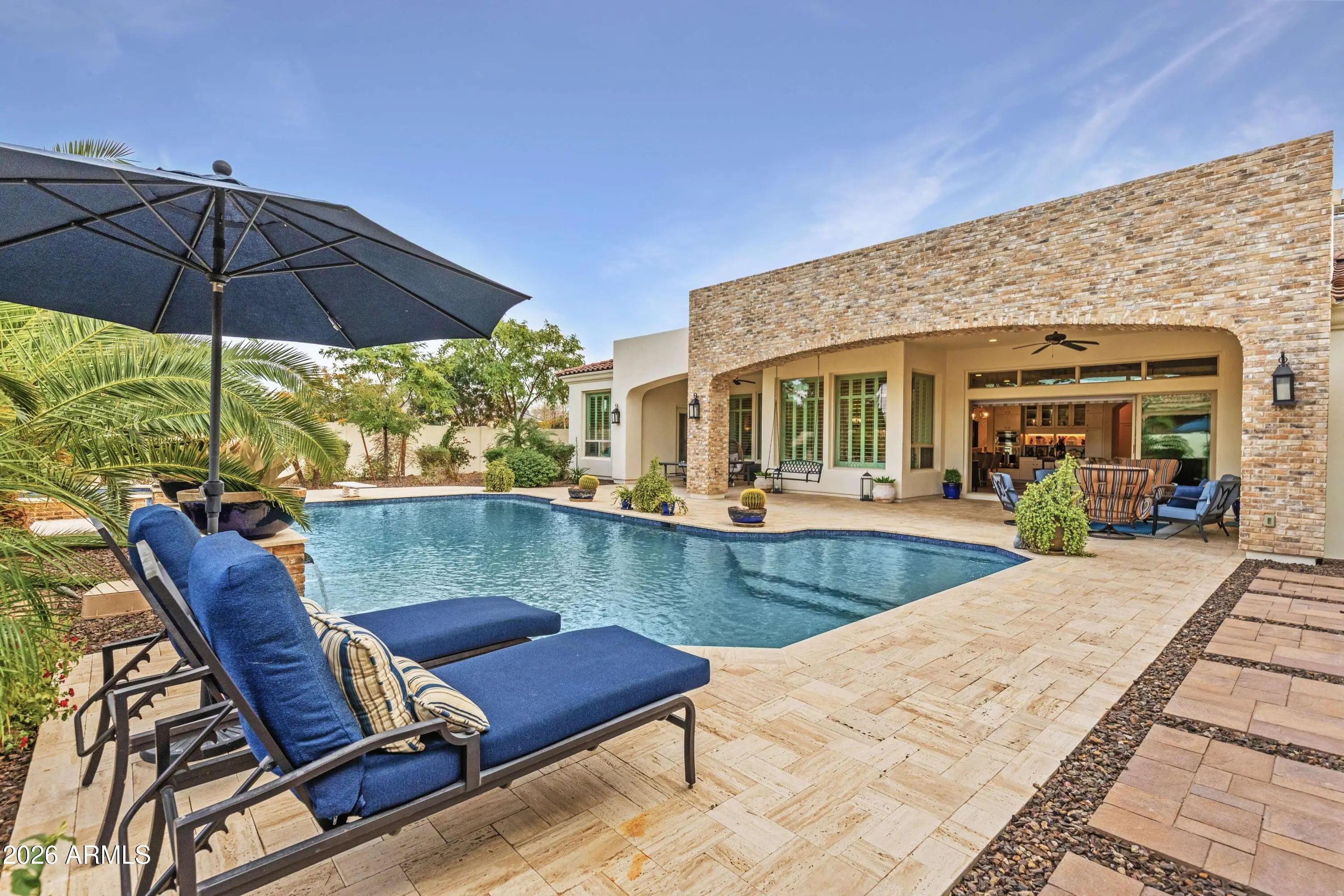 Nestled within a gated enclave of elevated custom homes, this modern farmhouse-inspired residence is enriched with subtle European character and timeless architectural detail. Completed in 2018, the home welcomes with a whitewashed brick exterior and gracious courtyard entry, accented by bold architectural lighting, thoughtfully layered landscaping, and ideal north/south exposure. An arched iron-and-glass front door anchors the façade, blending timeless European character with refined modern appeal. Inside, herringbone-patterned wood-look tile floors, soaring ceilings, and graceful brick-lined arches establish a sense of warmth and distinction, setting the tone for thoughtfully curated interiors throughout. Featuring carefully curated walls adorned with custom wainscoting, walls, every inch of the home has been masterfully detailed. Tall windows with plantation shutters and designer window treatments frame the living room, while tasteful wall coverings, brushed wood beams, brick-lined accent walls and modern farmhouse chandeliers create an inviting environment for refined entertaining and everyday comfort. The great room features a charming breakfast nook and a welcoming family room with custom built-ins, wood-beamed ceilings, and a striking fireplace that anchors the space. Open to the gourmet kitchen, the layout offers a seamless connection between gathering spaces and enhances the home's natural flow. Set on an impressive 36,000-square-foot irrigated corner lot, the property offers exceptional outdoor space and flexibility rarely found in this setting. A large paved driveway and custom RV gates provide access to covered backyard parking, with ample room to add a guest home, RV garage, or additional amenities. Green space is abundant with lush lawn space, mature citrus, and productive lemon trees that enhance the grounds with both beauty and function. The backyard is designed for resort-style living and entertaining, featuring a dramatic and newly built 9.5-foot-deep diving pool with heated spa, LED lighting, and water features. Travertine pavers extend the living and entertaining space, while an extraordinary outdoor kitchen and seating area designed for true culinary entertaining is anchored beneath a long-lasting aluminum ramada with café lighting, misting system, and automatic shade screens. A generous sit-up bar accommodates outdoor dining and gatherings, complemented by a Wolf built-in barbecue, ice chest, Mongolian grill, wok or oversized gas burner, and a show-stopping gas fireplace that creates a warm and inviting atmosphere year-round. The farmhouse-inspired kitchen blends soft white cabinetry with rich, deeper wood tones, creating a warm yet refined aesthetic. Honed quartzite countertops in a richly colored palette provide striking contrast, while the substantial mitered-edge island anchors the space and makes a bold design statement. A black Blanco sink, brushed black hardware, and coordinating light fixtures add a modern edge. Gourmet appliances include a Thermador gas range with griddle and burners, a professional chimney-style range hood framed by a brick façade, a GE Monogram French-door wall oven, and a built-in microwave. An ideal mix of open shelving and well-planned storage completes this highly functional and beautifully appointed kitchen. A private front office features a custom iron-and-glass door that allows diffused light while maintaining privacy. With a walk-in closet, the space offers flexibility as a home office, guest suite, or optional fifth bedroom. The owner's suite is a serene retreat, highlighted by refined horizontal wall paneling, a tray ceiling with rope lighting, and a dedicated sitting area. The en-suite bath is styled in elegant finishes and features quartz countertops, dual vanities, a soaking tub, stylish lighting, and a walk-in shower, and a private water closet with bidet. A spacious walk-in closet is smartly designed with added pull-down clothing racks for enhanced functionality. Completing the home is a charming powder bath featuring timeless wall coverings, a freestanding vanity with a stone vessel sink, and a bidet. Three additional guest bedrooms two in one wing and one in another each offer generous walk-in closets and private en-suite baths, providing comfort and privacy for family and guests alike. An oversized laundry room is purposedly designed with abundant cabinetry, a dedicated workspace, and a utility sink, while a mudroom off the garage adds everyday convenience with additional storage, a built-in bench, and wall hooks. The impressive 4.5-car garage is climate controlled with dual mini-split systems and features over-height garage doors, ample room for vehicles and recreational toys, and a separate storage area ideal for organized, year-round use. An expansive paved driveway provides additional parking, and custom powder-coated RV gates open to covered rear parking for a boat or recreational vehicles, complete with a 200-amp outlet for charging. Rosewood Estates is a prestigious gated community in the heart of Mesa's Citrus Corridor, featuring 23 custom homes on spacious lots with coveted private pickleball, tennis, and basketball courts. Conveniently located approximately 20 minutes from Sky Harbor Airport and Scottsdale, the community is also minutes from premier hiking, golf, mountain biking, water recreation, dining, shopping, and A-rated schools.