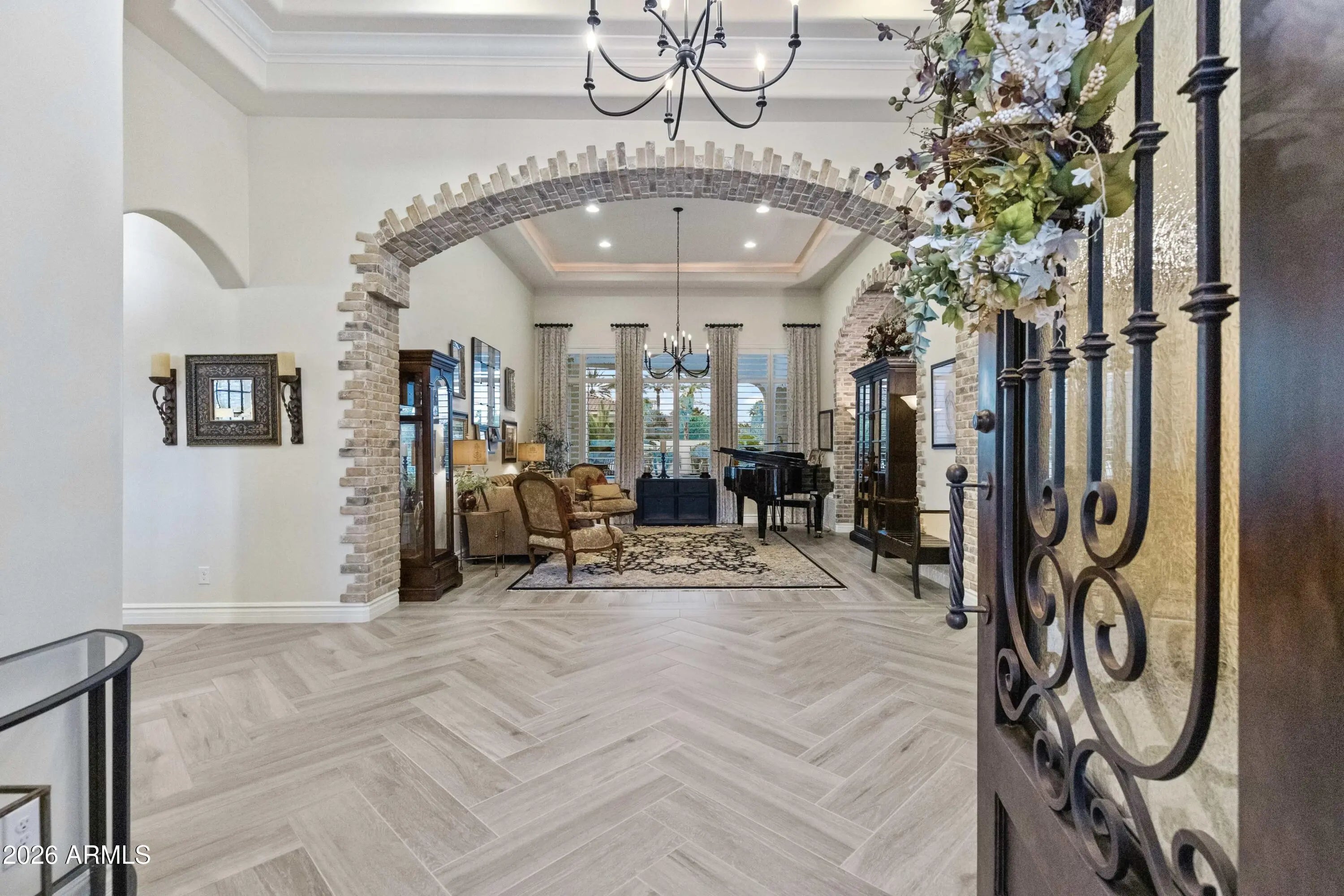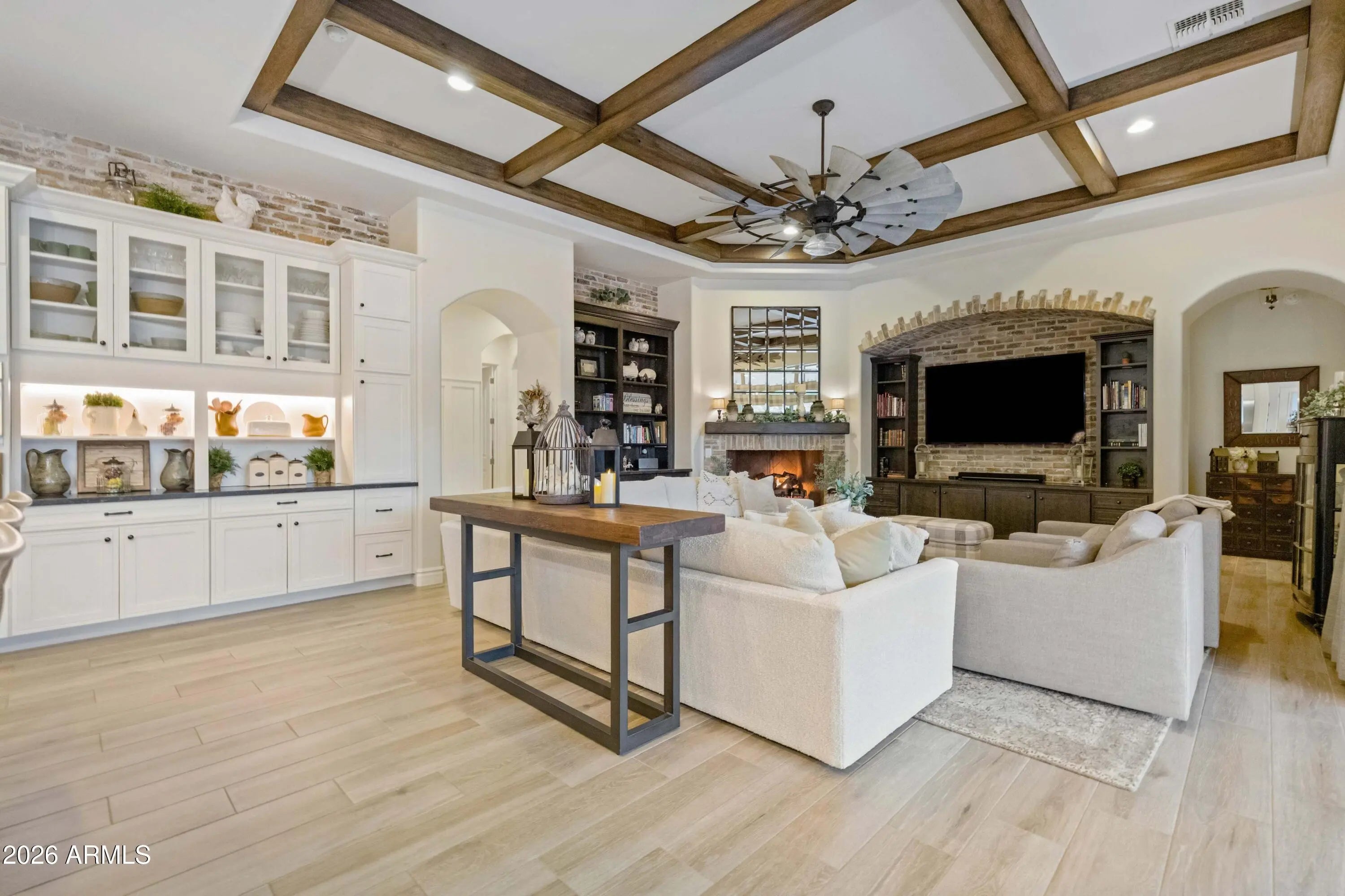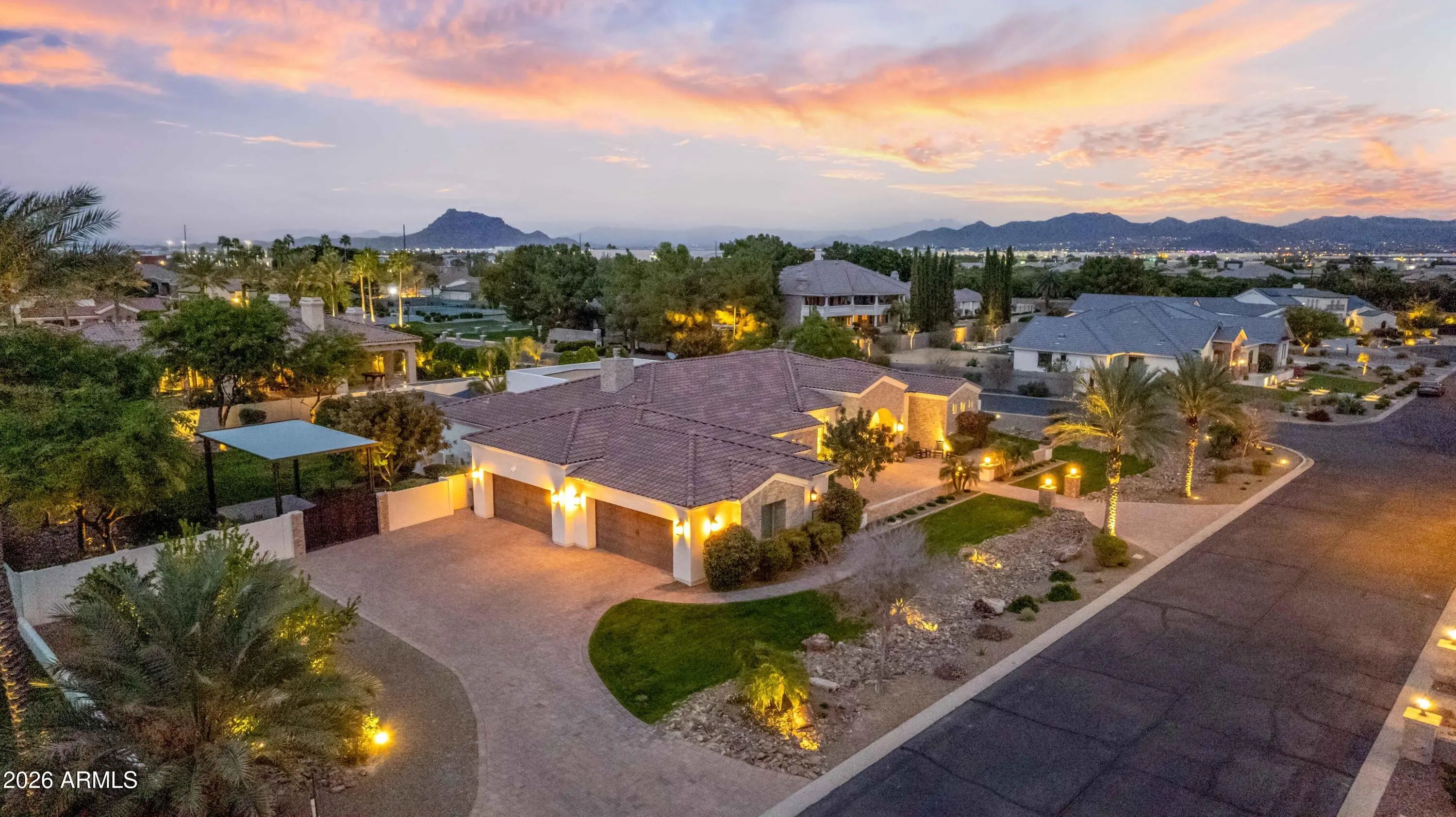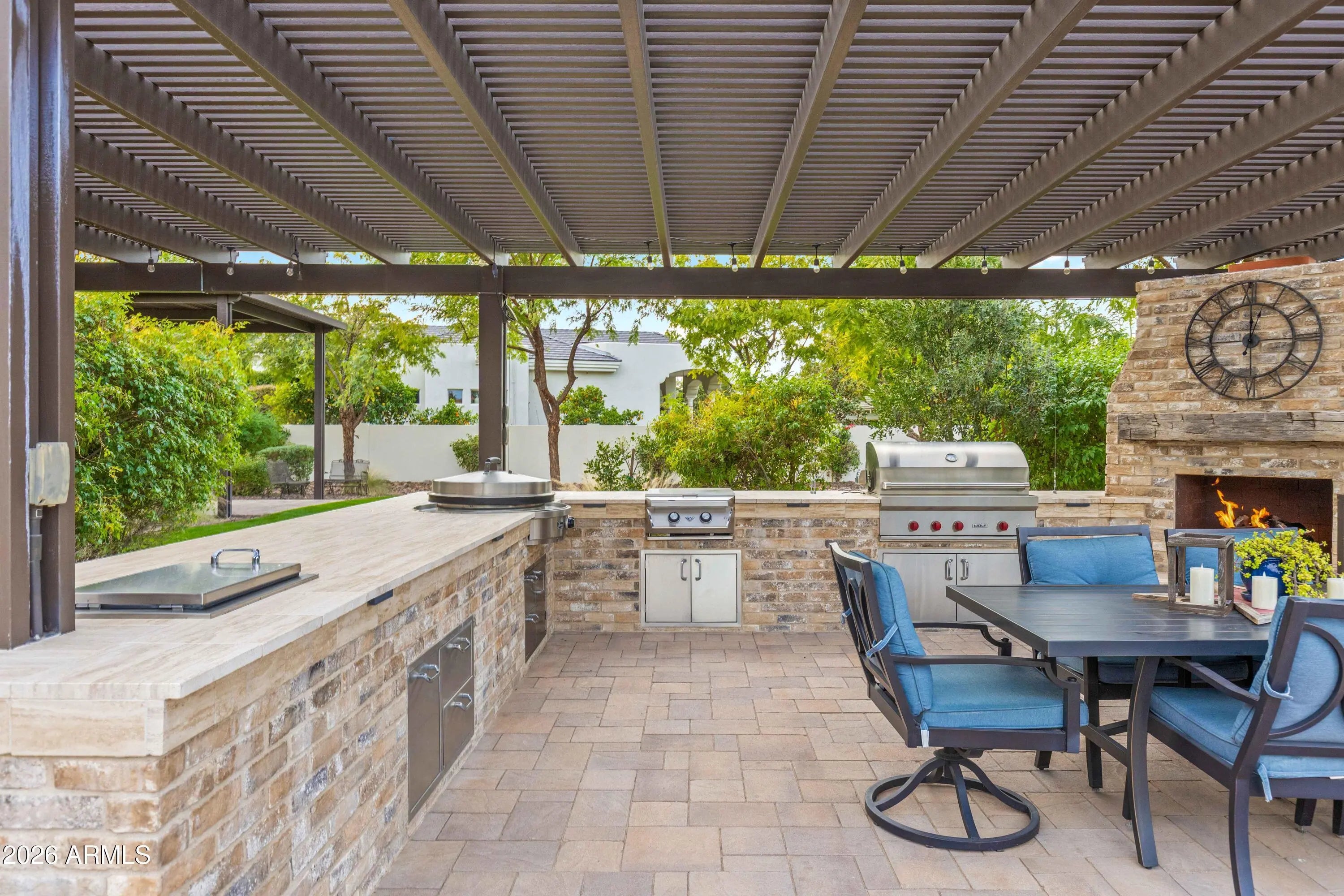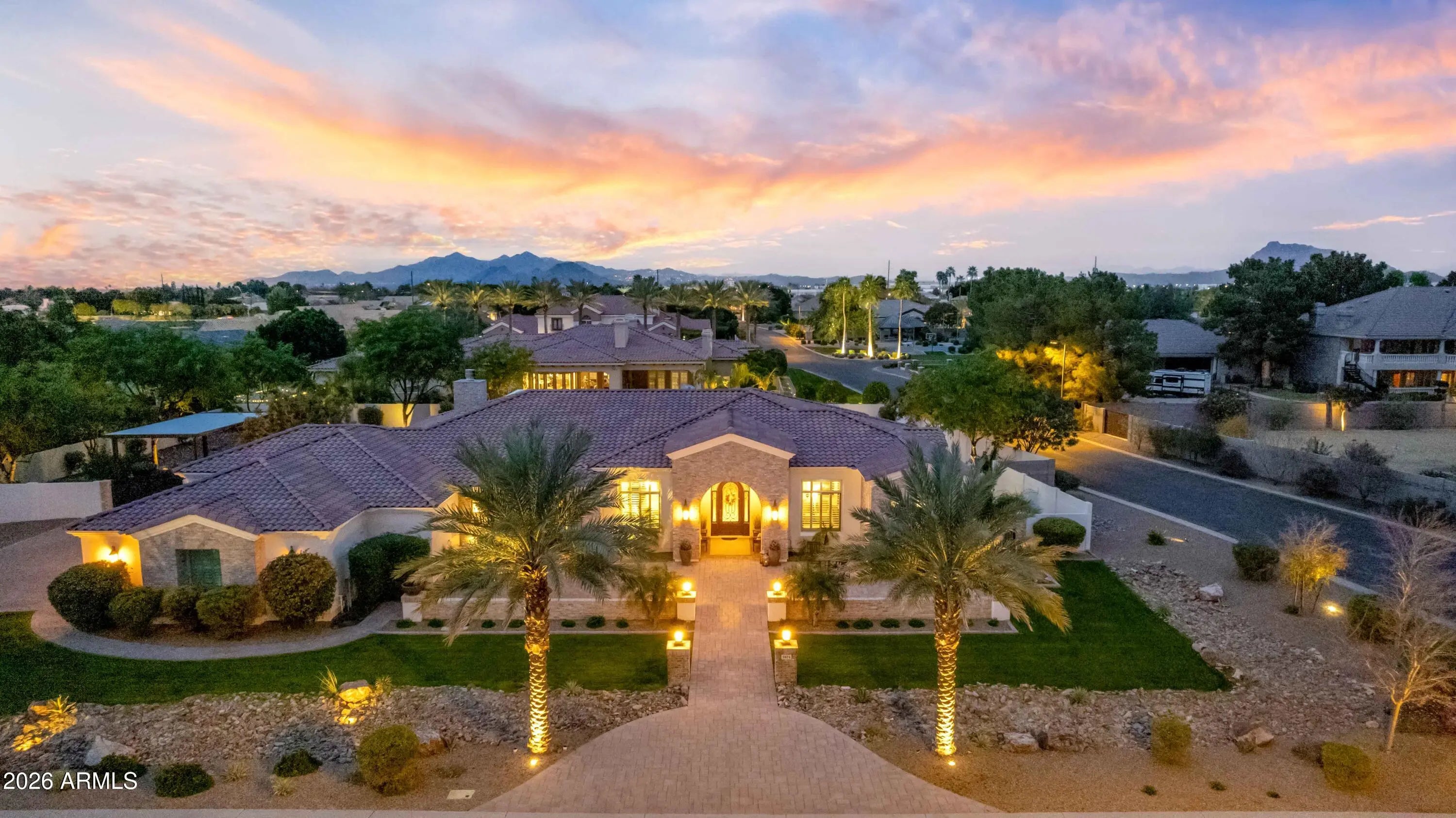 Nestled within a gated enclave of elevated custom homes, this modern farmhouse-inspired residence is enriched with subtle European character and timeless architectural detail. Completed in 2018, the home welcomes with a whitewashed brick exterior and gracious courtyard entry, accented by bold architectural lighting, thoughtfully layered landscaping, and ideal north/south exposure. An arched iron-and-glass front door anchors the façade, blending timeless European character with refined modern appeal. Inside, herringbone-patterned wood-look tile floors, soaring ceilings, and graceful brick-lined arches establish a sense of warmth and distinction, setting the tone for thoughtfully curated interiors throughout. Featuring carefully curated walls adorned with custom wainscoting, walls, every inch of the home has been masterfully detailed. Tall windows with plantation shutters and designer window treatments frame the living room, while tasteful wall coverings, brushed wood beams, brick-lined accent walls and modern farmhouse chandeliers create an inviting environment for refined entertaining and everyday comfort. The great room features a charming breakfast nook and a welcoming family room with custom built-ins, wood-beamed ceilings, and a striking fireplace that anchors the space. Open to the gourmet kitchen, the layout offers a seamless connection between gathering spaces and enhances the home's natural flow. Set on an impressive 36,000-square-foot irrigated corner lot, the property offers exceptional outdoor space and flexibility rarely found in this setting. A large paved driveway and custom RV gates provide access to covered backyard parking, with ample room to add a guest home, RV garage, or additional amenities. Green space is abundant with lush lawn space, mature citrus, and productive lemon trees that enhance the grounds with both beauty and function. The backyard is designed for resort-style living and entertaining, featuring a dramatic and newly built 9.5-foot-deep diving pool with heated spa, LED lighting, and water features. Travertine pavers extend the living and entertaining space, while an extraordinary outdoor kitchen and seating area designed for true culinary entertaining is anchored beneath a long-lasting aluminum ramada with café lighting, misting system, and automatic shade screens. A generous sit-up bar accommodates outdoor dining and gatherings, complemented by a Wolf built-in barbecue, ice chest, Mongolian grill, wok or oversized gas burner, and a show-stopping gas fireplace that creates a warm and inviting atmosphere year-round. The farmhouse-inspired kitchen blends soft white cabinetry with rich, deeper wood tones, creating a warm yet refined aesthetic. Honed quartzite countertops in a richly colored palette provide striking contrast, while the substantial mitered-edge island anchors the space and makes a bold design statement. A black Blanco sink, brushed black hardware, and coordinating light fixtures add a modern edge. Gourmet appliances include a Thermador gas range with griddle and burners, a professional chimney-style range hood framed by a brick façade, a GE Monogram French-door wall oven, and a built-in microwave. An ideal mix of open shelving and well-planned storage completes this highly functional and beautifully appointed kitchen. A private front office features a custom iron-and-glass door that allows diffused light while maintaining privacy. With a walk-in closet, the space offers flexibility as a home office, guest suite, or optional fifth bedroom. The owner's suite is a serene retreat, highlighted by refined horizontal wall paneling, a tray ceiling with rope lighting, and a dedicated sitting area. The en-suite bath is styled in elegant finishes and features quartz countertops, dual vanities, a soaking tub, stylish lighting, and a walk-in shower, and a private water closet with bidet. A spacious walk-in closet is smartly designed with added pull-down clothing racks for enhanced functionality. Completing the home is a charming powder bath featuring timeless wall coverings, a freestanding vanity with a stone vessel sink, and a bidet. Three additional guest bedrooms two in one wing and one in another each offer generous walk-in closets and private en-suite baths, providing comfort and privacy for family and guests alike. An oversized laundry room is purposedly designed with abundant cabinetry, a dedicated workspace, and a utility sink, while a mudroom off the garage adds everyday convenience with additional storage, a built-in bench, and wall hooks. The impressive 4.5-car garage is climate controlled with dual mini-split systems and features over-height garage doors, ample room for vehicles and recreational toys, and a separate storage area ideal for organized, year-round use. An expansive paved driveway provides additional parking, and custom powder-coated RV gates open to covered rear parking for a boat or recreational vehicles, complete with a 200-amp outlet for charging. Rosewood Estates is a prestigious gated community in the heart of Mesa's Citrus Corridor, featuring 23 custom homes on spacious lots with coveted private pickleball, tennis, and basketball courts. Conveniently located approximately 20 minutes from Sky Harbor Airport and Scottsdale, the community is also minutes from premier hiking, golf, mountain biking, water recreation, dining, shopping, and A-rated schools.