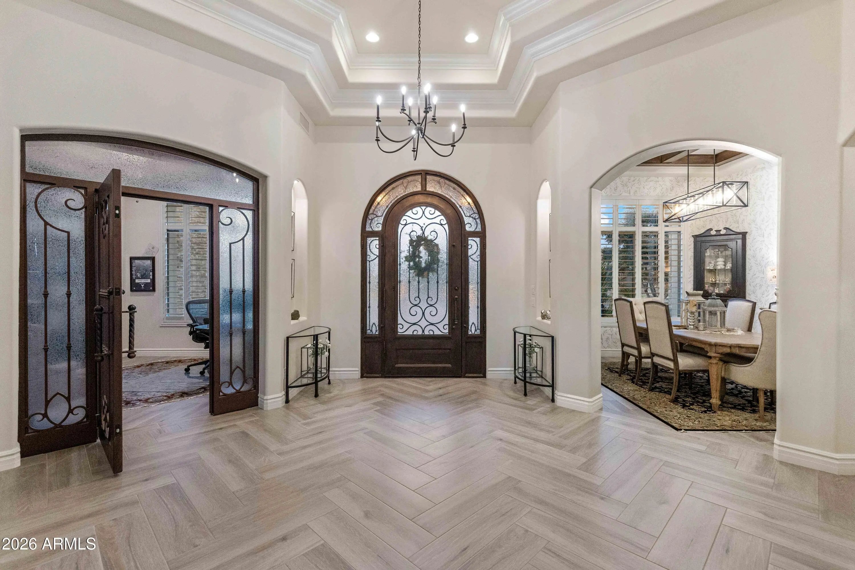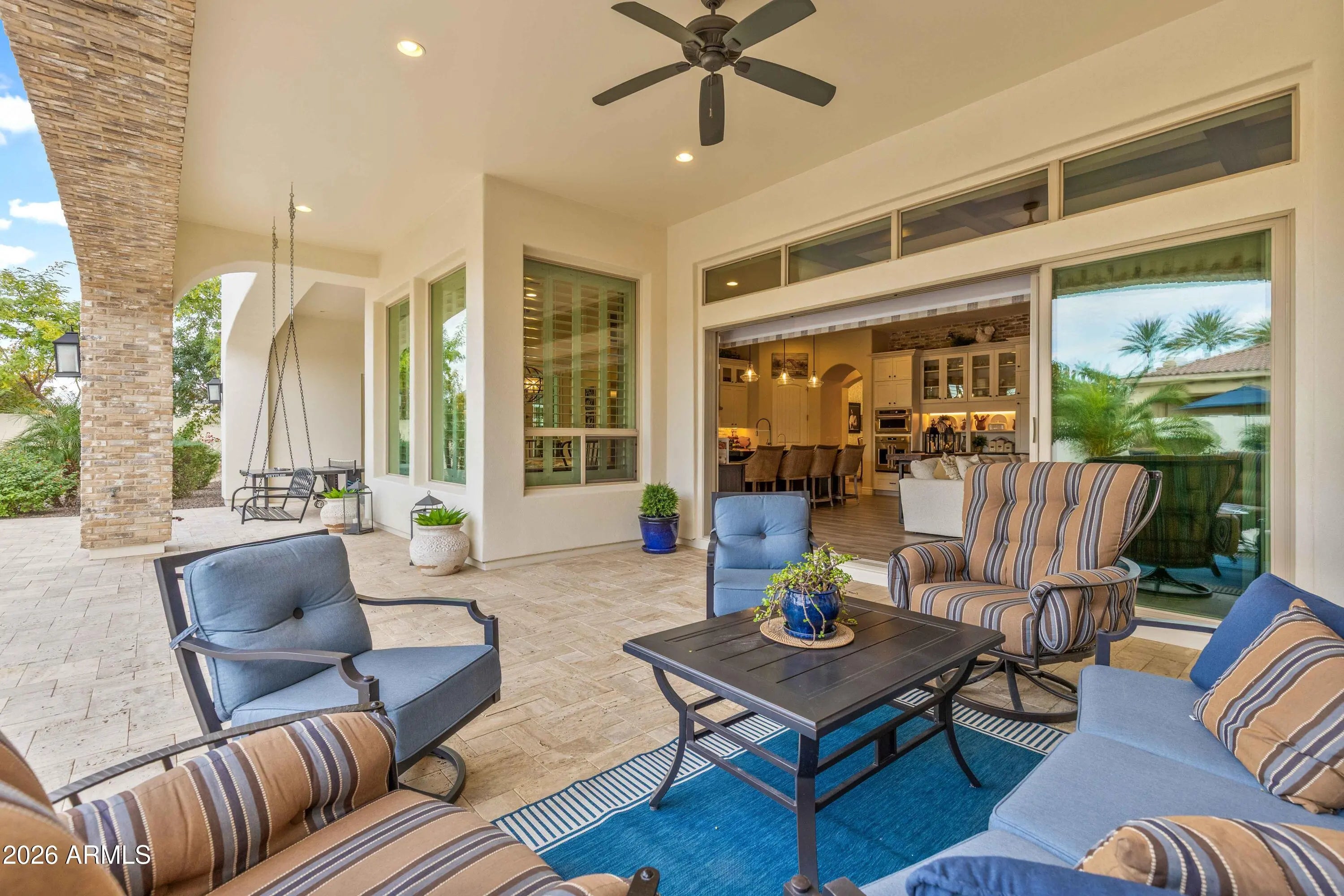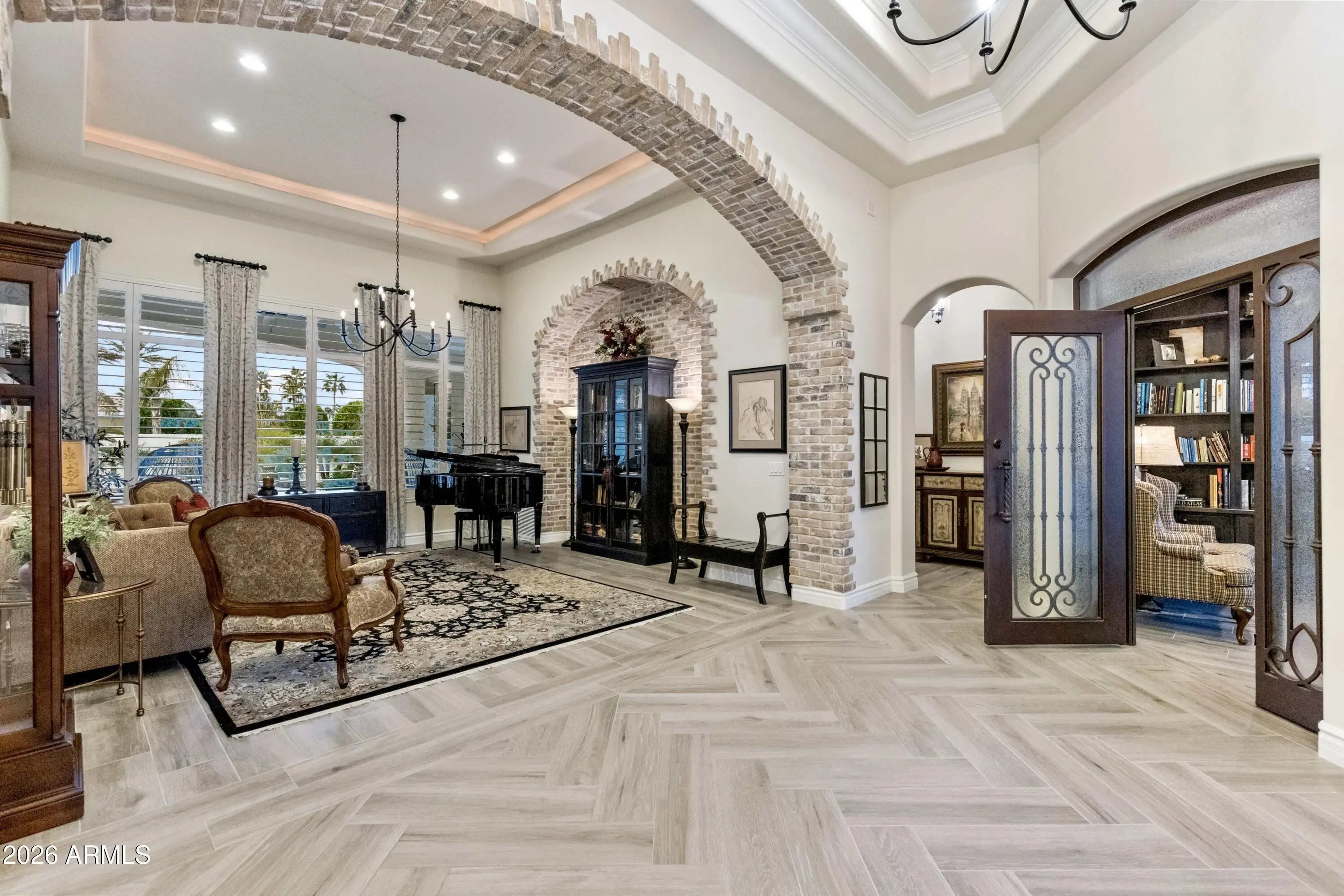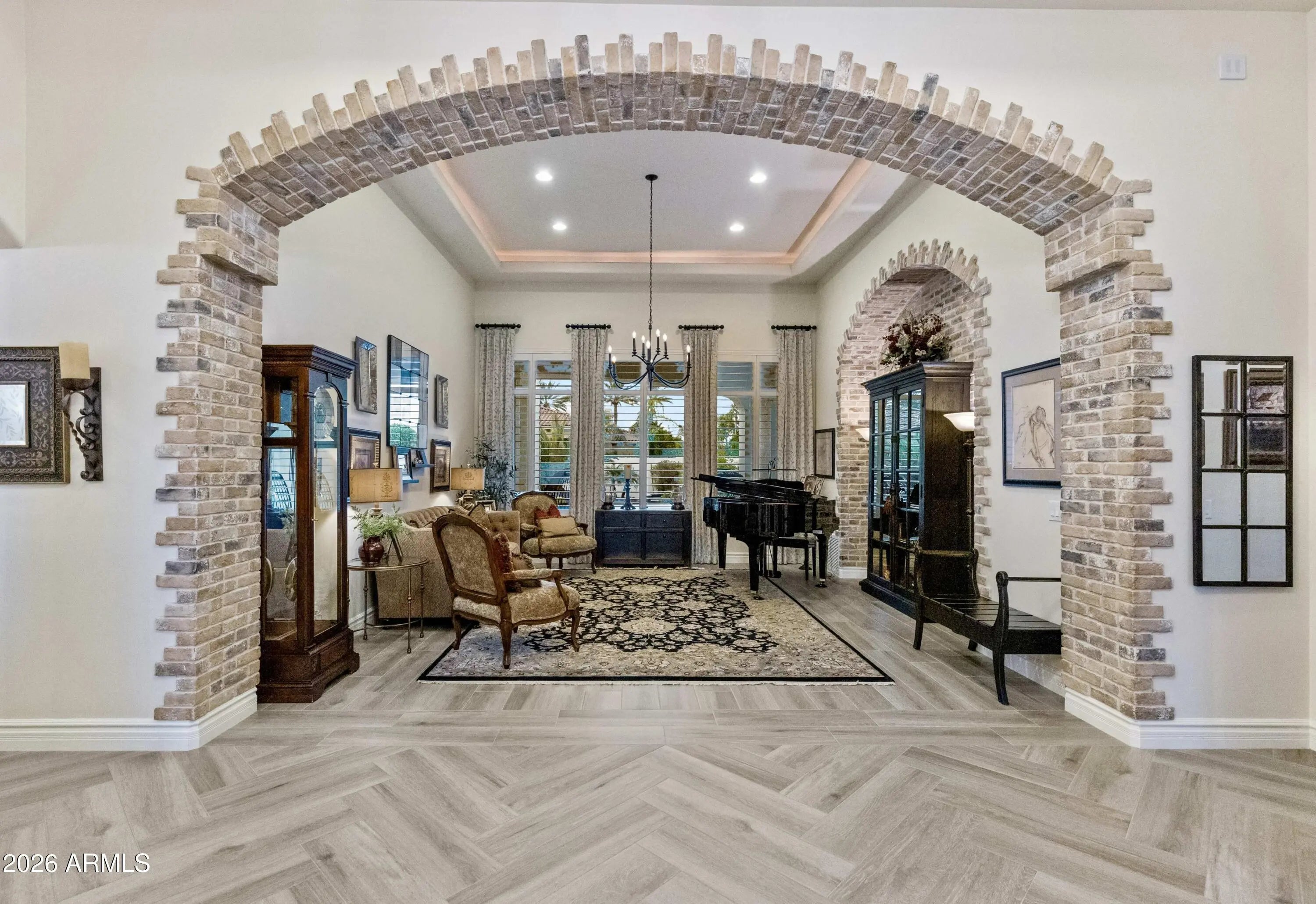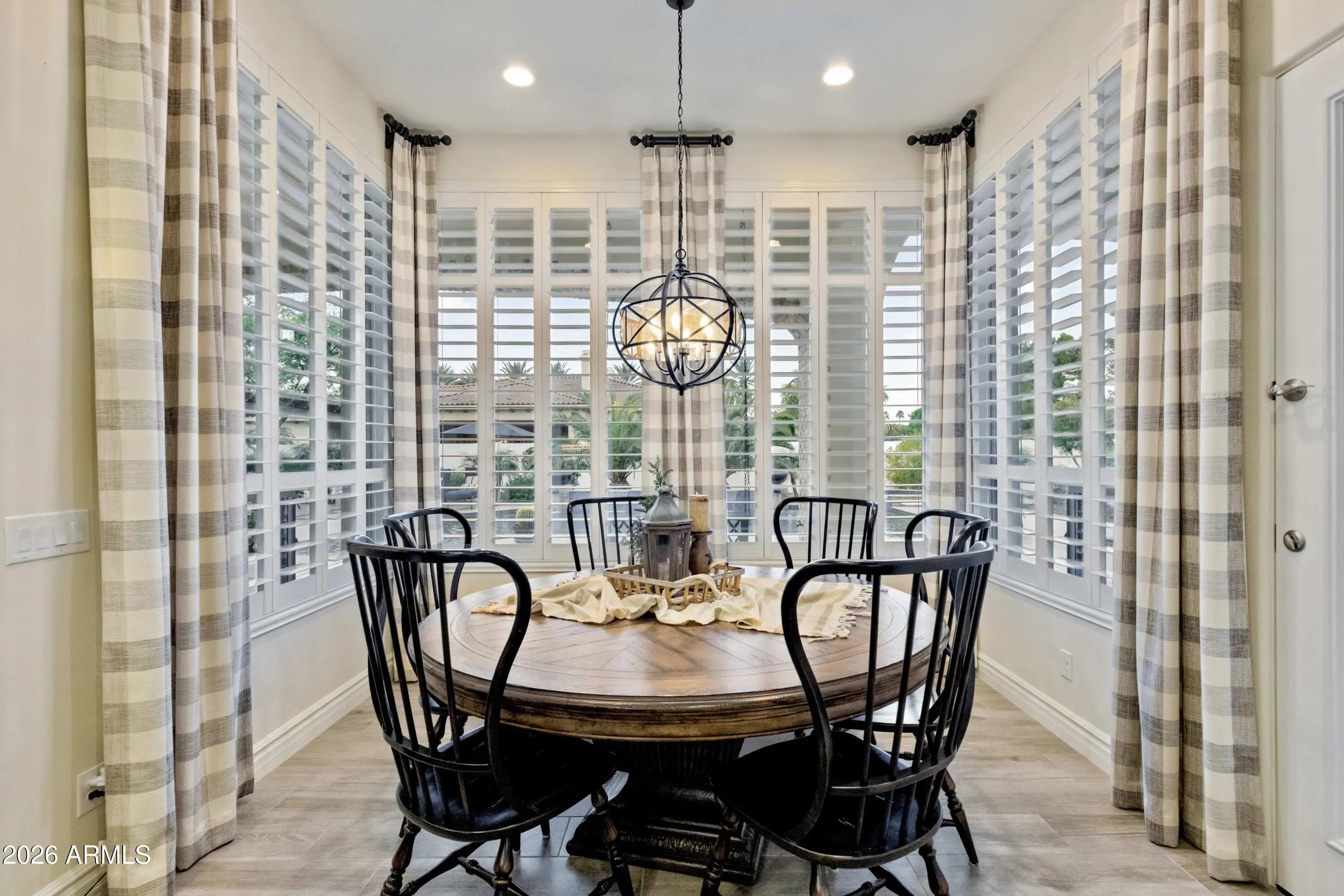 Nestled within a gated enclave of elevated custom homes, this modern farmhouse-inspired residence is enriched with subtle European character and timeless architectural detail. Completed in 2018, the home welcomes with a whitewashed brick exterior and gracious courtyard entry, accented by bold architectural lighting, thoughtfully layered landscaping, and ideal north/south exposure. An arched iron-and-glass front door anchors the façade, blending timeless European character with refined modern appeal. Inside, herringbone-patterned wood-look tile floors, soaring ceilings, and graceful brick-lined arches establish a sense of warmth and distinction, setting the tone for thoughtfully curated interiors throughout. Featuring carefully curated walls adorned with custom wainscoting, walls, every inch of the home has been masterfully detailed. Tall windows with plantation shutters and designer window treatments frame the living room, while tasteful wall coverings, brushed wood beams, brick-lined accent walls and modern farmhouse chandeliers create an inviting environment for refined entertaining and everyday comfort. The great room features a charming breakfast nook and a welcoming family room with custom built-ins, wood-beamed ceilings, and a striking fireplace that anchors the space. Open to the gourmet kitchen, the layout offers a seamless connection between gathering spaces and enhances the home's natural flow. Set on an impressive 36,000-square-foot irrigated corner lot, the property offers exceptional outdoor space and flexibility rarely found in this setting. A large paved driveway and custom RV gates provide access to covered backyard parking, with ample room to add a guest home, RV garage, or additional amenities. Green space is abundant with lush lawn space, mature citrus, and productive lemon trees that enhance the grounds with both beauty and function. The backyard is designed for resort-style living and entertaining, featuring a dramatic and newly built 9.5-foot-deep diving pool with heated spa, LED lighting, and water features. Travertine pavers extend the living and entertaining space, while an extraordinary outdoor kitchen and seating area designed for true culinary entertaining is anchored beneath a long-lasting aluminum ramada with café lighting, misting system, and automatic shade screens. A generous sit-up bar accommodates outdoor dining and gatherings, complemented by a Wolf built-in barbecue, ice chest, Mongolian grill, wok or oversized gas burner, and a show-stopping gas fireplace that creates a warm and inviting atmosphere year-round. The farmhouse-inspired kitchen blends soft white cabinetry with rich, deeper wood tones, creating a warm yet refined aesthetic. Honed quartzite countertops in a richly colored palette provide striking contrast, while the substantial mitered-edge island anchors the space and makes a bold design statement. A black Blanco sink, brushed black hardware, and coordinating light fixtures add a modern edge. Gourmet appliances include a Thermador gas range with griddle and burners, a professional chimney-style range hood framed by a brick façade, a GE Monogram French-door wall oven, and a built-in microwave. An ideal mix of open shelving and well-planned storage completes this highly functional and beautifully appointed kitchen. A private front office features a custom iron-and-glass door that allows diffused light while maintaining privacy. With a walk-in closet, the space offers flexibility as a home office, guest suite, or optional fifth bedroom. The owner's suite is a serene retreat, highlighted by refined horizontal wall paneling, a tray ceiling with rope lighting, and a dedicated sitting area. The en-suite bath is styled in elegant finishes and features quartz countertops, dual vanities, a soaking tub, stylish lighting, and a walk-in shower, and a private water closet with bidet. A spacious walk-in closet is smartly designed with added pull-down clothing racks for enhanced functionality. Completing the home is a charming powder bath featuring timeless wall coverings, a freestanding vanity with a stone vessel sink, and a bidet. Three additional guest bedrooms two in one wing and one in another each offer generous walk-in closets and private en-suite baths, providing comfort and privacy for family and guests alike. An oversized laundry room is purposedly designed with abundant cabinetry, a dedicated workspace, and a utility sink, while a mudroom off the garage adds everyday convenience with additional storage, a built-in bench, and wall hooks. The impressive 4.5-car garage is climate controlled with dual mini-split systems and features over-height garage doors, ample room for vehicles and recreational toys, and a separate storage area ideal for organized, year-round use. An expansive paved driveway provides additional parking, and custom powder-coated RV gates open to covered rear parking for a boat or recreational vehicles, complete with a 200-amp outlet for charging. Rosewood Estates is a prestigious gated community in the heart of Mesa's Citrus Corridor, featuring 23 custom homes on spacious lots with coveted private pickleball, tennis, and basketball courts. Conveniently located approximately 20 minutes from Sky Harbor Airport and Scottsdale, the community is also minutes from premier hiking, golf, mountain biking, water recreation, dining, shopping, and A-rated schools.