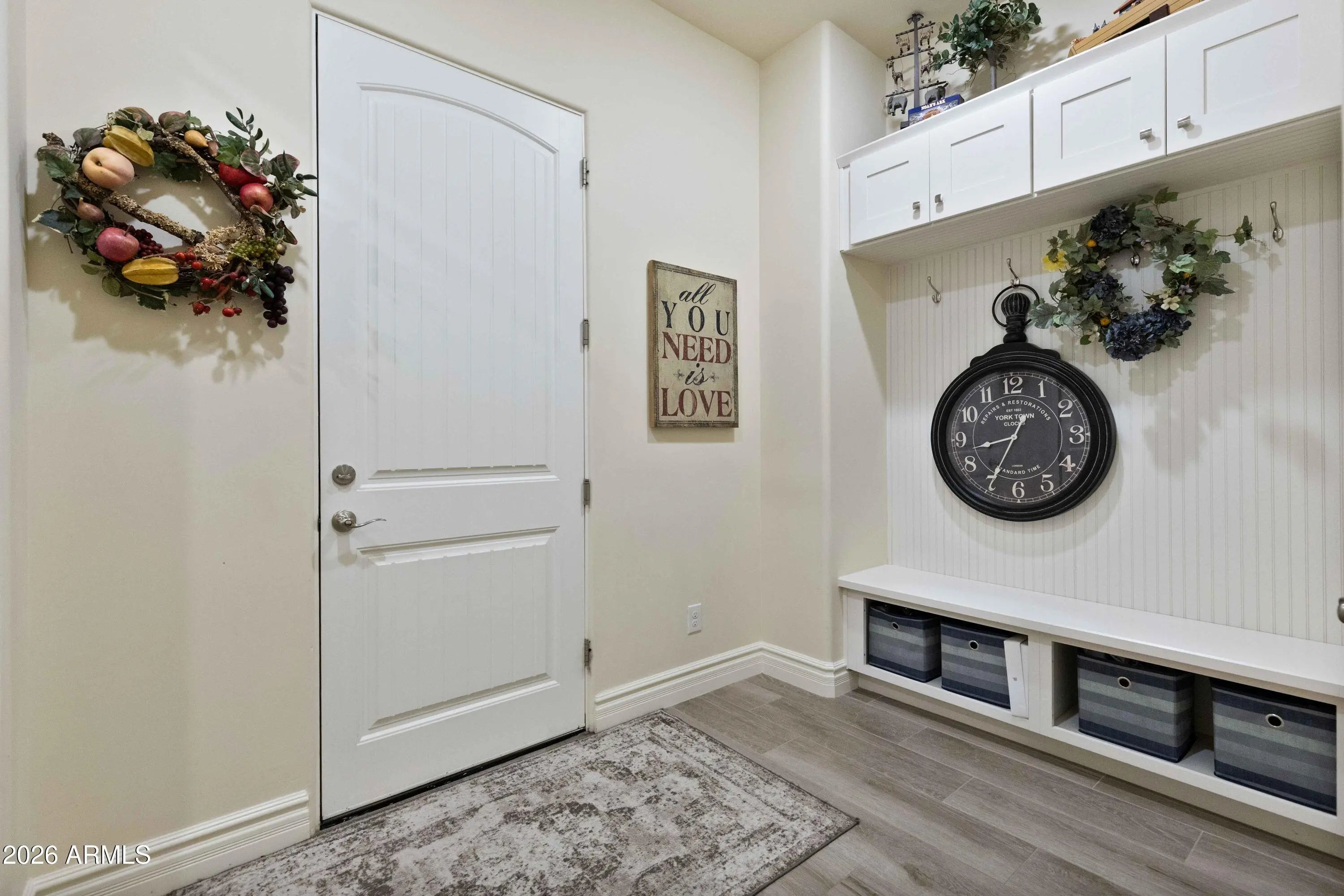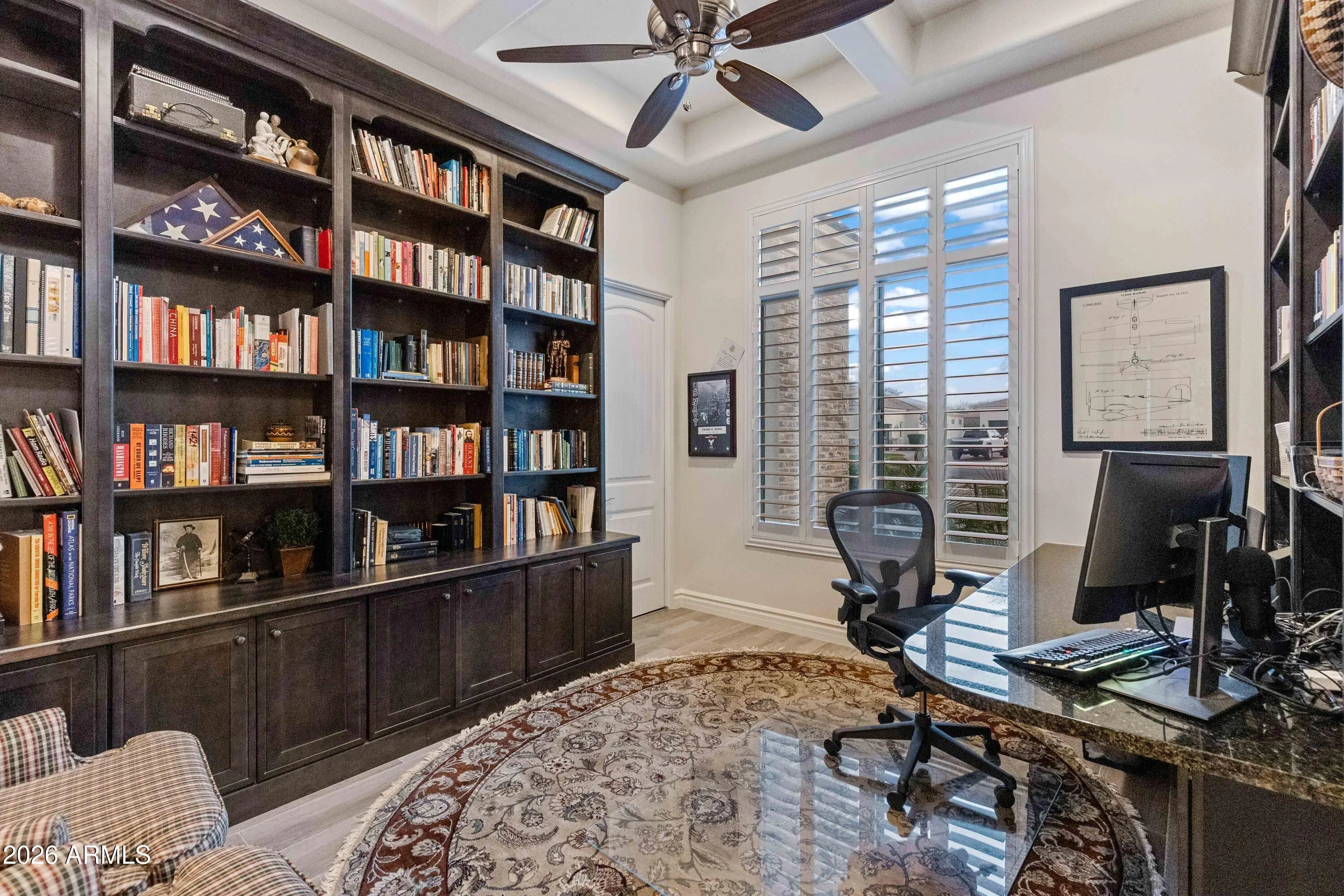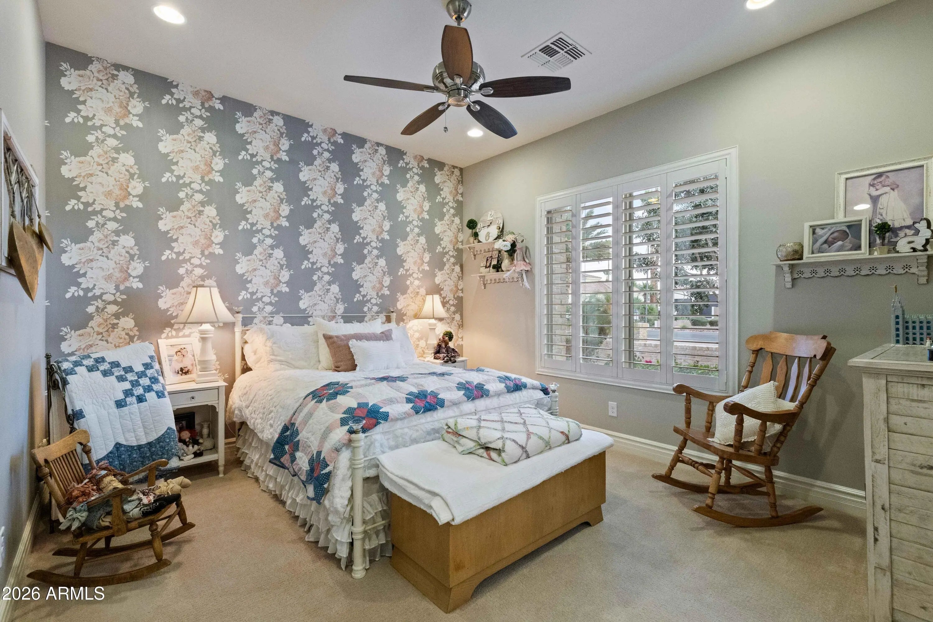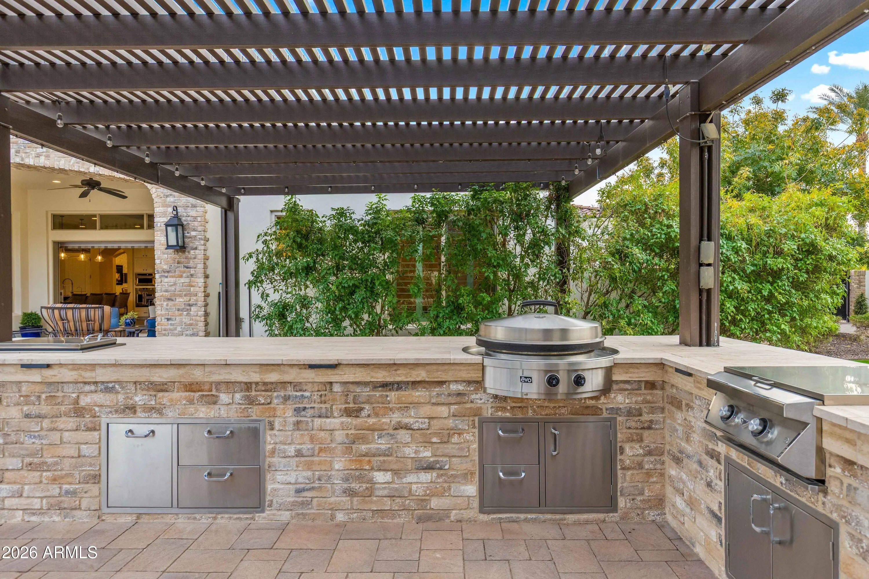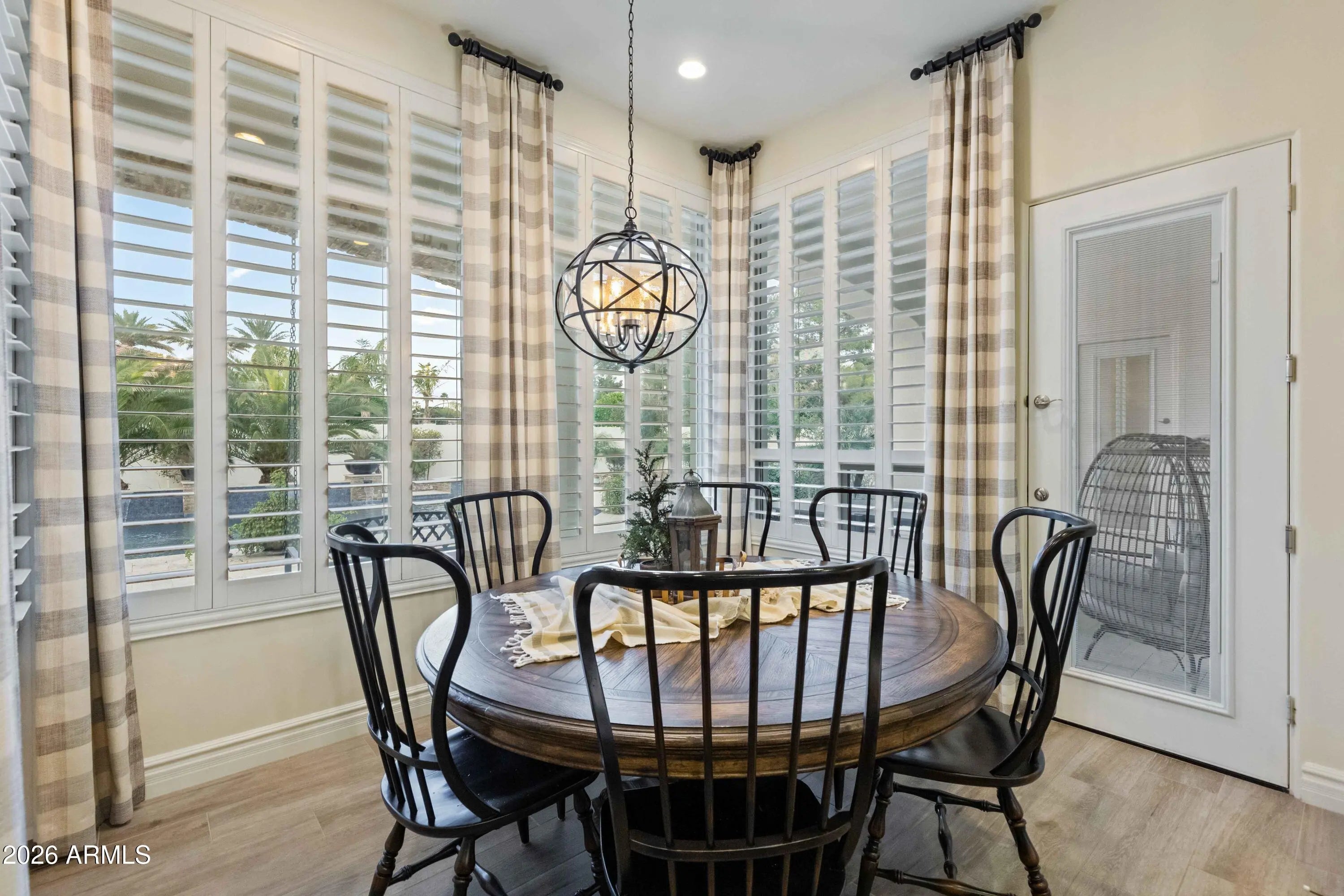 Nestled within a gated enclave of elevated custom homes, this modern farmhouse-inspired residence is enriched with subtle European character and timeless architectural detail. Completed in 2018, the home welcomes with a whitewashed brick exterior and gracious courtyard entry, accented by bold architectural lighting, thoughtfully layered landscaping, and ideal north/south exposure. An arched iron-and-glass front door anchors the façade, blending timeless European character with refined modern appeal. Inside, herringbone-patterned wood-look tile floors, soaring ceilings, and graceful brick-lined arches establish a sense of warmth and distinction, setting the tone for thoughtfully curated interiors throughout. Featuring carefully curated walls adorned with custom wainscoting, walls, every inch of the home has been masterfully detailed. Tall windows with plantation shutters and designer window treatments frame the living room, while tasteful wall coverings, brushed wood beams, brick-lined accent walls and modern farmhouse chandeliers create an inviting environment for refined entertaining and everyday comfort. The great room features a charming breakfast nook and a welcoming family room with custom built-ins, wood-beamed ceilings, and a striking fireplace that anchors the space. Open to the gourmet kitchen, the layout offers a seamless connection between gathering spaces and enhances the home's natural flow. Set on an impressive 36,000-square-foot irrigated corner lot, the property offers exceptional outdoor space and flexibility rarely found in this setting. A large paved driveway and custom RV gates provide access to covered backyard parking, with ample room to add a guest home, RV garage, or additional amenities. Green space is abundant with lush lawn space, mature citrus, and productive lemon trees that enhance the grounds with both beauty and function. The backyard is designed for resort-style living and entertaining, featuring a dramatic and newly built 9.5-foot-deep diving pool with heated spa, LED lighting, and water features. Travertine pavers extend the living and entertaining space, while an extraordinary outdoor kitchen and seating area designed for true culinary entertaining is anchored beneath a long-lasting aluminum ramada with café lighting, misting system, and automatic shade screens. A generous sit-up bar accommodates outdoor dining and gatherings, complemented by a Wolf built-in barbecue, ice chest, Mongolian grill, wok or oversized gas burner, and a show-stopping gas fireplace that creates a warm and inviting atmosphere year-round. The farmhouse-inspired kitchen blends soft white cabinetry with rich, deeper wood tones, creating a warm yet refined aesthetic. Honed quartzite countertops in a richly colored palette provide striking contrast, while the substantial mitered-edge island anchors the space and makes a bold design statement. A black Blanco sink, brushed black hardware, and coordinating light fixtures add a modern edge. Gourmet appliances include a Thermador gas range with griddle and burners, a professional chimney-style range hood framed by a brick façade, a GE Monogram French-door wall oven, and a built-in microwave. An ideal mix of open shelving and well-planned storage completes this highly functional and beautifully appointed kitchen. A private front office features a custom iron-and-glass door that allows diffused light while maintaining privacy. With a walk-in closet, the space offers flexibility as a home office, guest suite, or optional fifth bedroom. The owner's suite is a serene retreat, highlighted by refined horizontal wall paneling, a tray ceiling with rope lighting, and a dedicated sitting area. The en-suite bath is styled in elegant finishes and features quartz countertops, dual vanities, a soaking tub, stylish lighting, and a walk-in shower, and a private water closet with bidet. A spacious walk-in closet is smartly designed with added pull-down clothing racks for enhanced functionality. Completing the home is a charming powder bath featuring timeless wall coverings, a freestanding vanity with a stone vessel sink, and a bidet. Three additional guest bedrooms two in one wing and one in another each offer generous walk-in closets and private en-suite baths, providing comfort and privacy for family and guests alike. An oversized laundry room is purposedly designed with abundant cabinetry, a dedicated workspace, and a utility sink, while a mudroom off the garage adds everyday convenience with additional storage, a built-in bench, and wall hooks. The impressive 4.5-car garage is climate controlled with dual mini-split systems and features over-height garage doors, ample room for vehicles and recreational toys, and a separate storage area ideal for organized, year-round use. An expansive paved driveway provides additional parking, and custom powder-coated RV gates open to covered rear parking for a boat or recreational vehicles, complete with a 200-amp outlet for charging. Rosewood Estates is a prestigious gated community in the heart of Mesa's Citrus Corridor, featuring 23 custom homes on spacious lots with coveted private pickleball, tennis, and basketball courts. Conveniently located approximately 20 minutes from Sky Harbor Airport and Scottsdale, the community is also minutes from premier hiking, golf, mountain biking, water recreation, dining, shopping, and A-rated schools.