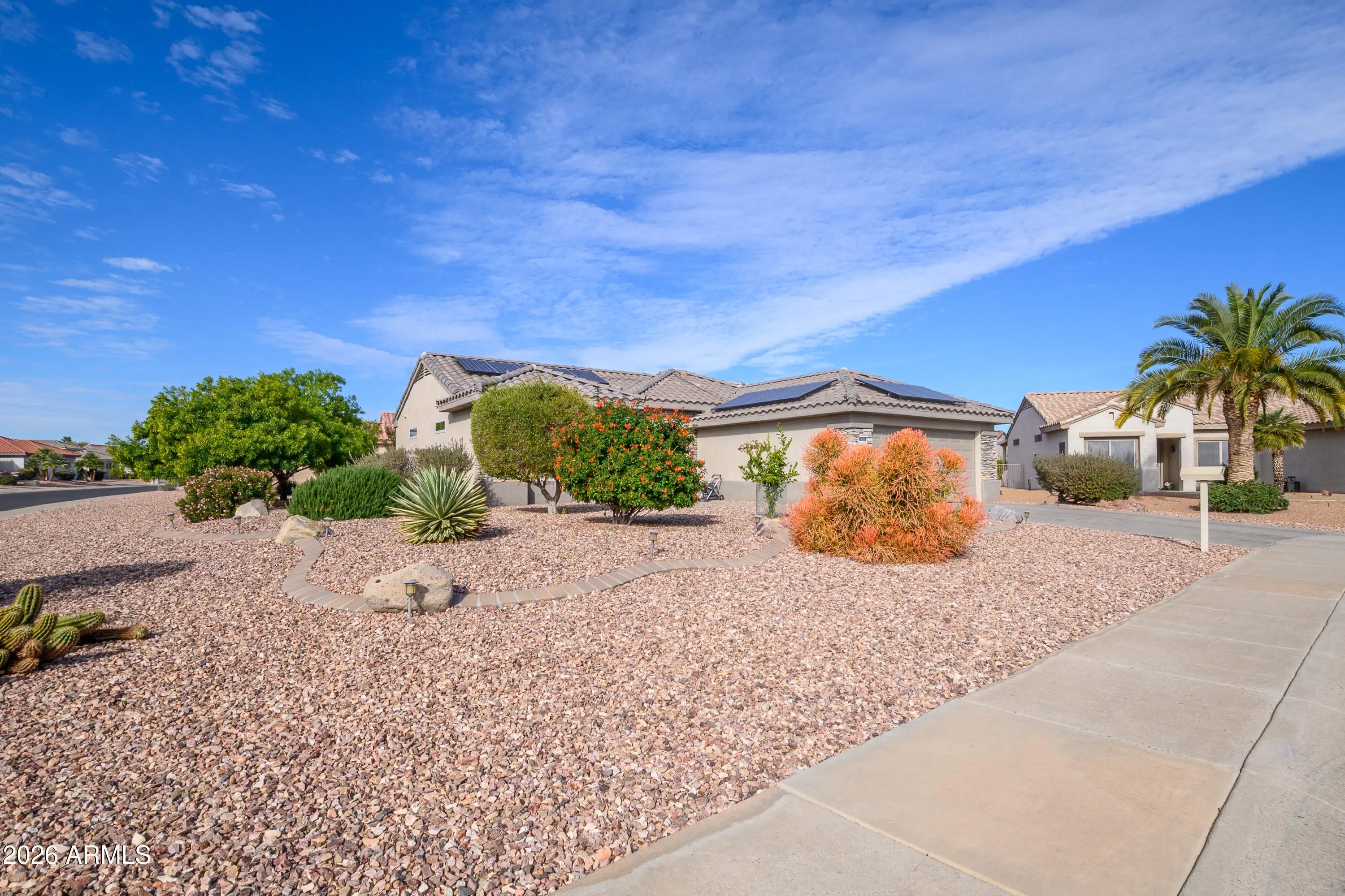 NEW ROOF INSTALLED 6/27/2024! Solar panels were completey removed & reinstalled. This DARLING KIVA on a large corner cul de sac lot. Great curb appeal w/ faux stone front & long driveway. quartz countertops, big pantry, electric range, wood look plank tile T/O, all new windows, plantation shutters T/O, new fans in all bedrooms, DON'T MISS THE GOLFER''S FAN IN THE GREAT ROOM! Double hall closet w/ built ins, gas dryer. 2 car extended garage with built in cabinets, overhead storage & new garage door,. HVAC w/ Nest thermostat NEW in 2023, Owned Solar for low APS bills. Mini split in garage, Full house H2O filtration system, Ring door bell, & Simply Safe, Extended back patio w/ pergala & remote shades on a large lot with room for a pool, ARE YOU SEEKING A NEW BUILD IN SCG? THIS ONE IS CLOSE!