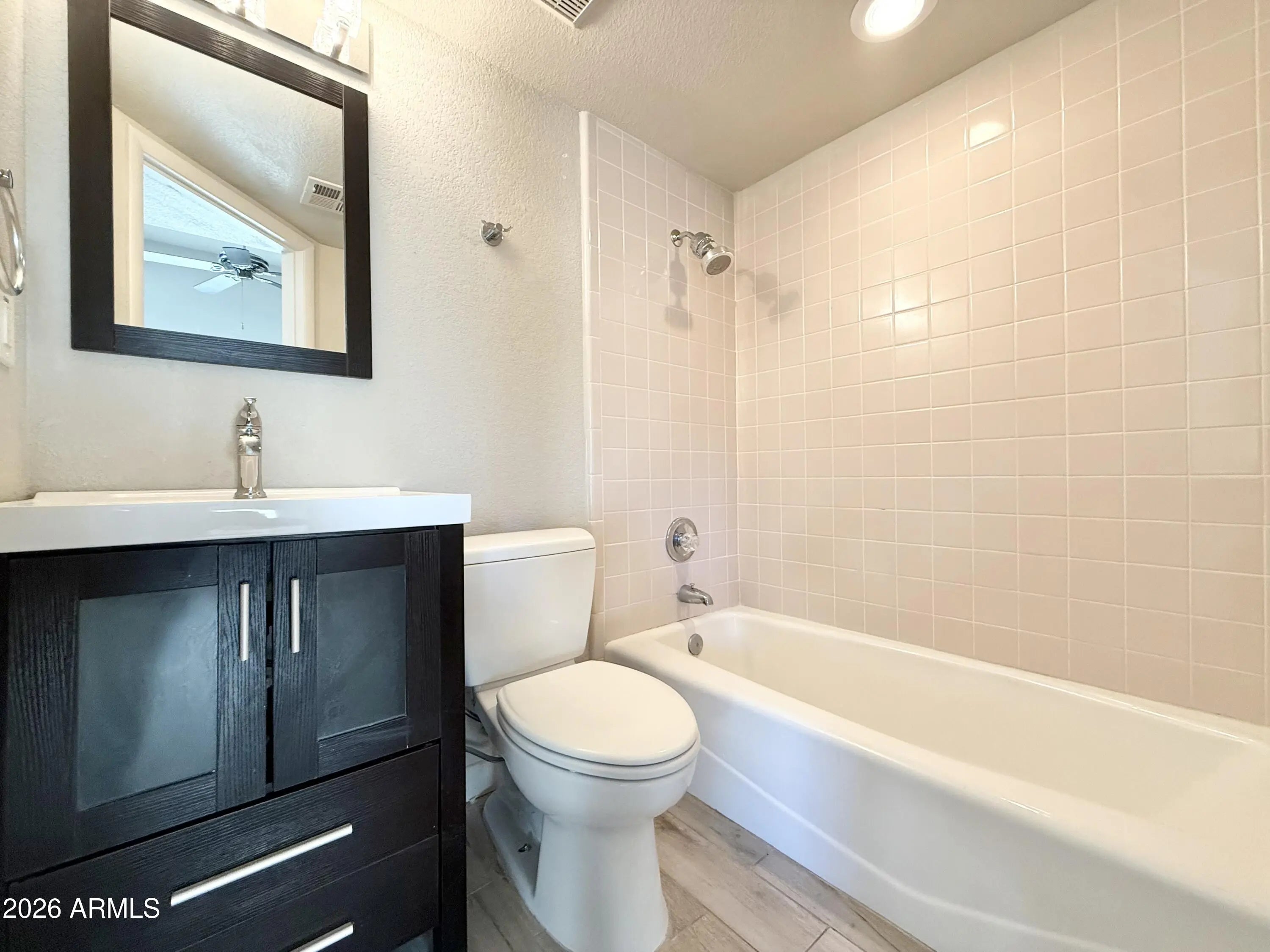 1,068 SQ FT! Remodeled 2 Bedroom, 2.5 Bath Single-Level Home in Fountain Hills's Desirable Fountain Hills Arizona No. 603B Neighborhood! This beautifully updated home features an open layout with wood-style tile flooring throughout, vaulted ceilings, neutral paint, ceiling fans in each bedroom, and abundant natural light. The upgraded kitchen offers granite countertops, a center island, tile backsplash, crown-molded cabinetry, and included appliances: ceramic-top electric range, microwave, dishwasher, and refrigerator. The laundry area includes a washer and dryer for added convenience. Enjoy comfortable great-room living with an open and airy feel. The desirable double primary suite setup includes two nicely sized bedrooms, each with a private bath, large closet, and direct backyard access. A convenient half bath adds extra functionality. Additional highlights include a 2-car garage, paver patio, and easy-care desert landscaping. Use of the wood-burning fireplace is prohibited. Fantastic Fountain Hills location close to shopping, dining, parks, and more.
