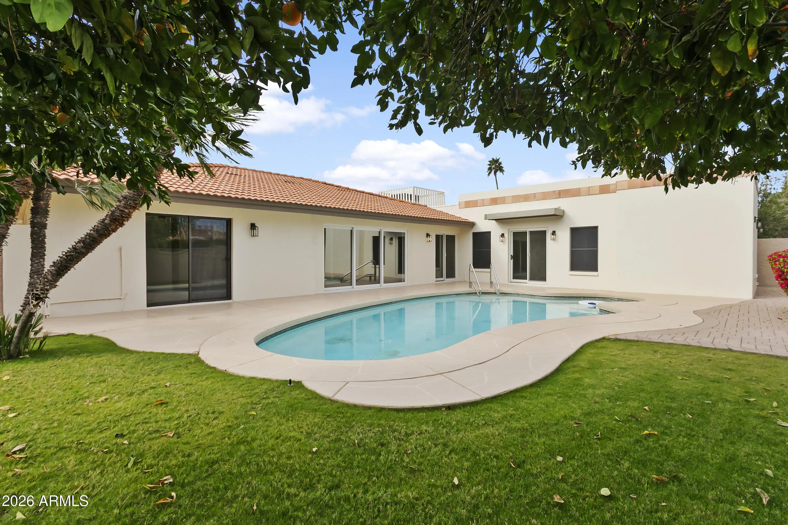 Move in ready luxury home in Scottsdale's McCormick Ranch, located in the desirable Villa Hermosa community. This fully renovated 4 bedroom, 3 bathroom single story home features an open floor plan with vaulted ceilings and abundant natural light. The updated kitchen includes quartz countertops and backsplash, stainless steel appliances, dark cabinetry, and premium porcelain tile flooring. The spacious primary suite offers backyard access, a large walk in closet with built ins, and a spa style bathroom with double vanity, soaking tub, and floor to ceiling tile shower. A secondary bedroom includes a private ensuite, with additional updated bedrooms and baths. Enjoy a private backyard with pool and patio. Close to golf, walking paths, parks, courts, shopping, dining and top amenities.