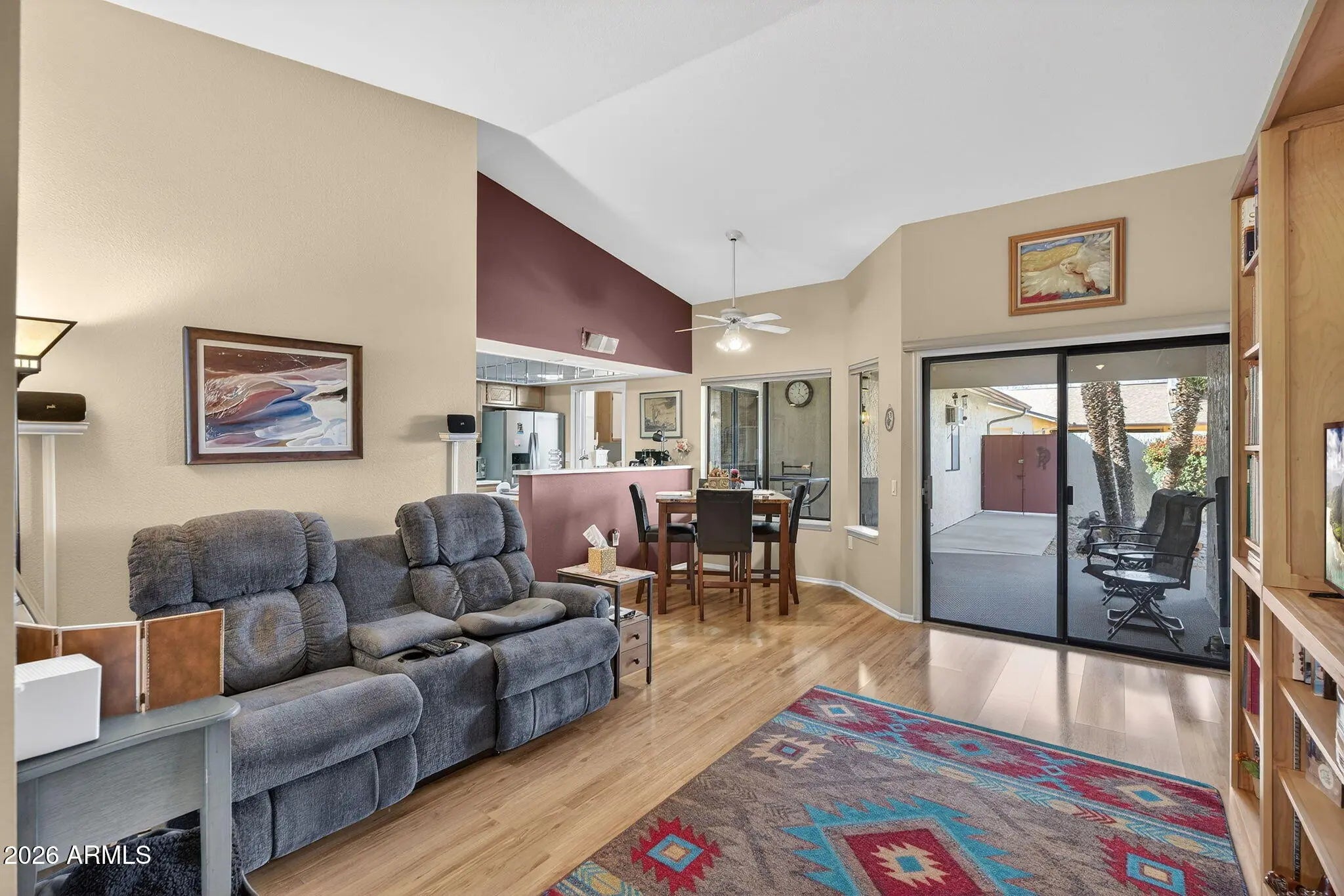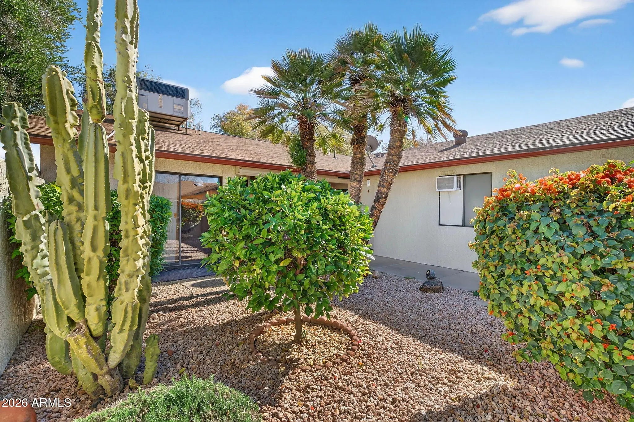 This pristine jewel box is MOVE-IN READY and priced BELOW MARKET, having been kept meticulously by the owners. Enter the tranquil, tree-lined courtyard and step through the door to this beautiful Pueblo model 2 bed, 1.75 bath home with updated Interiors by Thomas. Terrific natural light abounds from the vaulted ceilings, solar tubes and large windows. Updates include new roof (2024) and hot water heater (2024), newer appliances (2012, 2025), custom paint (2012), and updated flooring (2012). Enjoy an expansive primary suite with a generous bathroom that features double sinks and private toilet. Laundry room includes newer washer and dryer (2016) and storage. Single car garage features wet/dry vac, stand-alone freezer, and A/C, as well as ample storage. Enjoy stunning Arizona sunrises and sunsets in the lush, private backyard with covered patio, double gate, and slab for golf cart/bike parking. This home is central and convenient to all amenities in a serene yet active 55+ community. One dog or cat per unit, per HOA/CC&Rs.
