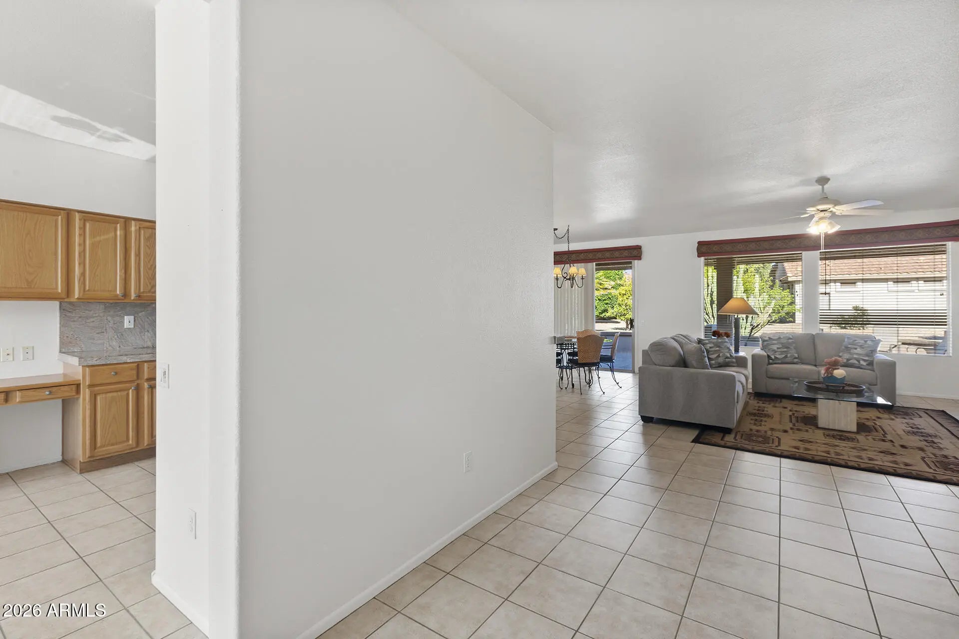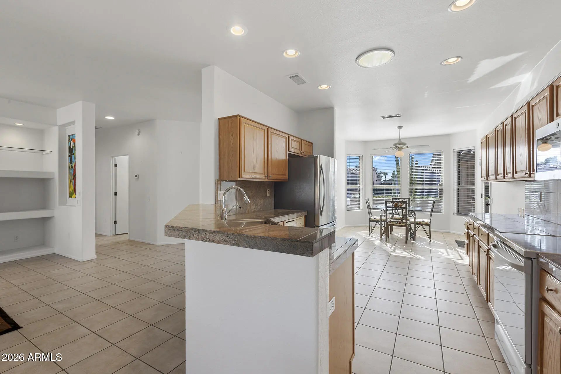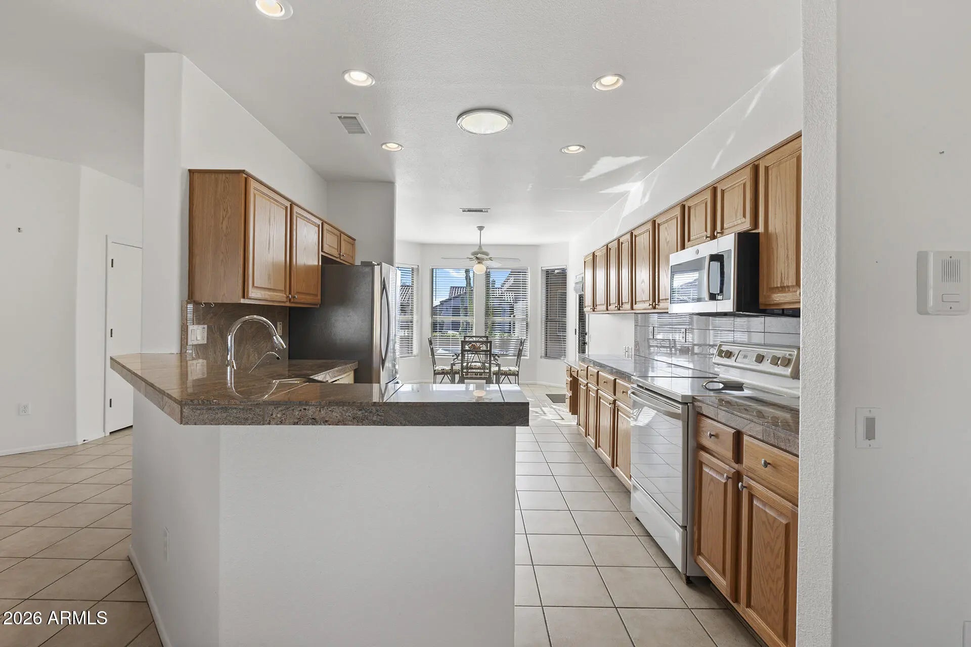 Retire in style and enjoy effortless living in this move-in-ready gem, perfectly situated in a vibrant adult community. This beautifully maintained home offers a spacious 3-bedroom, 2-bath main residence plus a PRIVATE DETACHED GUEST CASITA with a full bathroom—ideal for hosting family and friends in comfort. Inside, the open great room floor plan is filled with natural light, enhanced by charming bay windows and a warm, welcoming layout designed for both relaxing and entertaining. The kitchen features honey oak cabinetry, granite tile countertops, and a cozy breakfast nook with a built-in desk and garden door—perfect for morning coffee or casual meals. The generous primary suite provides a peaceful retreat, complete with an extended walk-in shower and ample linen storage. Step outside to your oversized back patio and retractable awning and enjoy a serene setting for outdoor living year-round. Additional highlights include an extended garage with built-in cabinetry and epoxy flooring for exceptional storage and organization. Plus, the refrigerator, washer, and dryer are included for added convenience. Blending comfort, functionality, and an unbeatable lifestyle, this home offers truly carefree living at its finest. Don't miss your opportunity to make it yours.