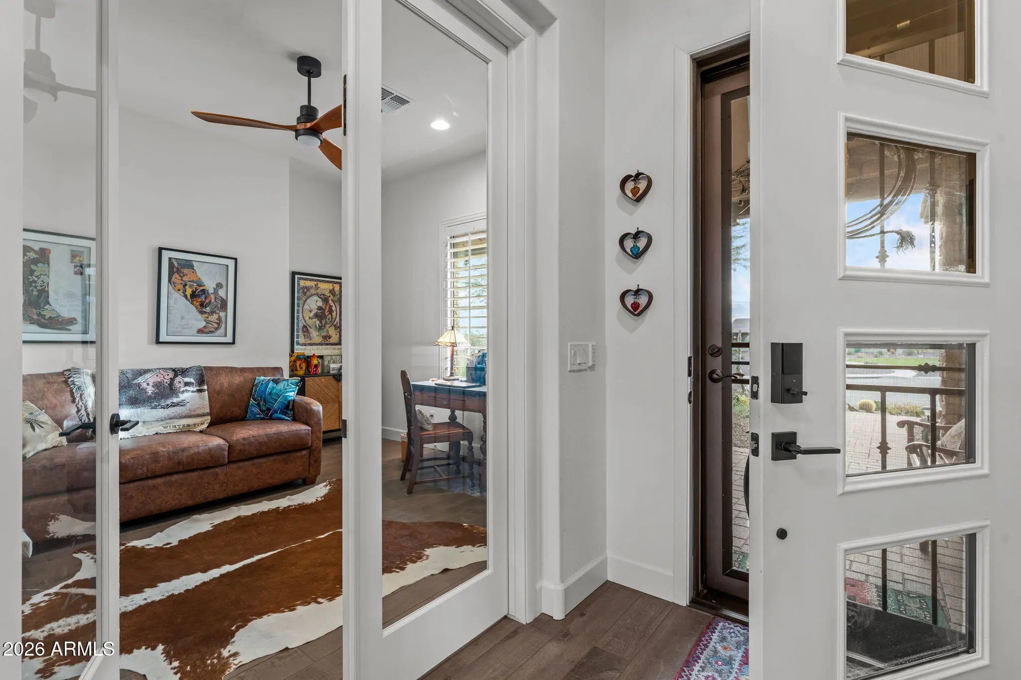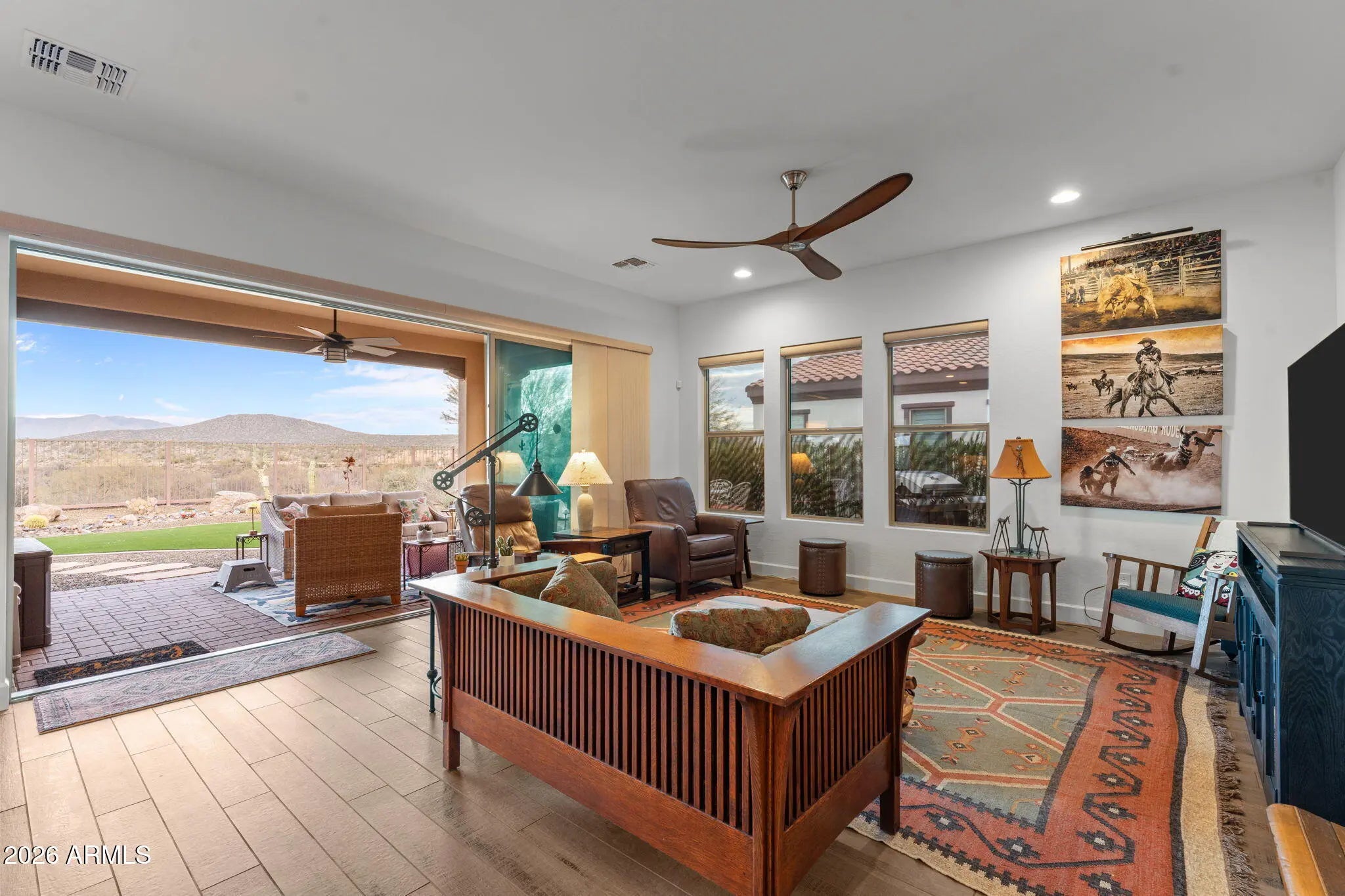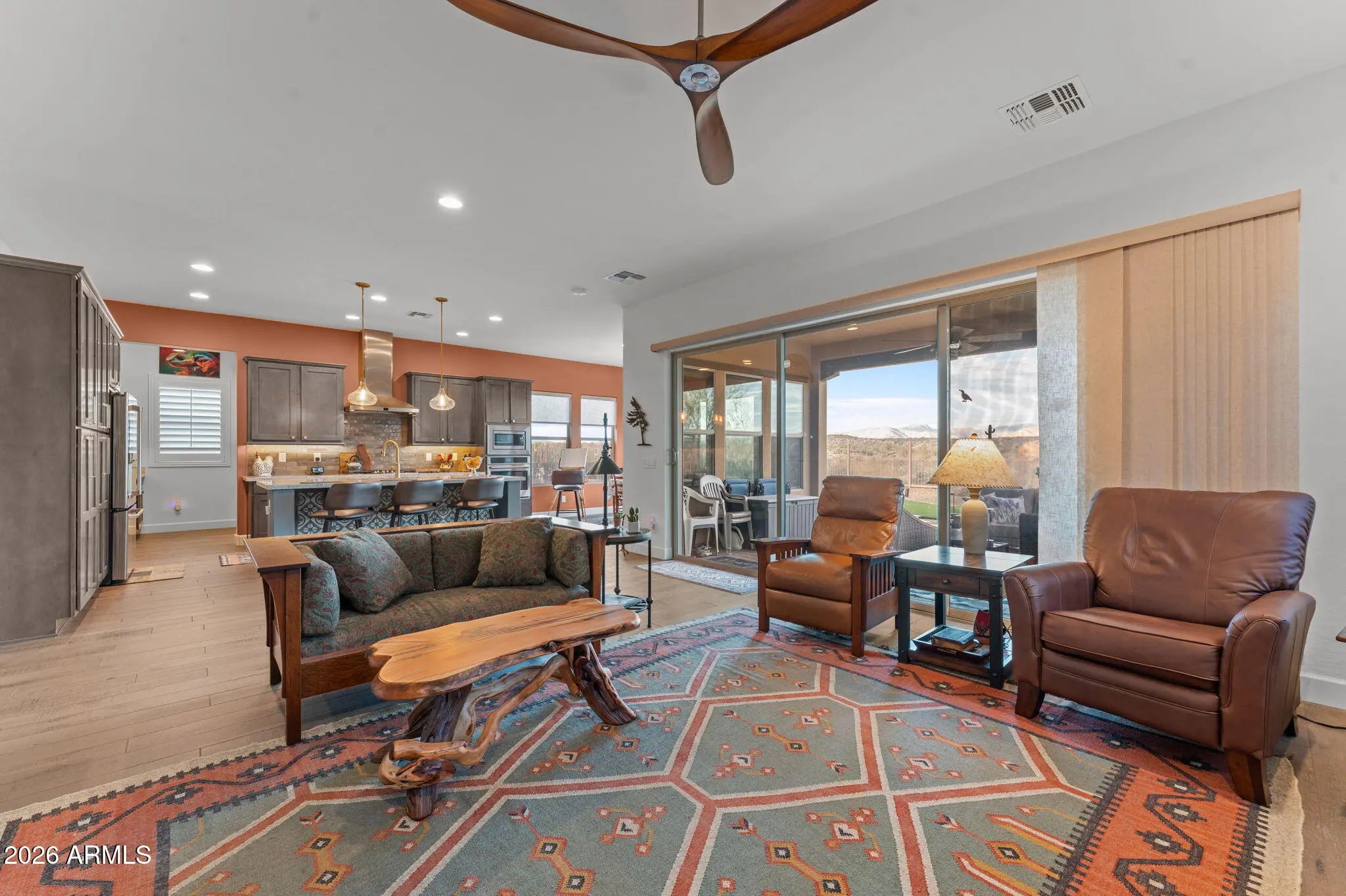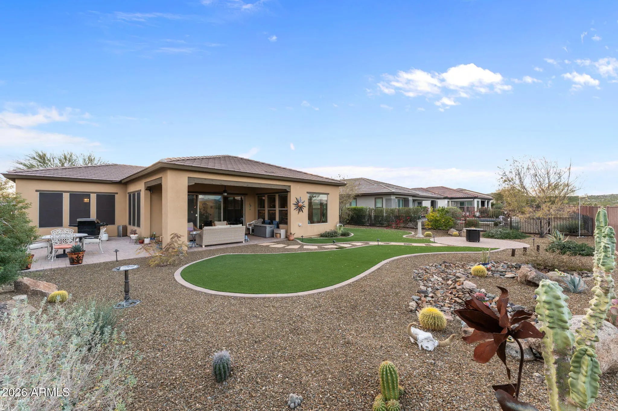 Tucked at the end of a cul de sac in Wickenburg Ranch, this home is defined by open desert and mountain views that shape the way it lives and feels. The setting offers a sense of space and ease, with an outlook that shifts gently throughout the day and quietly influences the rhythm of the home. Inside, the kitchen and great room are positioned to look outward, drawing your eye through the glass and into the backyard rather than stopping at the walls. Natural light and long sightlines keep the space connected to what's happening outside, whether that's a fire glowing at dusk or mornings under the covered patio. The kitchen supports that connection as a natural gathering point, while the great room stays relaxed and comfortable, scaled for everyday living instead of oversized formality. The layout continues with two bedrooms, two and a half bathrooms, a dedicated office, and a separate exercise or bonus room. Each space connects easily to the next, creating a sense of flow that feels intuitive rather than staged. Outdoors, the backyard becomes a true extension of the home. A gently curved pathway moves through the yard, connecting seating areas designed for conversation or quiet evenings. The extended covered patio provides shade and comfort, while the open-air dining space is ideal for meals under the stars, with the fire feature adding warmth as the evening sets in. The landscape is designed to be enjoyed, not managed, allowing the setting to speak for itself. Low-maintenance by nature, both the home and yard make it easy to enjoy the rhythm of Wickenburg Ranch without constant upkeep. It's a home that feels settled and easy to live in, with thoughtful outdoor spaces, open views, and a layout that quietly sets it apart.