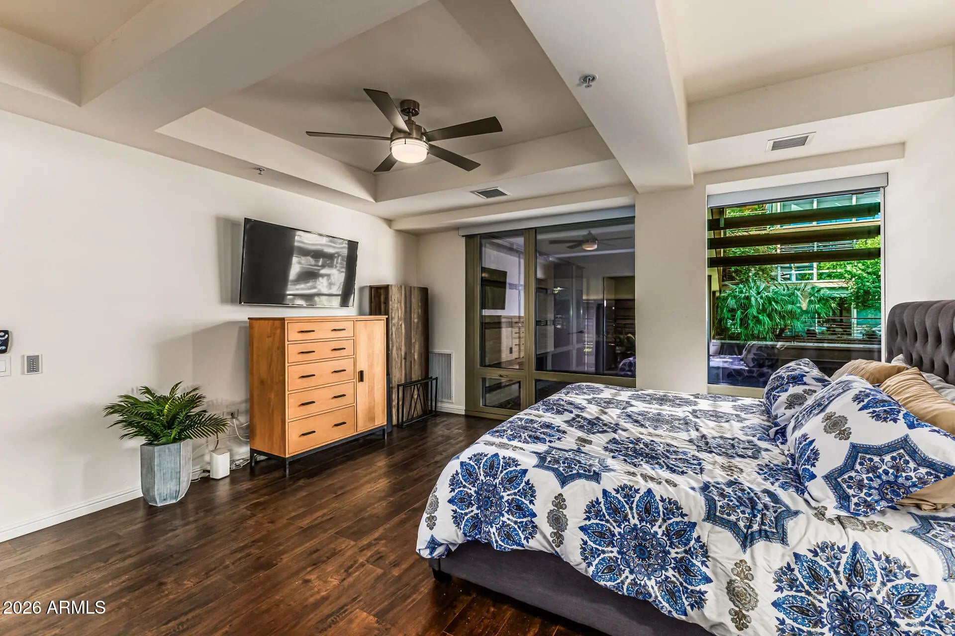 Step inside this beautiful 2 bed, 2 bath residence in Optima Camelview, one of Scottsdale's most iconic architectural communities, where garden-inspired design, world-class amenities, and urban convenience come together in one exceptional living experience. This spacious layout offers the rare opportunity to convert the existing floor plan into a true 3-bedroom, creating flexibility for guests, a home office, or expanded living space. Floor-to-ceiling glass windows flood the home with natural light, framing the lush landscaping that defines Optima's signature aesthetic and creating a seamless indoor-outdoor connection. Two expansive, private patios elevate the lifestyle of the home—each offering unmatched versatility. Whether imagined as an outdoor dining terrace, tranquil lounge, or a curated garden escape, the patios provide a blank canvas for the next owner's vision. Inside, the home features newer rustic wood-look luxury vinyl plank flooring and an open-concept design that feels inviting yet refined. The gourmet kitchen is perfectly appointed for both everyday living and entertaining, showcasing granite counters with a matching backsplash, rich shaker cabinetry, stainless steel appliances, recessed lighting, and a peninsula with casual bar seating. The primary suite is a peaceful retreat with its own private bath featuring dual sinks and a generous walk-in closet. The guest bedroom and bathroom are equally well-designed, making the home ideal as a primary residence, lock-and-leave, or investment opportunity. Living at Optima Camelview means embracing resort-style living every day. Residents enjoy 24-hour security, concierge services, a state-of-the-art fitness center, indoor lap pool, two outdoor pools and spas, an on-site restaurant, putting green, lounge areas, business centers, and the beautifully engineered landscaping that has become the hallmark of this award-winning community. All just steps from Scottsdale Fashion Square, world-class dining, hiking, and the best of Old Town. A versatile floor plan, two incredible outdoor living spaces, and the unmatched amenities of Optima Camelviewthis is a luxury lifestyle opportunity you won't find twice.