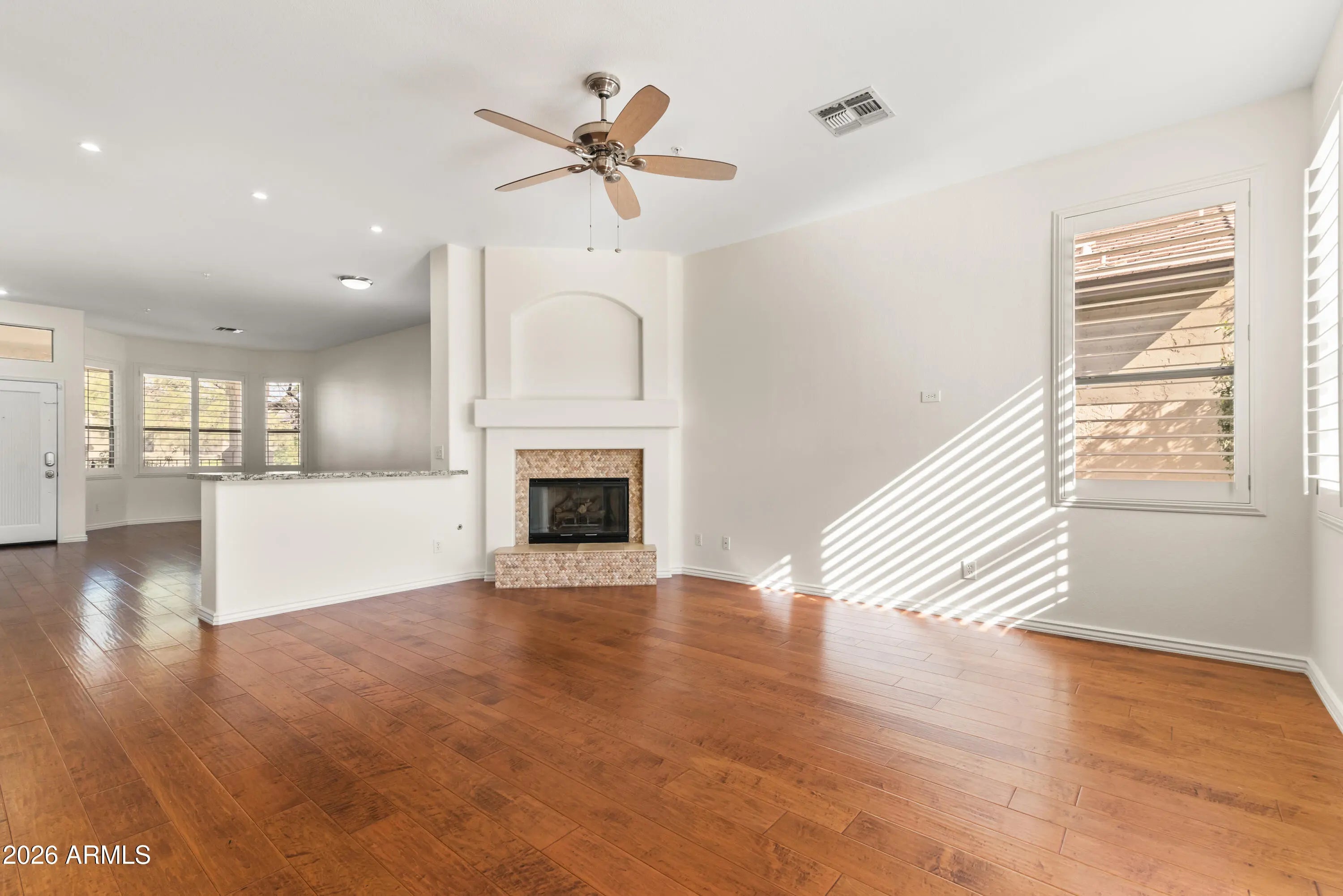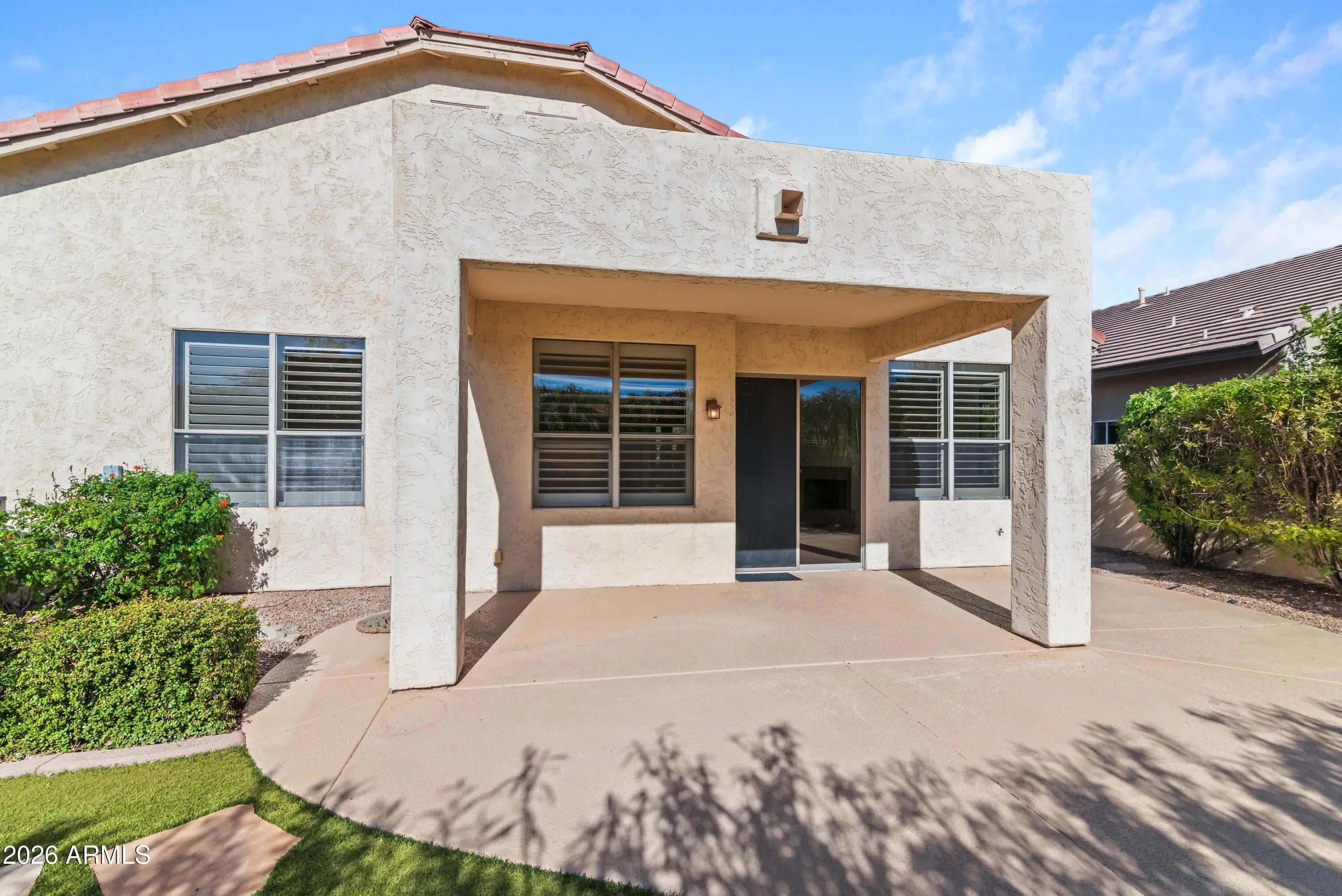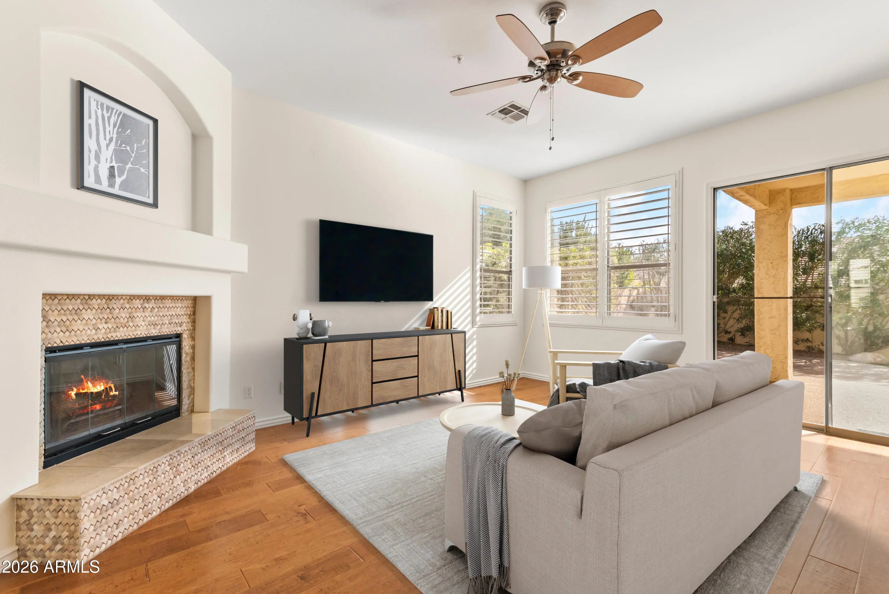 Nestled in the heart of Grayhawk, this beautifully maintained 4-bedroom, 2-bath home offers comfort, flexibility, and an unbeatable North Scottsdale location close to shopping, dining, and everyday conveniences. Tile flooring, plantation shutters, fresh paint, and a cozy fireplace create an inviting interior, while the large front porch is perfect for relaxing and getting to know your neighbors. One bedroom features French doors opening to the formal living and dining area, making it ideal for a home office or den. The kitchen is open to the family room and includes a center island, stainless steel appliances, granite countertops, and a sunny nook for casual dining. A wide two-car garage provides ample room for storage or a work area. Out back, enjoy a thoughtfully landscaped yard with turf and both covered and uncovered patios perfect for entertaining or unwinding, all just steps from nearby parks and walking paths.