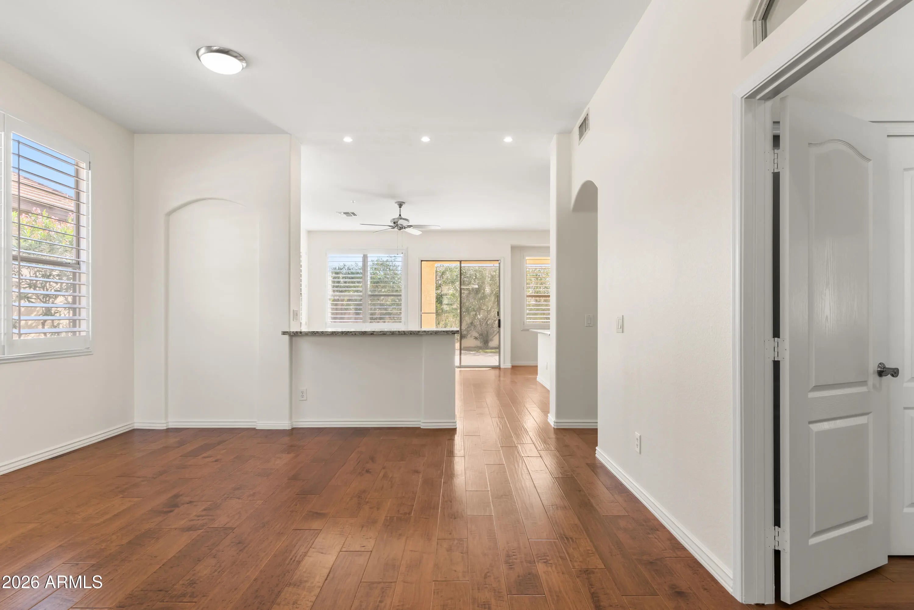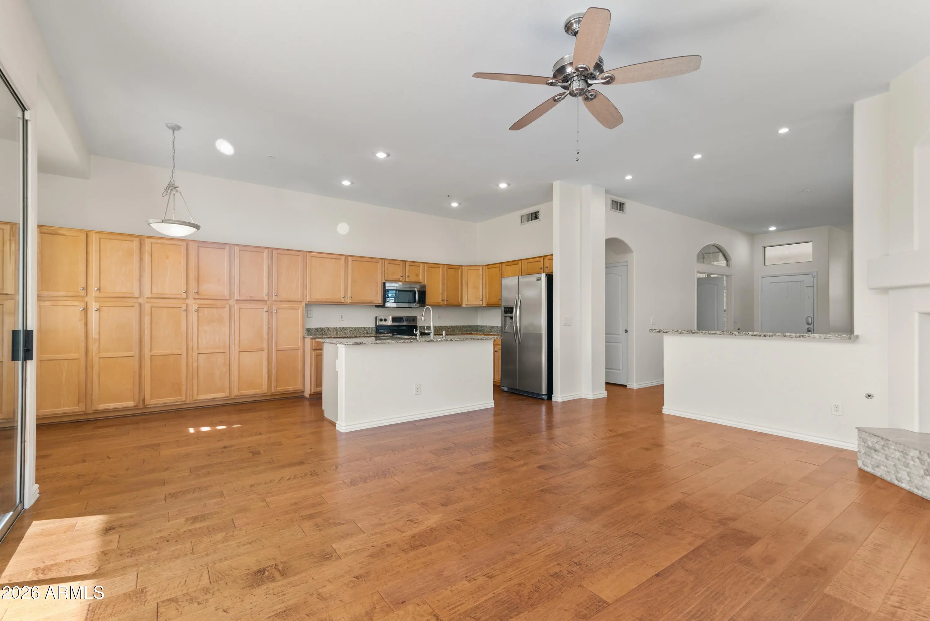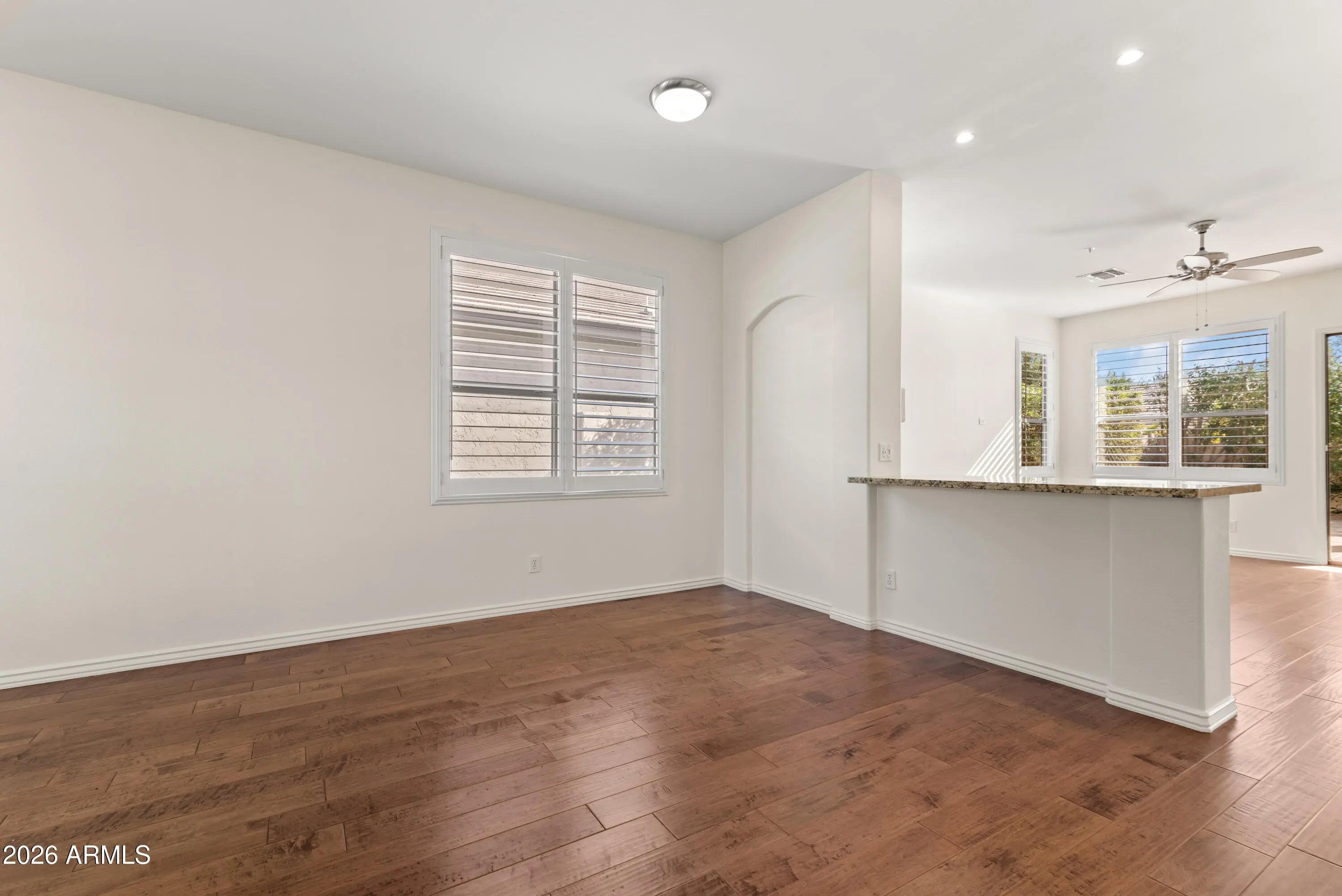 Nestled in the heart of Grayhawk, this beautifully maintained 4-bedroom, 2-bath home offers comfort, flexibility, and an unbeatable North Scottsdale location close to shopping, dining, and everyday conveniences. Tile flooring, plantation shutters, fresh paint, and a cozy fireplace create an inviting interior, while the large front porch is perfect for relaxing and getting to know your neighbors. One bedroom features French doors opening to the formal living and dining area, making it ideal for a home office or den. The kitchen is open to the family room and includes a center island, stainless steel appliances, granite countertops, and a sunny nook for casual dining. A wide two-car garage provides ample room for storage or a work area. Out back, enjoy a thoughtfully landscaped yard with turf and both covered and uncovered patios perfect for entertaining or unwinding, all just steps from nearby parks and walking paths.