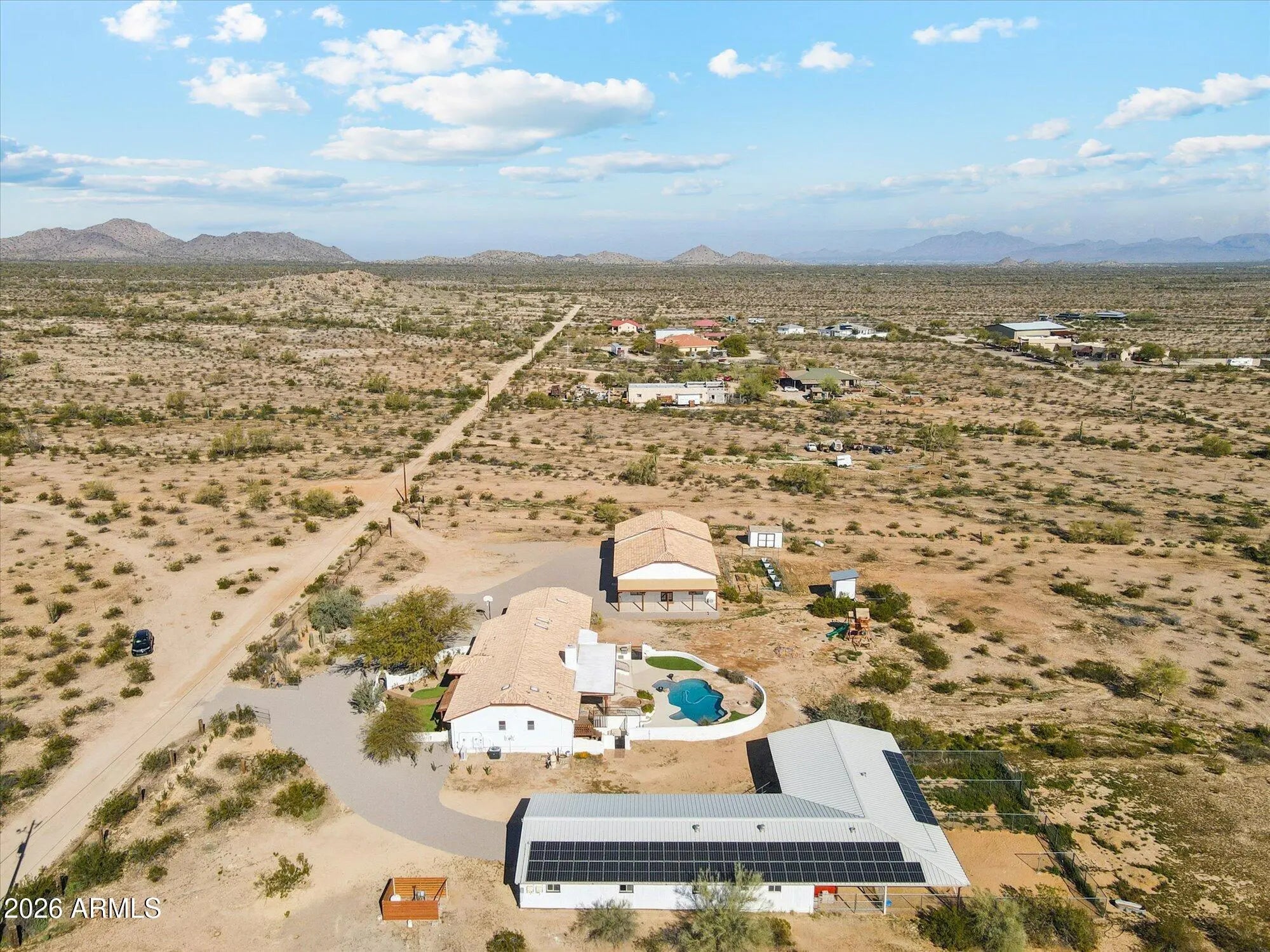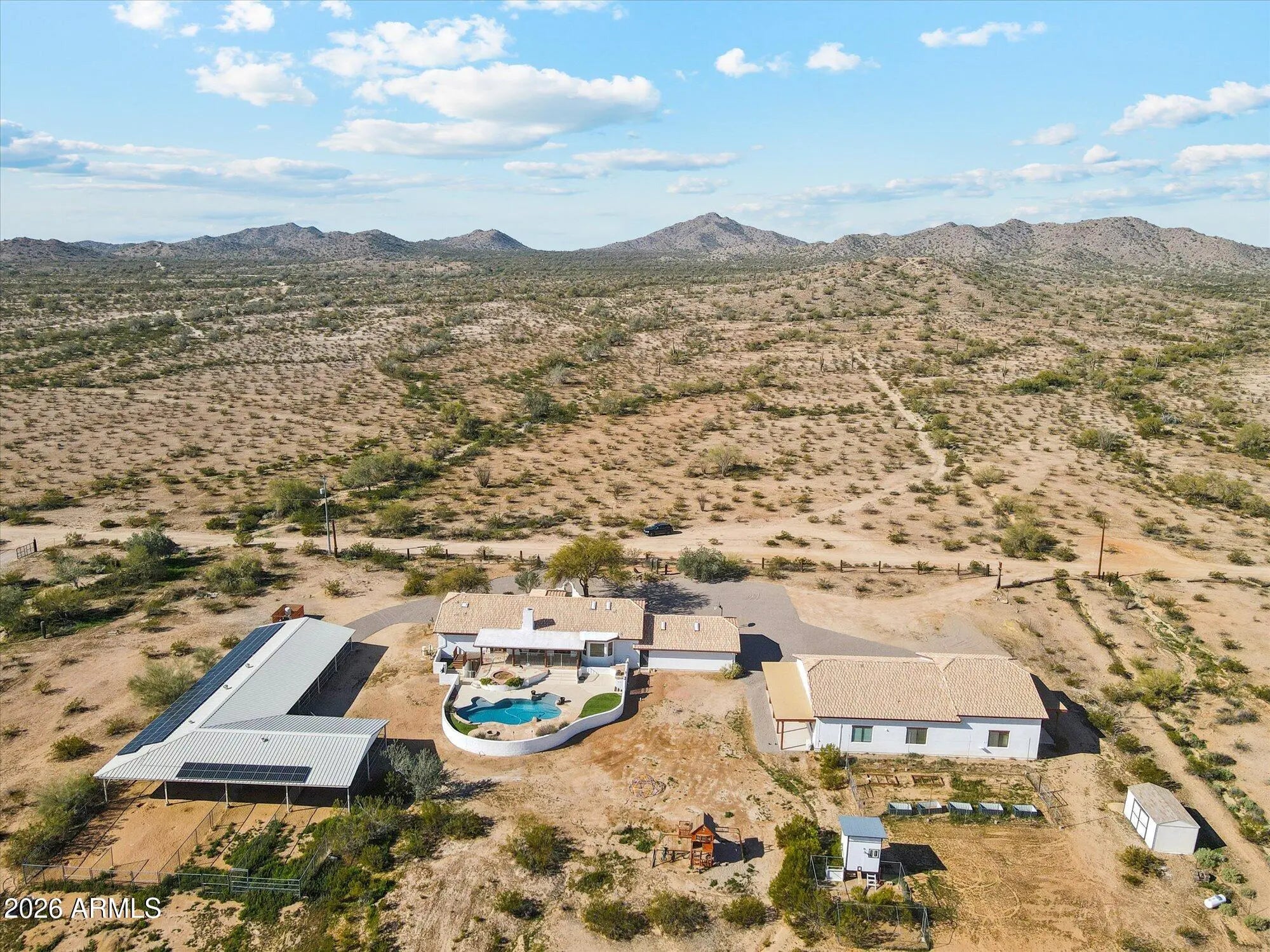 **Custom Estate on 4.27 Acres with Premier Equestrian Facilities** Immaculate, one-of-a-kind custom estate offering over 4,600 sq ft of luxurious living, including a beautifully finished basement. Designed for both comfort and entertaining, this home features custom finishes throughout, an executive chef's kitchen, bedrooms on the main level and lower level, a dedicated home office, theater room, and so much more. A standout feature is the detached, partial climate-controlled 12-car garage complete with A/C and bathroom—ideal for car enthusiasts, hobbyists, a professional shop, or an epic man cave. For horse lovers, the equestrian setup is first-class: • 4,500 sq ft covered space & round corral • individual stall fans. • Tack room and storage " Thoughtfully designed for functionality and ease Outdoor living is equally impressive. Relax on the newly finished pool deck, covered patio, or in the oversized custom pool, all while enjoying sweeping mountain and desert views across your 4.27 acres. This property goes far beyond a standard description. Every detail has been carefully curated to create a truly exceptional custom estate that maximizes its stunning setting and offers everything today's luxury buyer is searching for. A must-see to fully appreciate. *Owned Solar Panels/ System All chairs, fridge, popcorn machine, projector, cabinet convey with the sale.